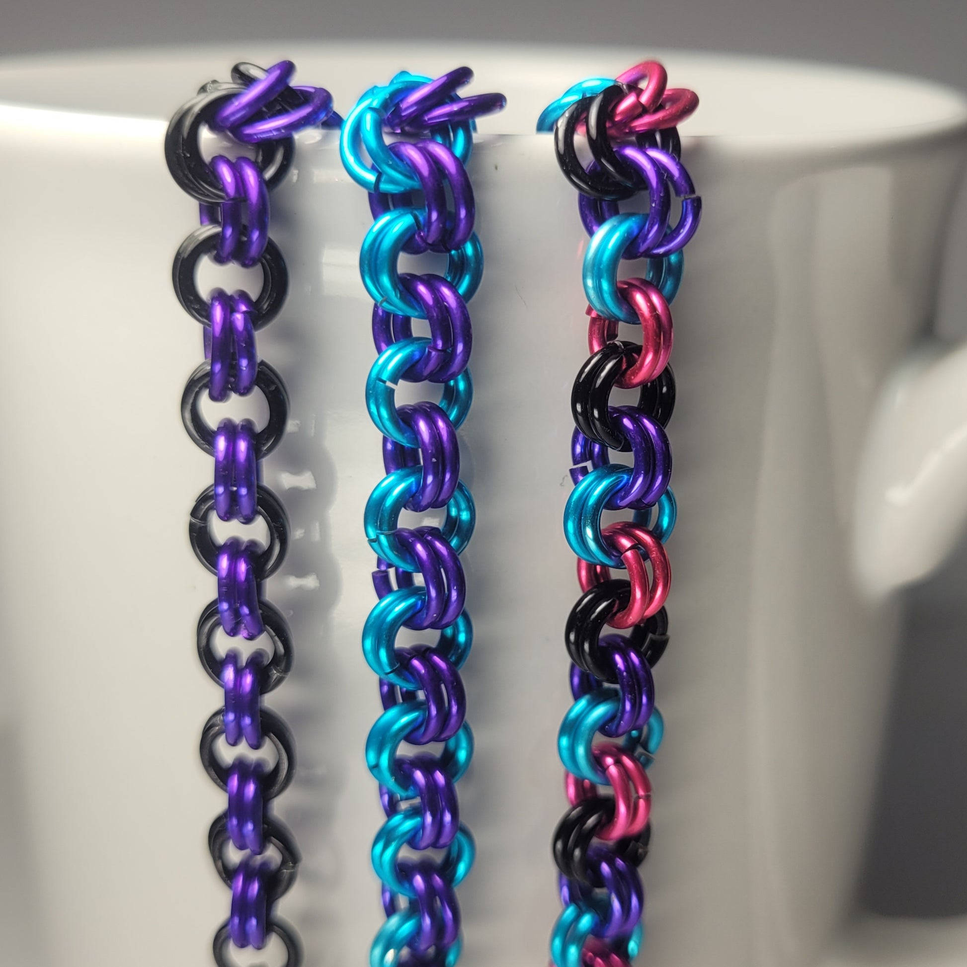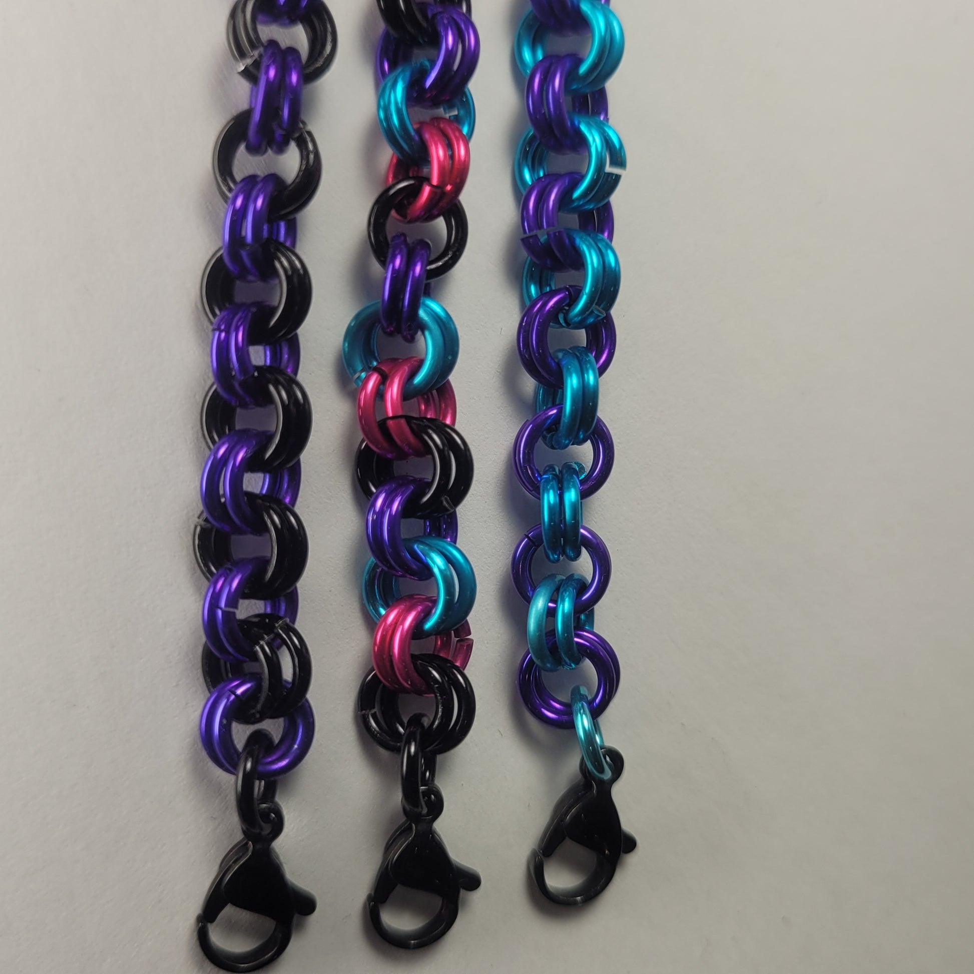 This bracelet is made of anodized aluminium and a stainless steel clasp. This is a 2 in 2 weave. You must pick your 2 colours, if you want all the same colour pick both the same colour shade from each drop down menu. If you would like 3 or more colours please send me a message with your choices.