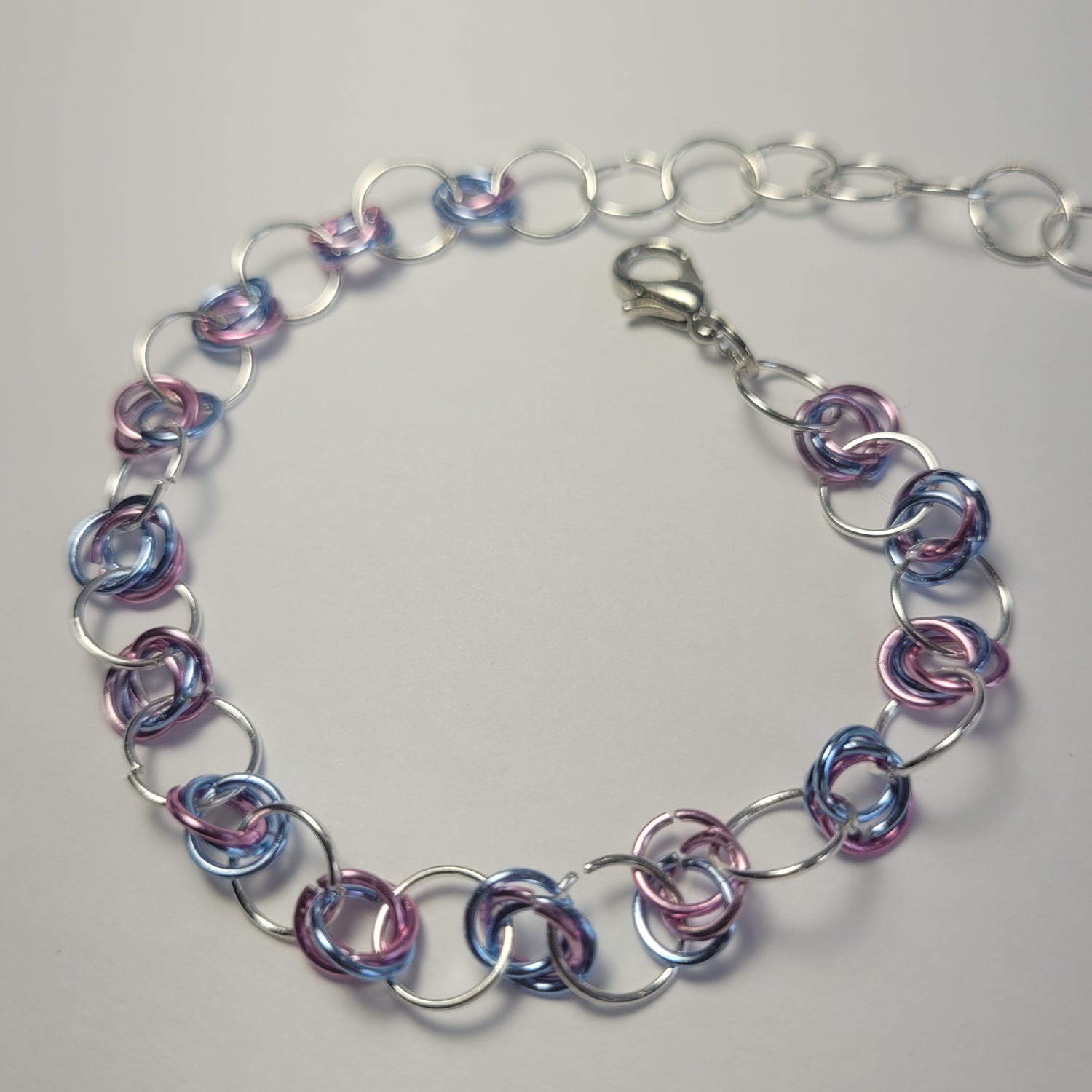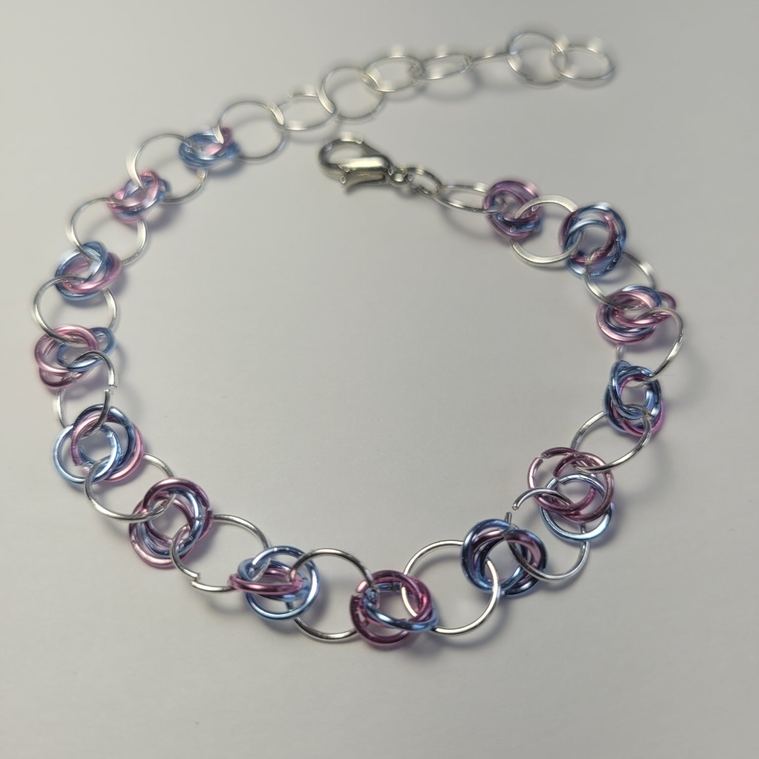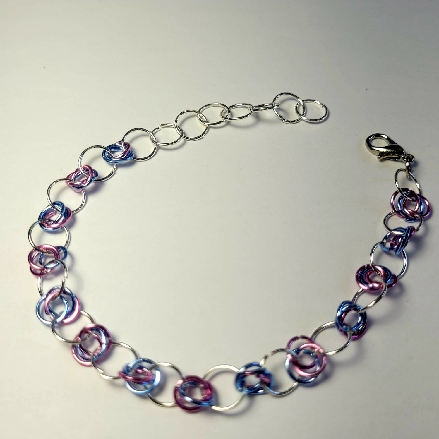 Handmade chainmail pink, blue and silver bracelet. Hand woven one ring at a time, this jewelry is sure to turn heads!