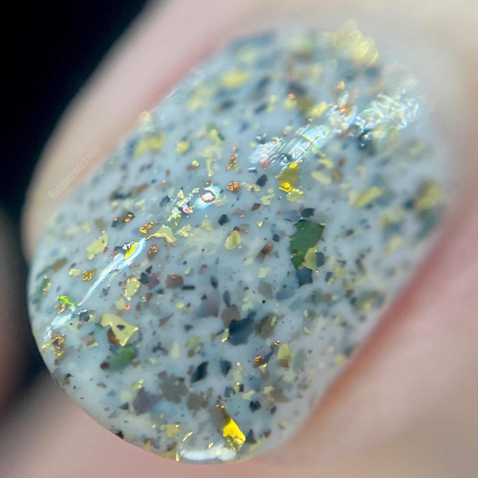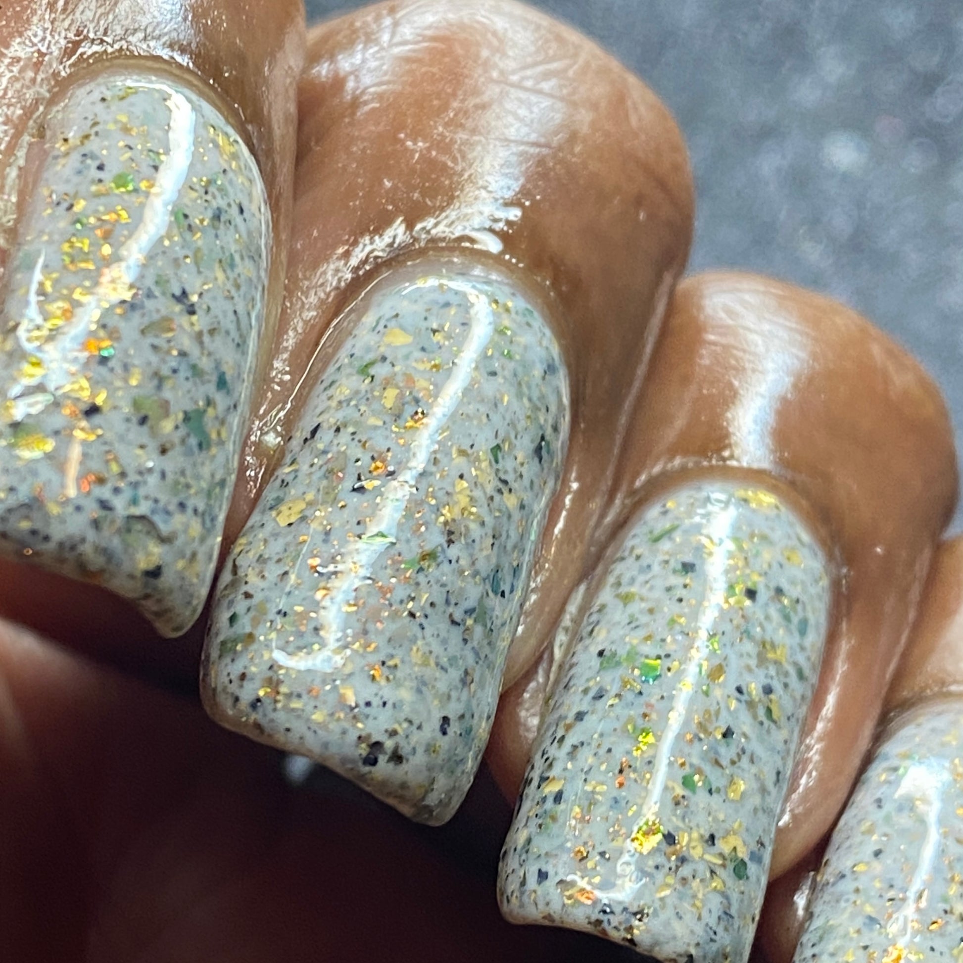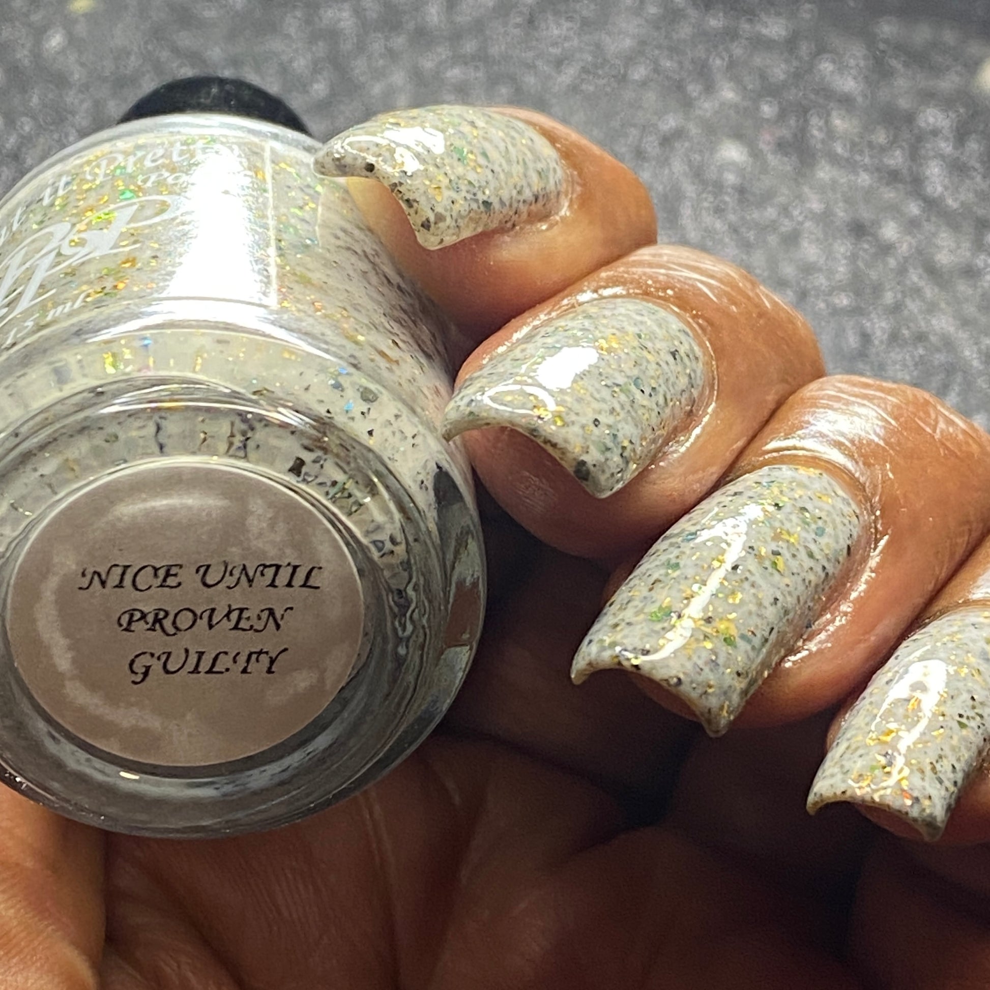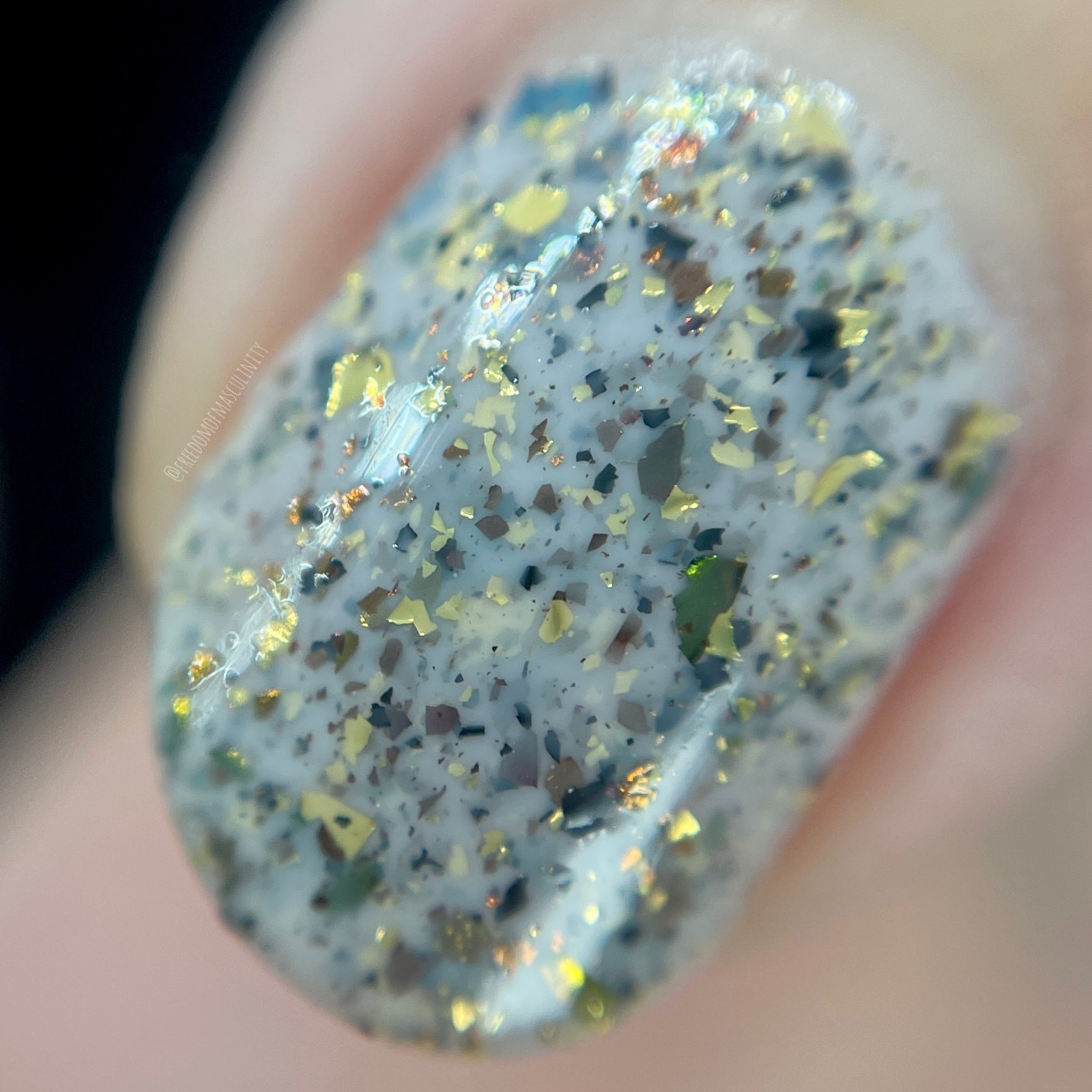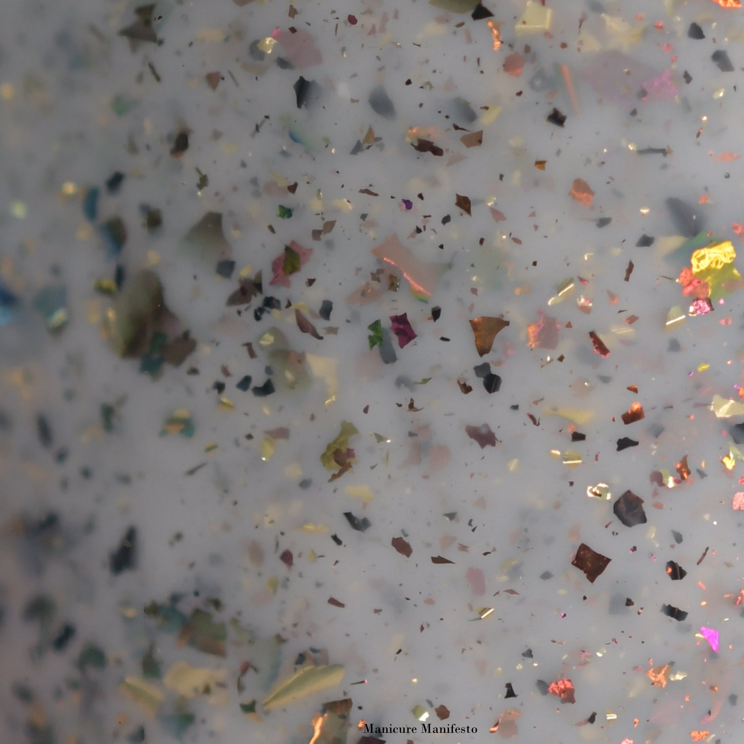 Nice Until Proven Naughty is a white polish with bronze, gold green chrome flakes, gold metallic flakes, and black microflakes.