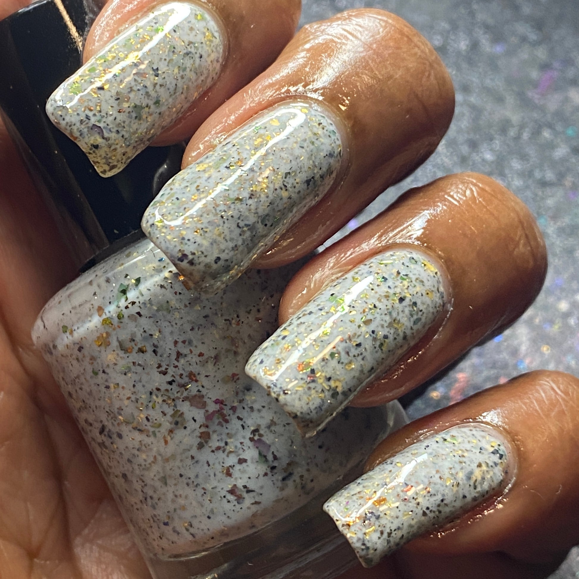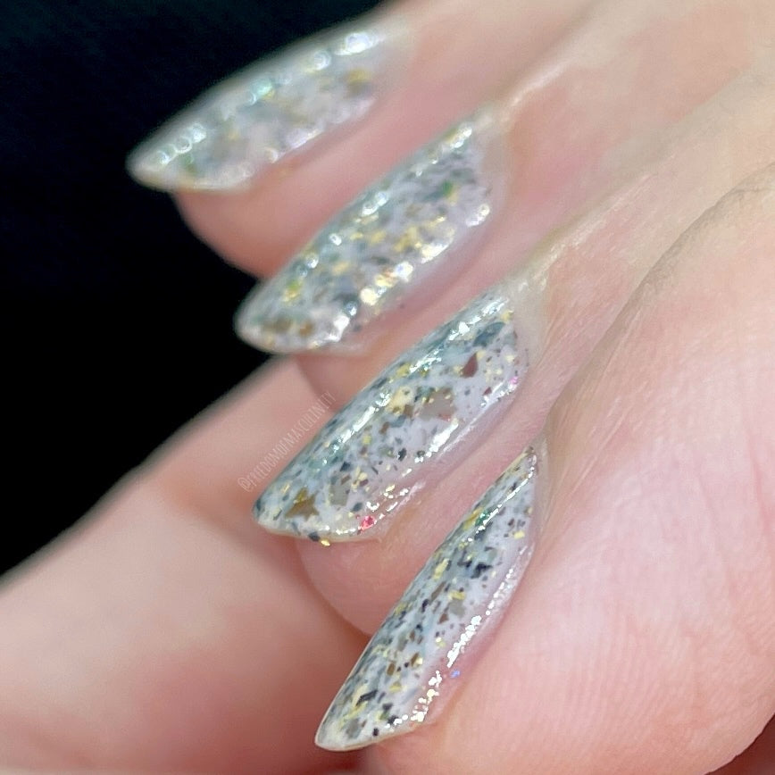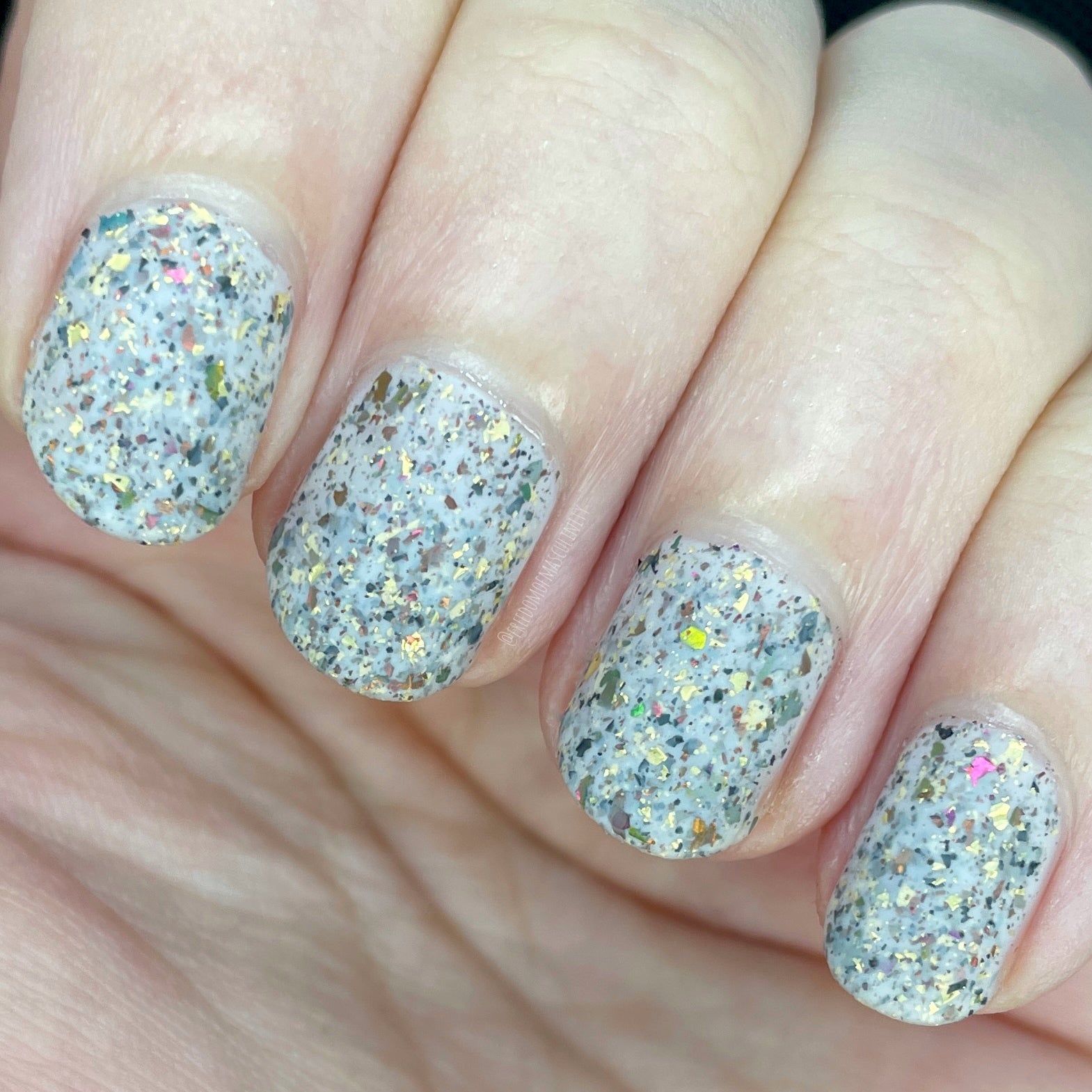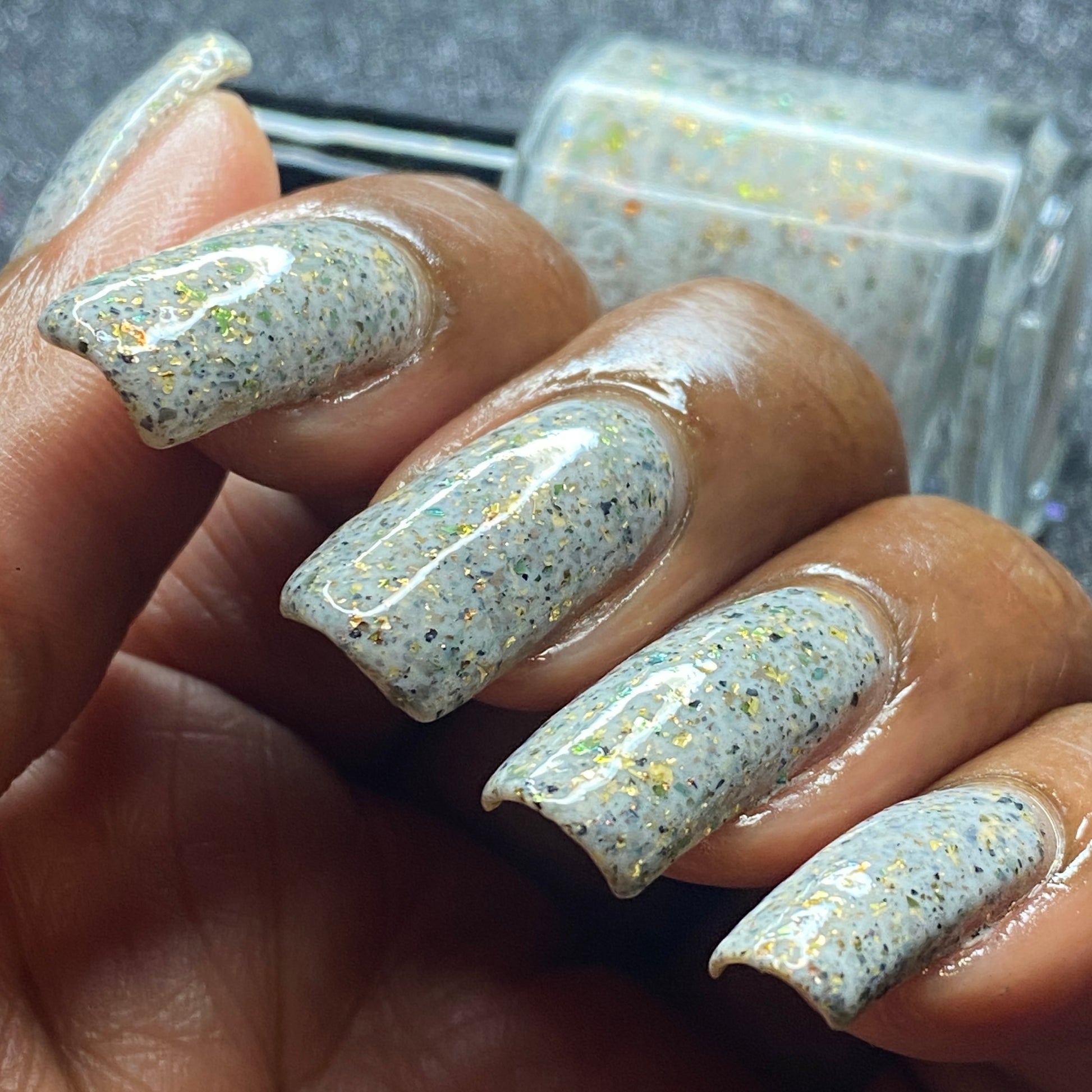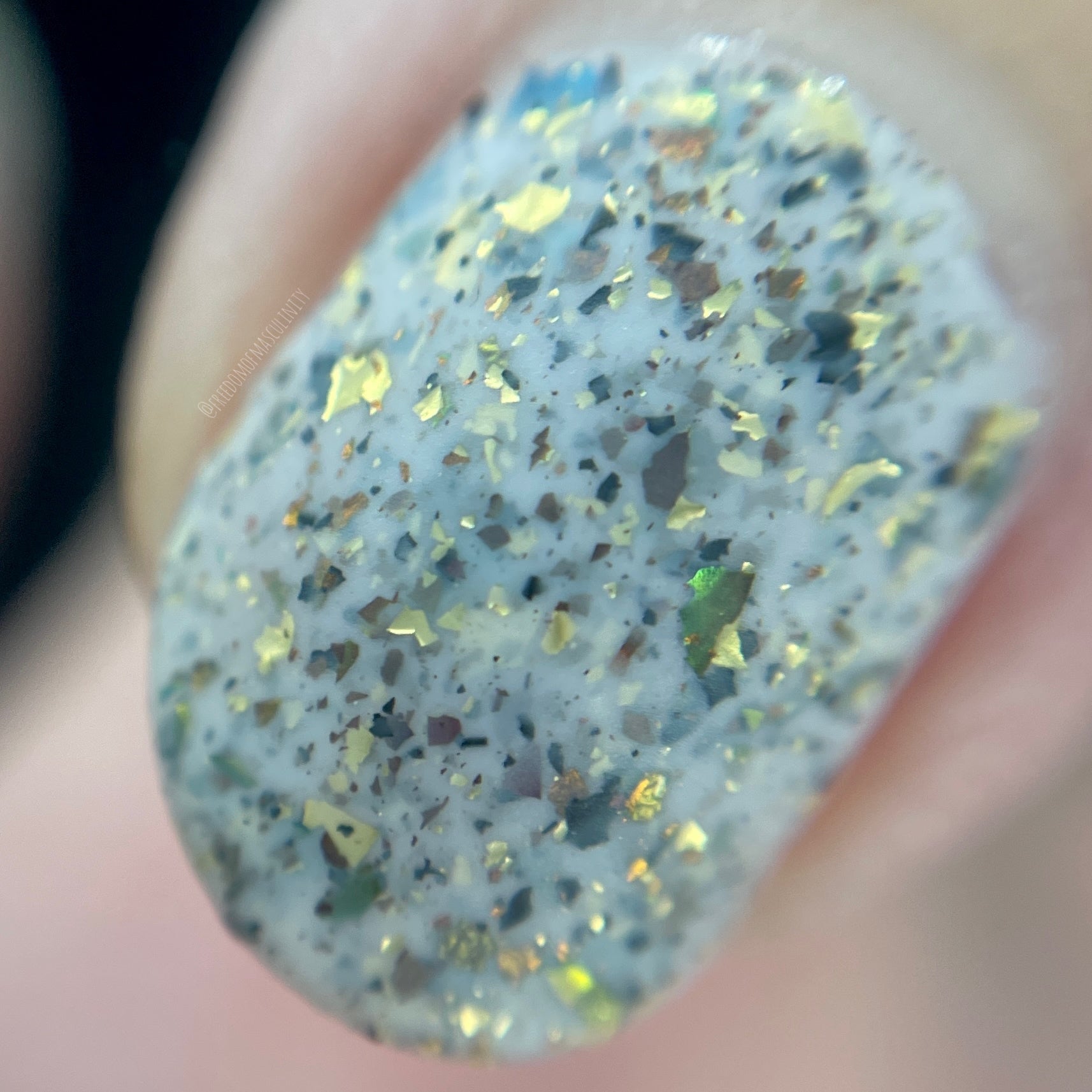 Nice Until Proven Naughty is a white polish with bronze, gold green chrome flakes, gold metallic flakes, and black microflakes.