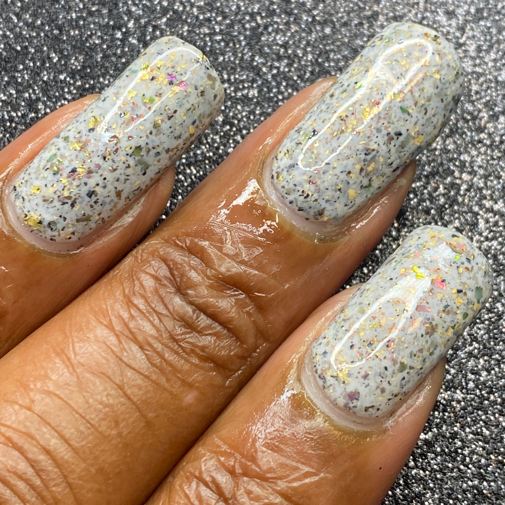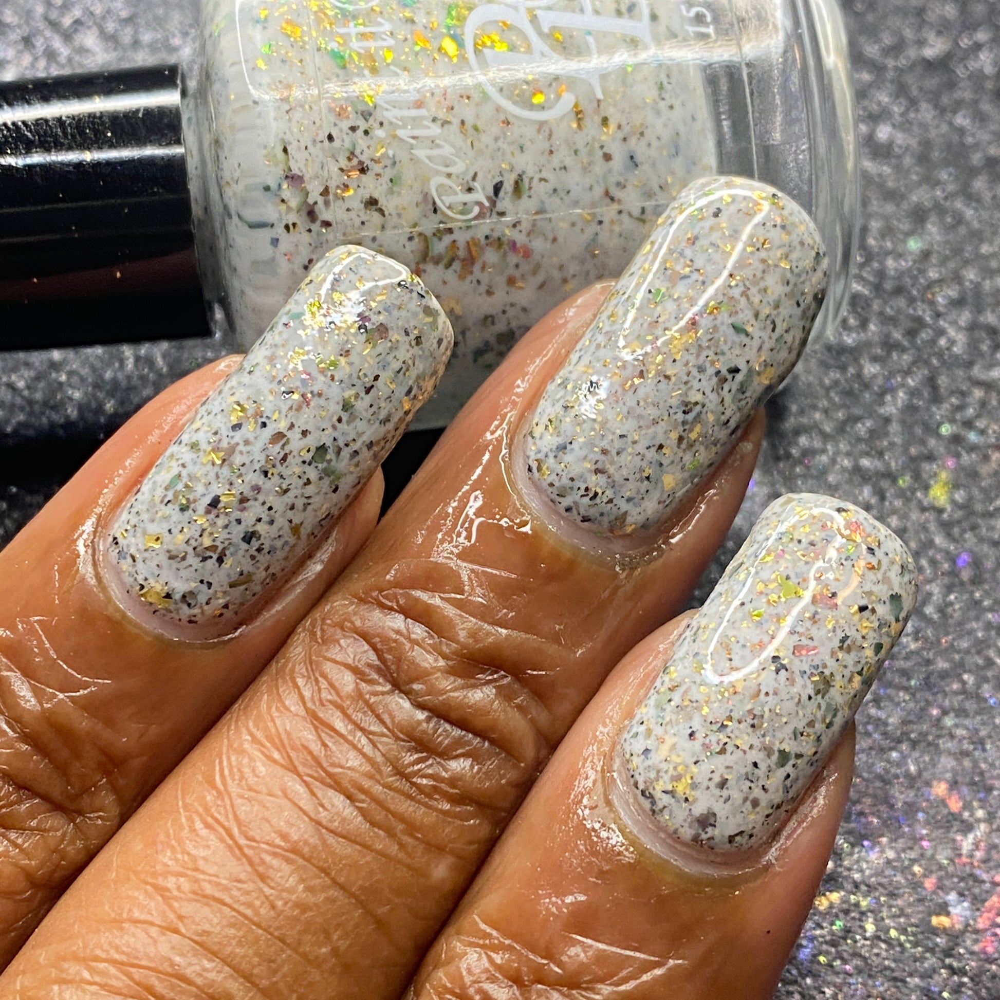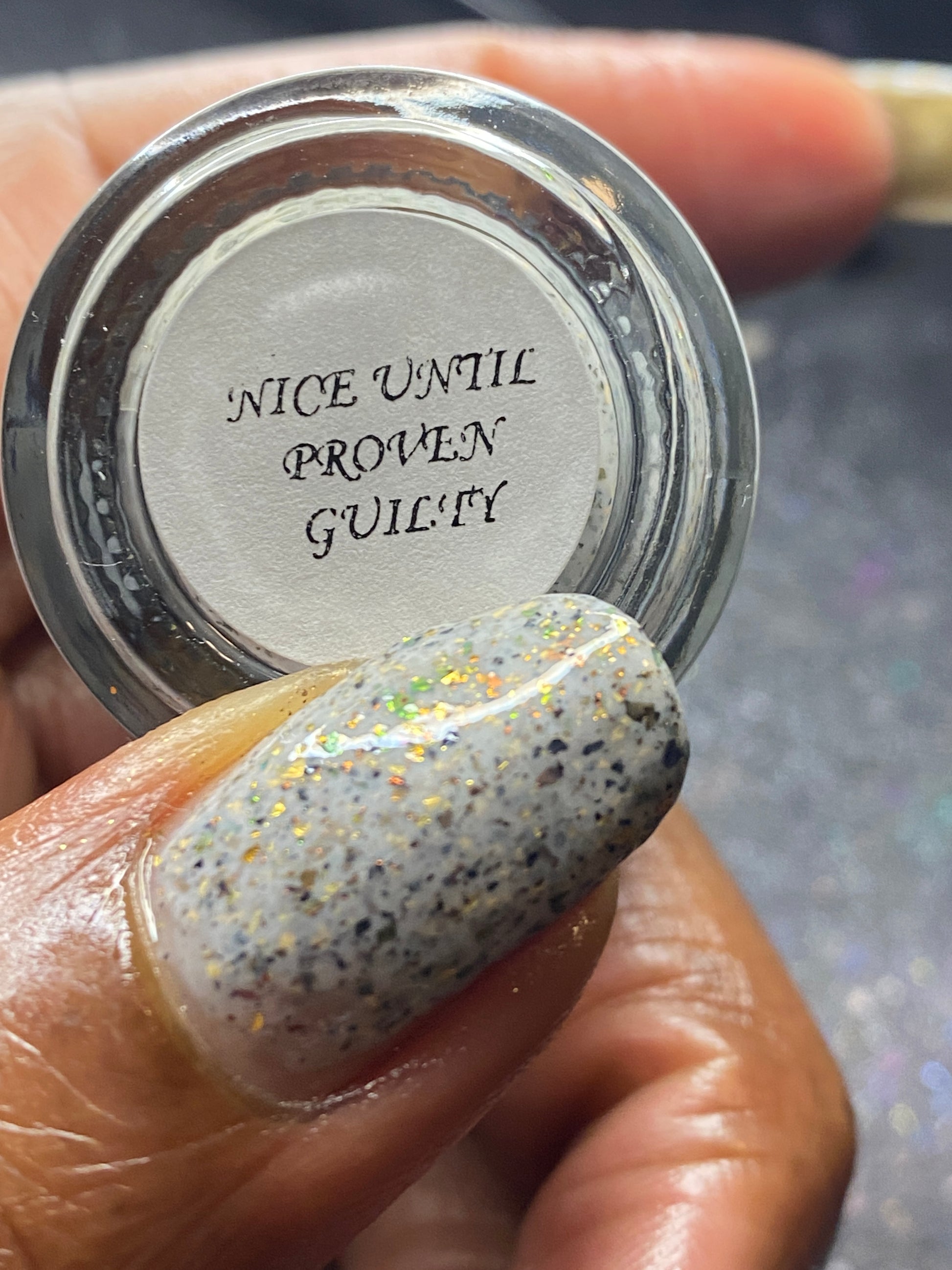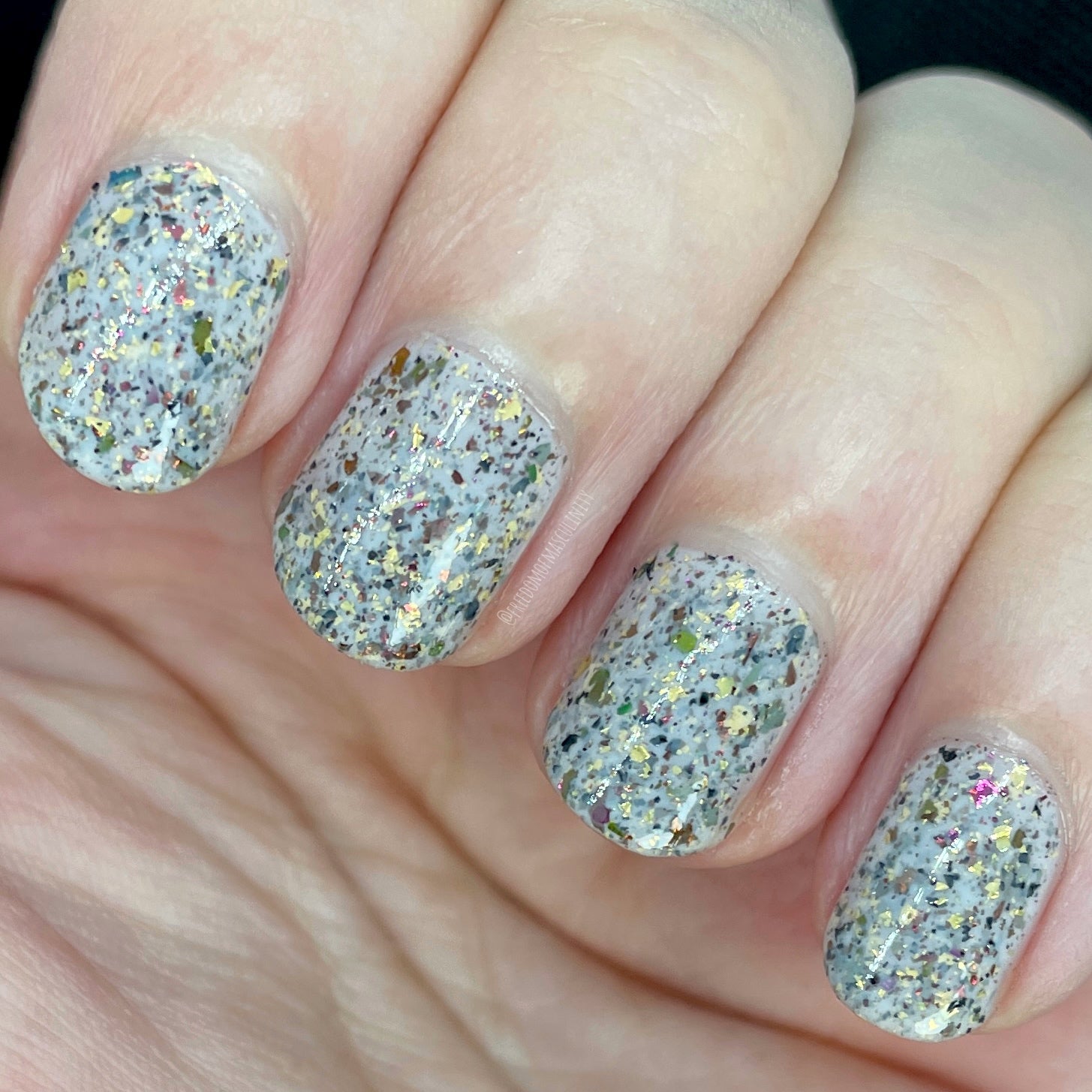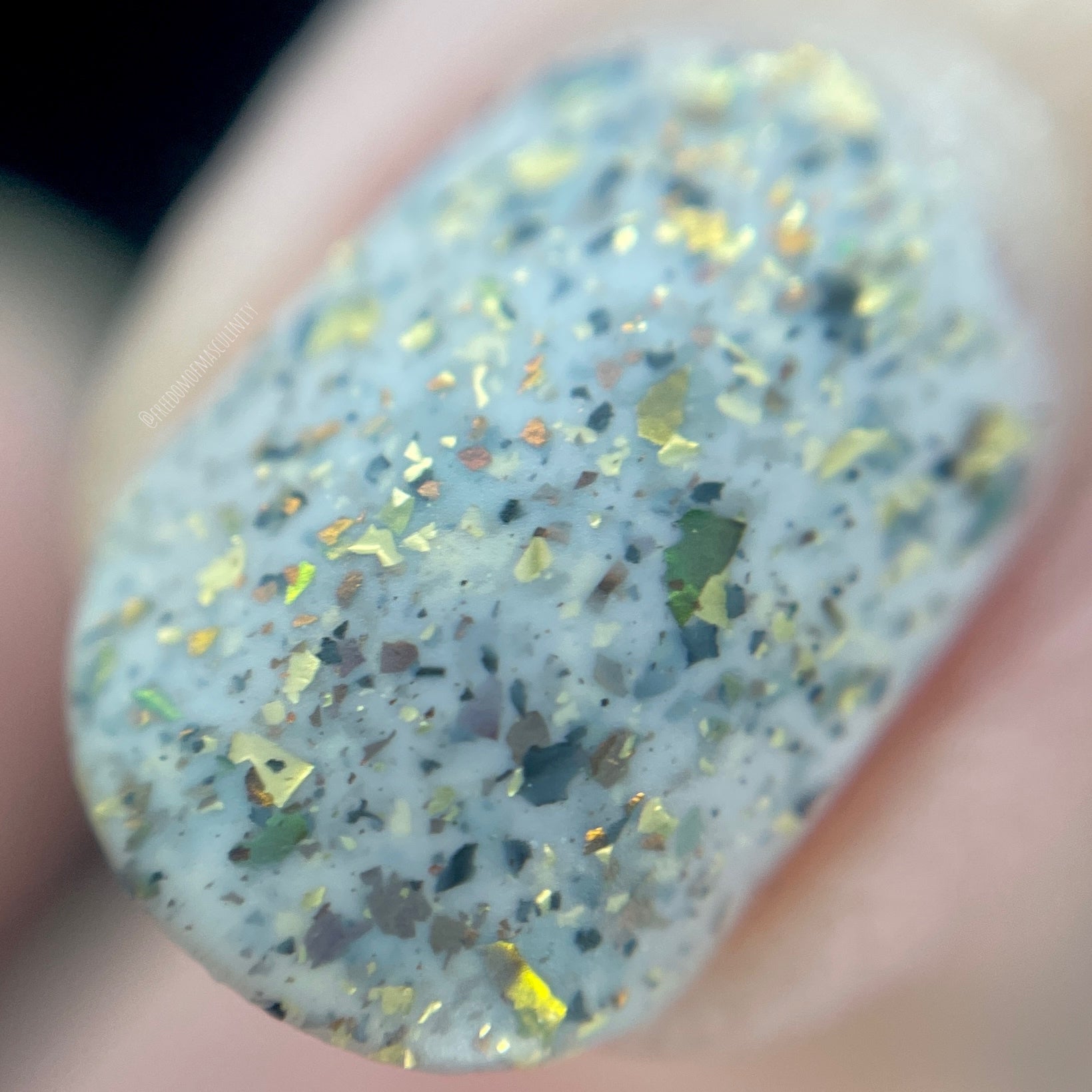 Nice Until Proven Naughty is a white polish with bronze, gold green chrome flakes, gold metallic flakes, and black microflakes.