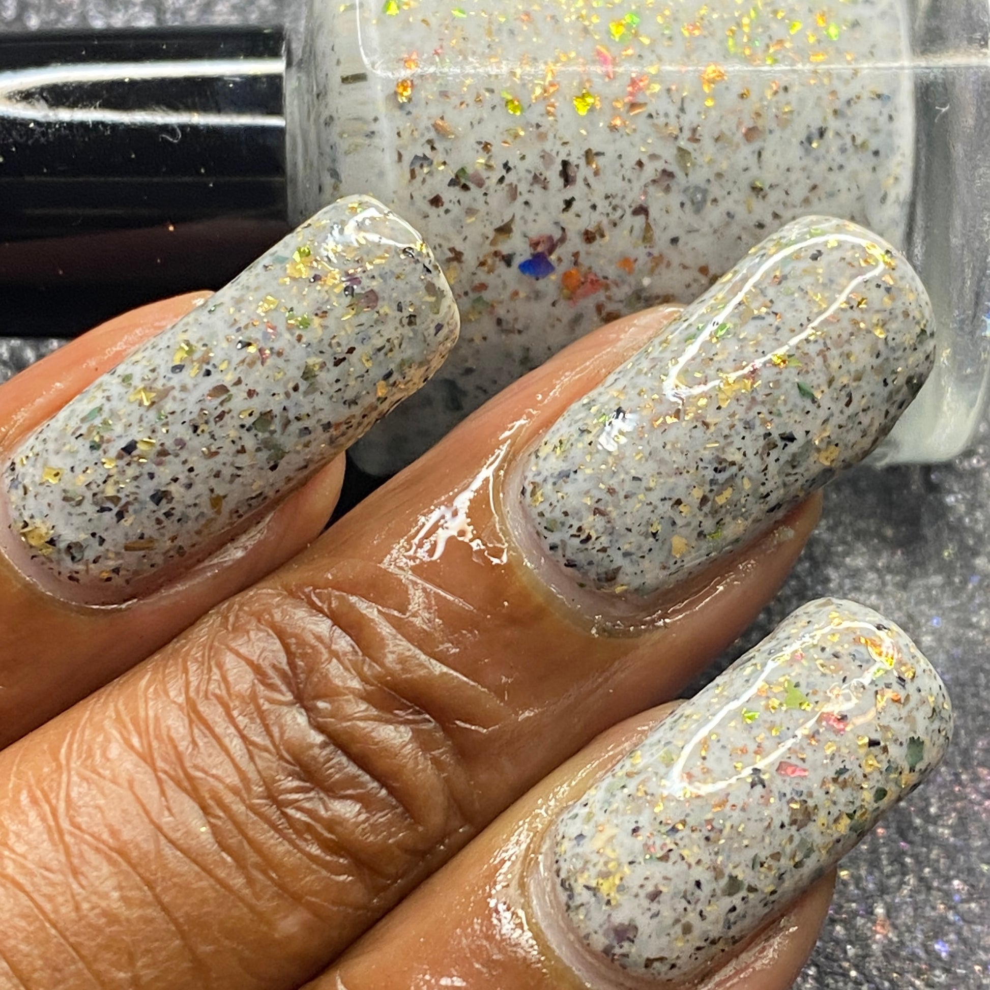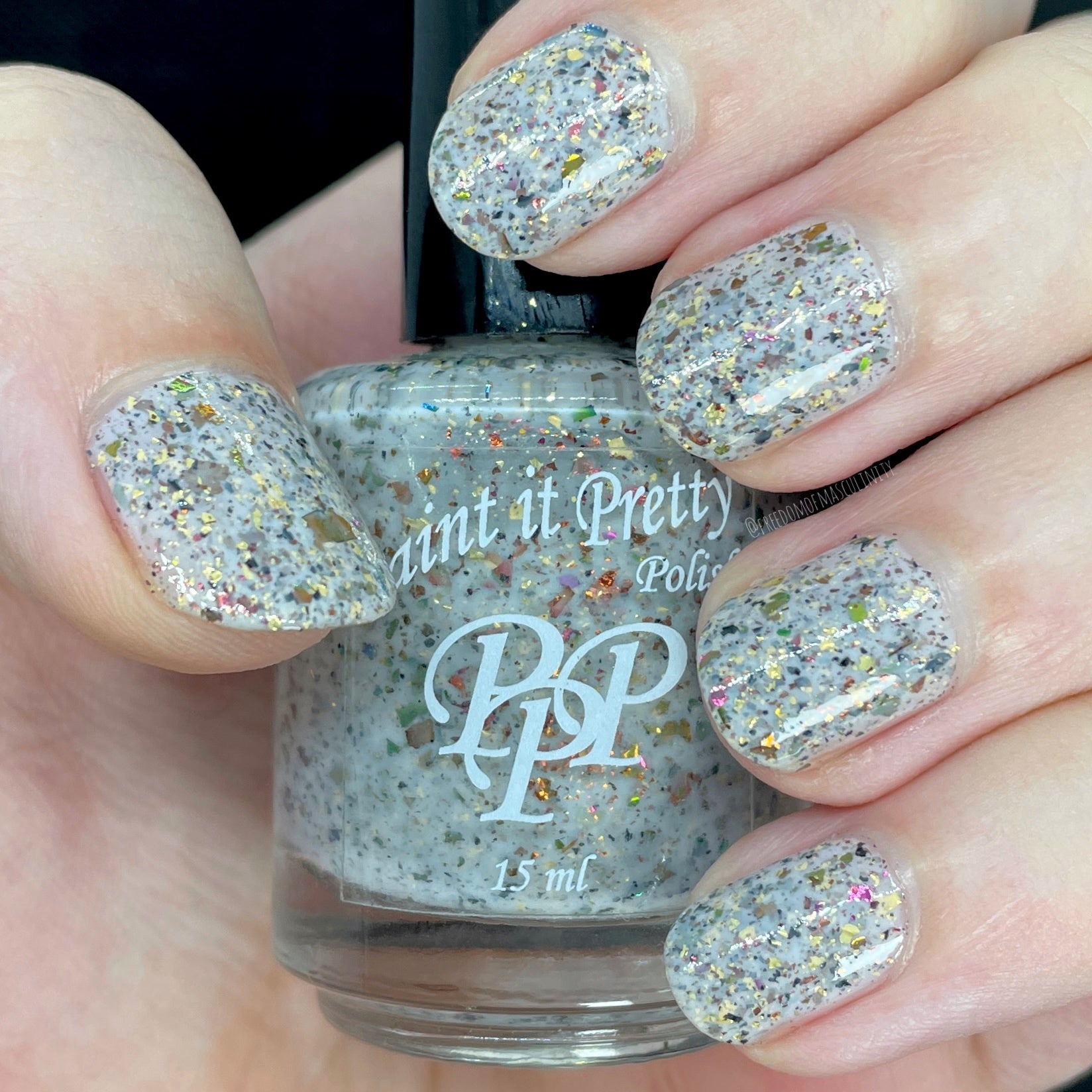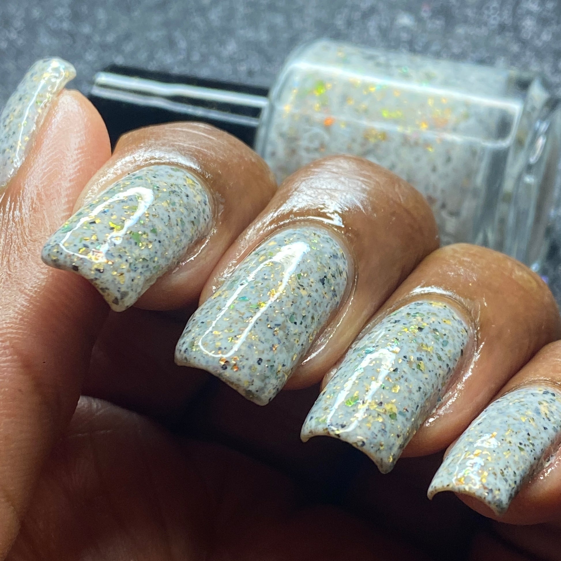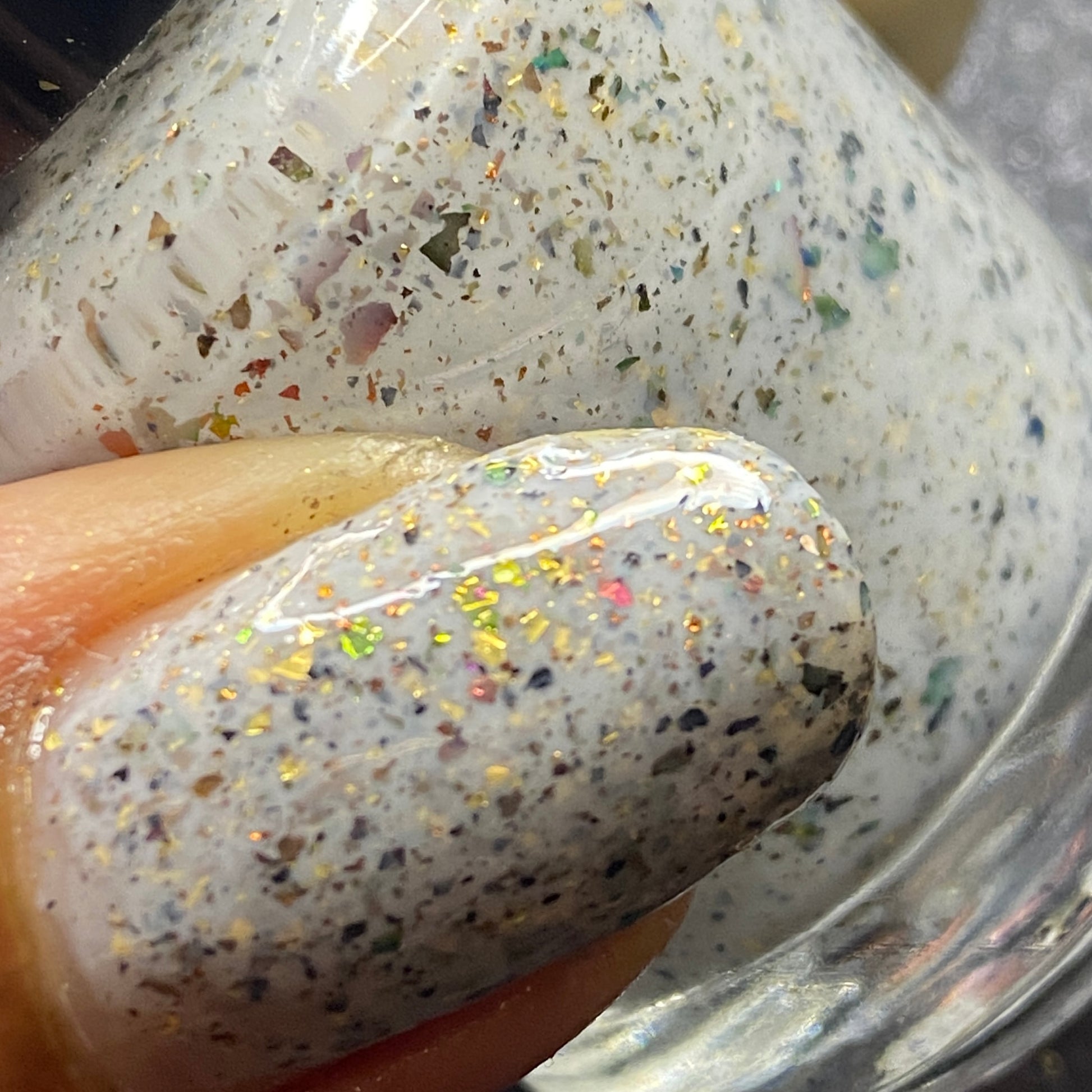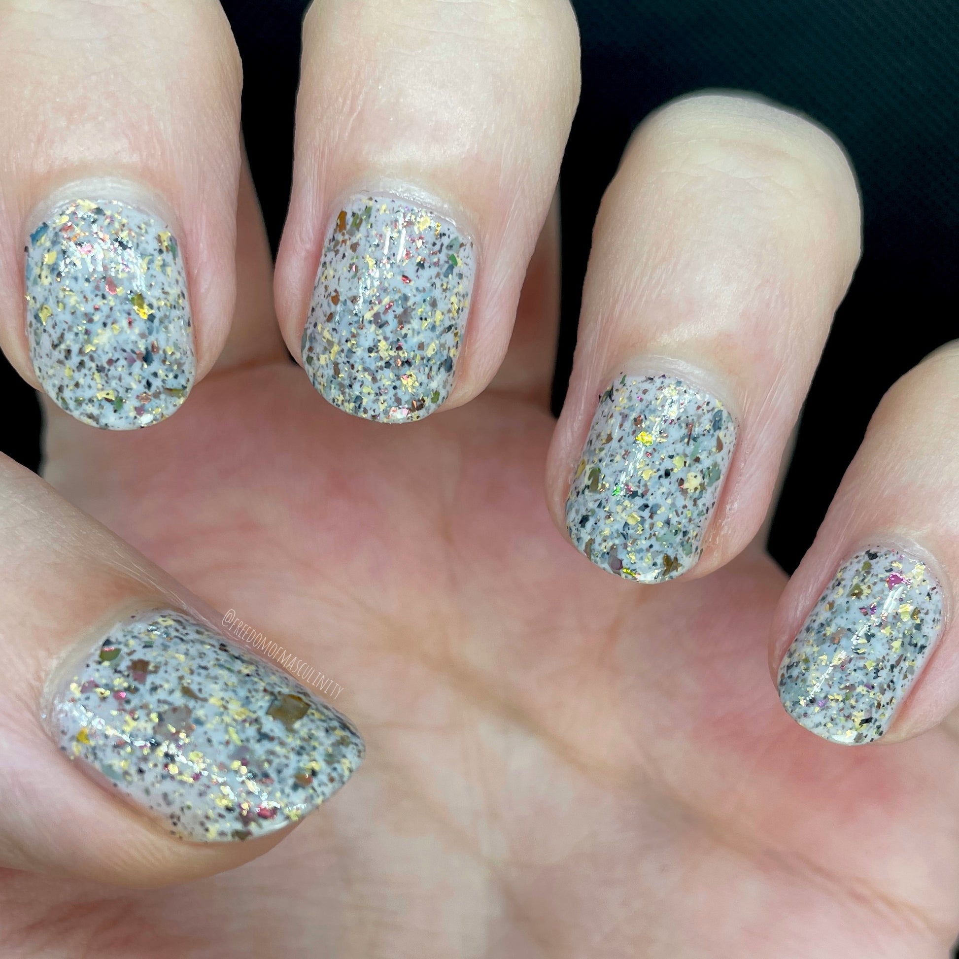Nice Until Proven Naughty is a white polish with bronze, gold green chrome flakes, gold metallic flakes, and black microflakes.
