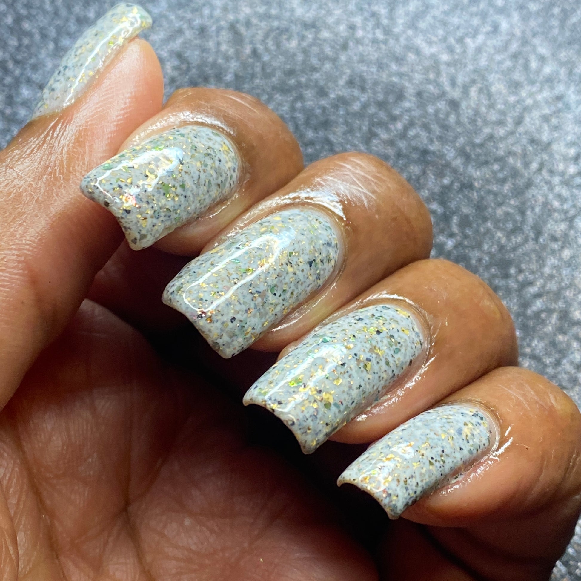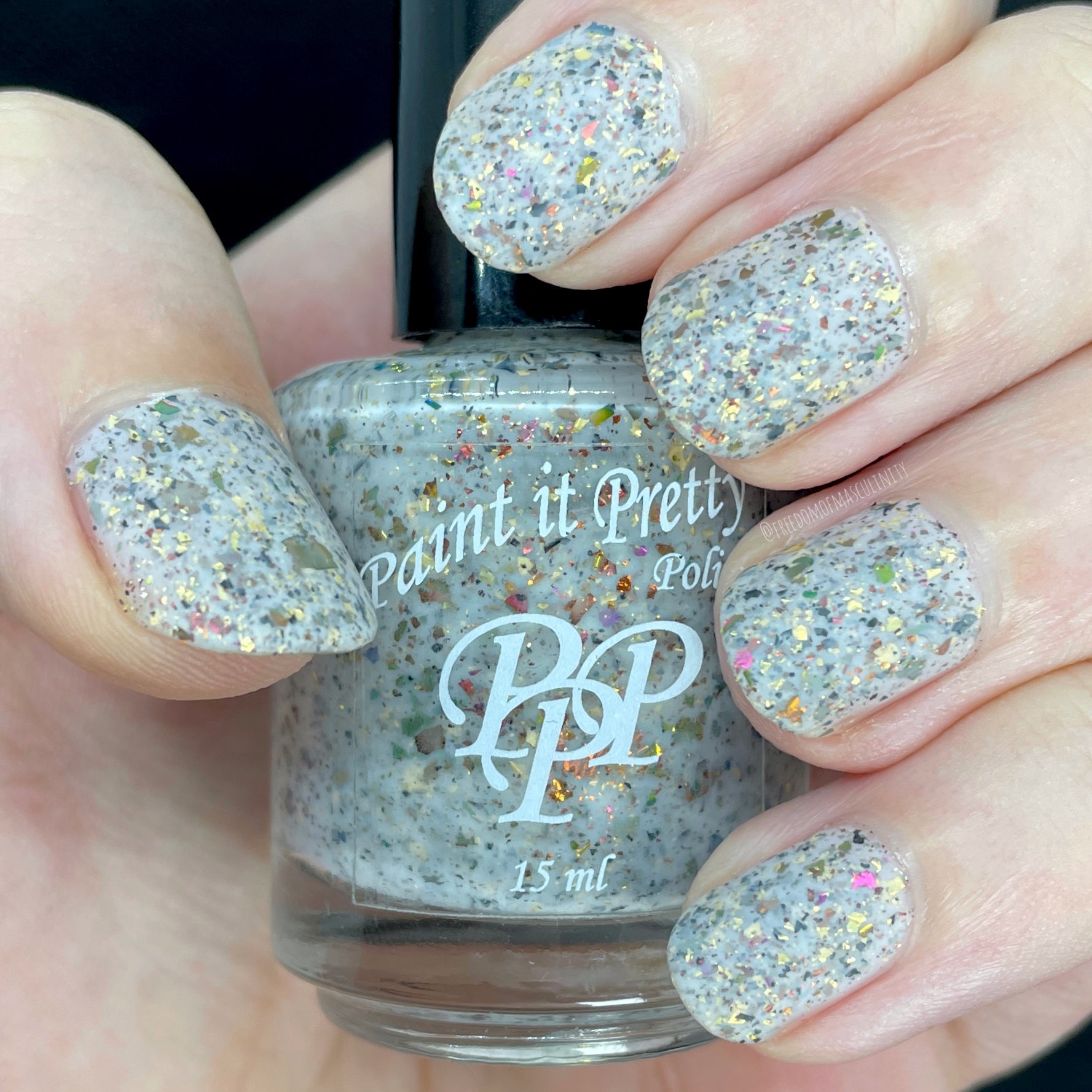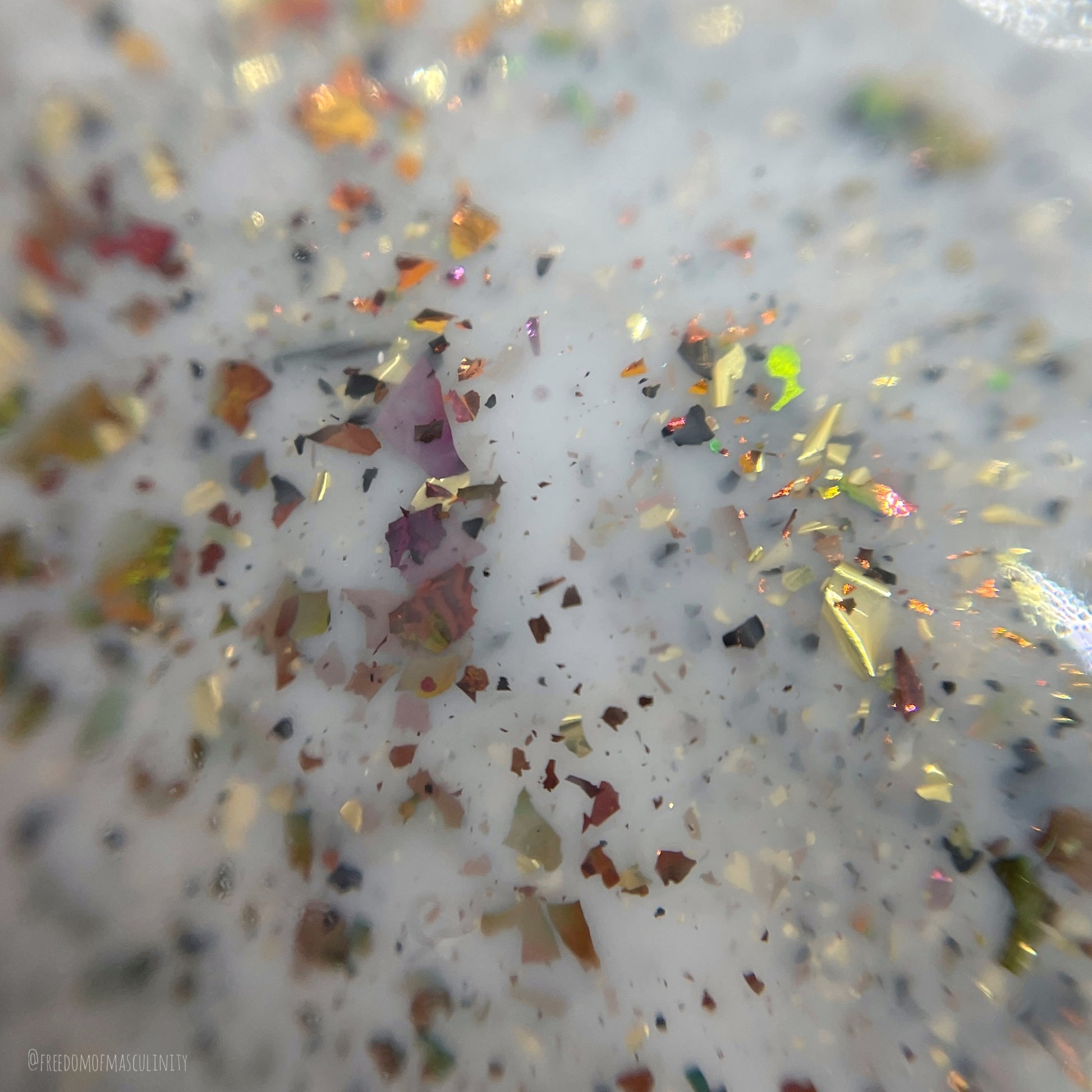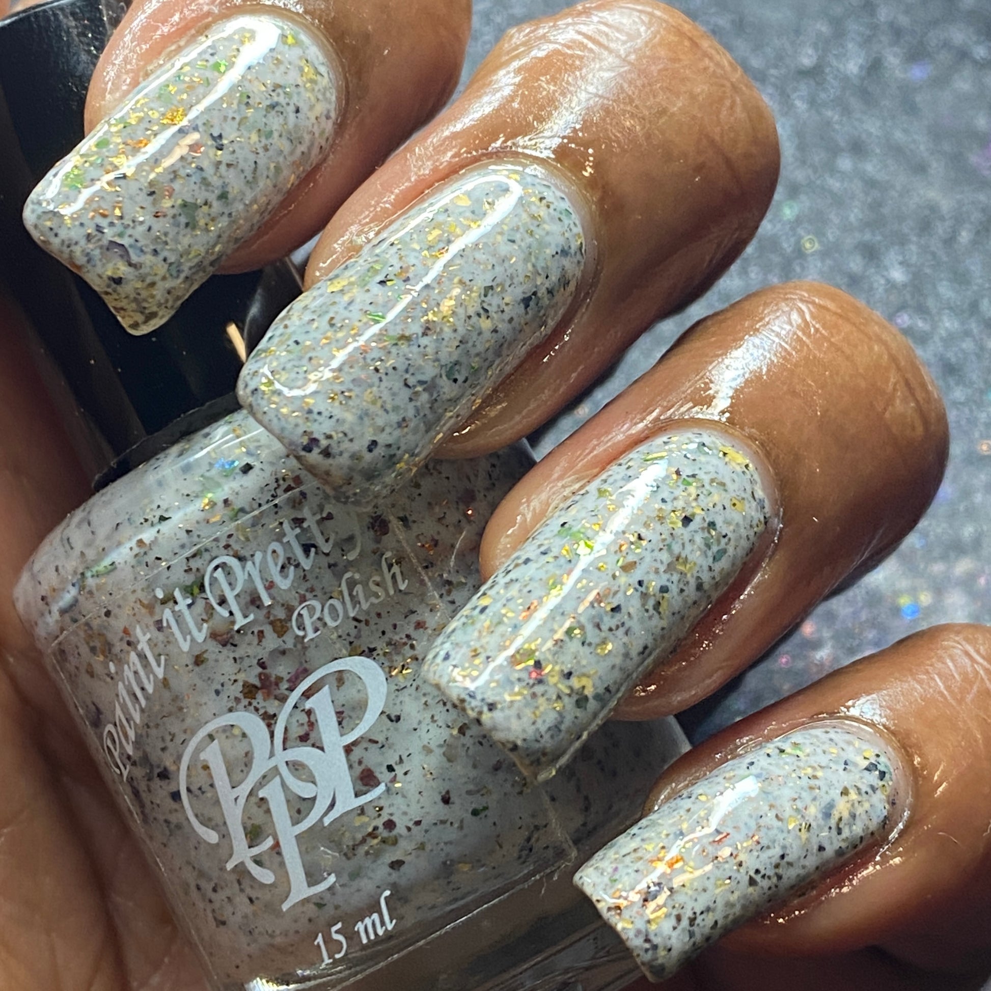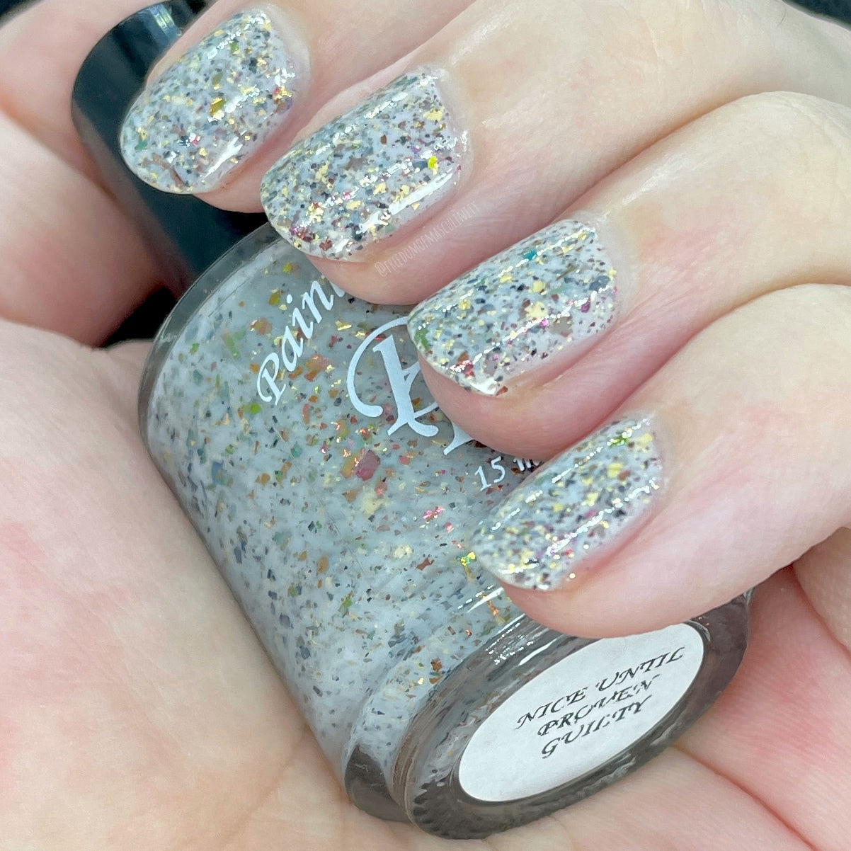 Nice Until Proven Naughty is a white polish with bronze, gold green chrome flakes, gold metallic flakes, and black microflakes.