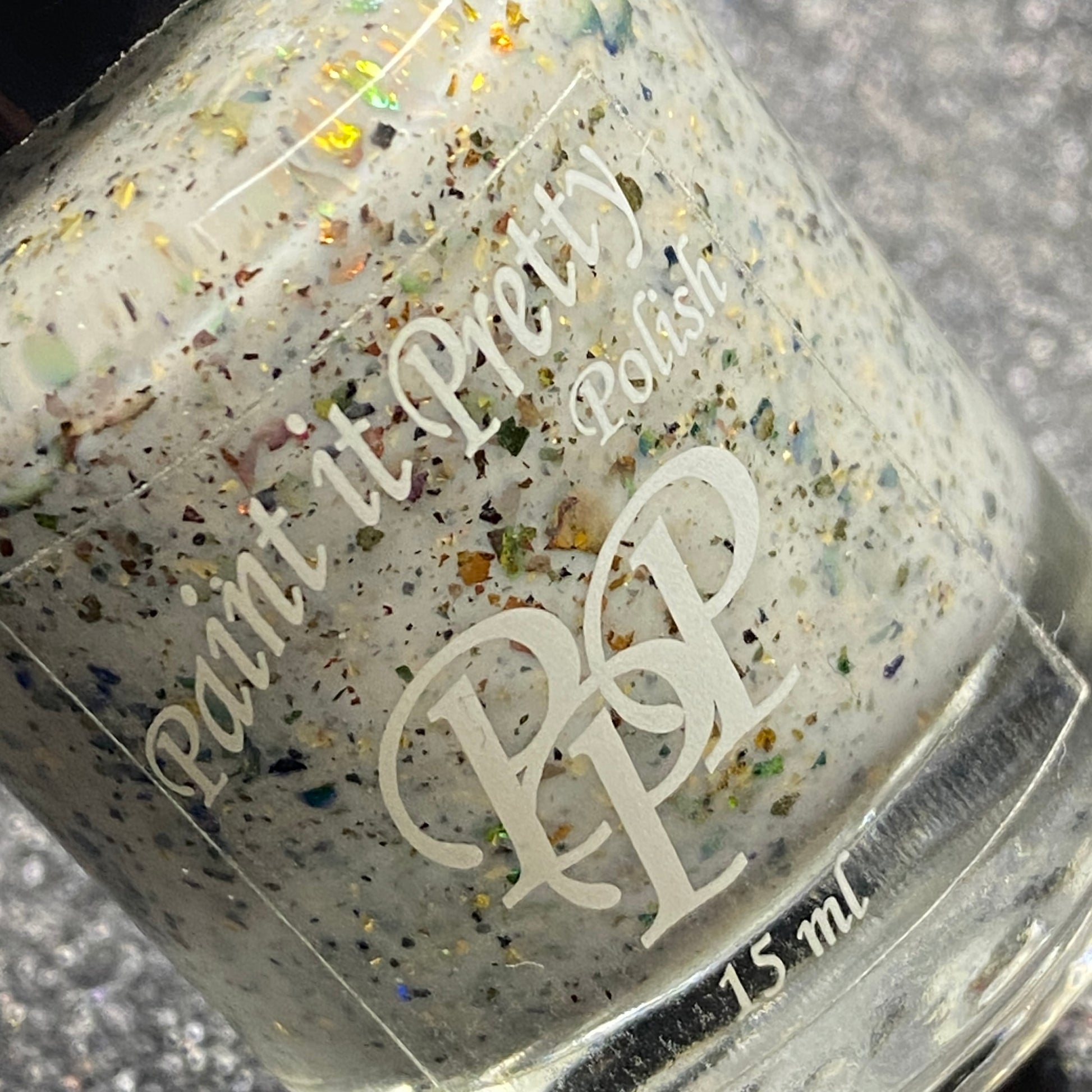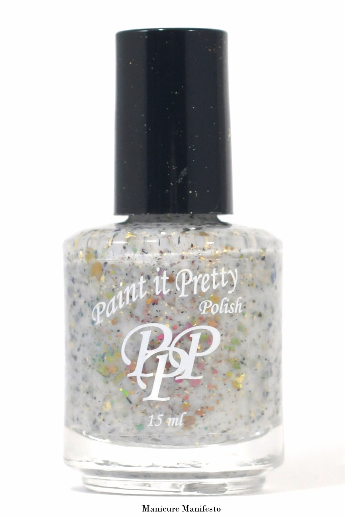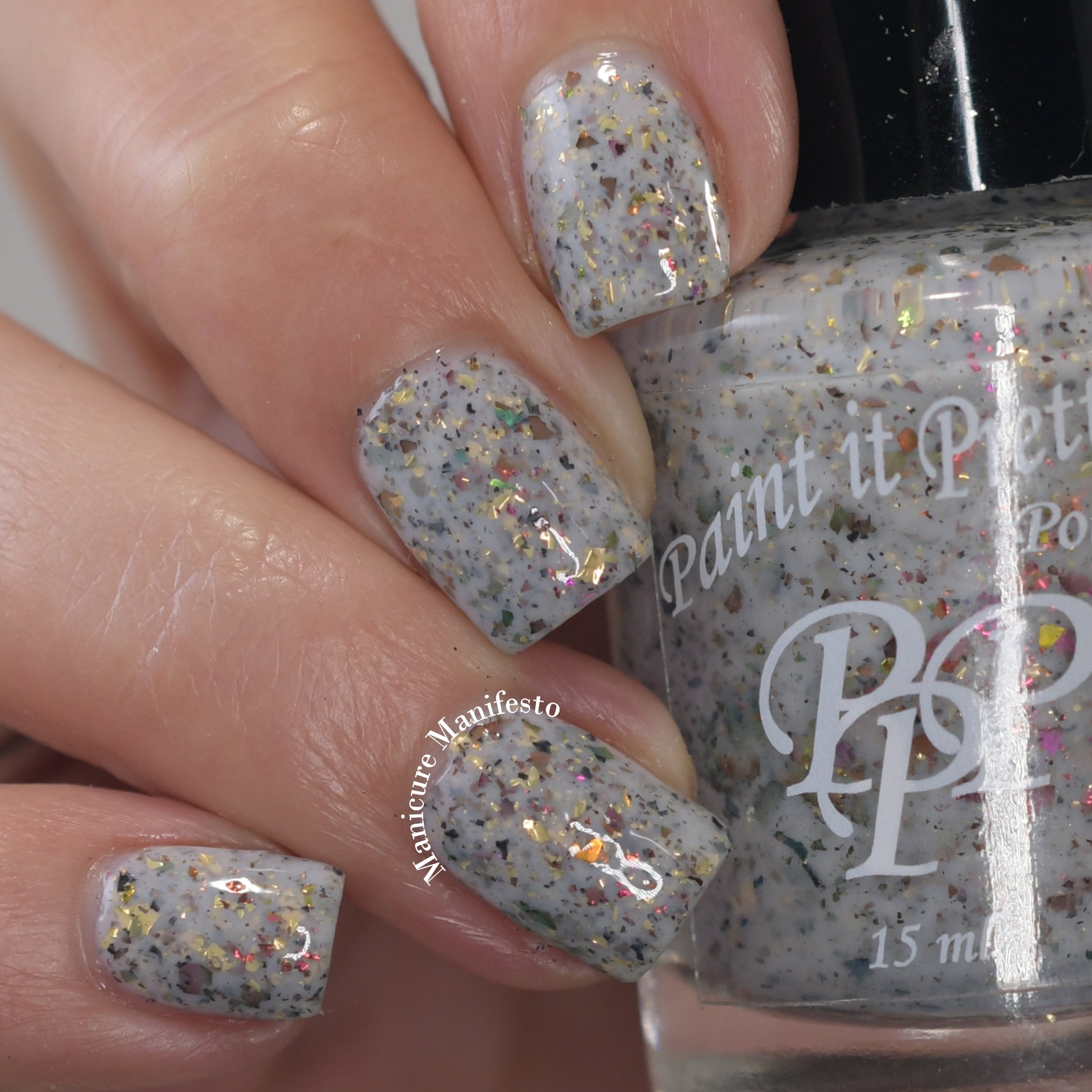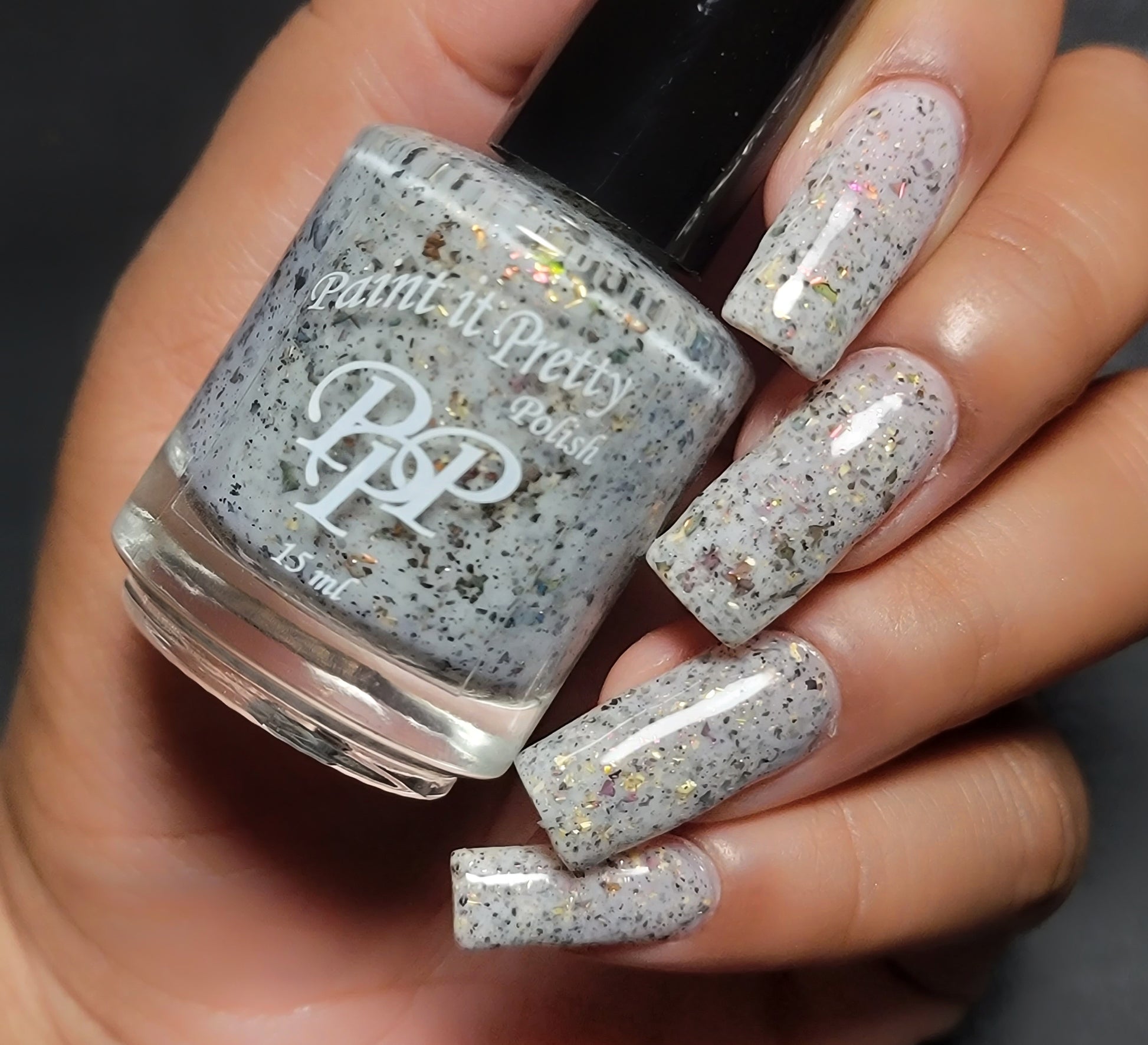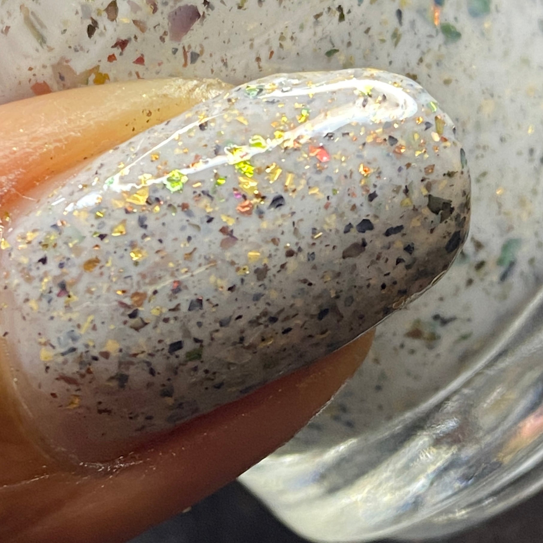 Nice Until Proven Naughty is a white polish with bronze, gold green chrome flakes, gold metallic flakes, and black microflakes.