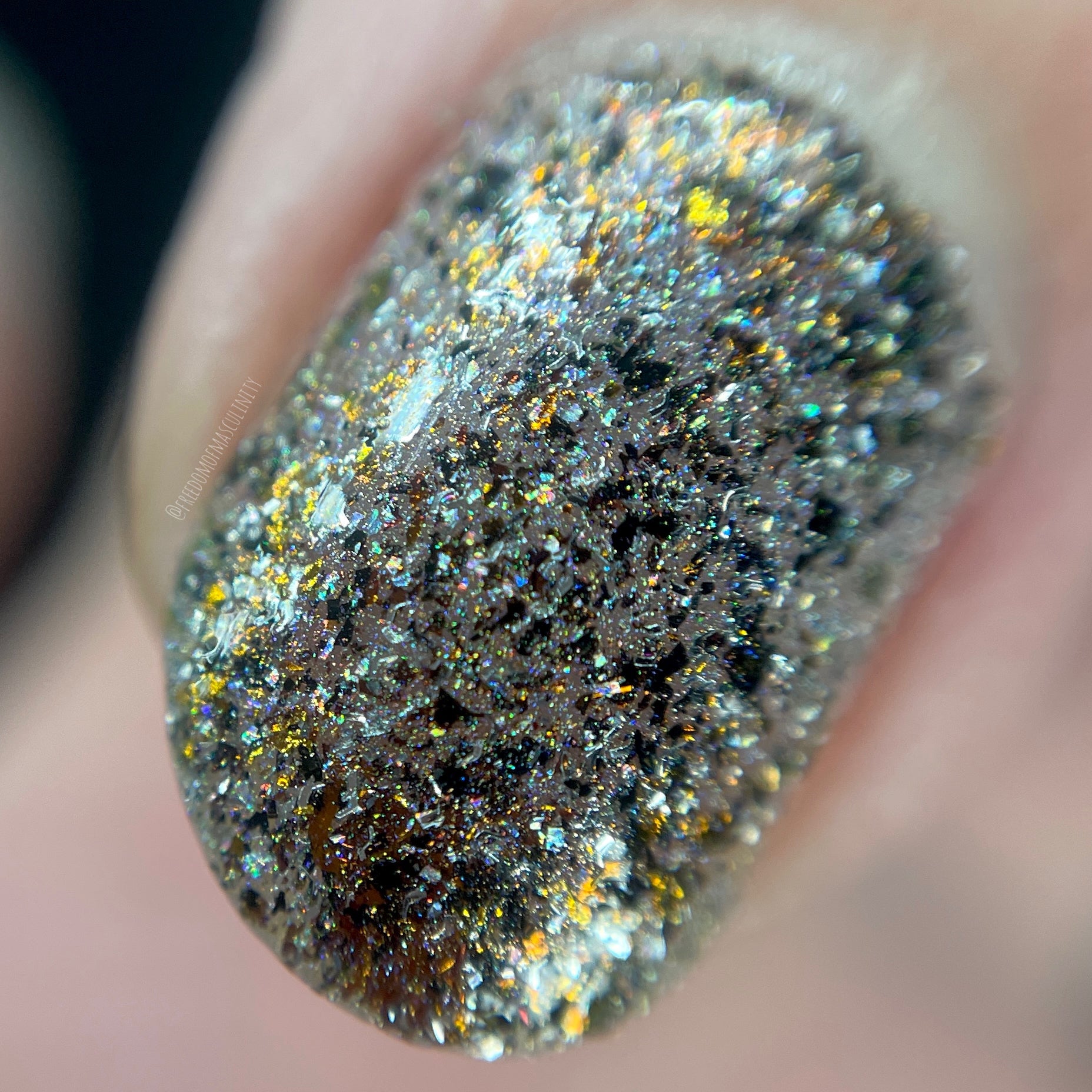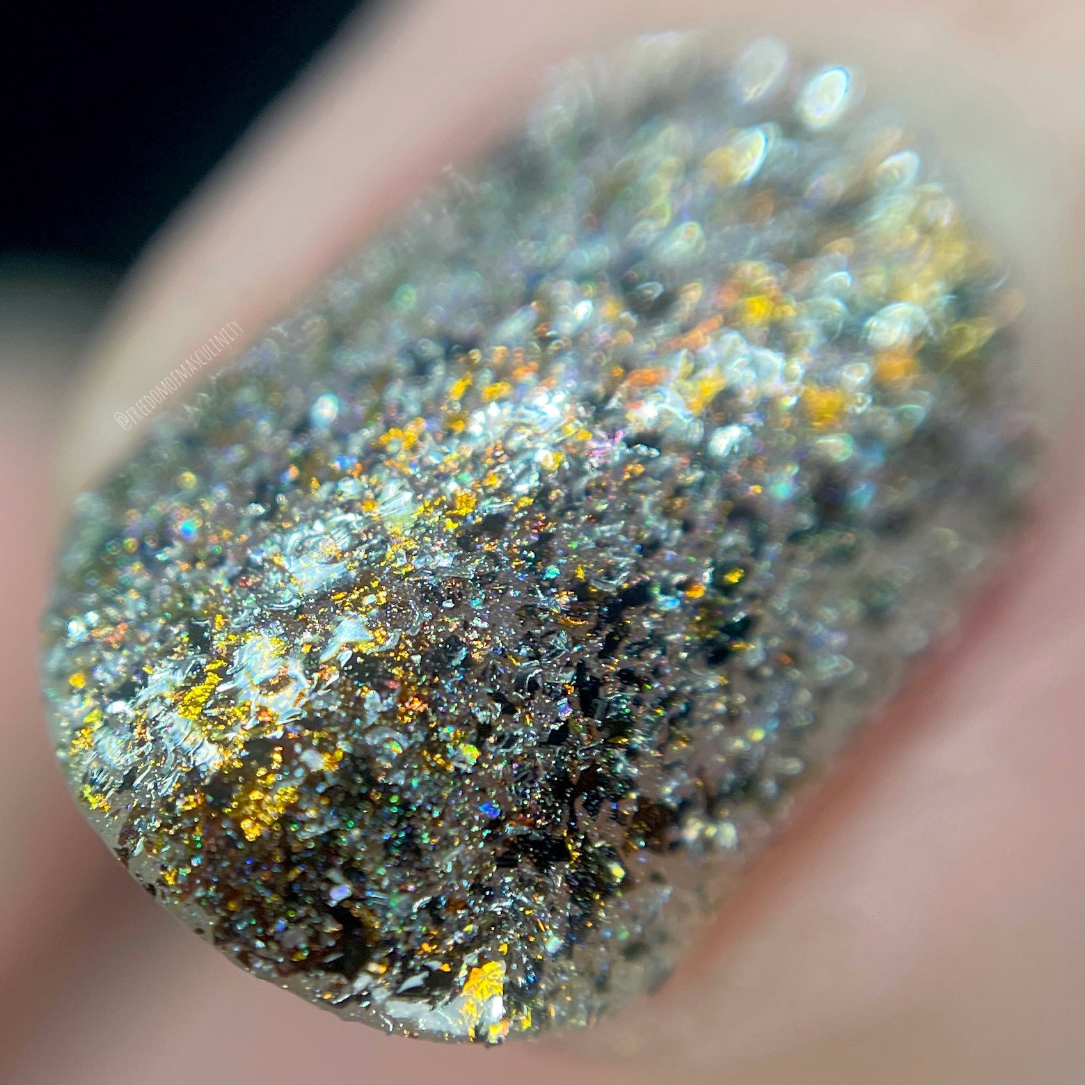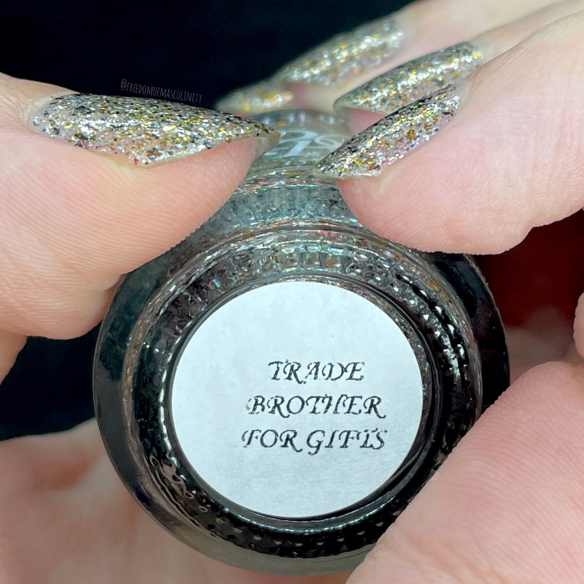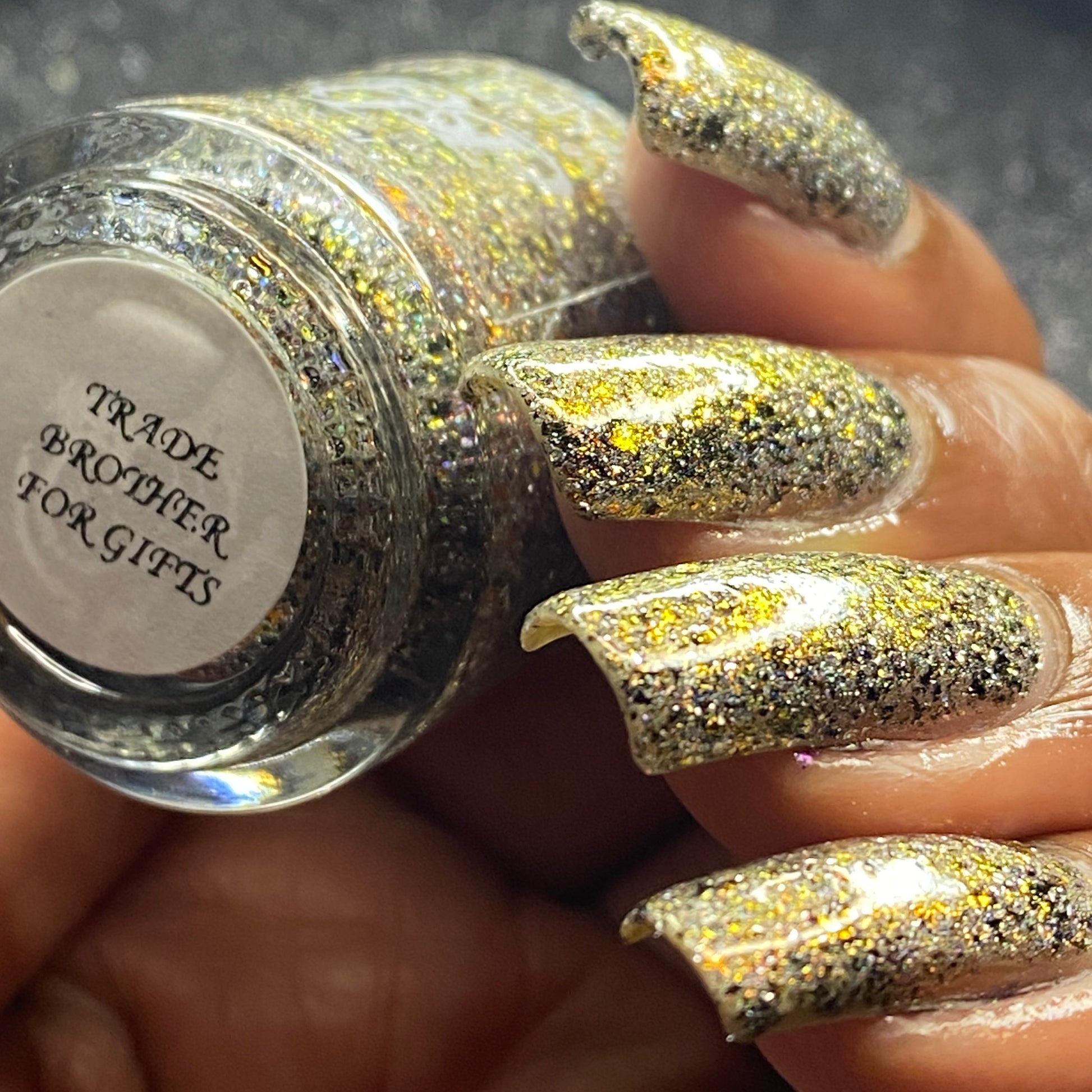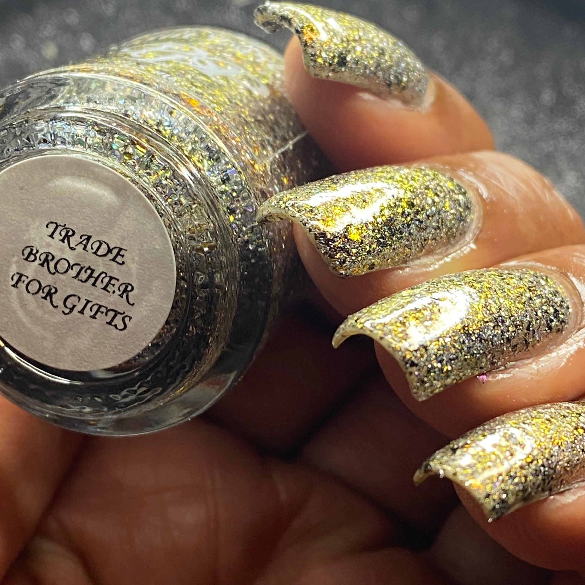 Trade Brother For Gifts is a silver flakie bomb packed with red, bronze, gold chameleon flakies, black microflakes, and holographic microflakes