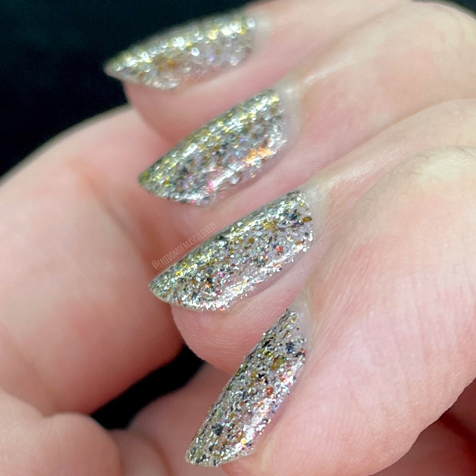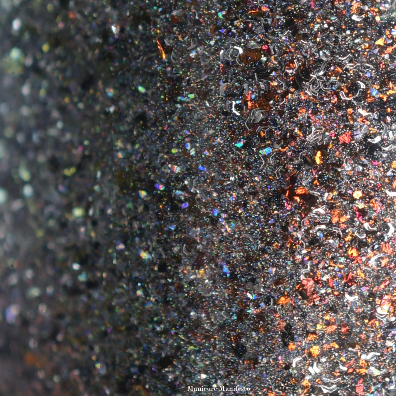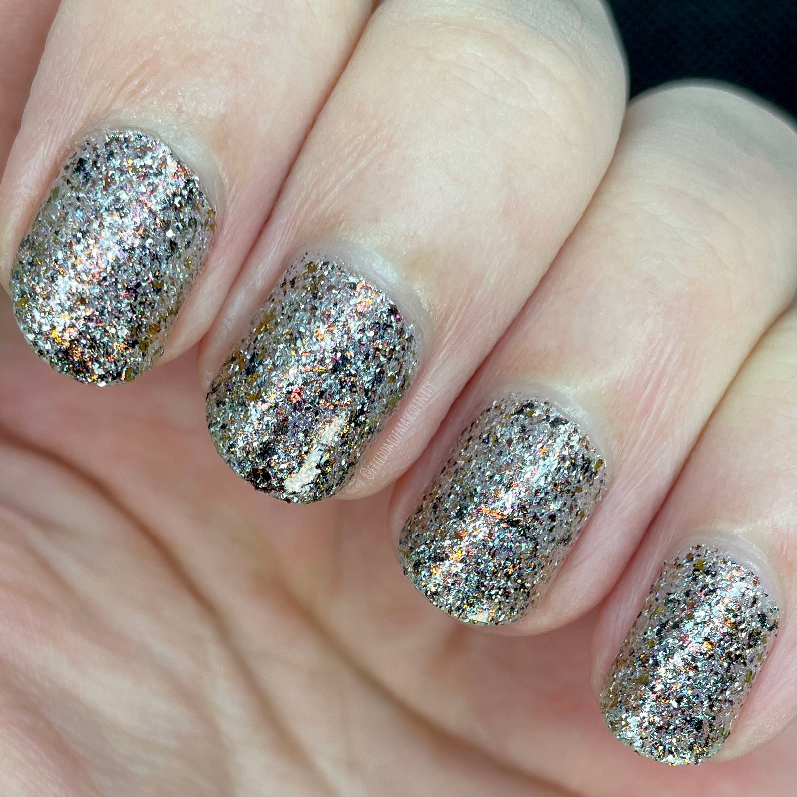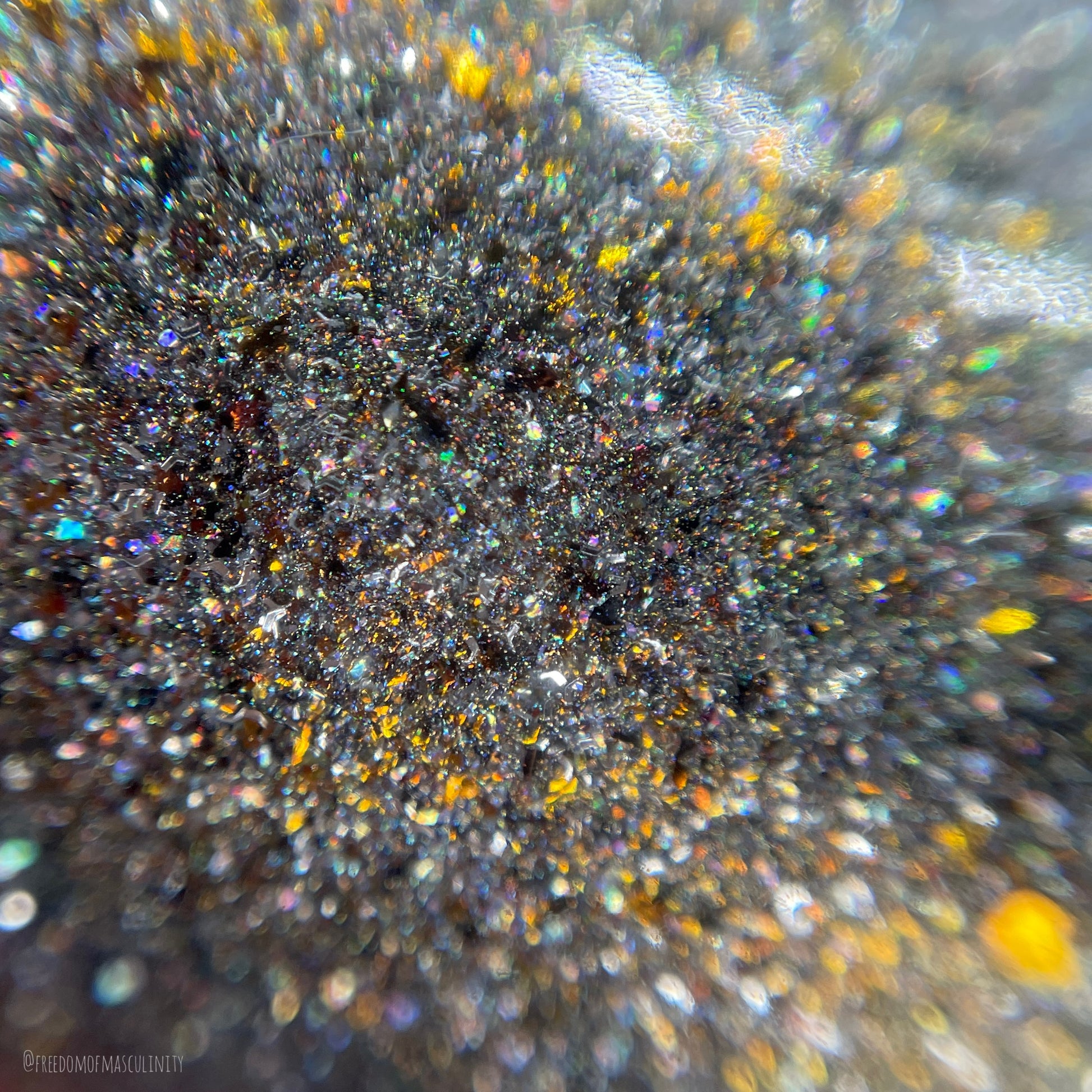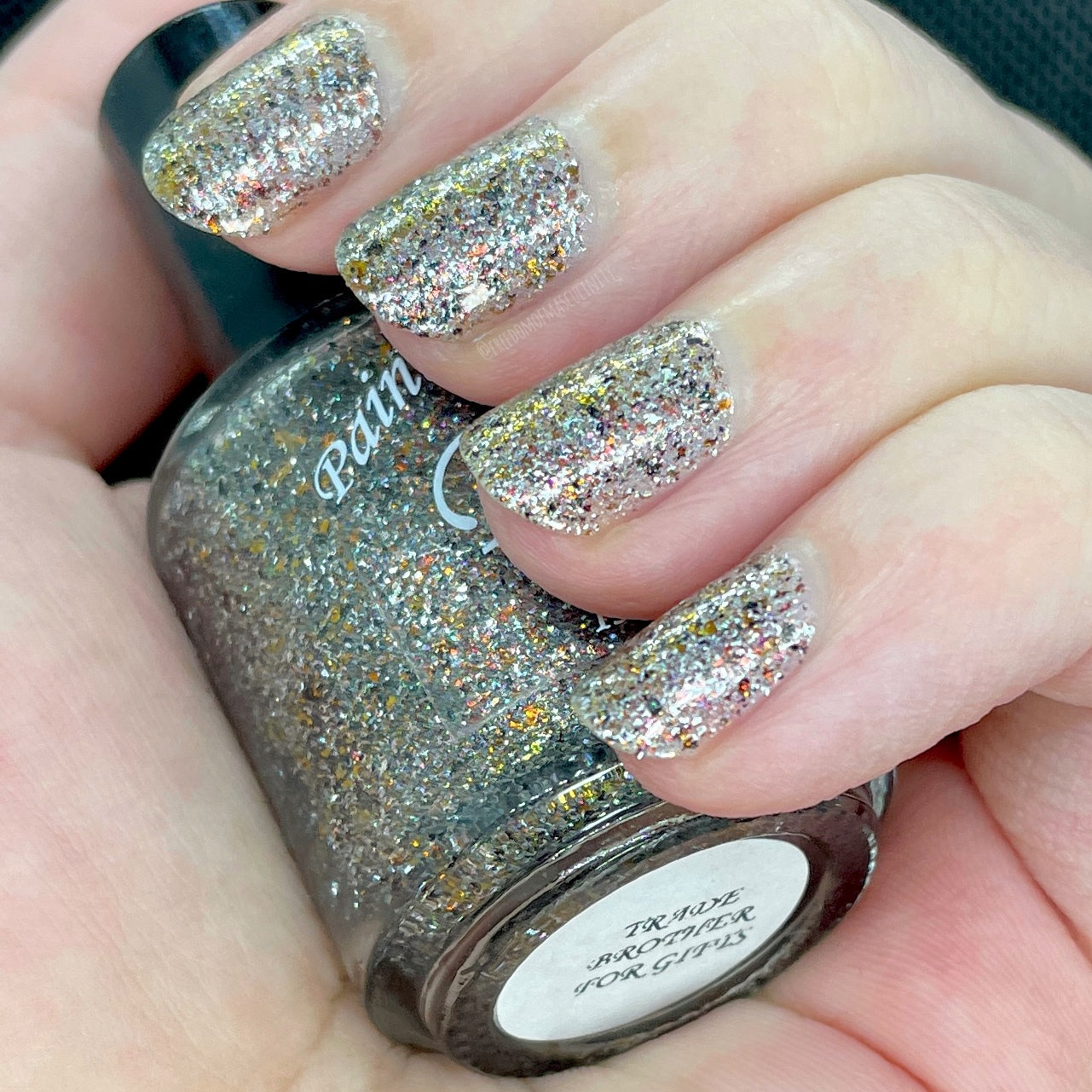 Trade Brother For Gifts is a silver flakie bomb packed with red, bronze, gold chameleon flakies, black microflakes, and holographic microflakes