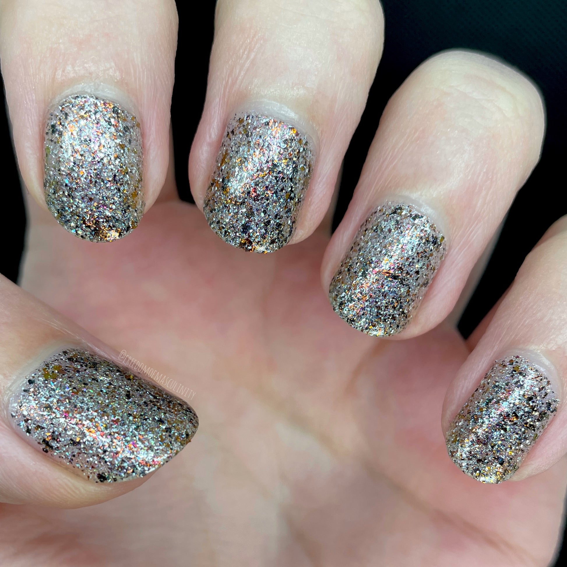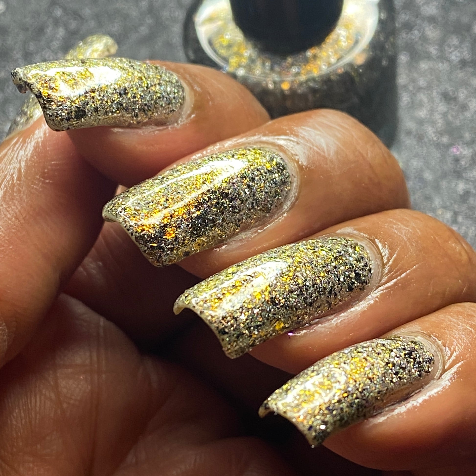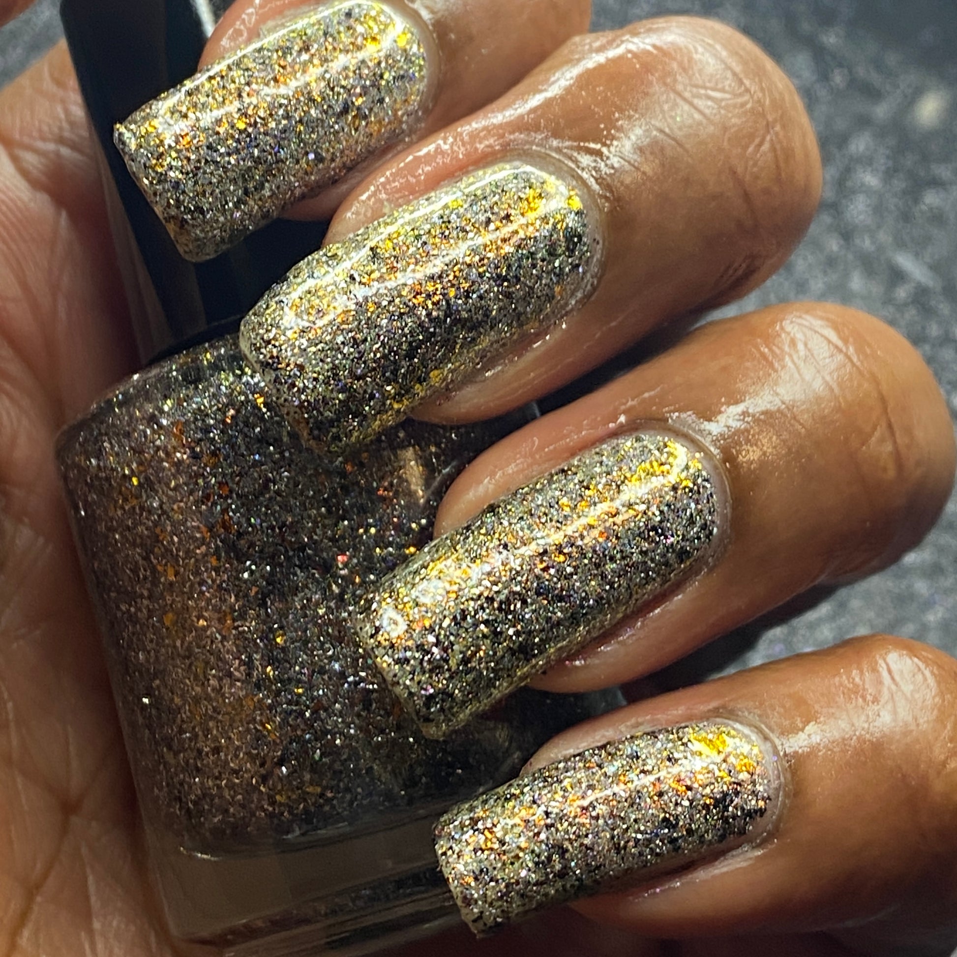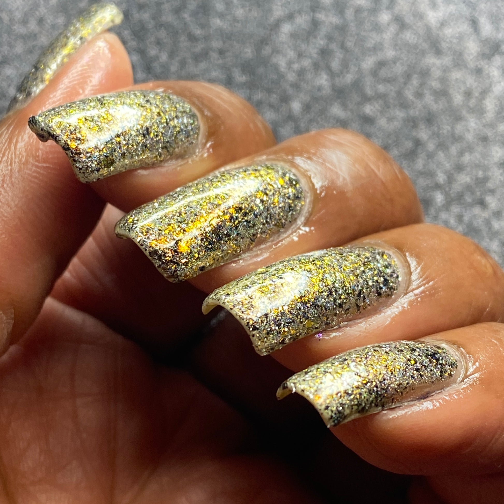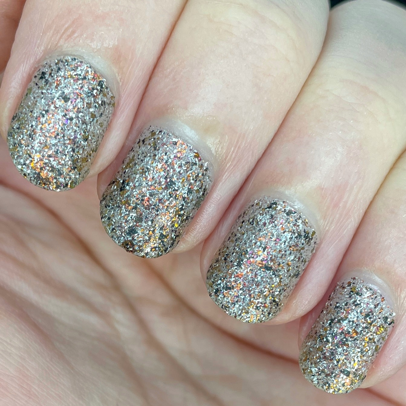 Trade Brother For Gifts is a silver flakie bomb packed with red, bronze, gold chameleon flakies, black microflakes, and holographic microflakes