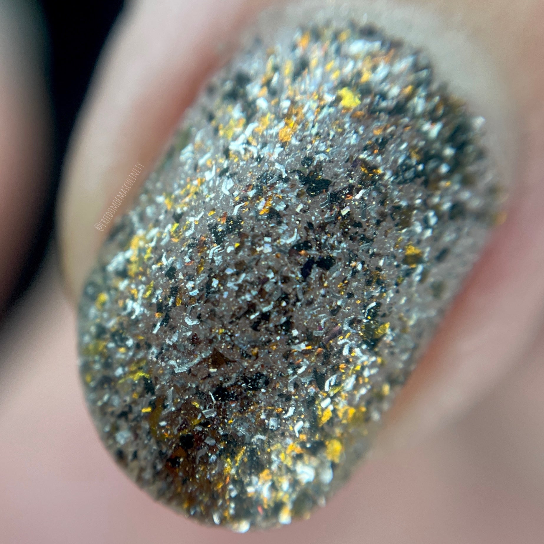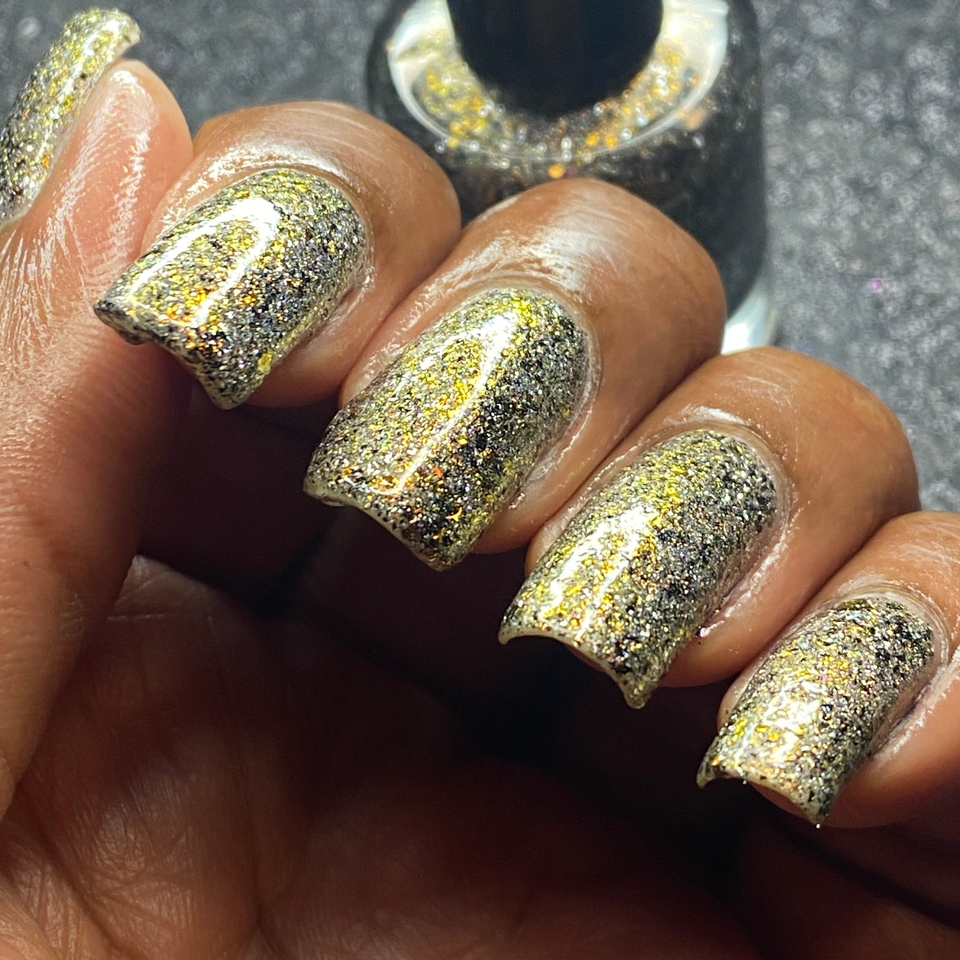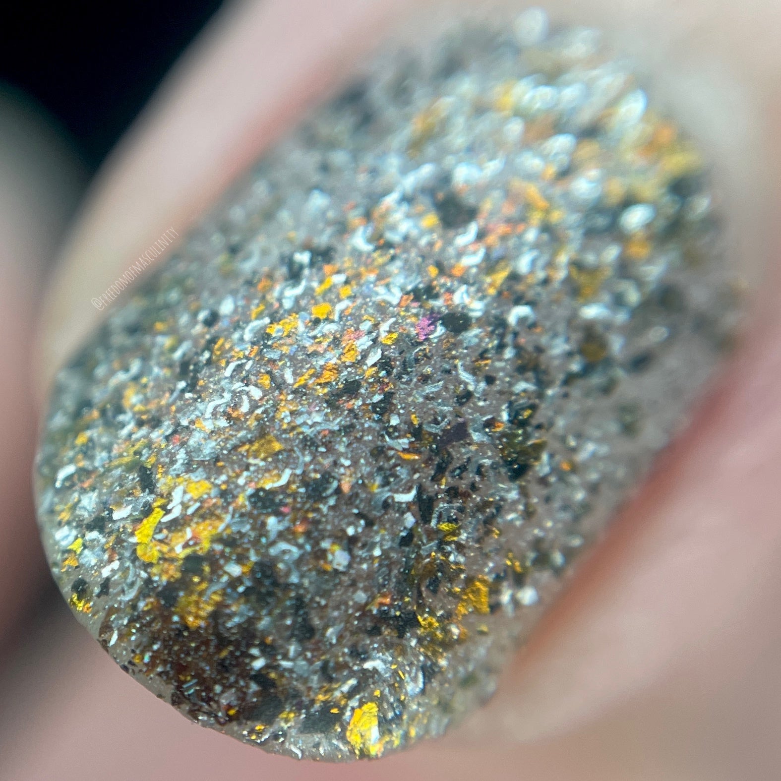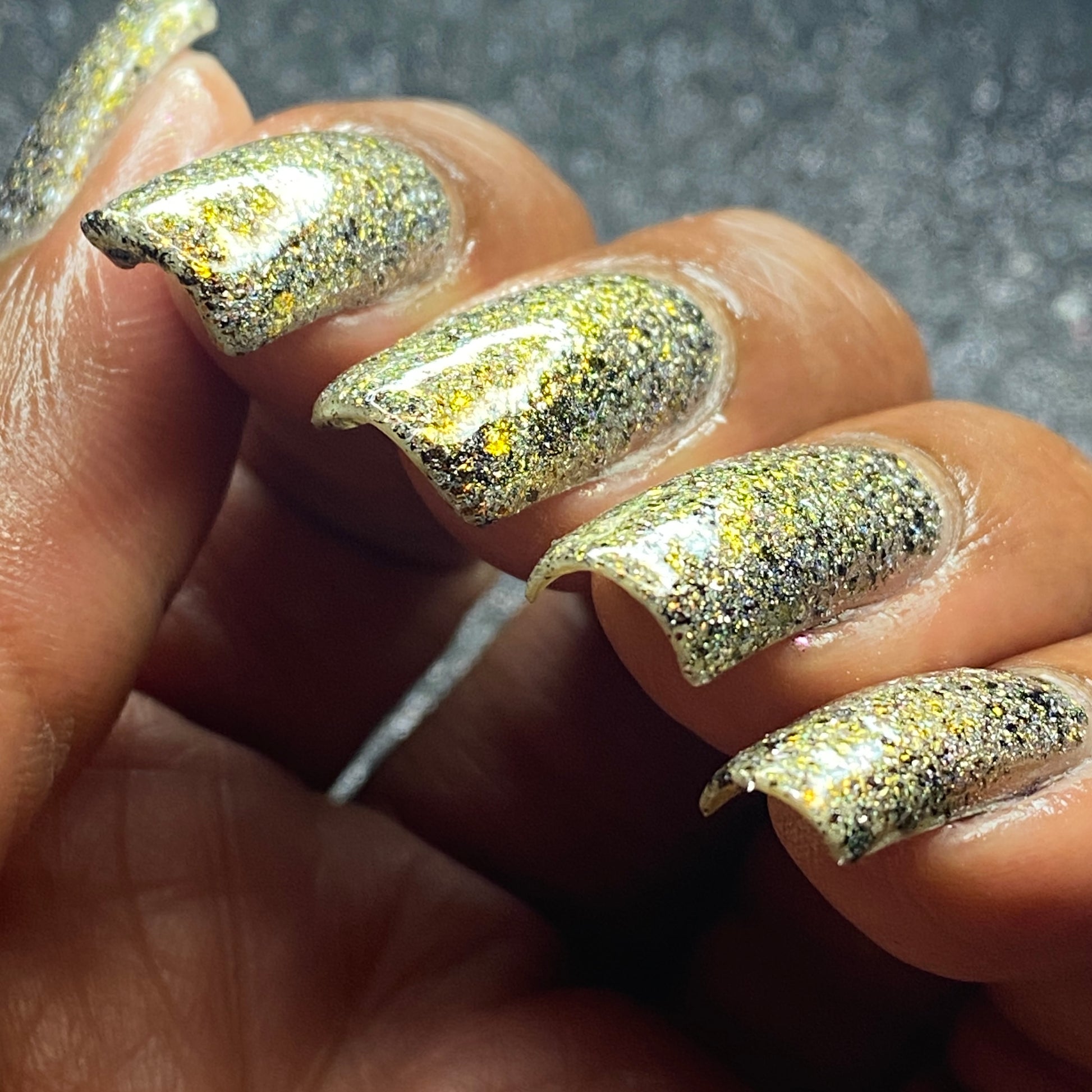Trade Brother For Gifts is a silver flakie bomb packed with red, bronze, gold chameleon flakies, black microflakes, and holographic microflakes