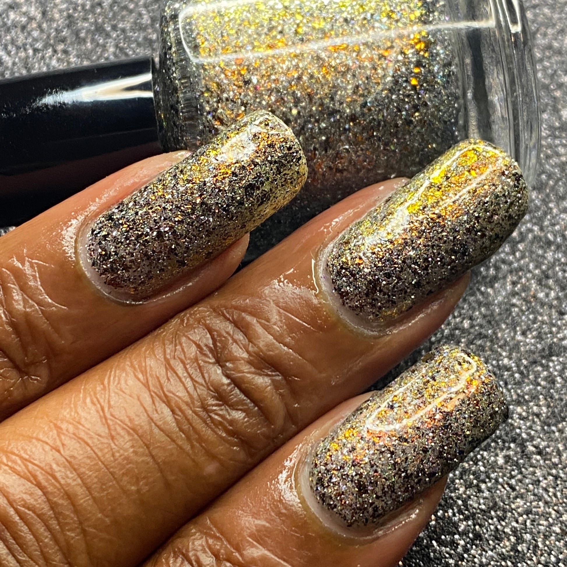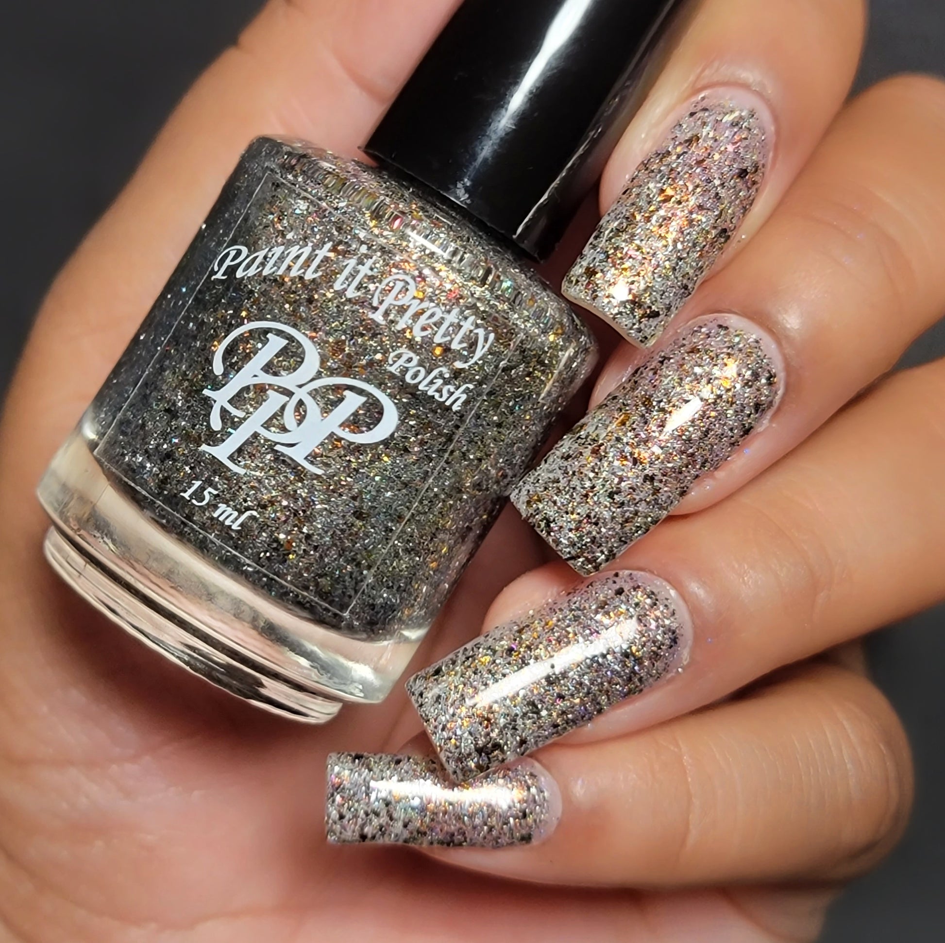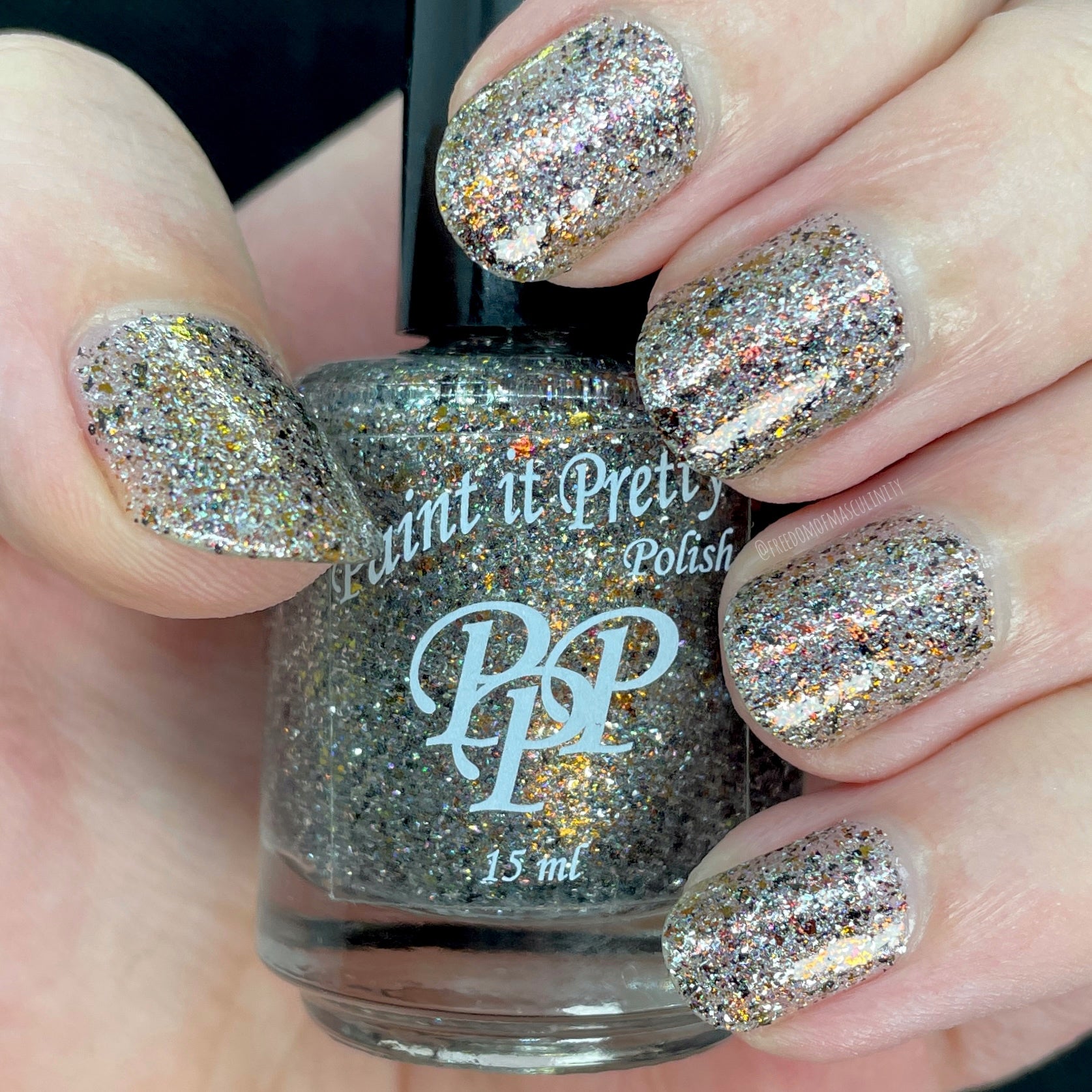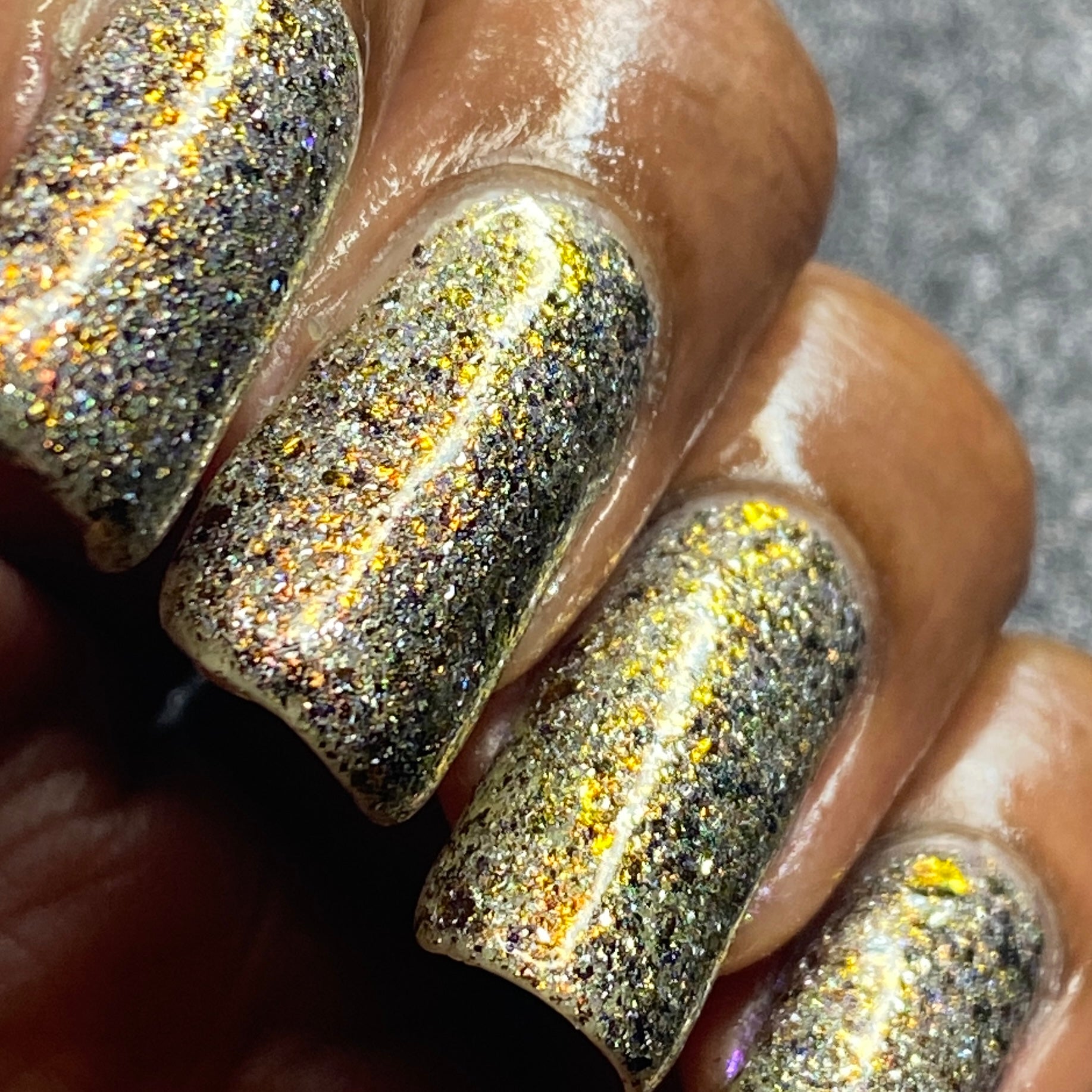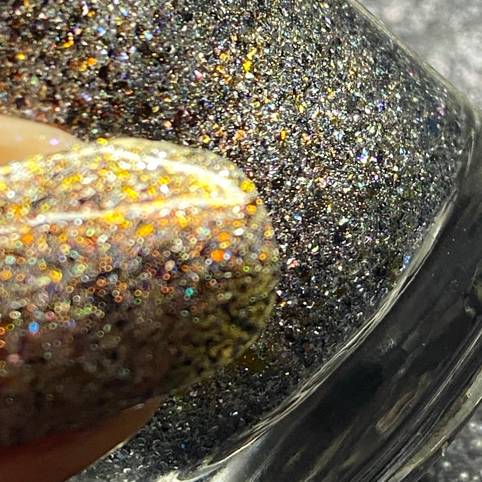 Trade Brother For Gifts is a silver flakie bomb packed with red, bronze, gold chameleon flakies, black microflakes, and holographic microflakes
