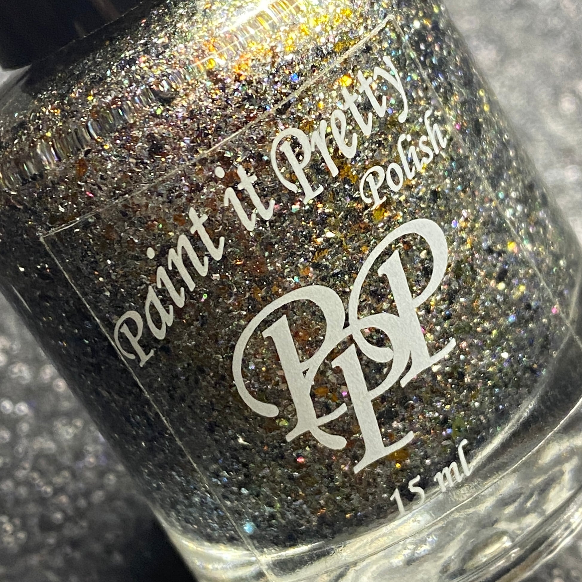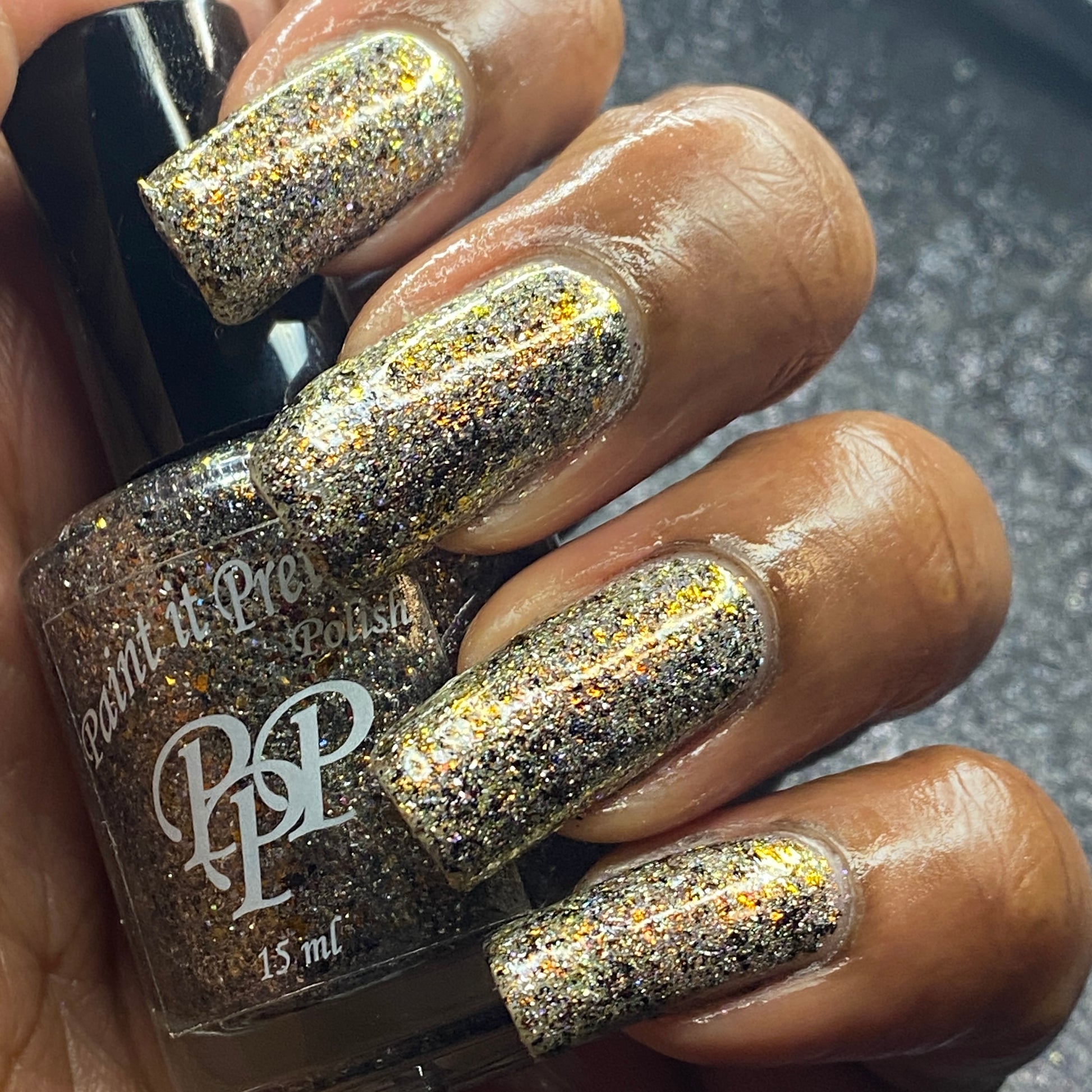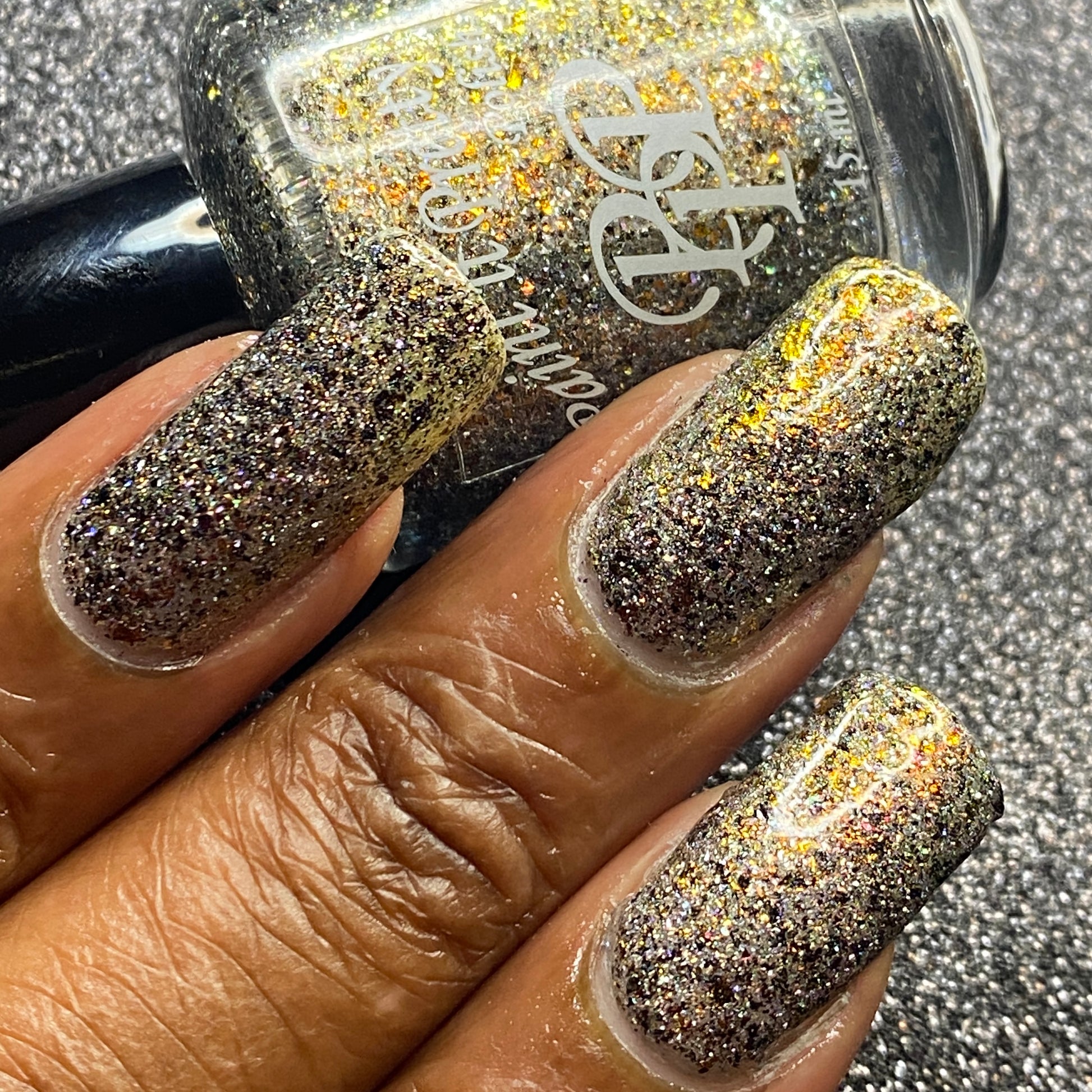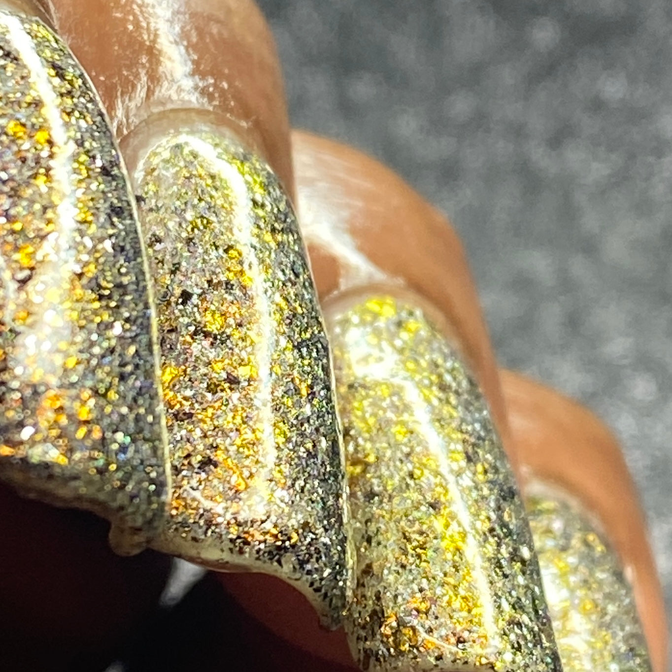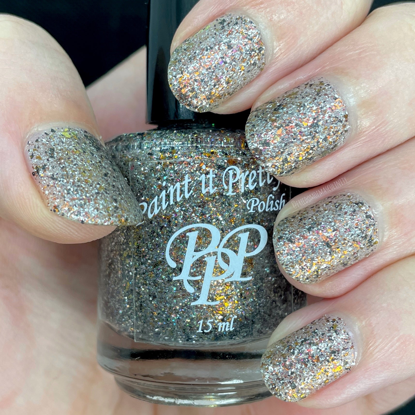 Trade Brother For Gifts is a silver flakie bomb packed with red, bronze, gold chameleon flakies, black microflakes, and holographic microflakes
