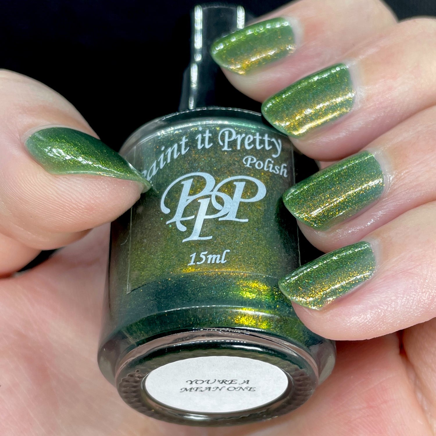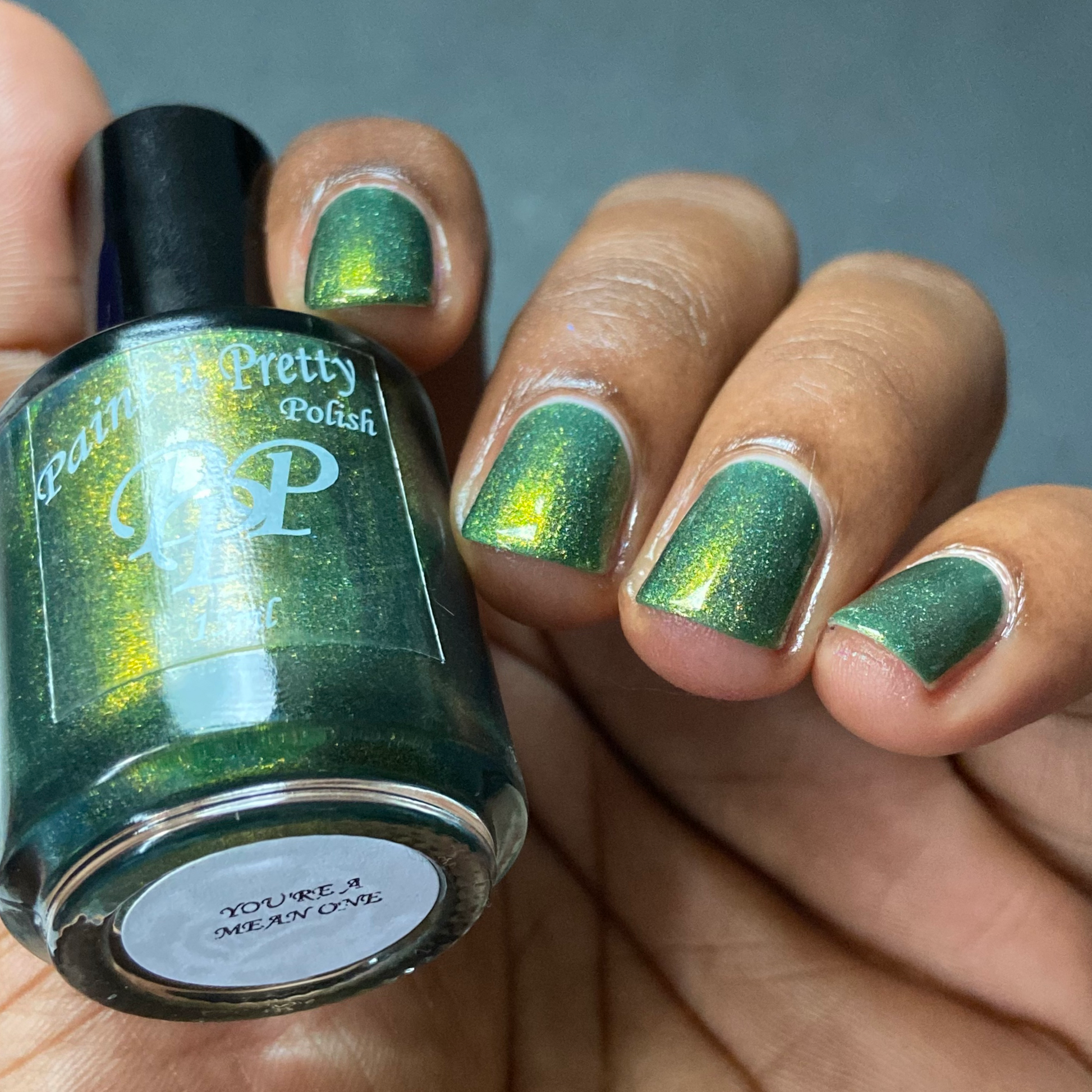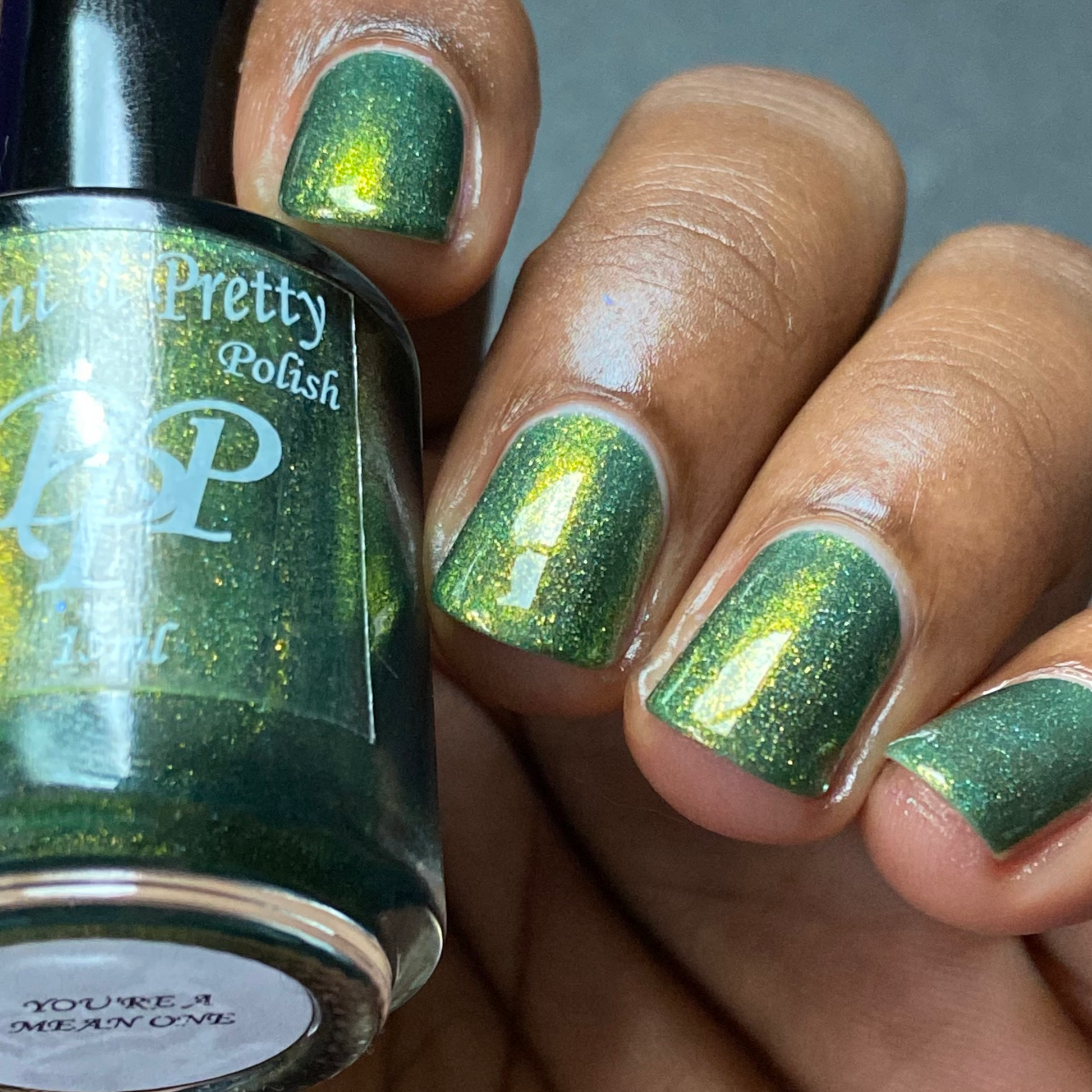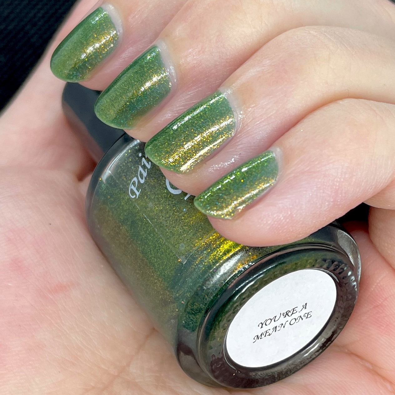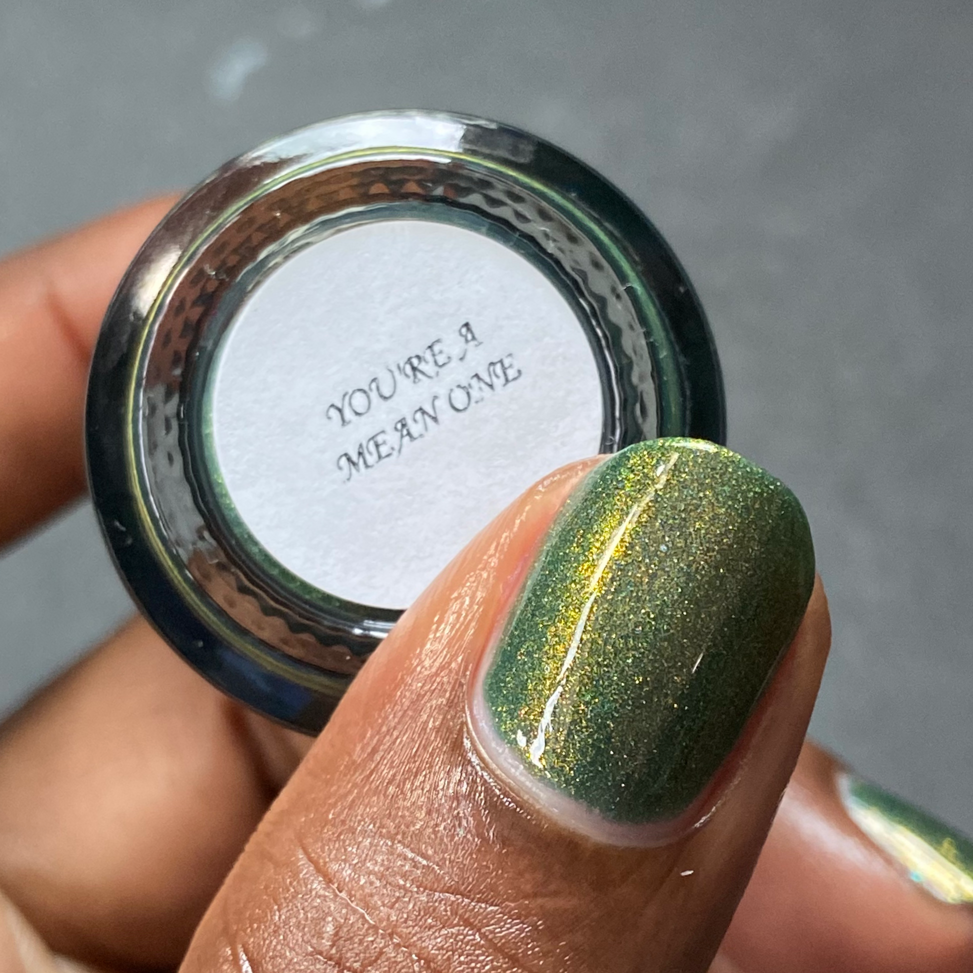 Your a Mean One is a green holographic polish with a gold/green shimmer.