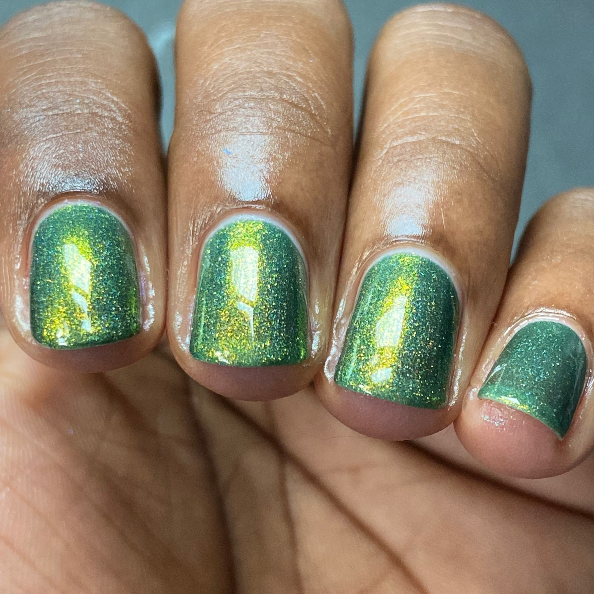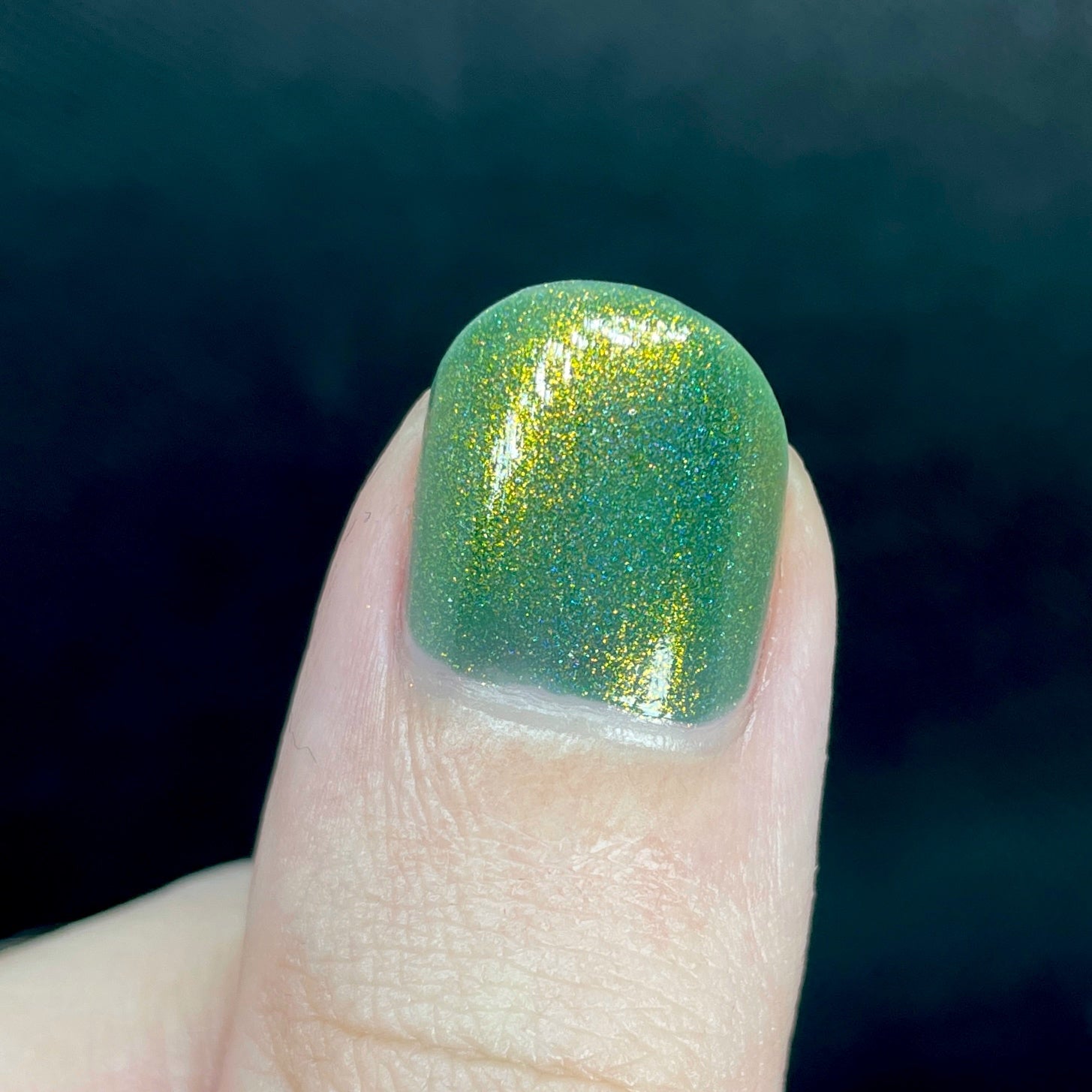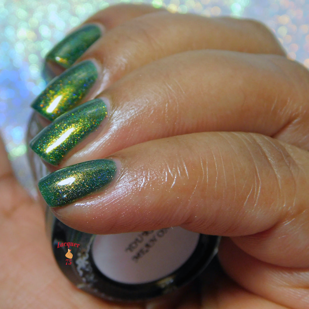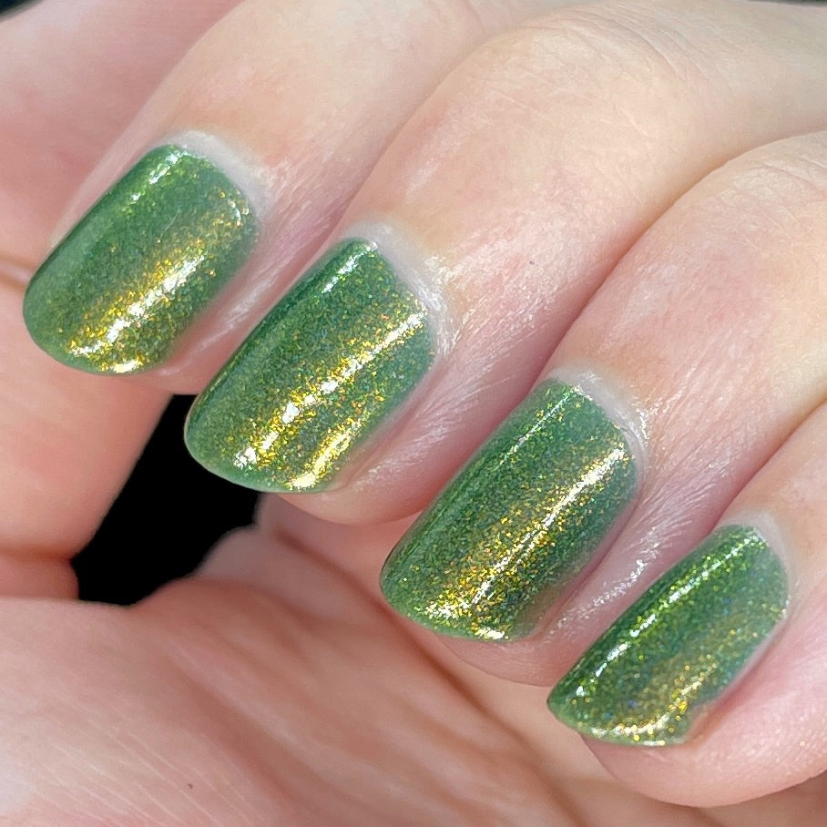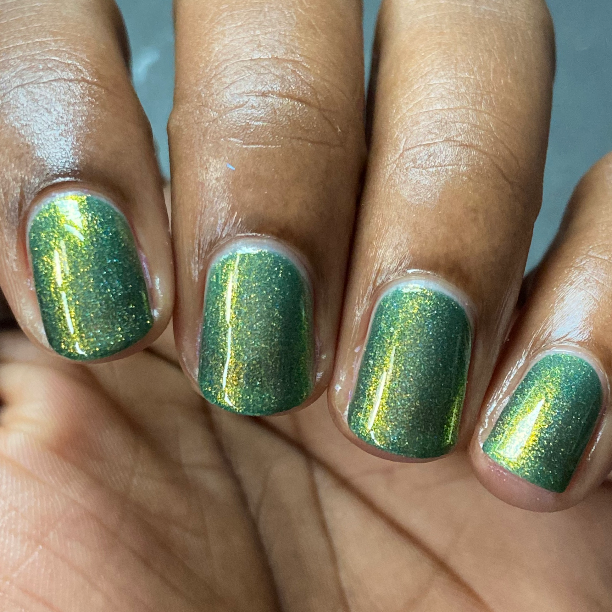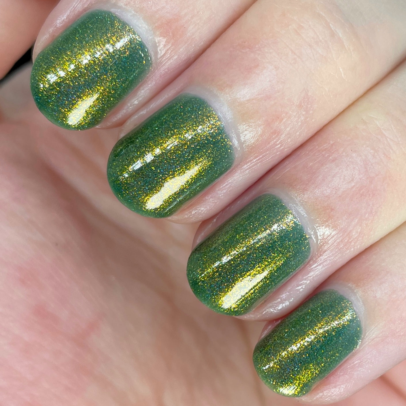 Your a Mean One is a green holographic polish with a gold/green shimmer.