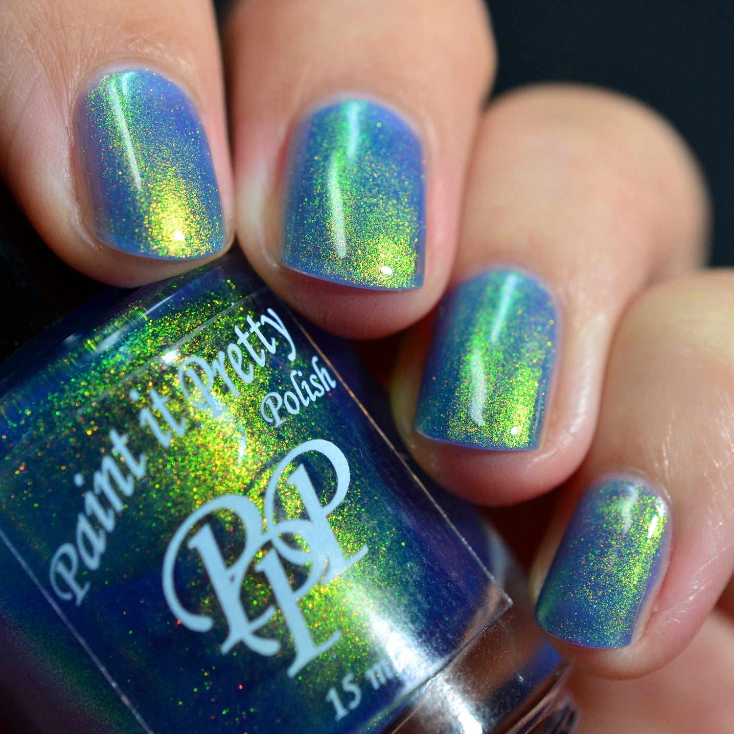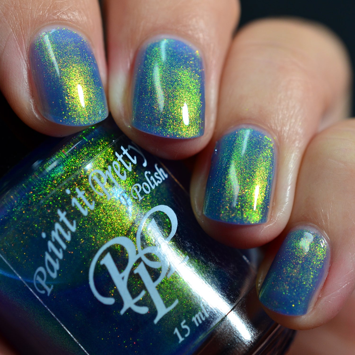 Dive into "Dreamy Sea". Multichrome shimmer swims in a sheer sapphire blue base. Flashes of greens, copper and gold can be seen flowing throughout. Wear alone for one look or wear over black or white base for a different effect.