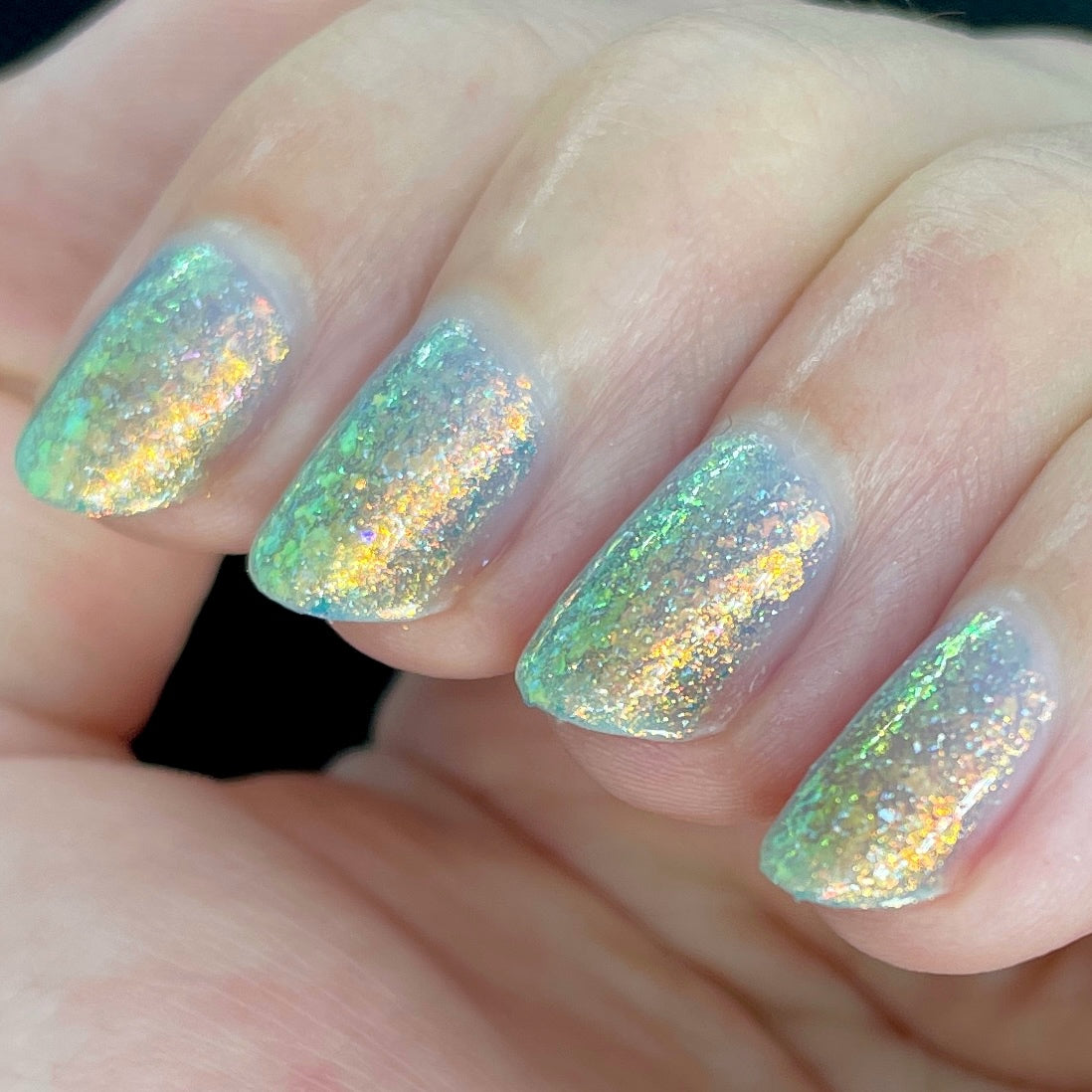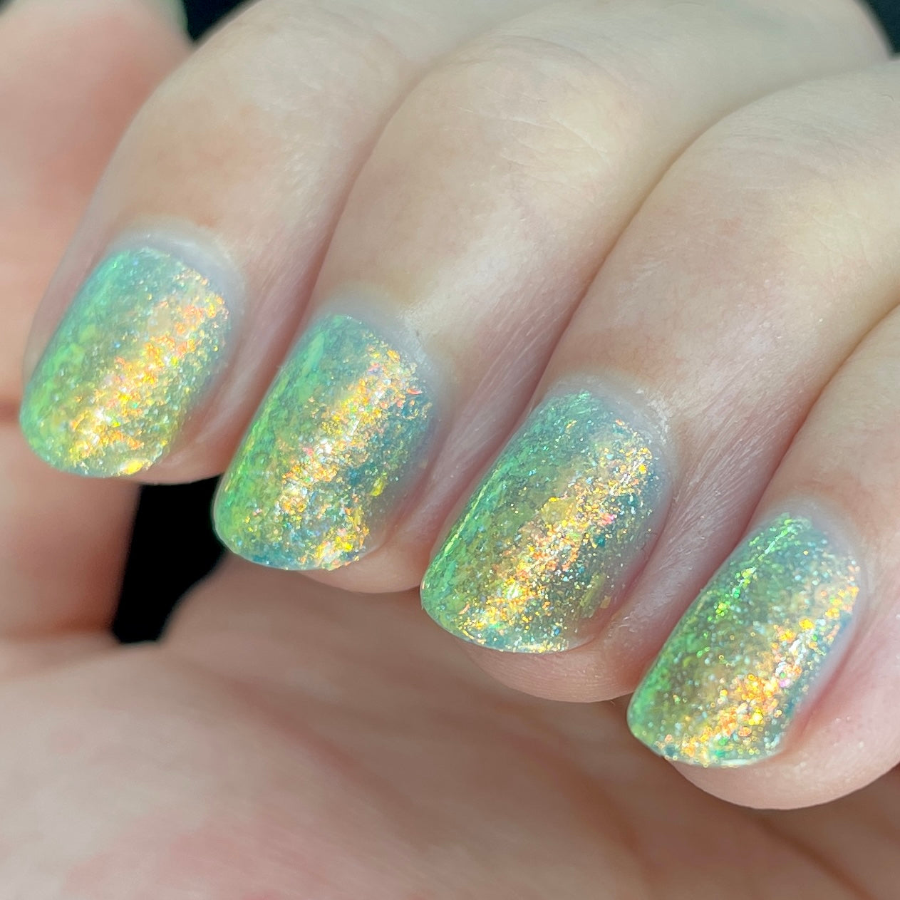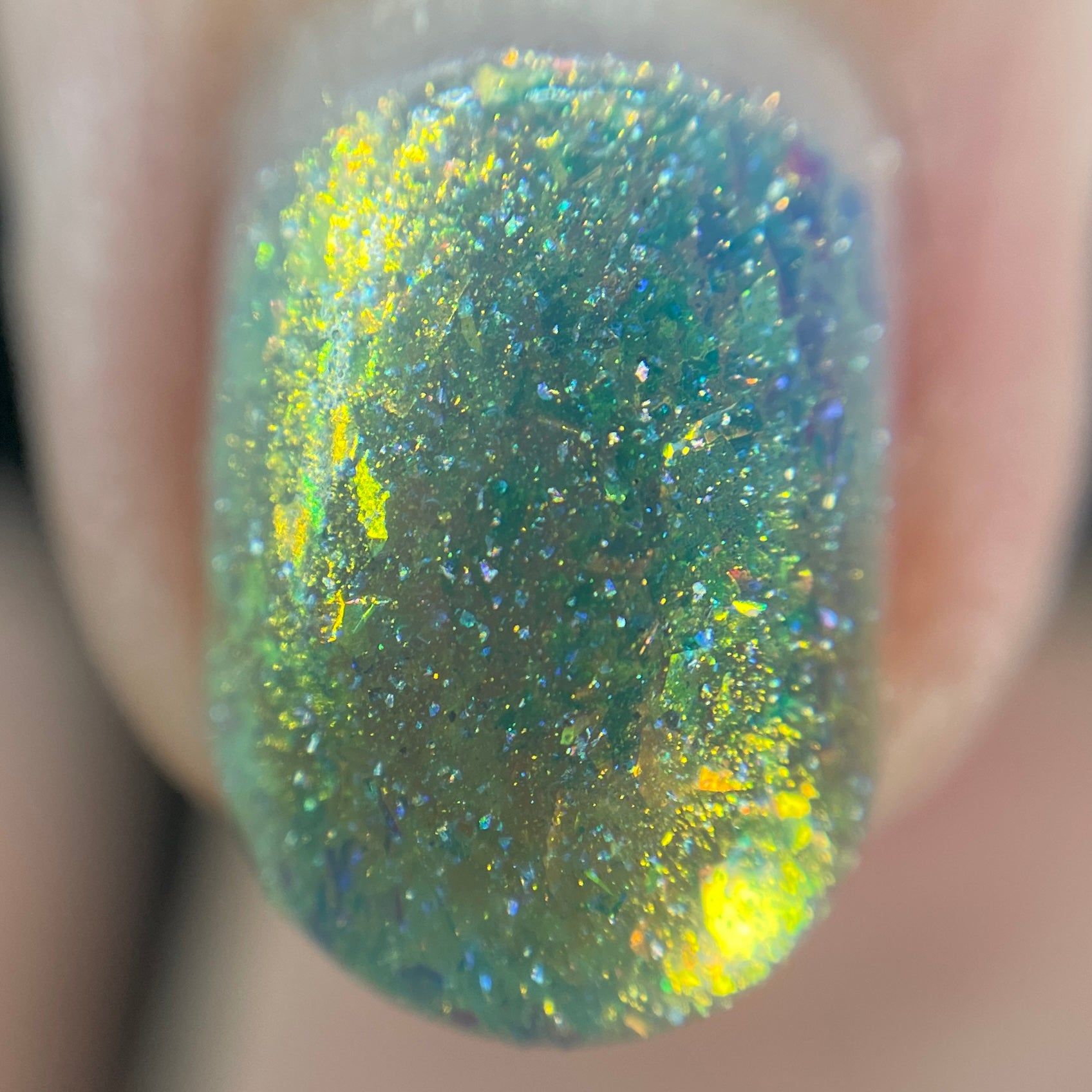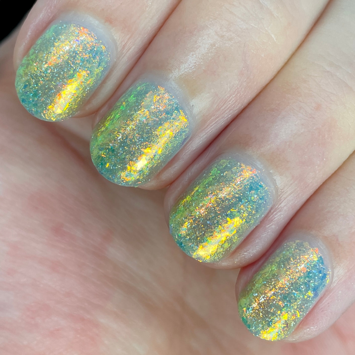 A pastel green polish filled with shifting irridescent flakes and some small holographic flakes