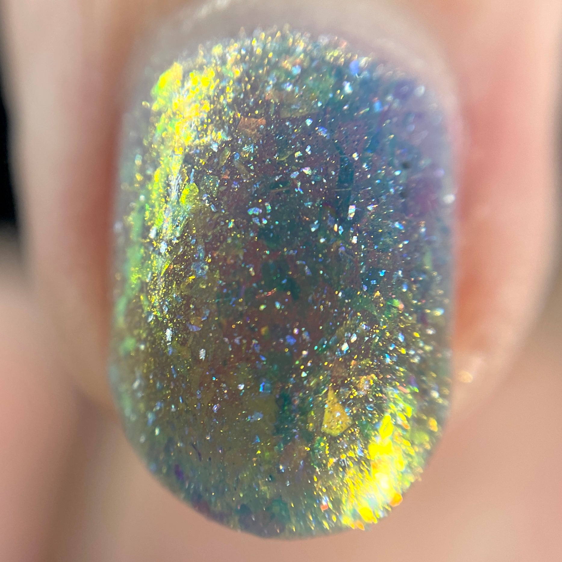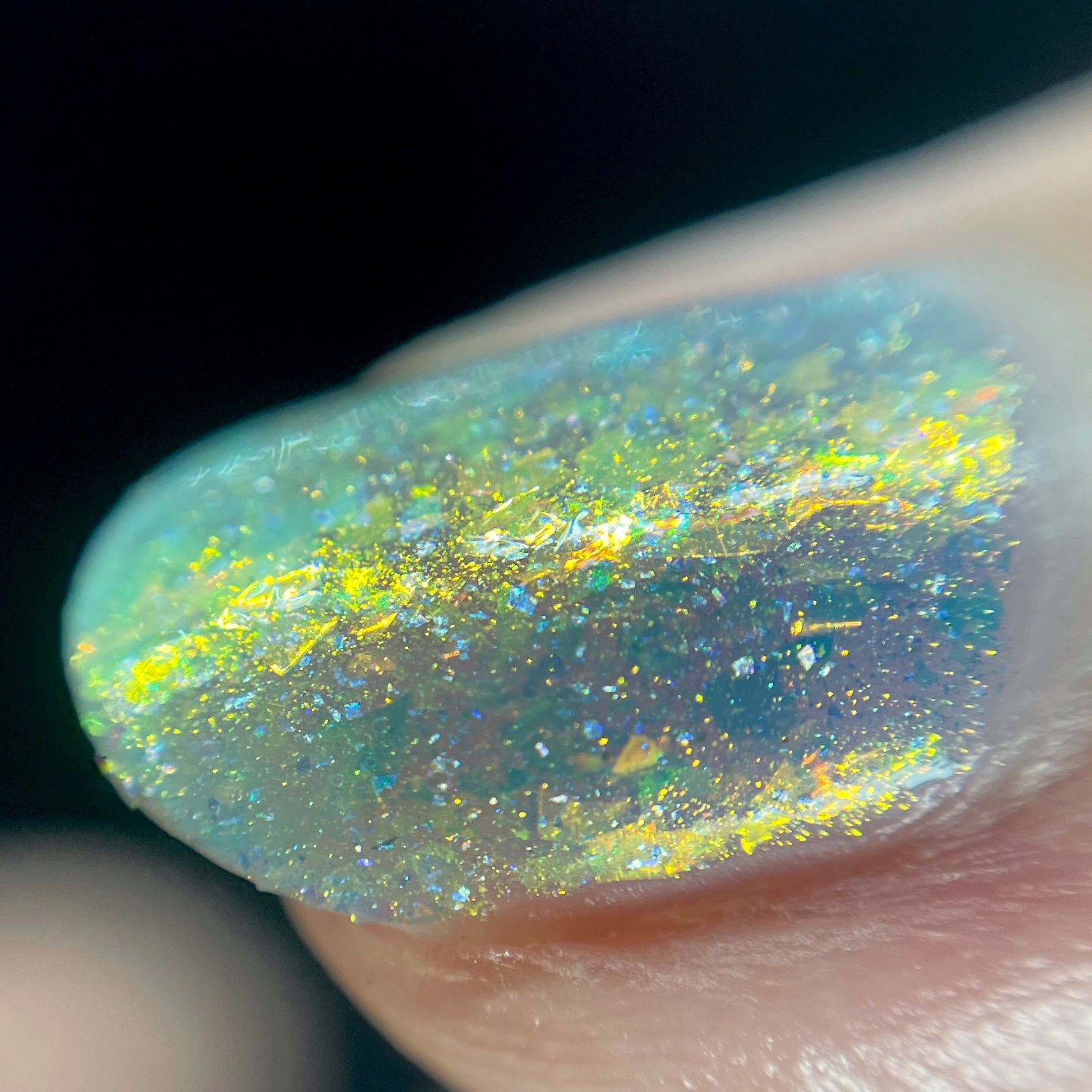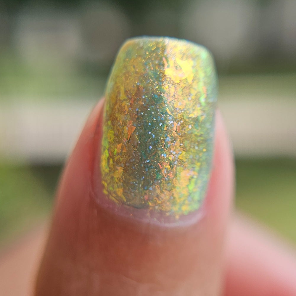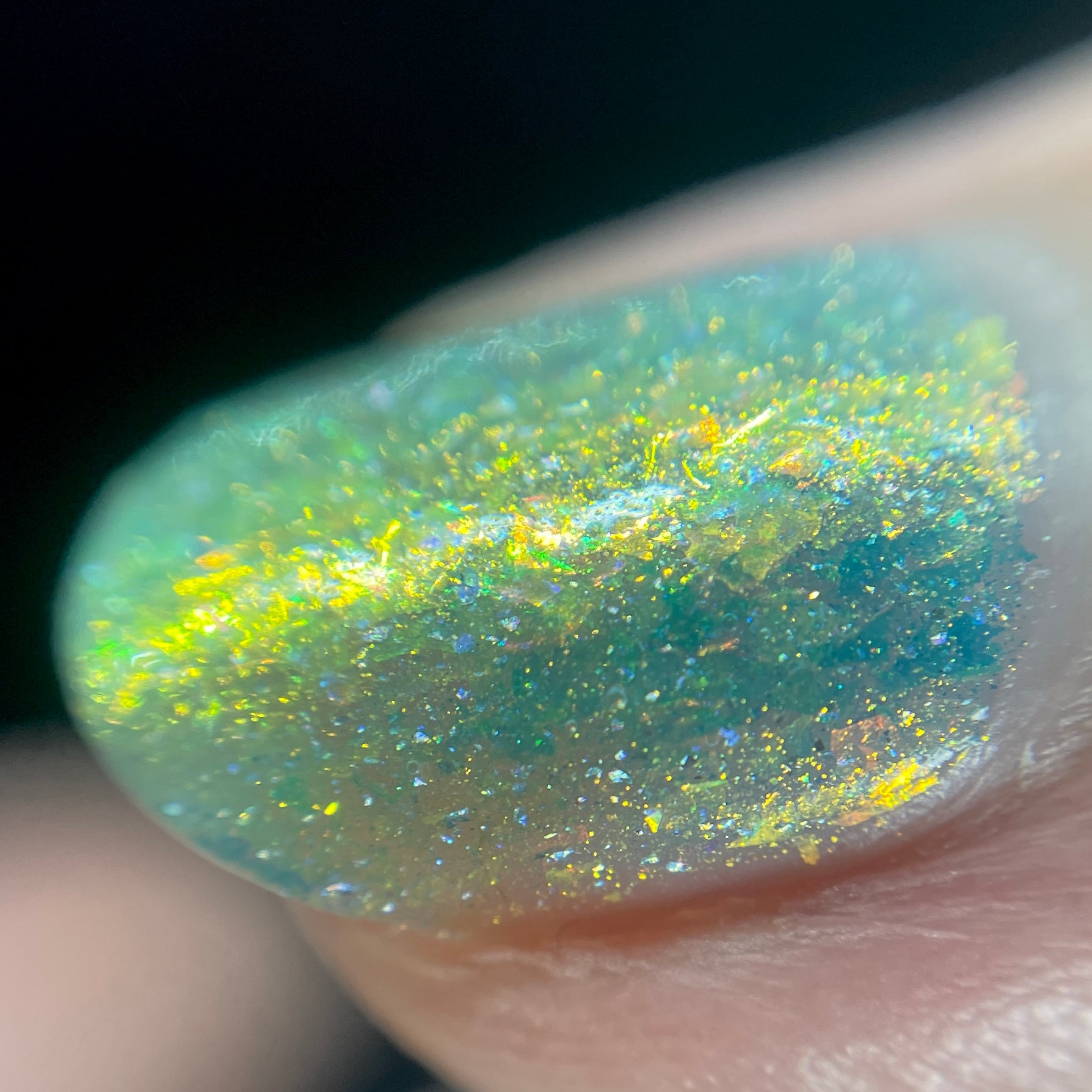 A pastel green polish filled with shifting irridescent flakes and some small holographic flakes
