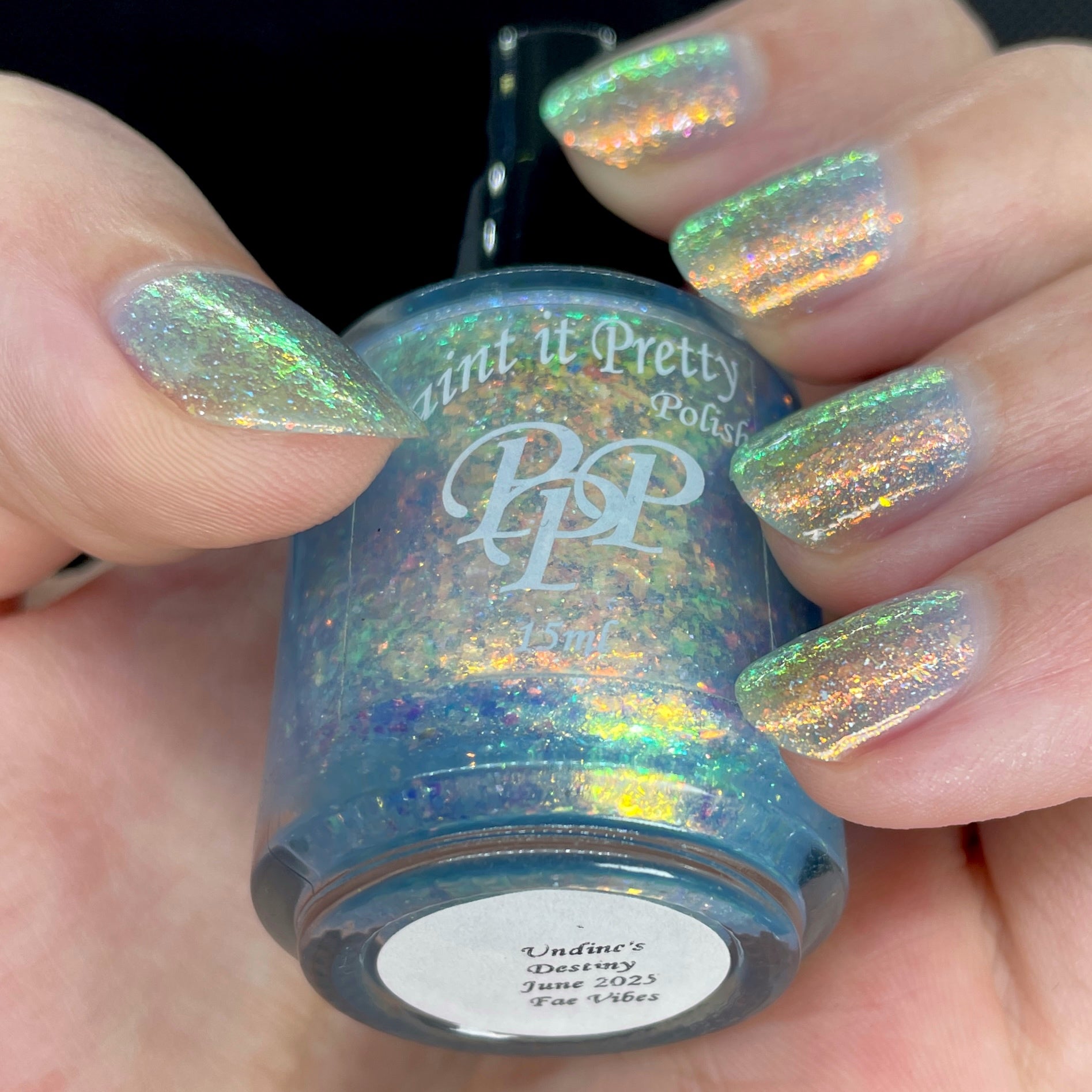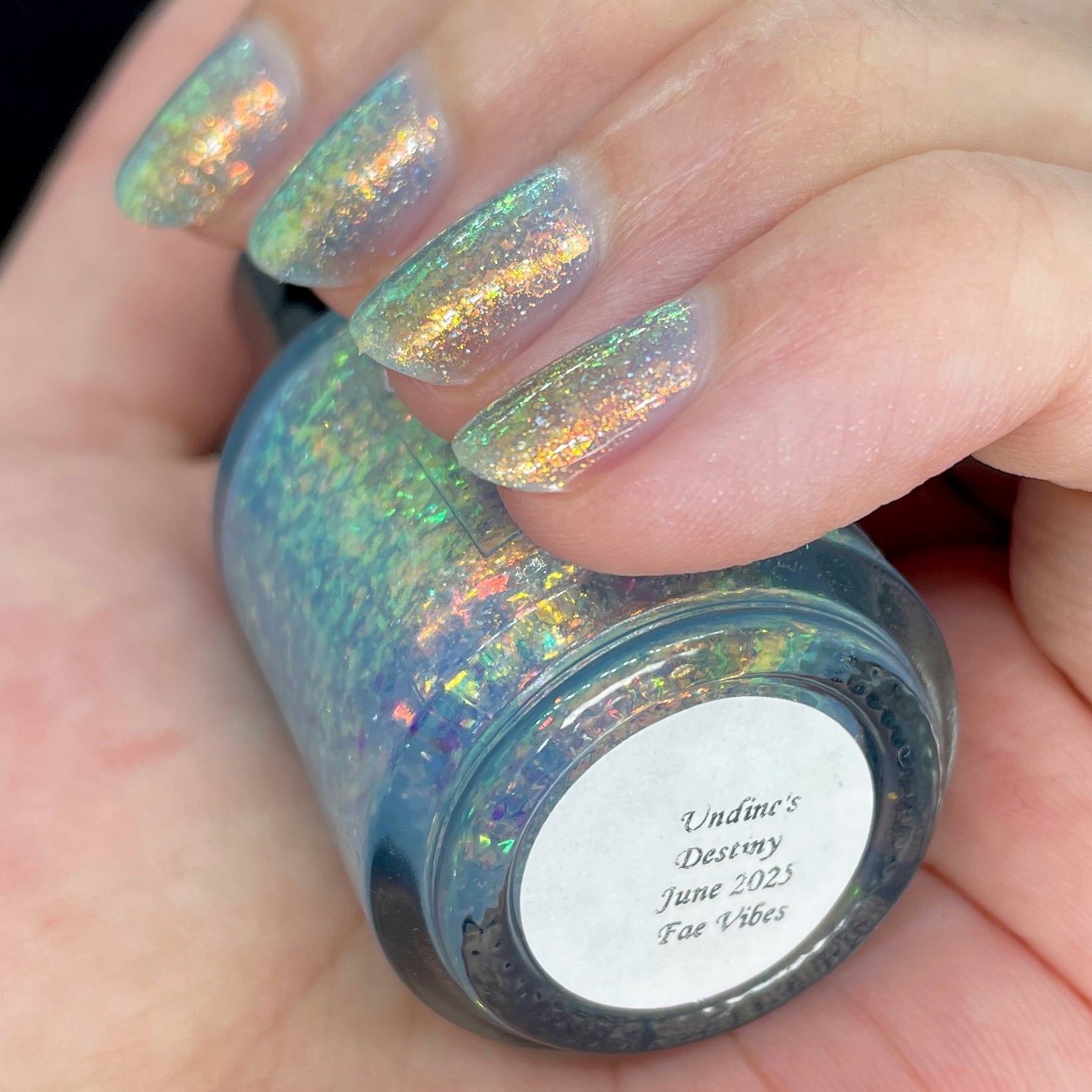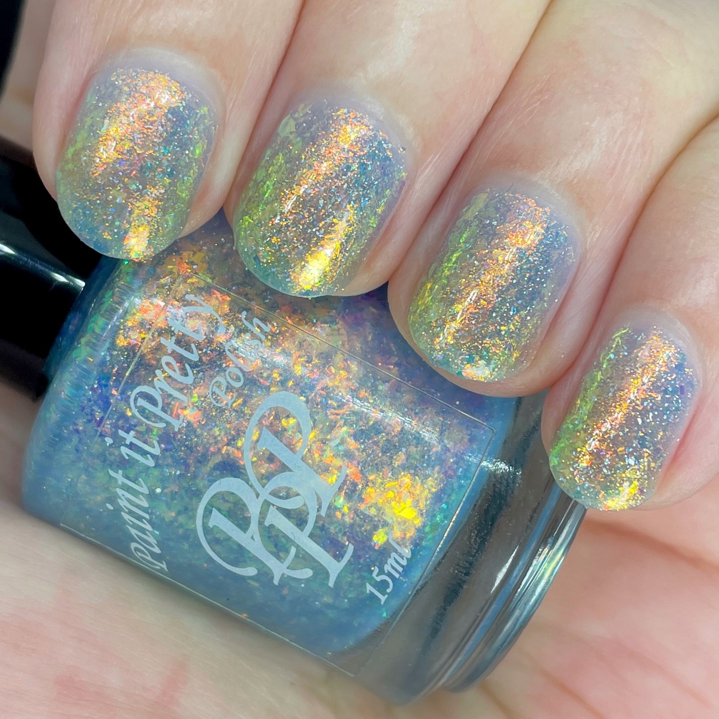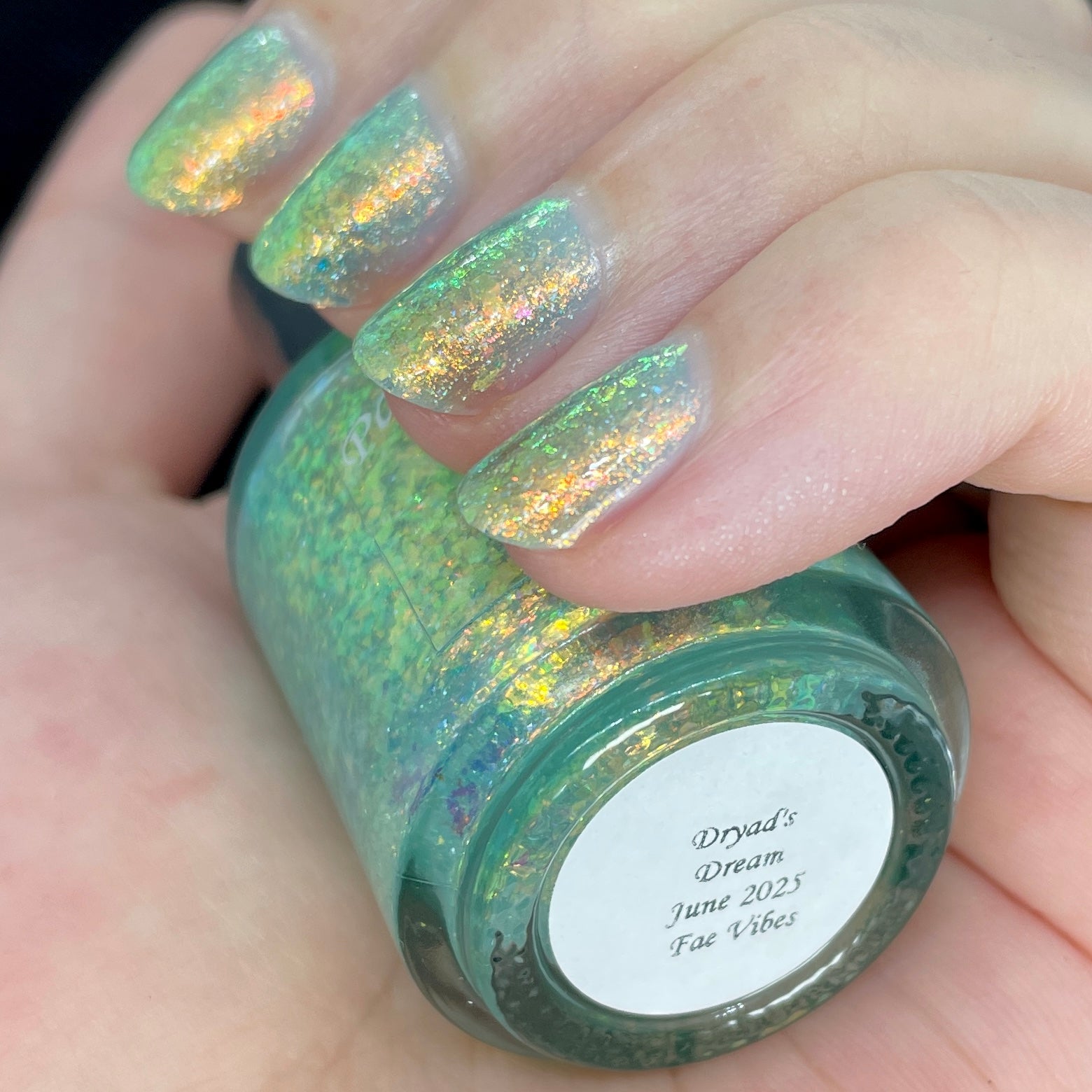 A pastel green polish filled with shifting irridescent flakes and some small holographic flakes