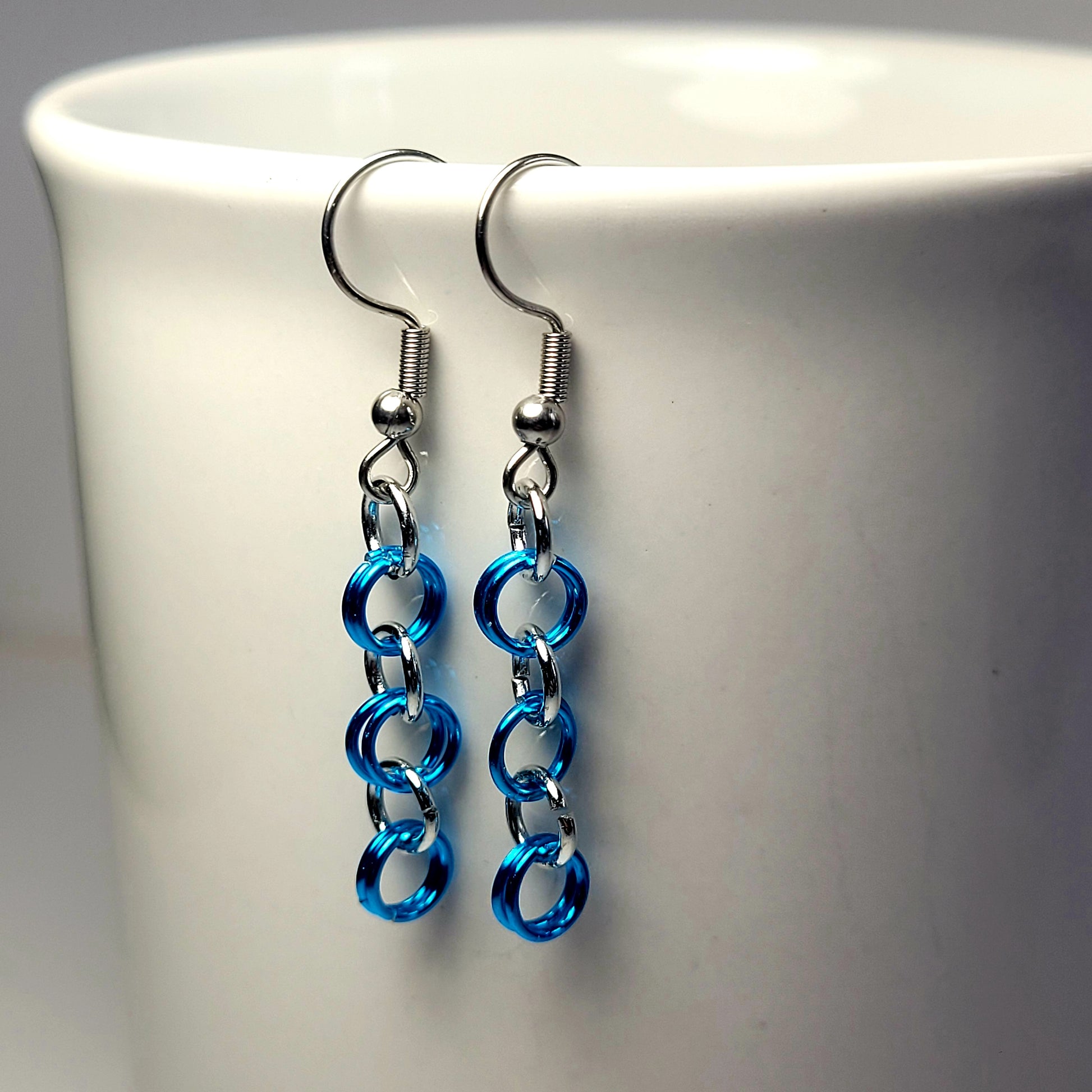 Handmade chainmail blue and silver earrings. Hand woven one ring at a time, this jewelry is sure to turn heads!
