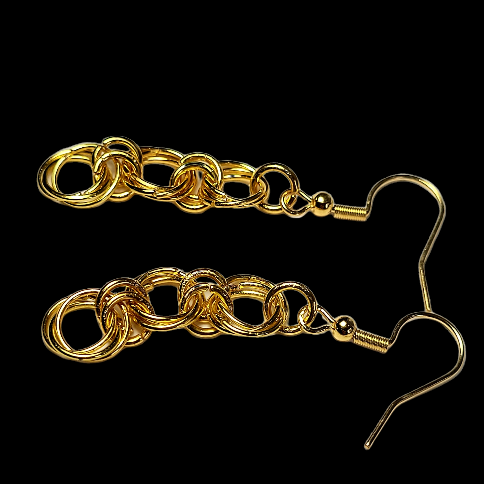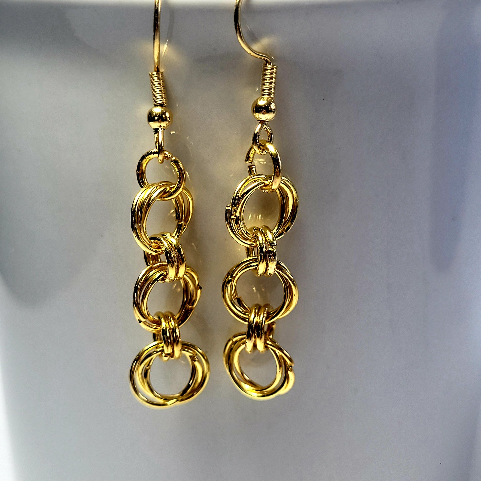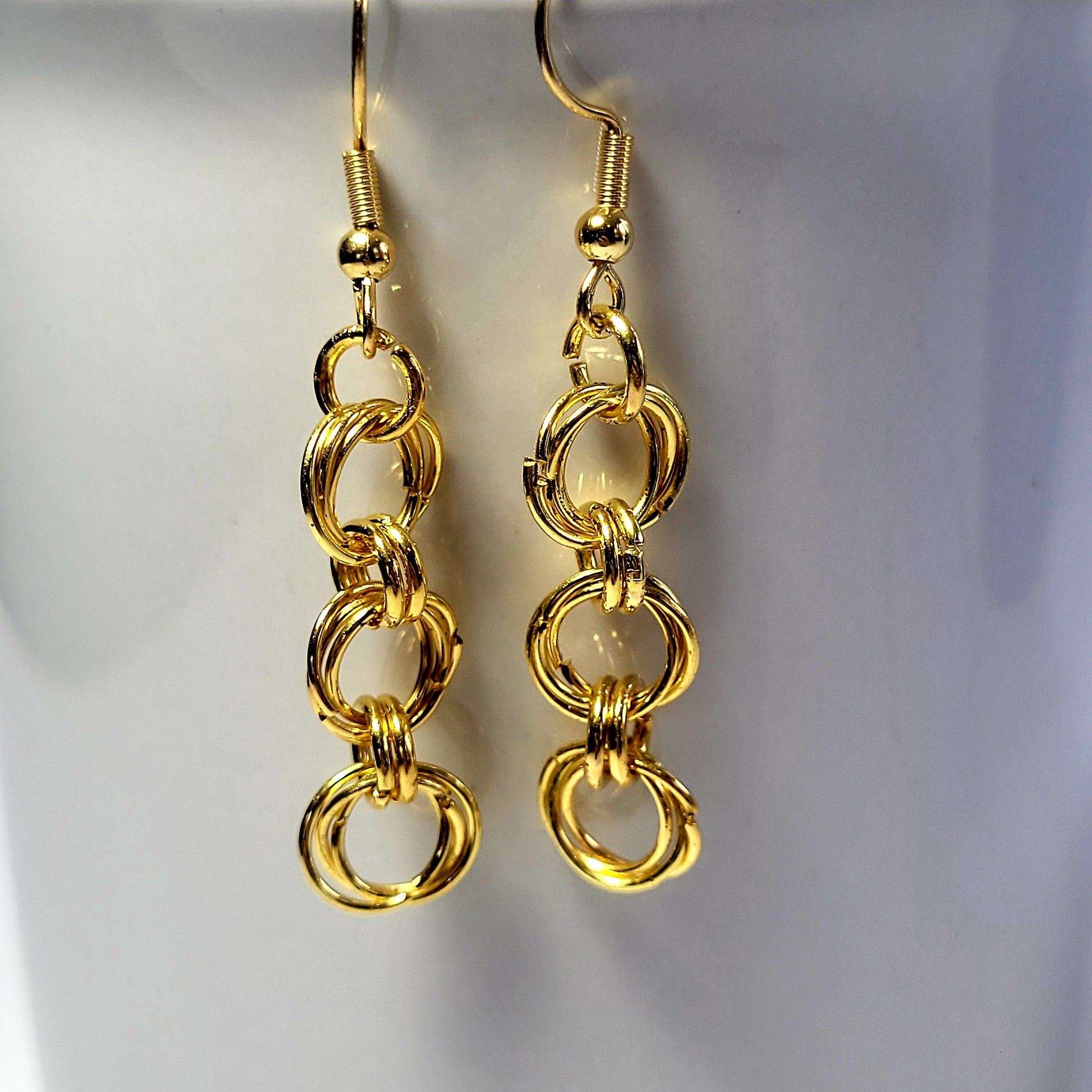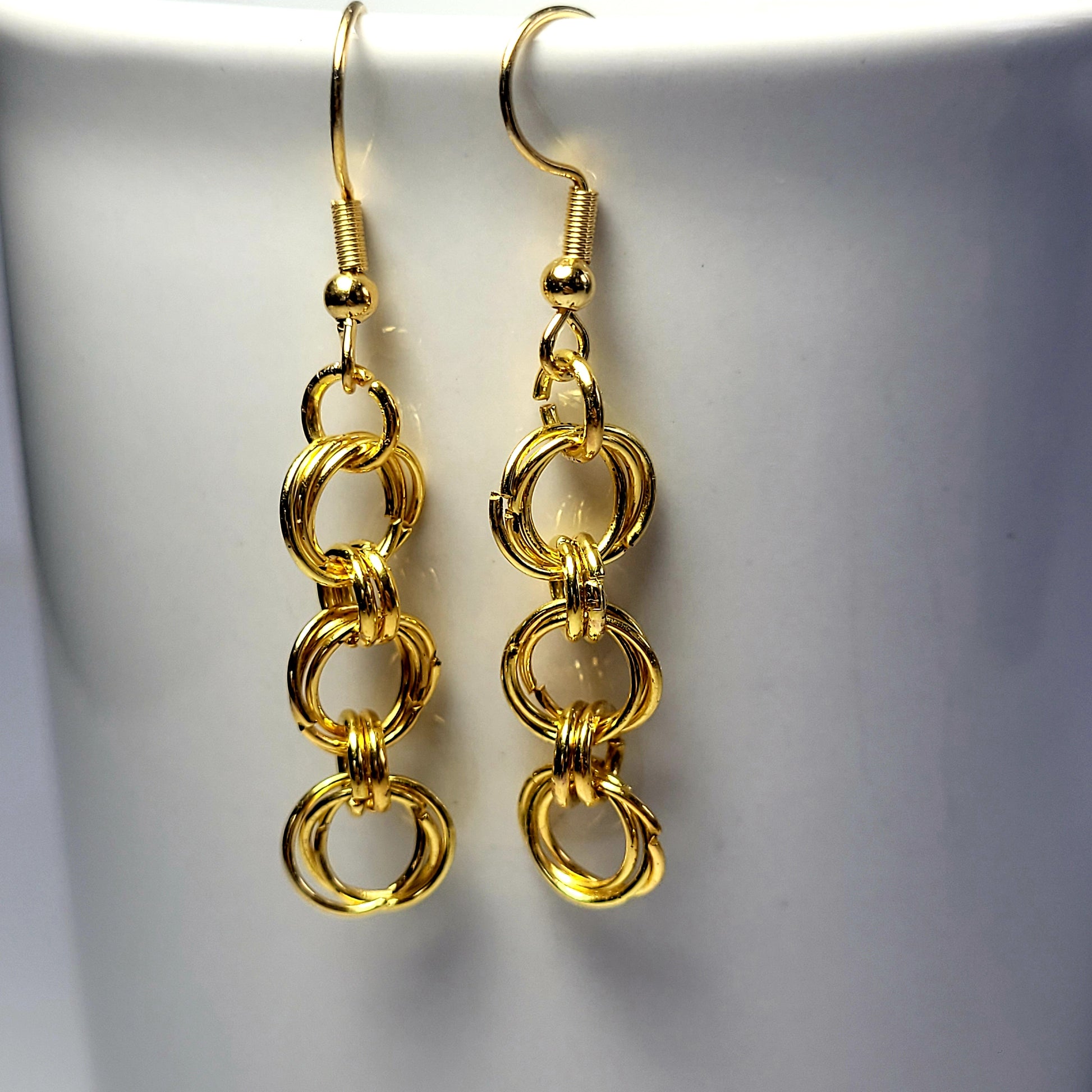 Handmade chainmail gold coloured earrings. Hand woven one ring at a time, this jewelry is sure to turn heads!
