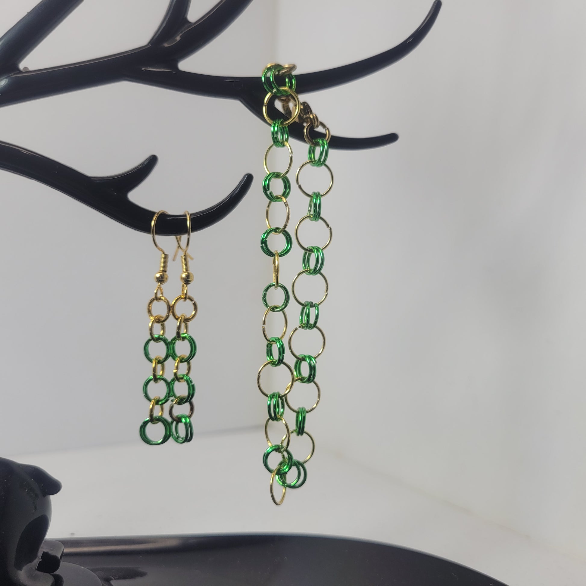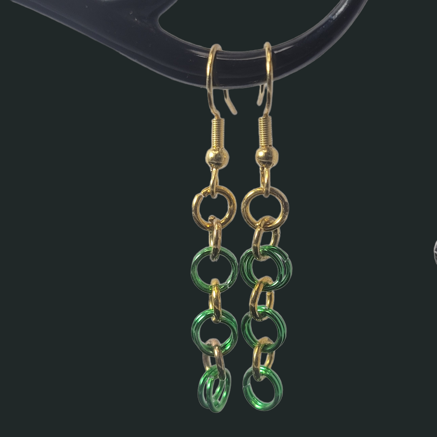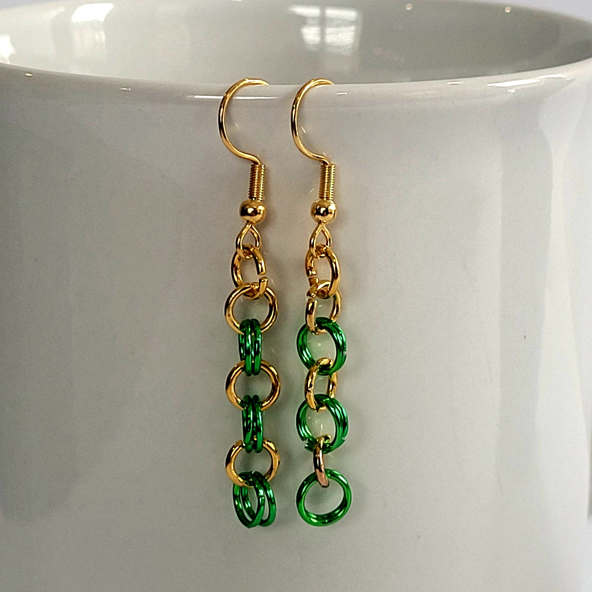 Earrings, green and gold chainmail