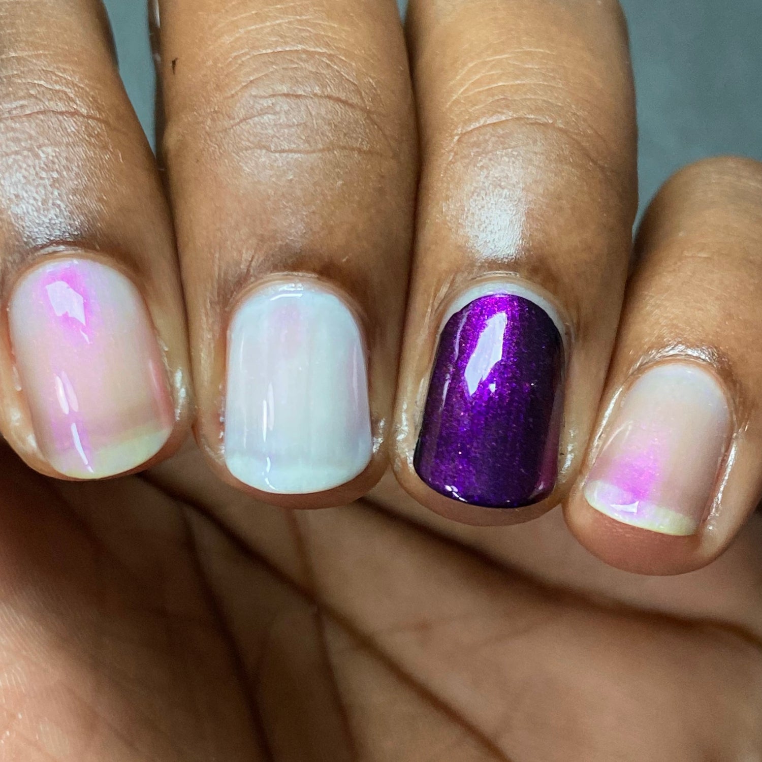 Elegance is beautiful voilet/pink shifting topper. Wear it on it's own for a soft milky shimmer effect or over darker shades to make the shifts pop.