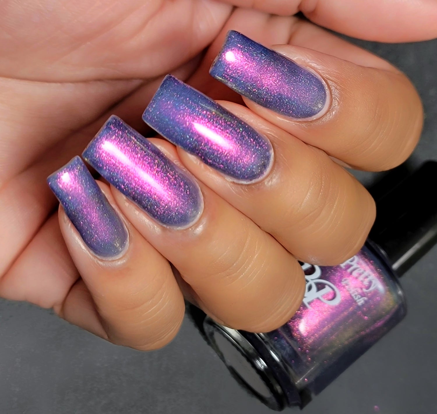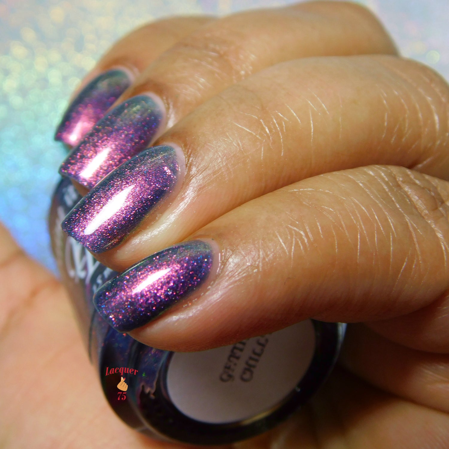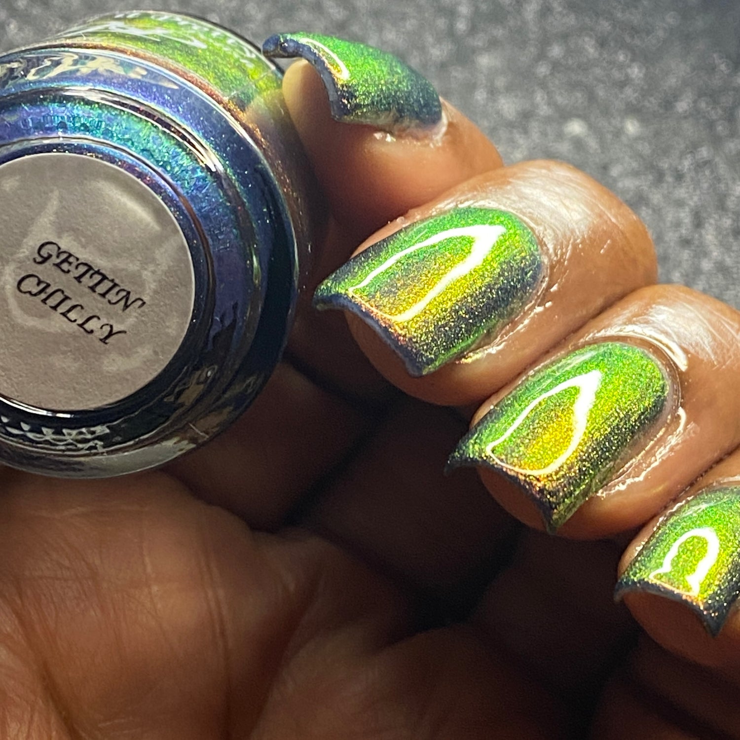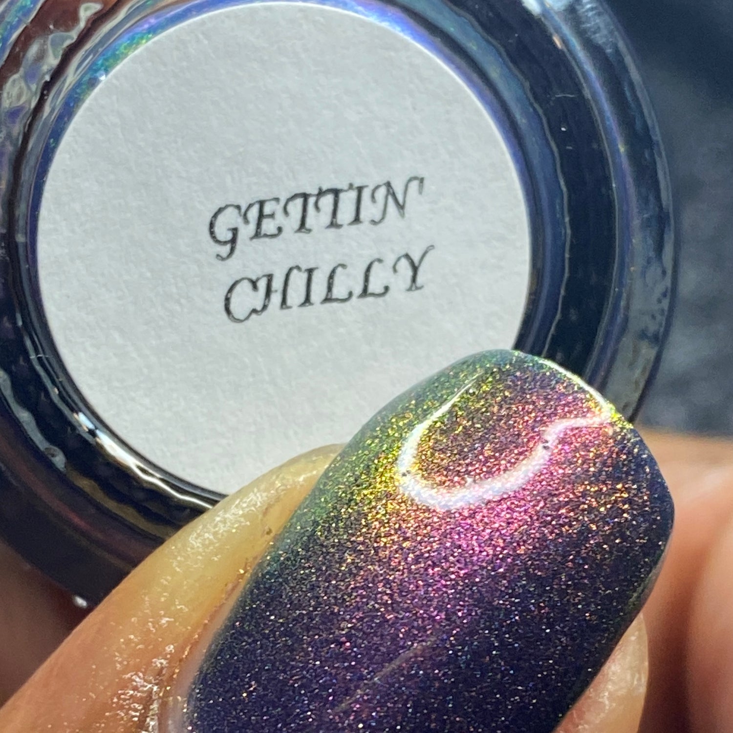 Gettin Chilly is a dark blue tinted base with shimmers that shift thru purple, gold, and green