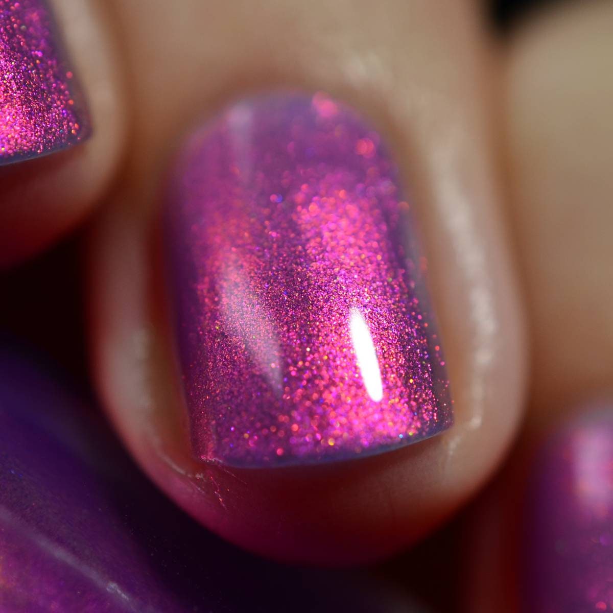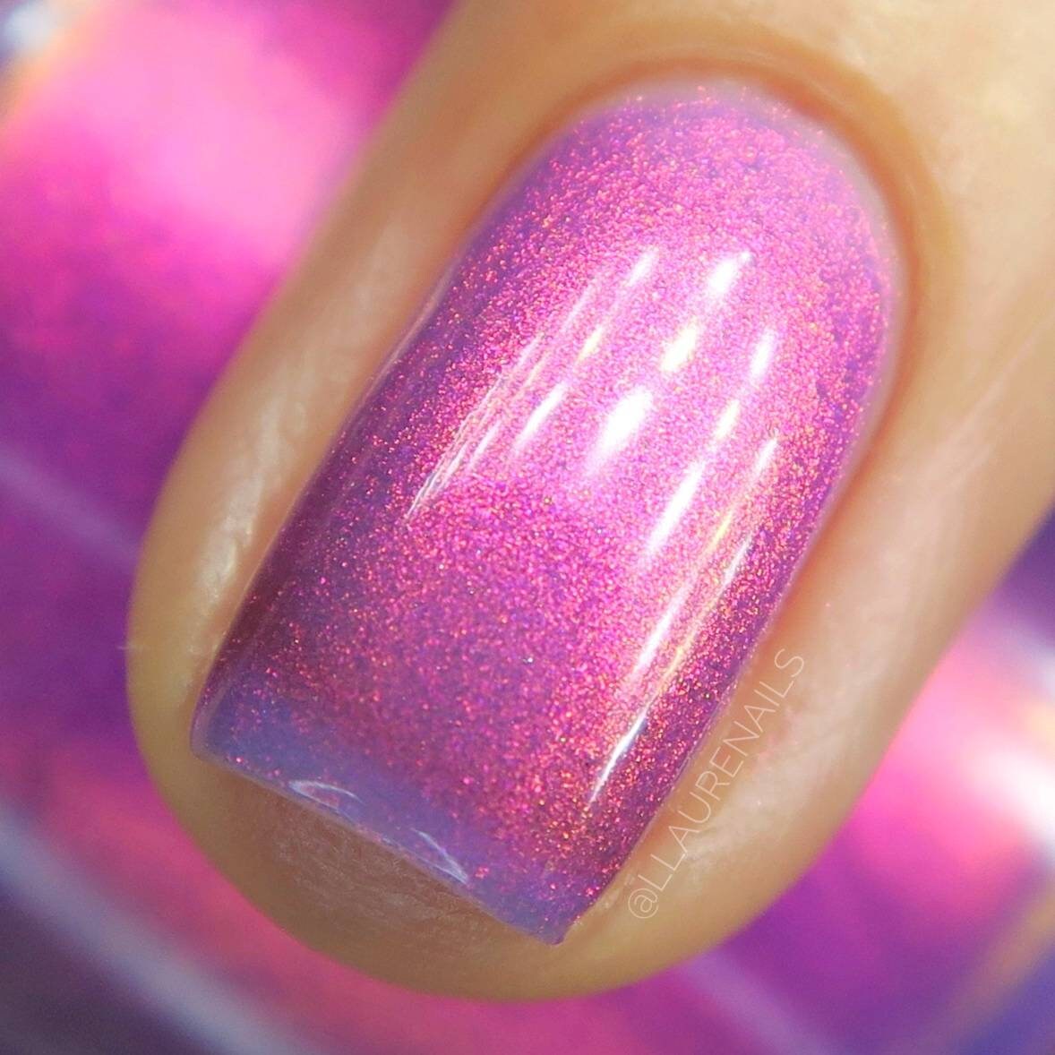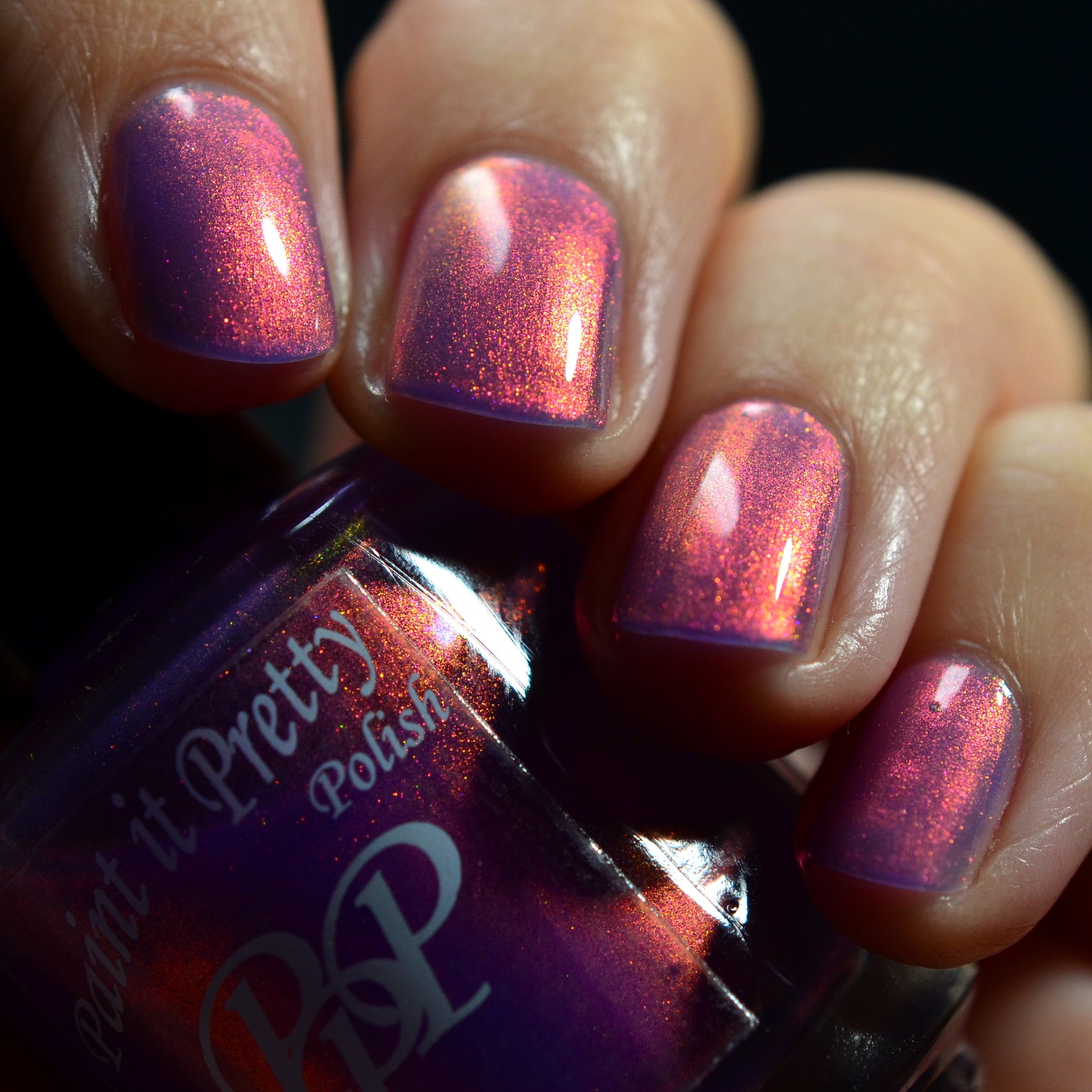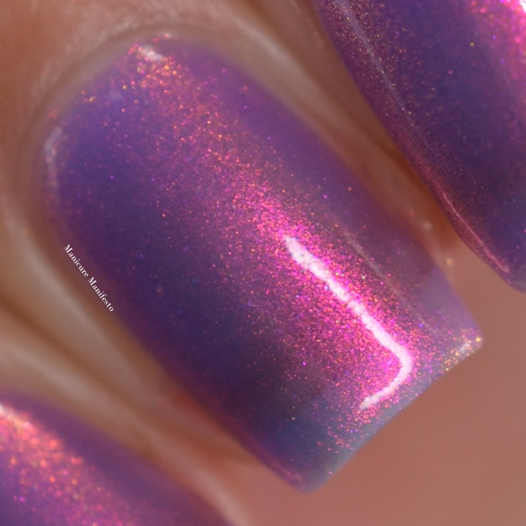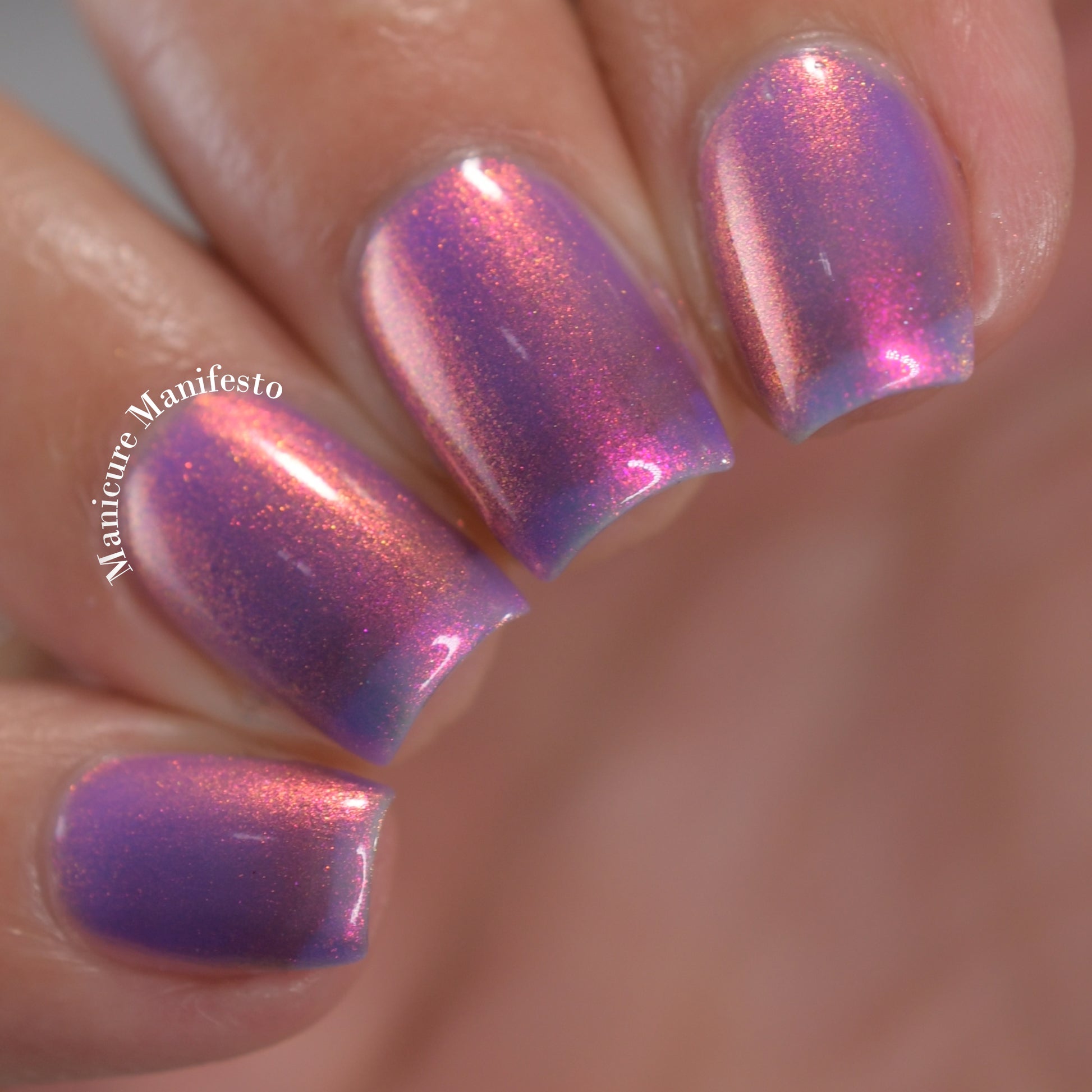 Golden Days Ethereal pink aurora shimmer floats in a sheer lilac base that is buildable. Shifts of magenta, peach, coral, hot pink with flashes of copper, gold and the elusive green are seen when worn over black polish.