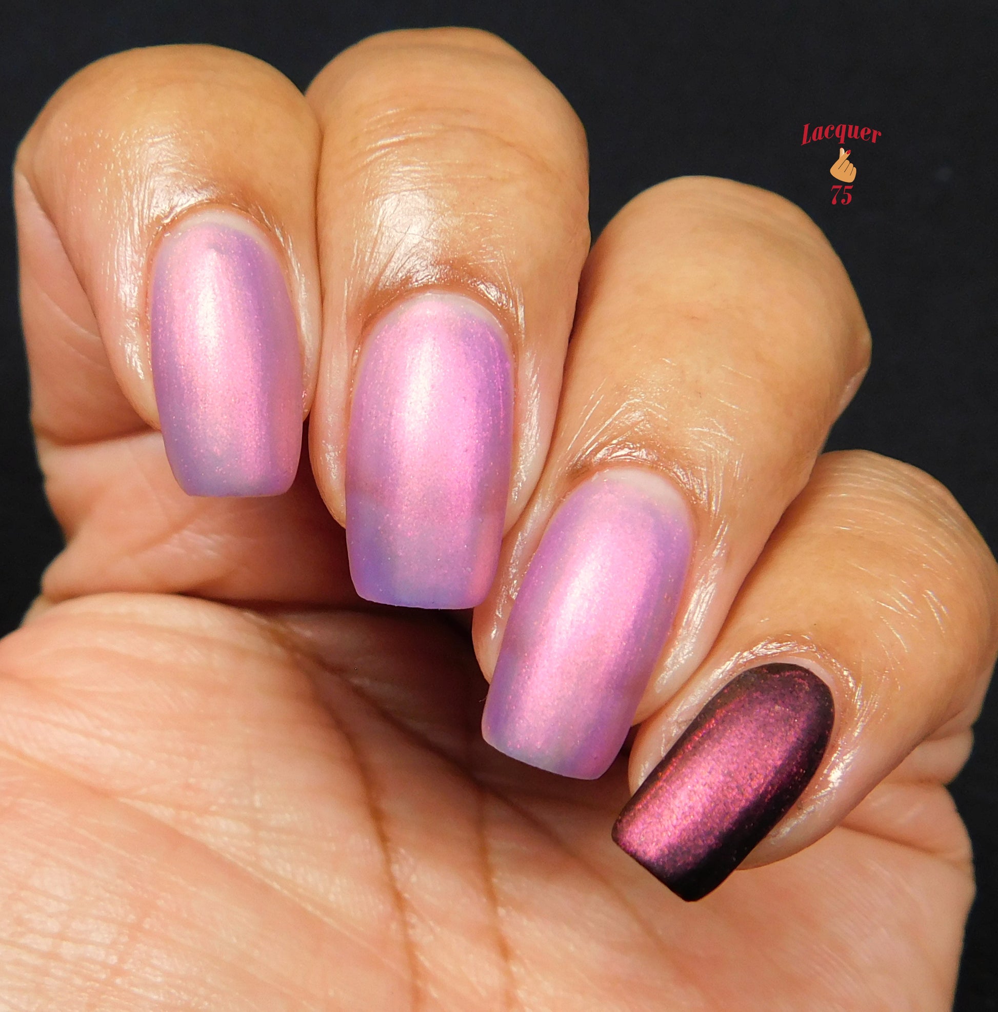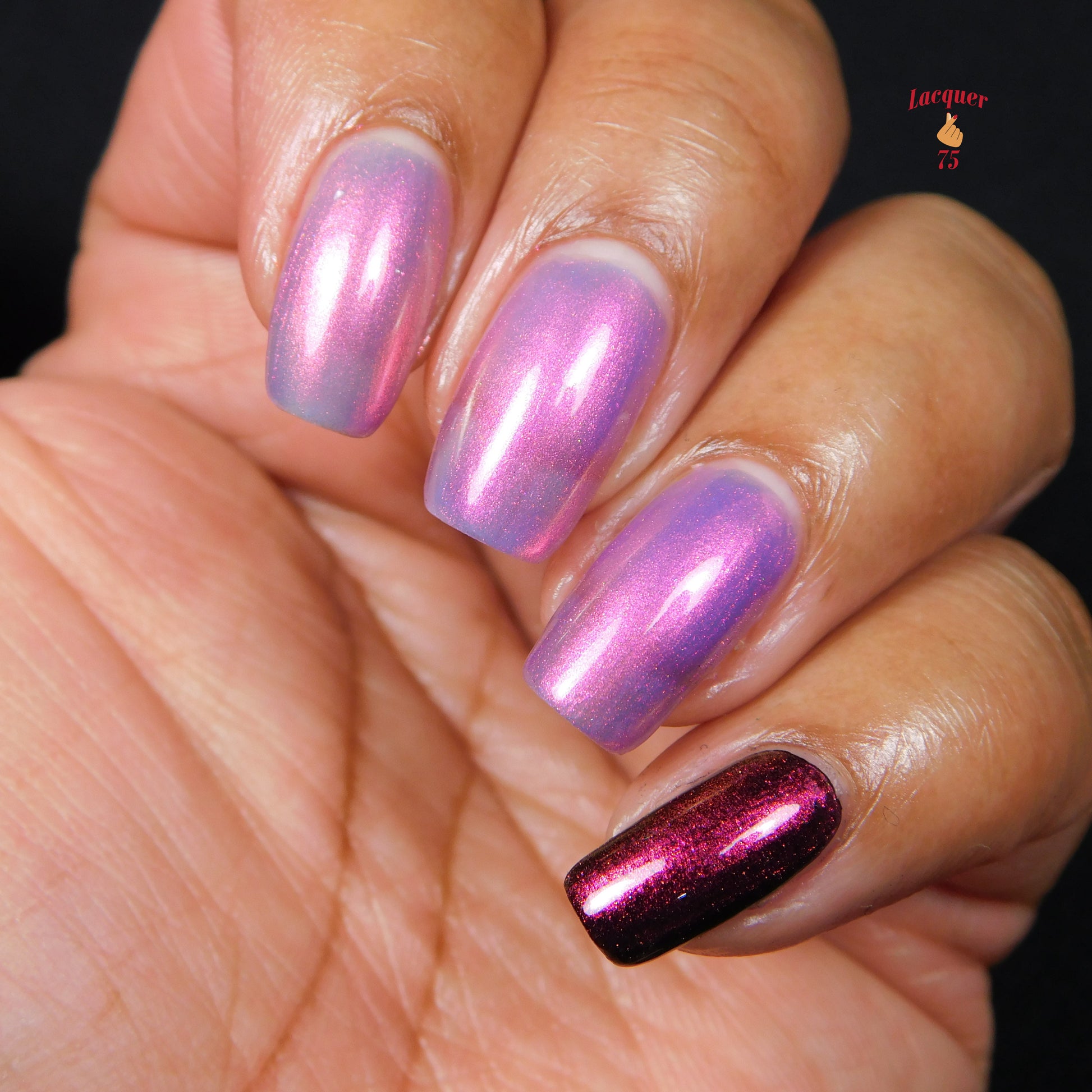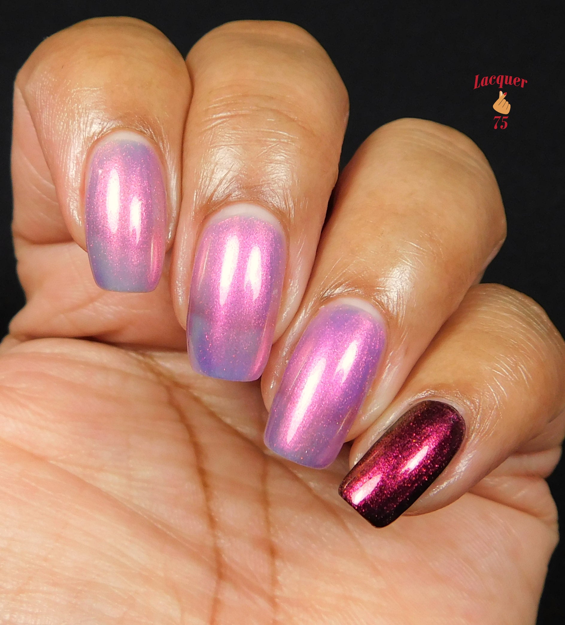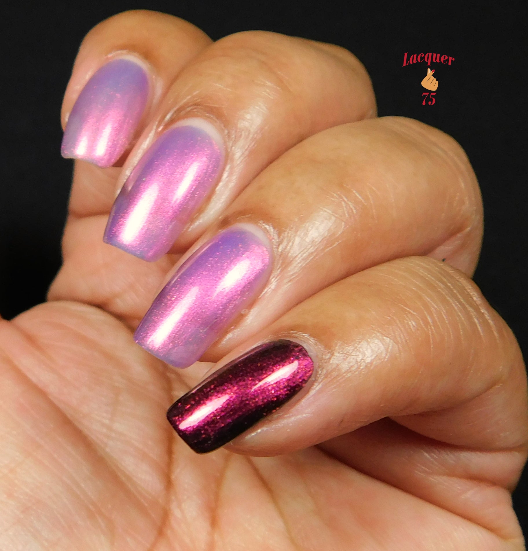 Golden Days Ethereal pink aurora shimmer floats in a sheer lilac base that is buildable. Shifts of magenta, peach, coral, hot pink with flashes of copper, gold and the elusive green are seen when worn over black polish.