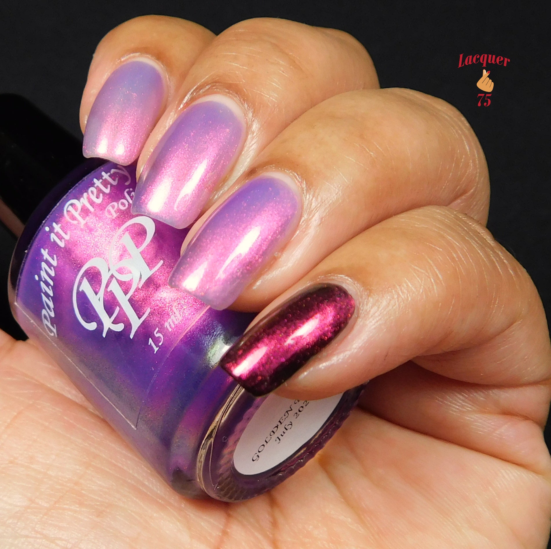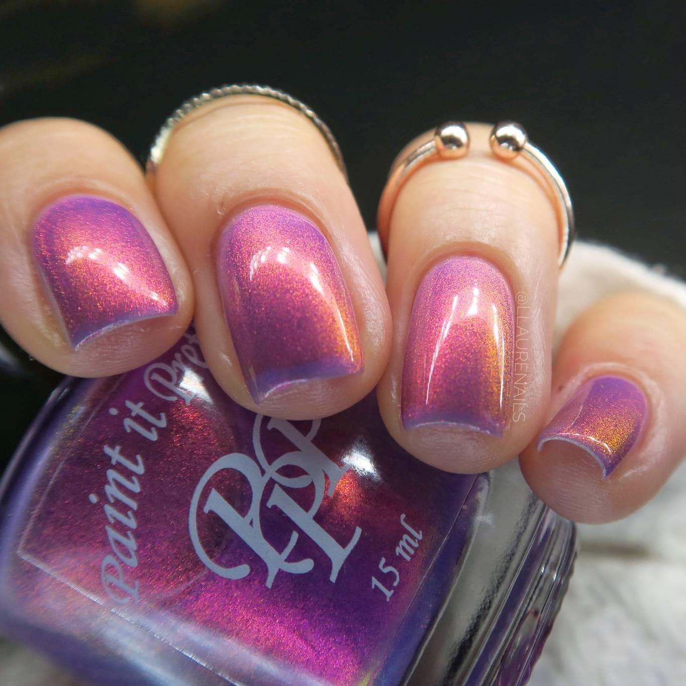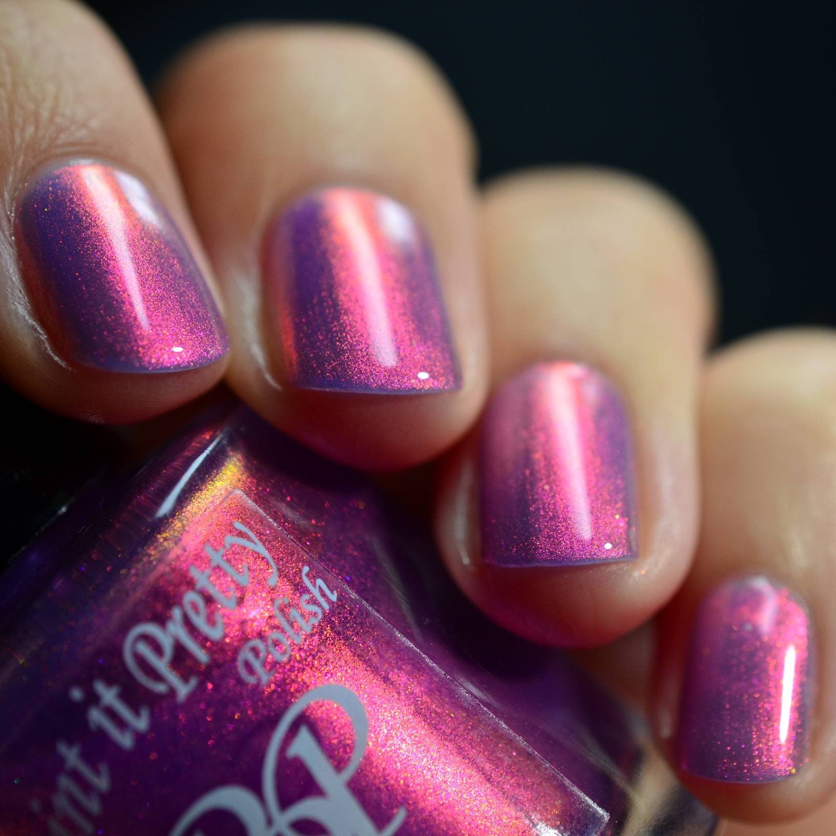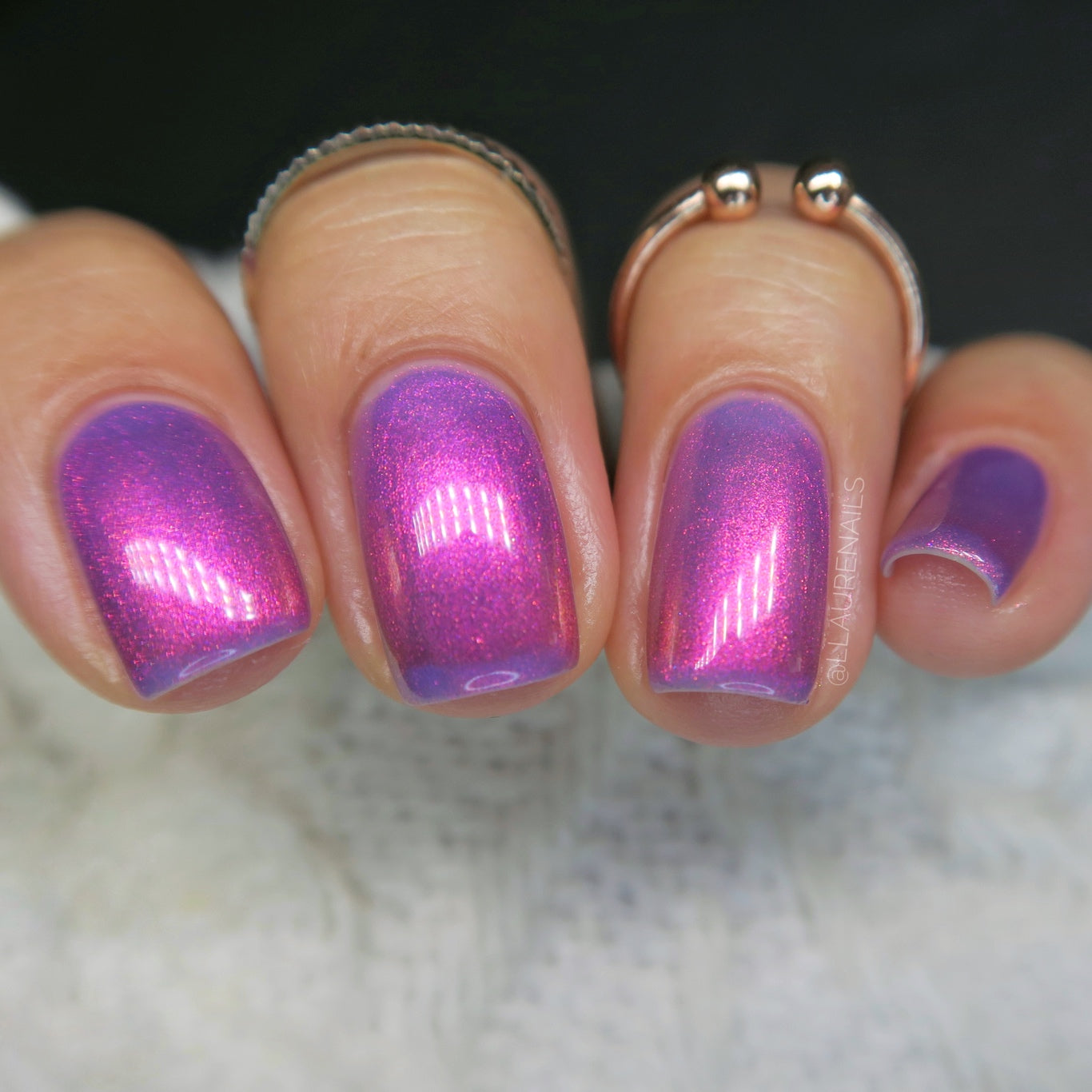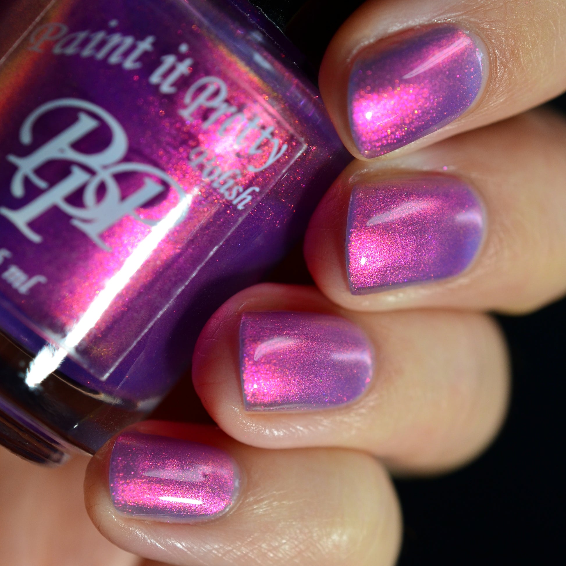 Golden Days Ethereal pink aurora shimmer floats in a sheer lilac base that is buildable. Shifts of magenta, peach, coral, hot pink with flashes of copper, gold and the elusive green are seen when worn over black polish.