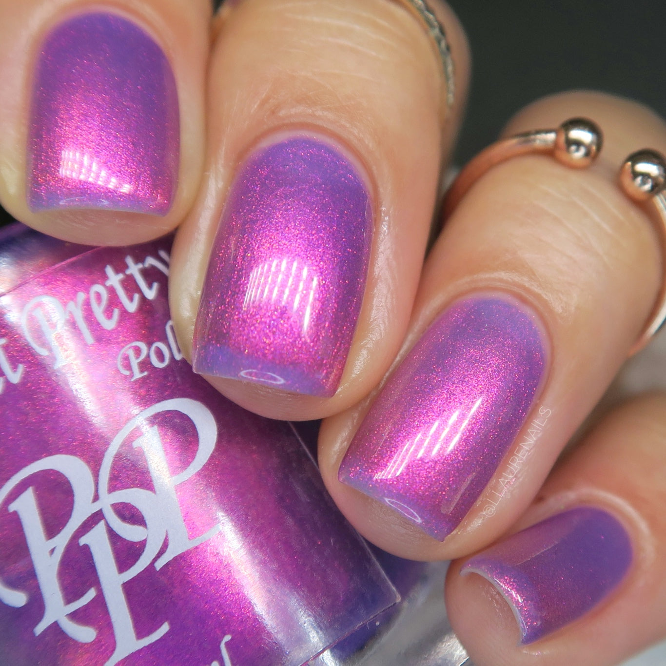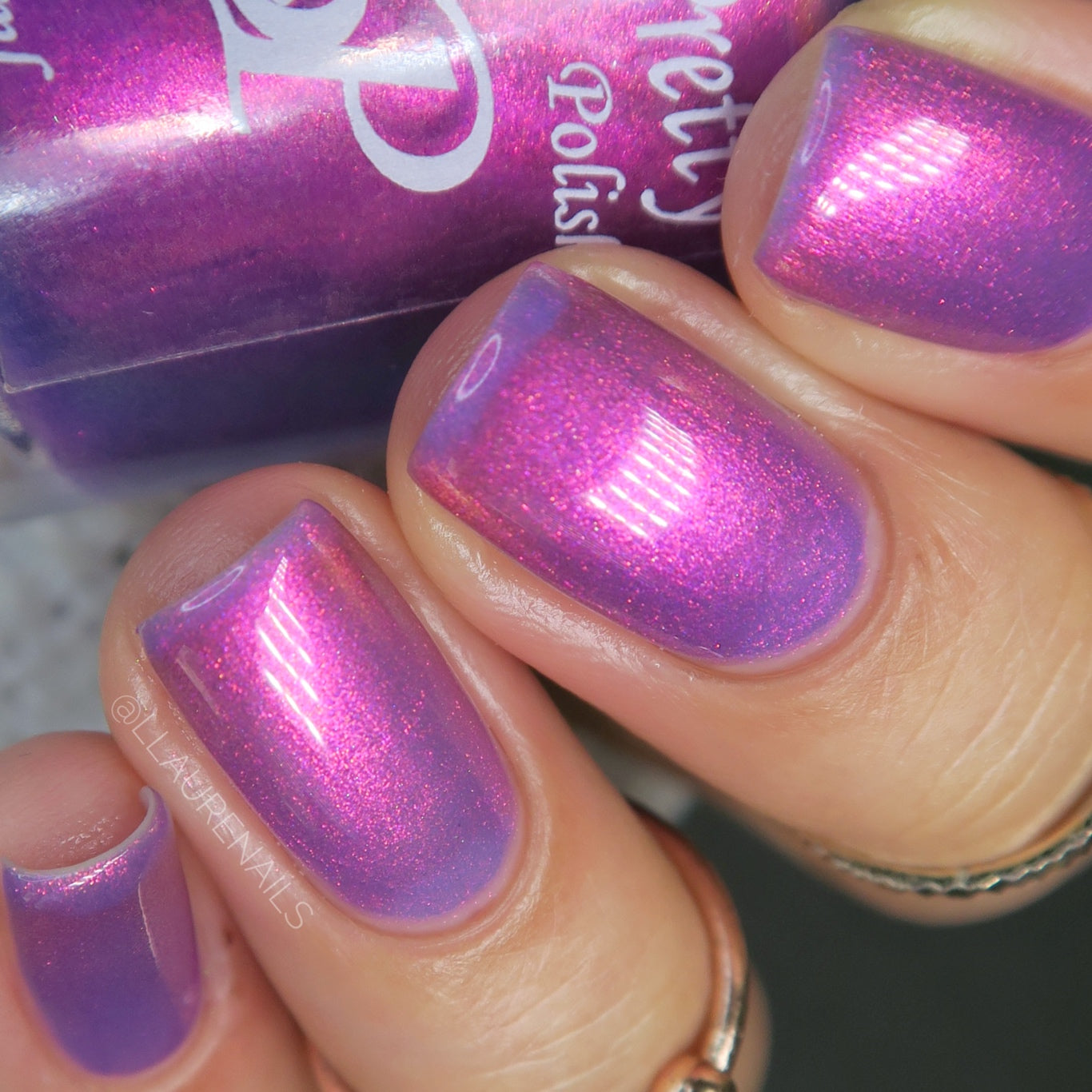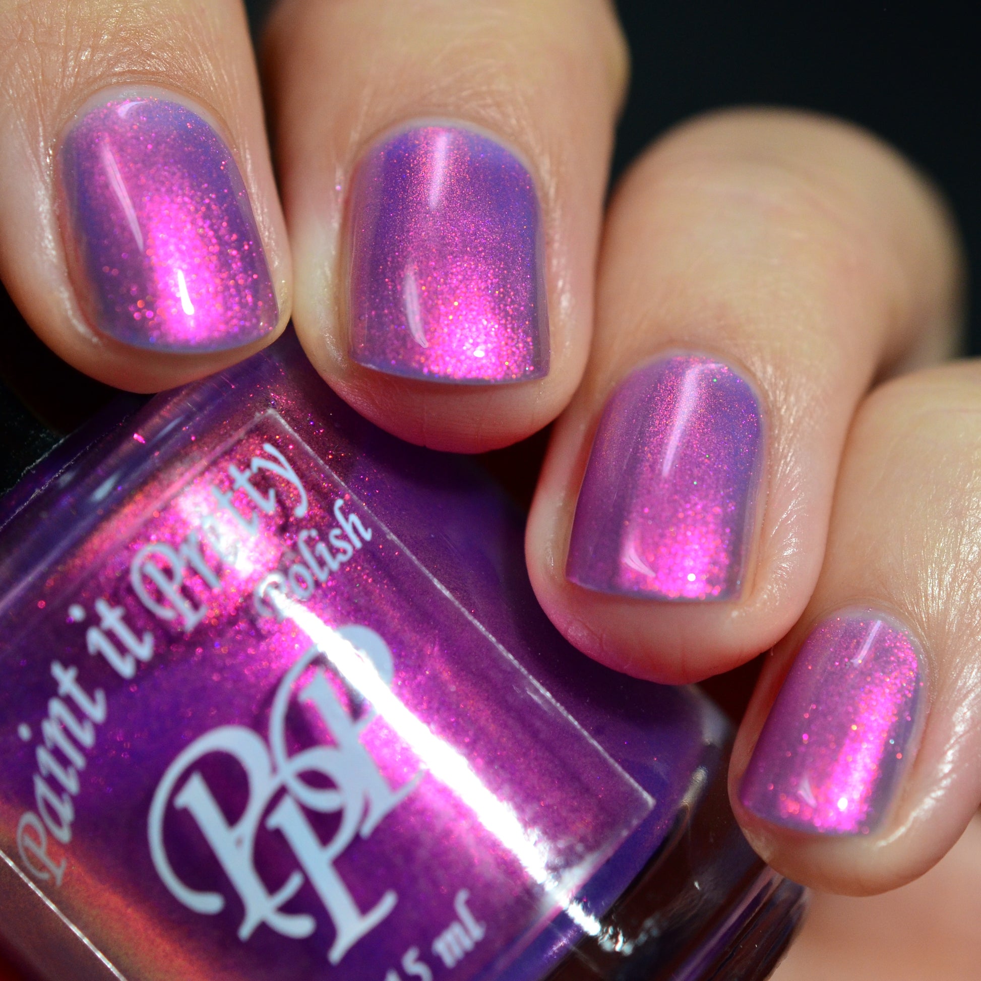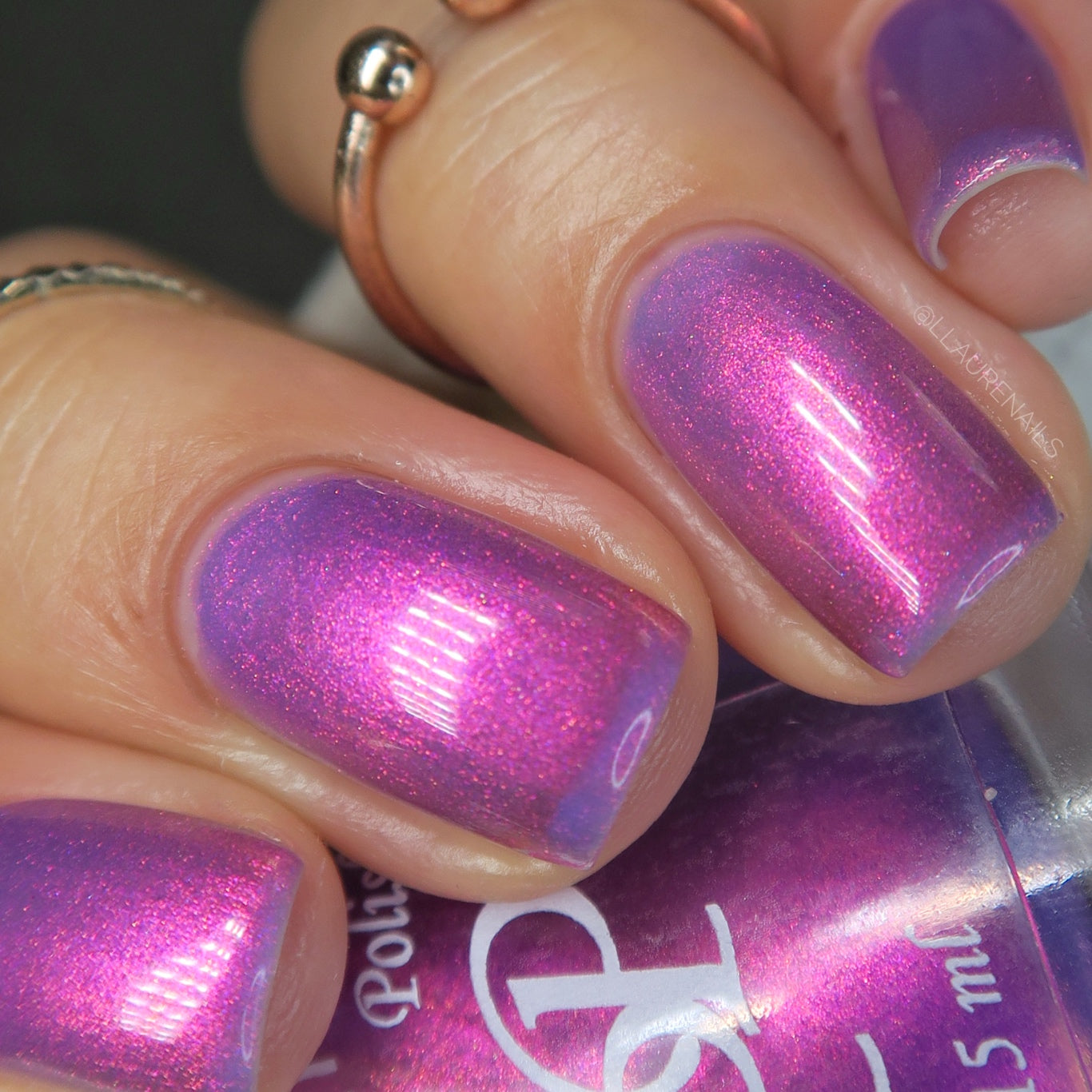 Golden Days Ethereal pink aurora shimmer floats in a sheer lilac base that is buildable. Shifts of magenta, peach, coral, hot pink with flashes of copper, gold and the elusive green are seen when worn over black polish.