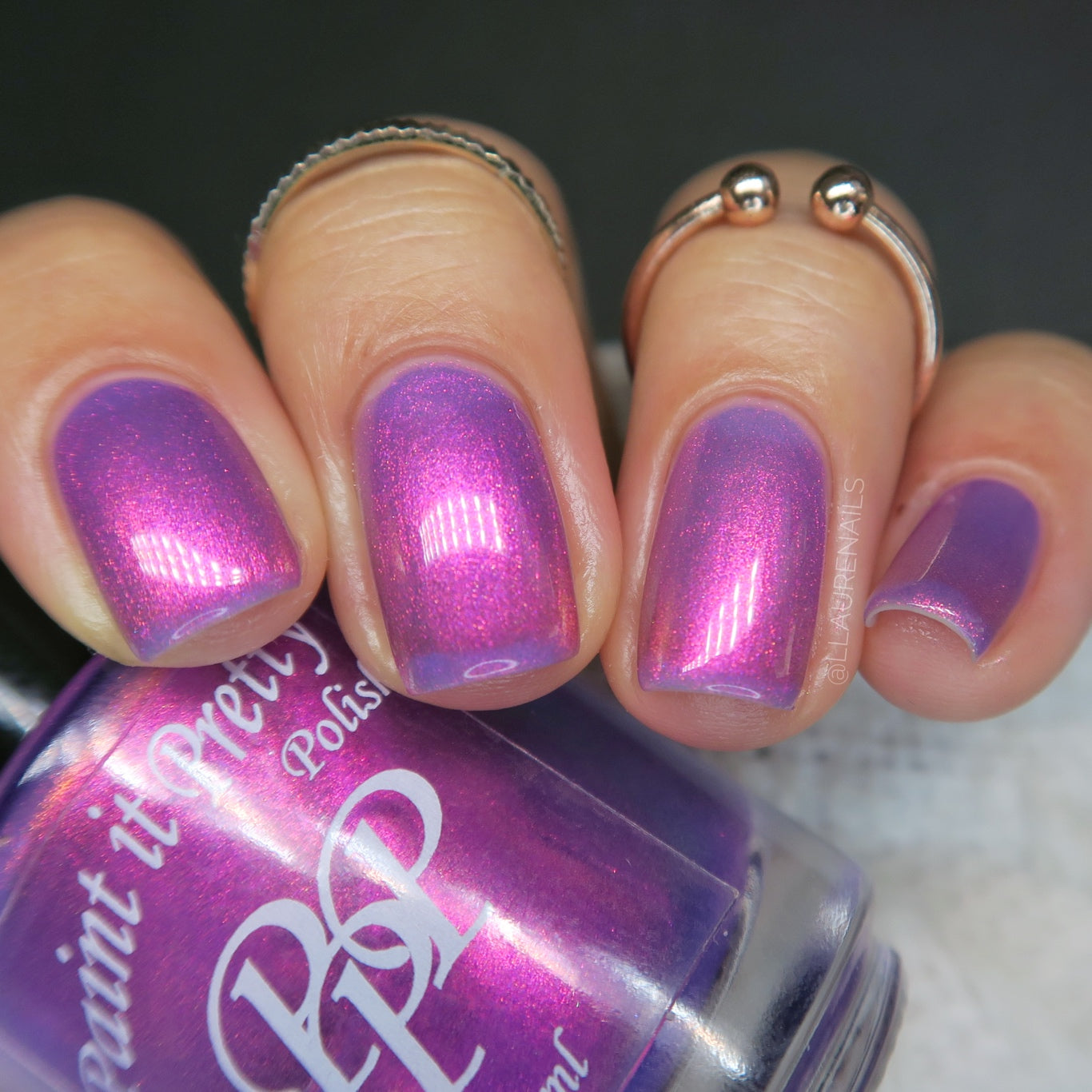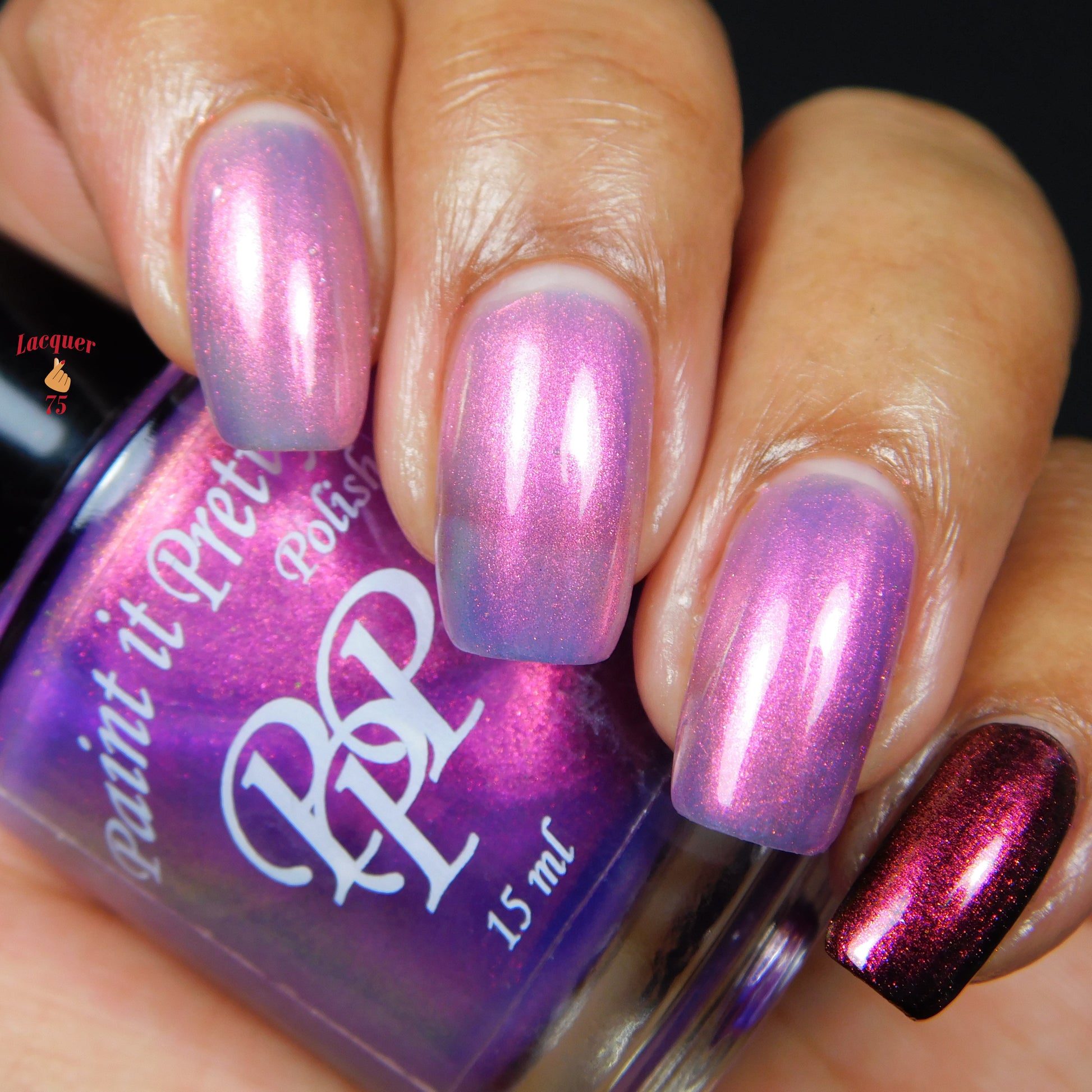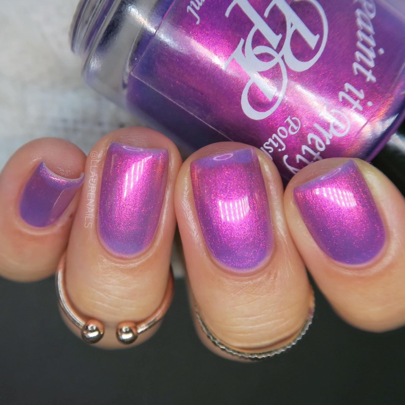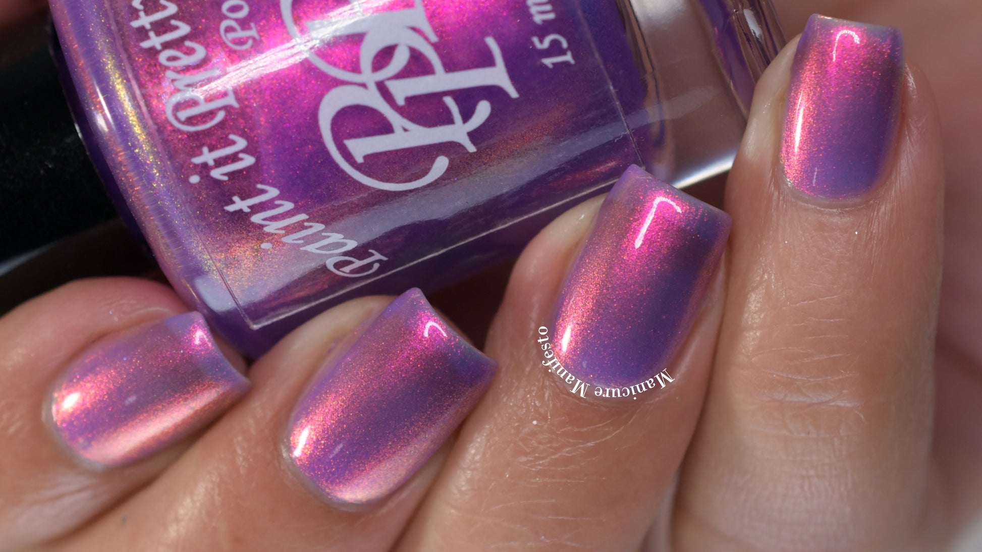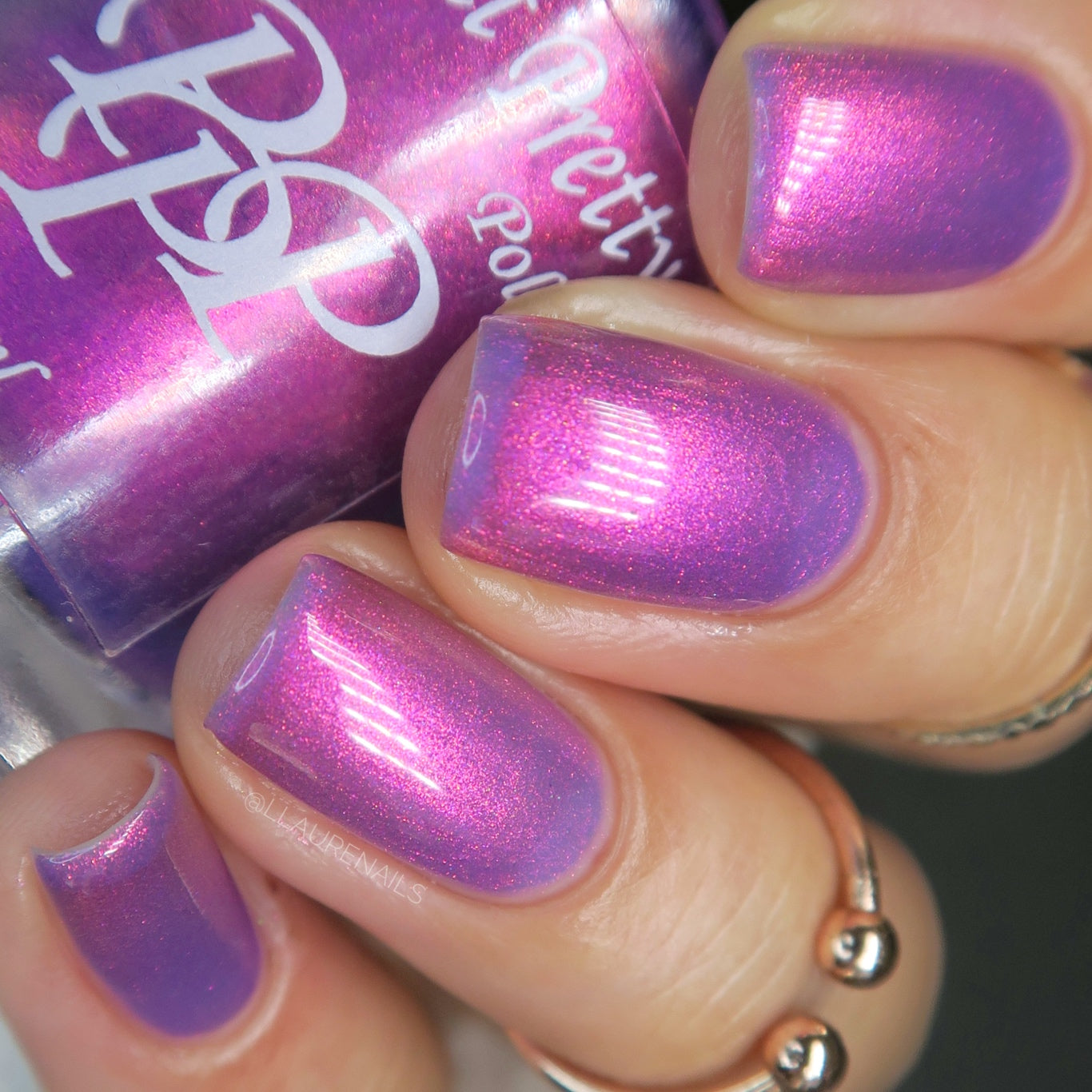 Golden Days Ethereal pink aurora shimmer floats in a sheer lilac base that is buildable. Shifts of magenta, peach, coral, hot pink with flashes of copper, gold and the elusive green are seen when worn over black polish.