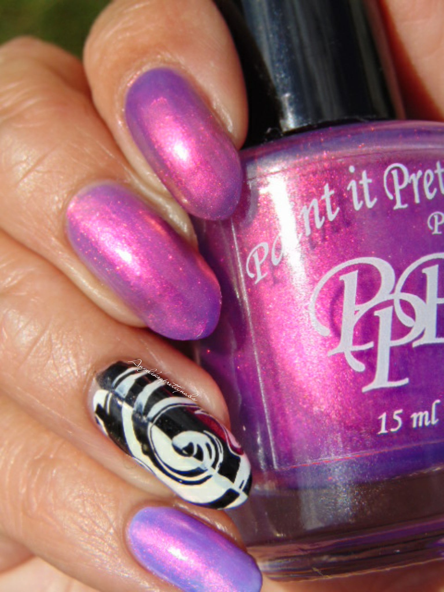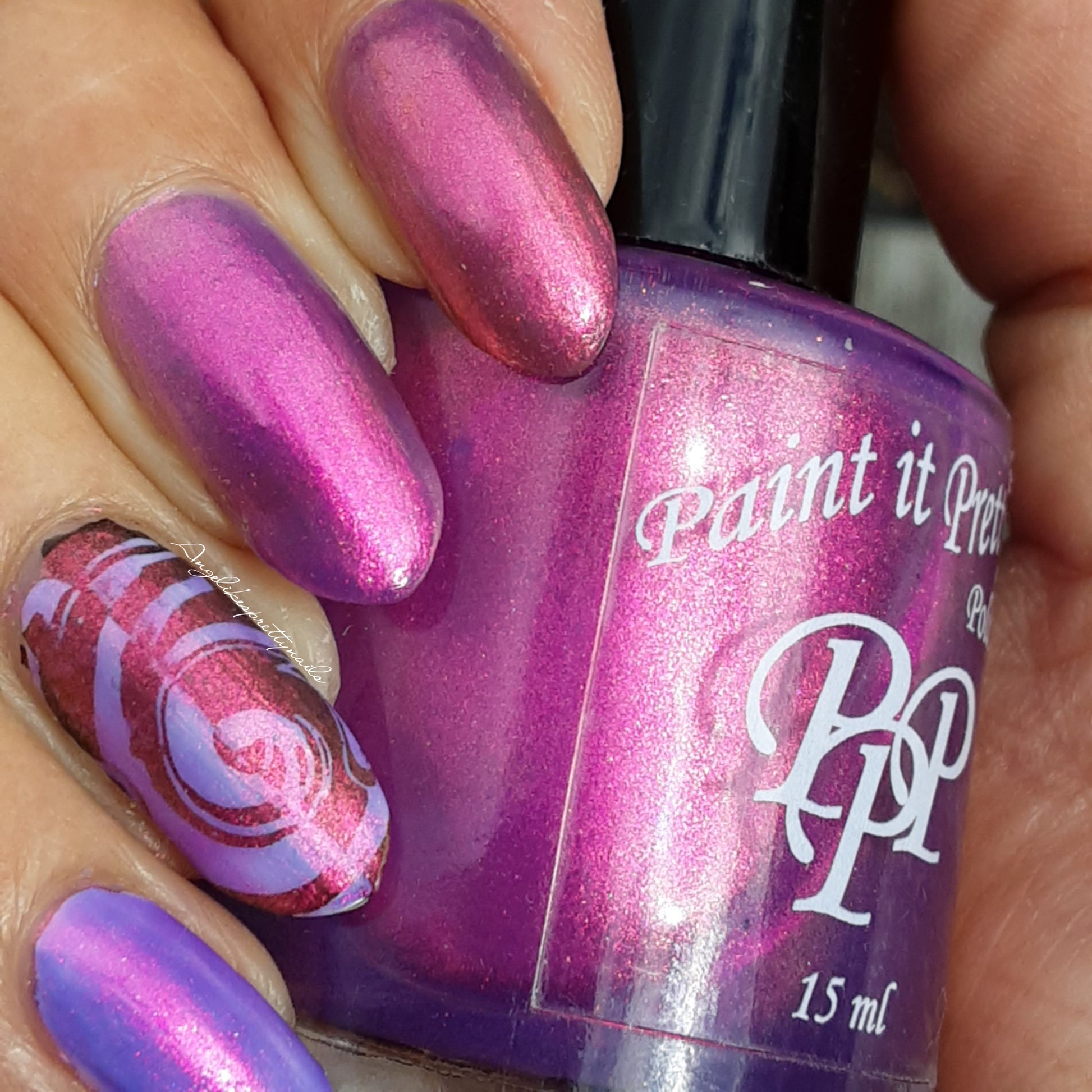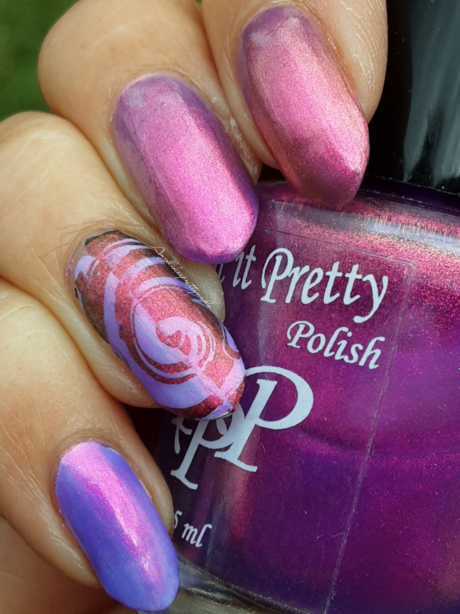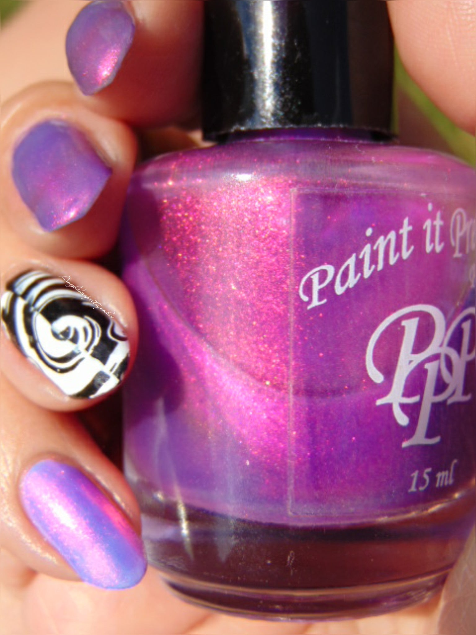 Golden Days Ethereal pink aurora shimmer floats in a sheer lilac base that is buildable. Shifts of magenta, peach, coral, hot pink with flashes of copper, gold and the elusive green are seen when worn over black polish.