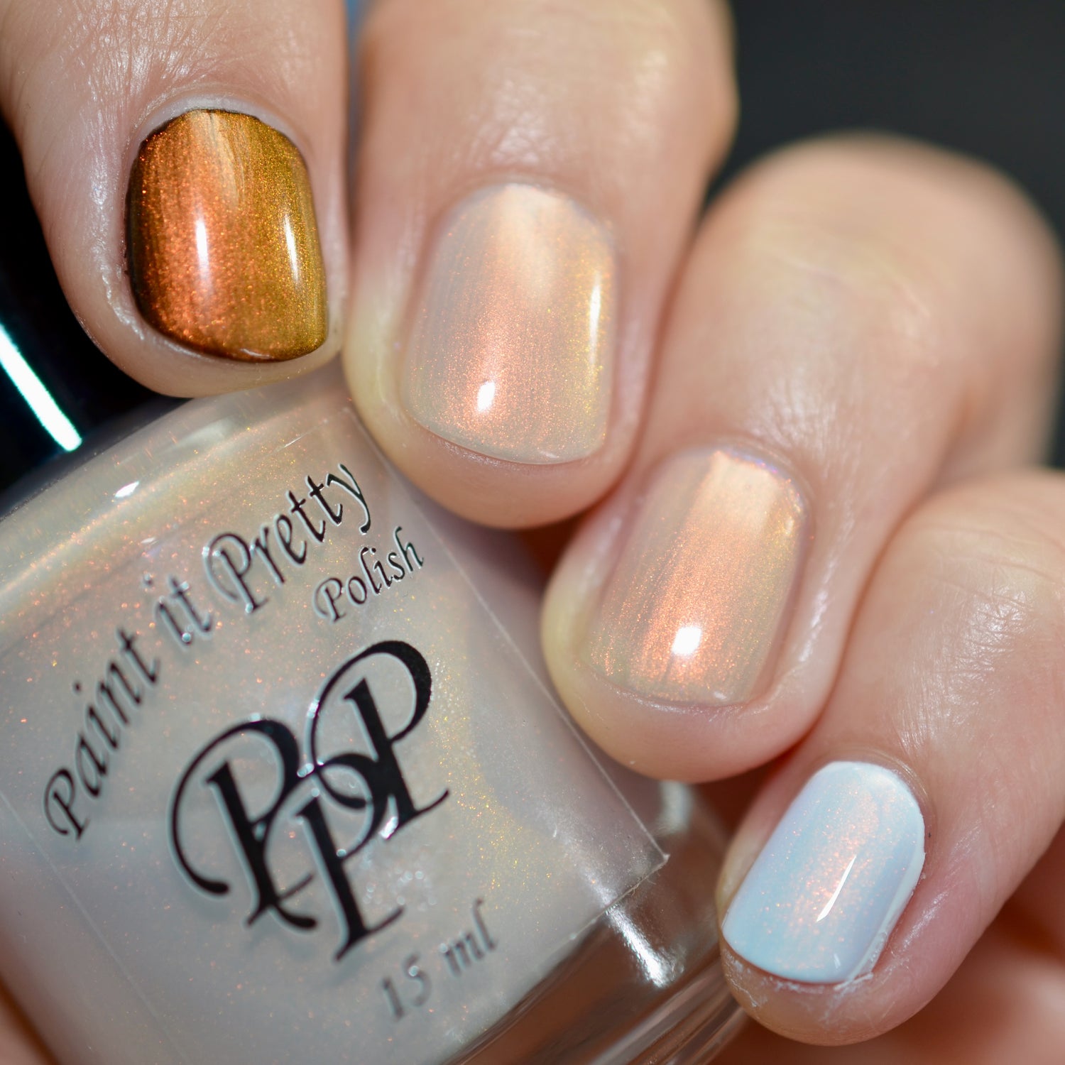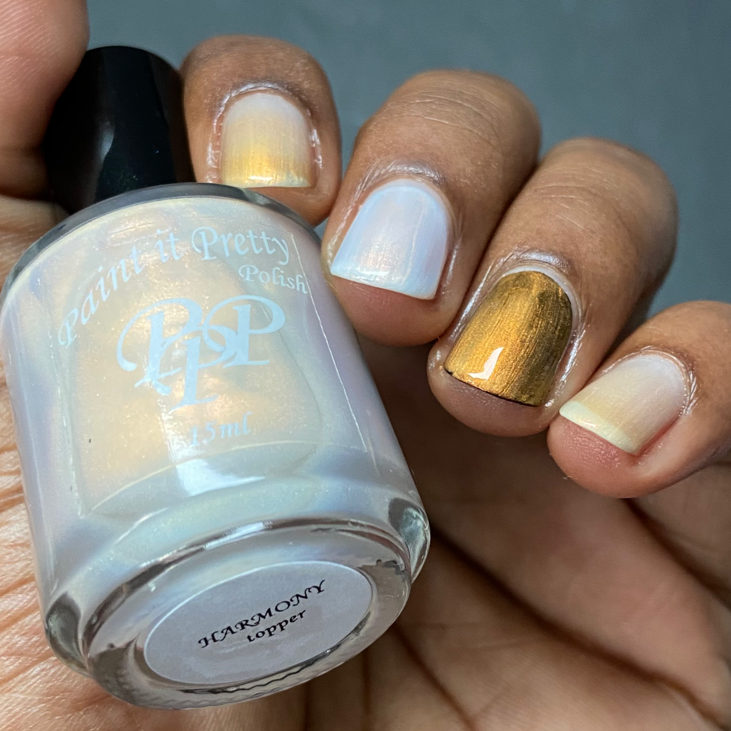 Harmony is beautiful orange/yellow shifting topper. Wear it on it's own for a soft milky shimmer effect or over darker shades to make the shifts pop.