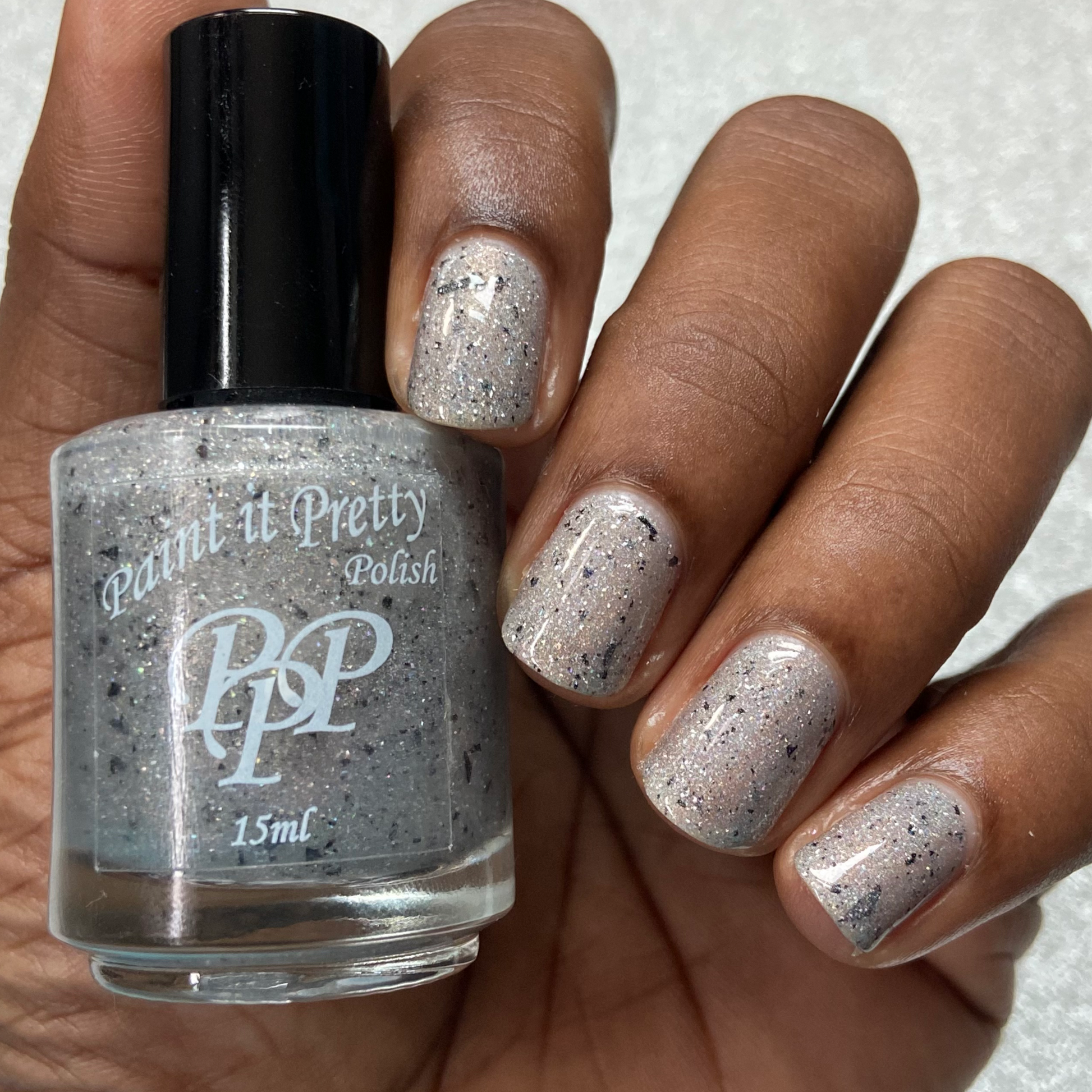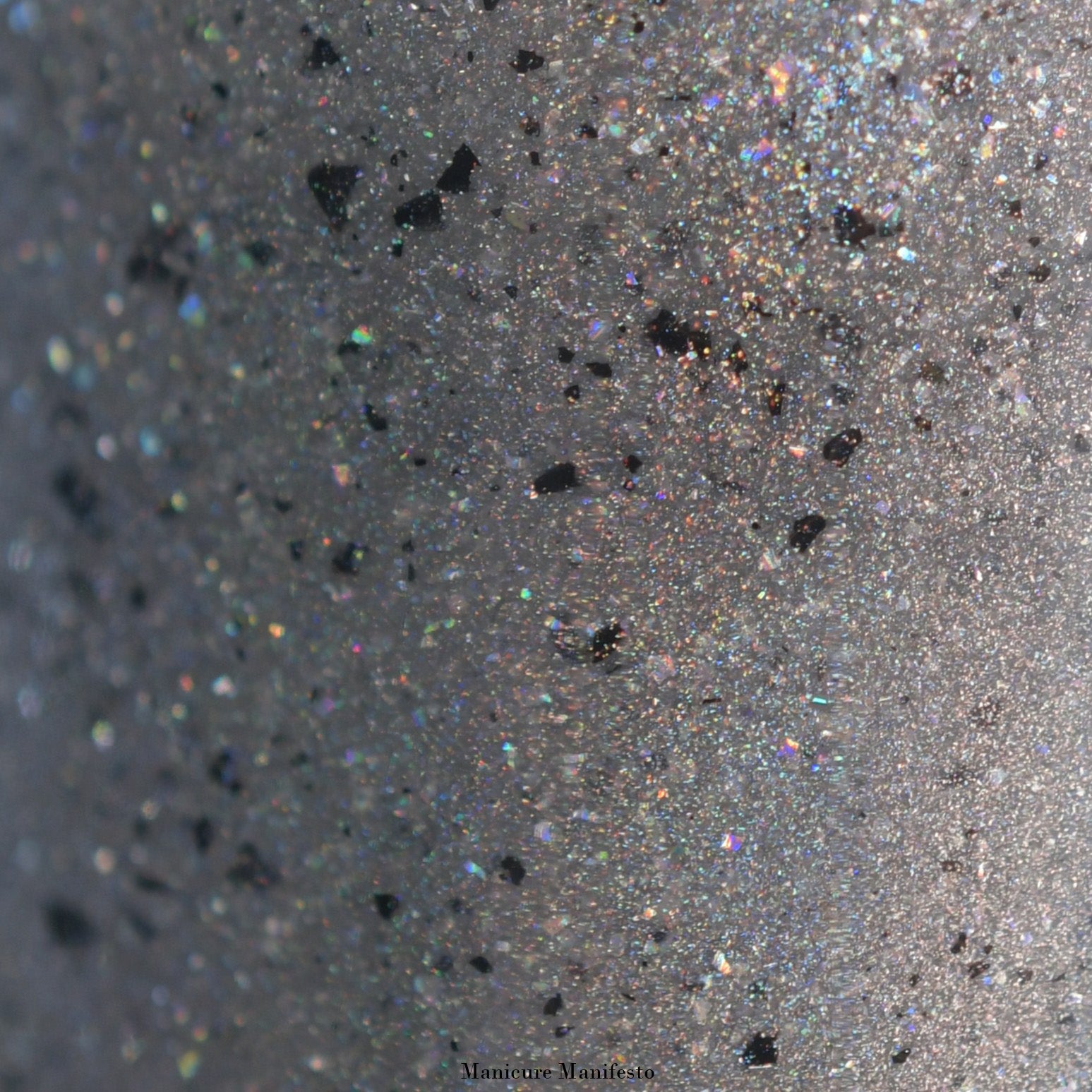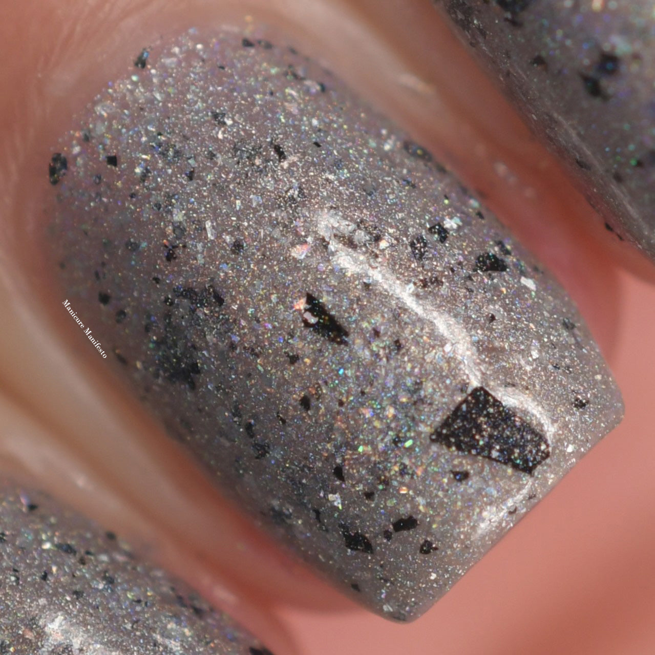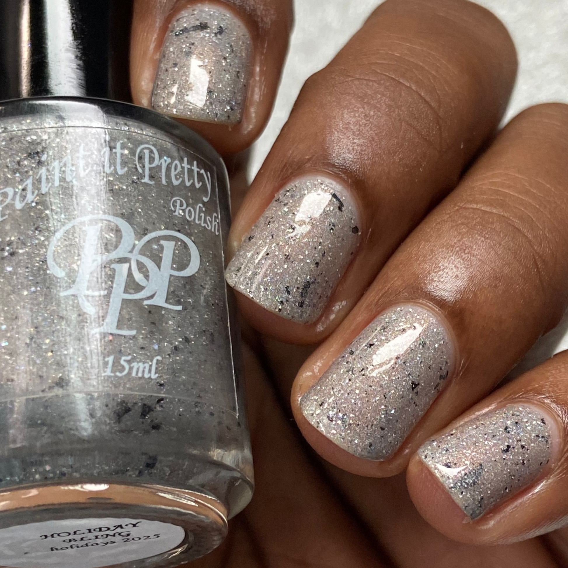 Holiday Bling is a grey holographic polish with black flakes.