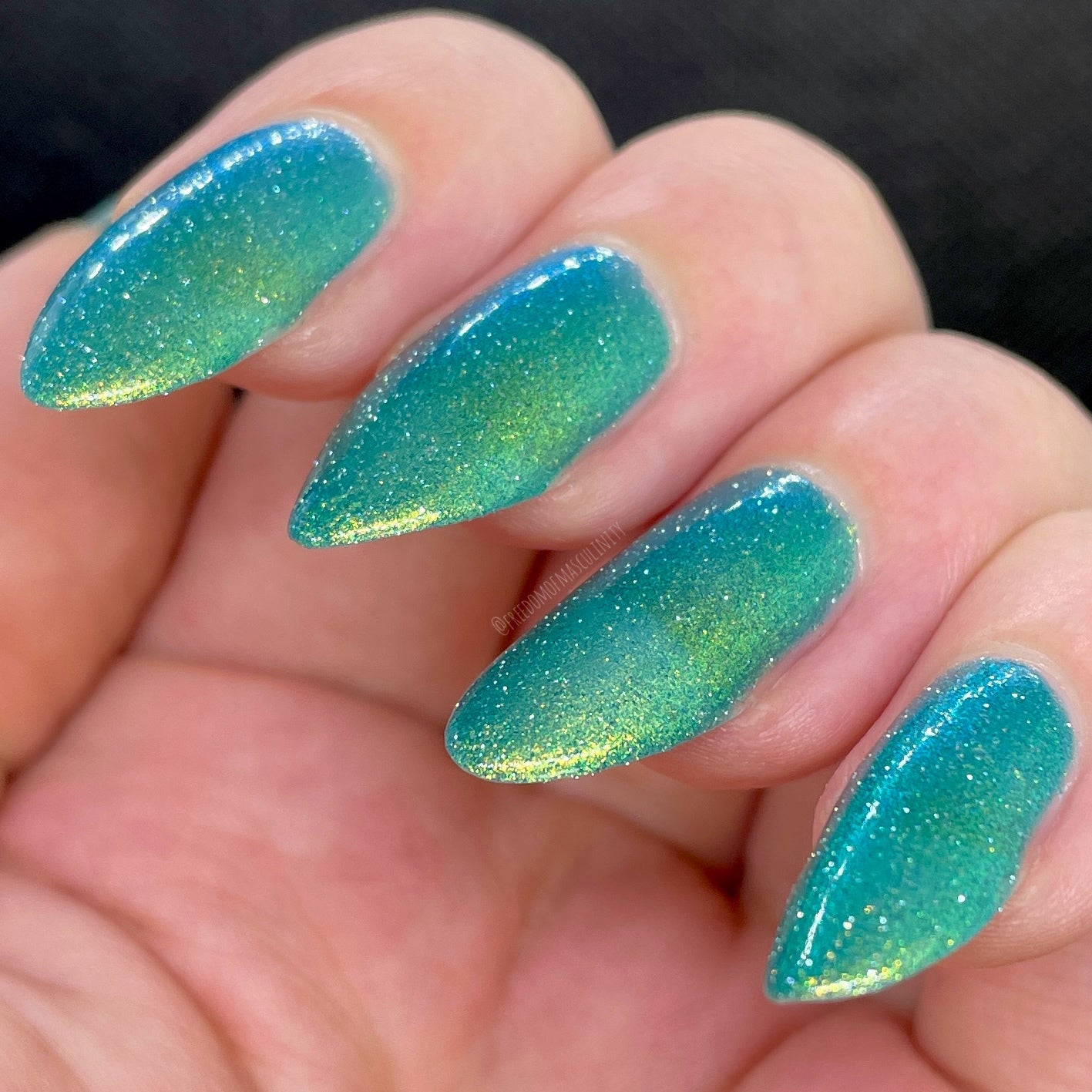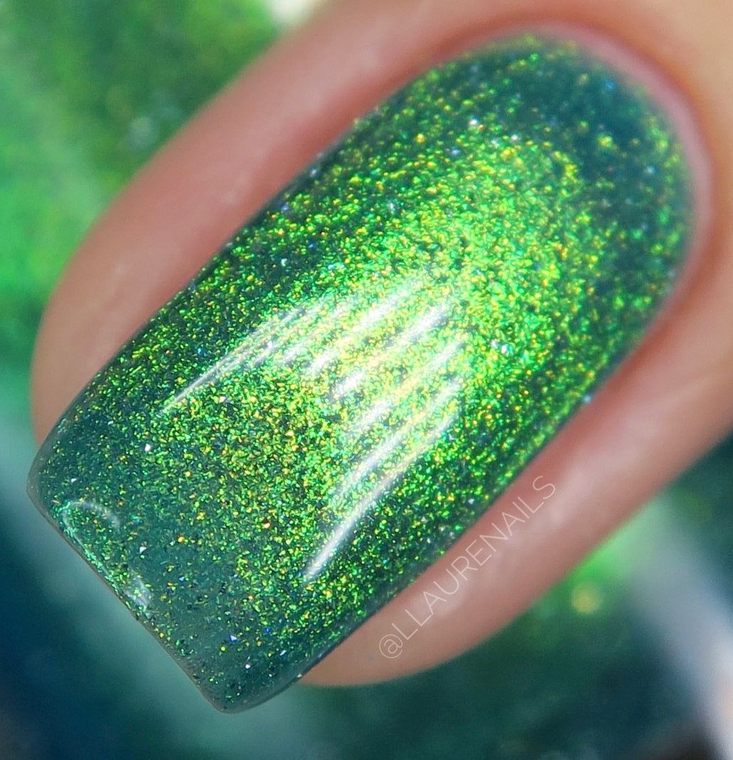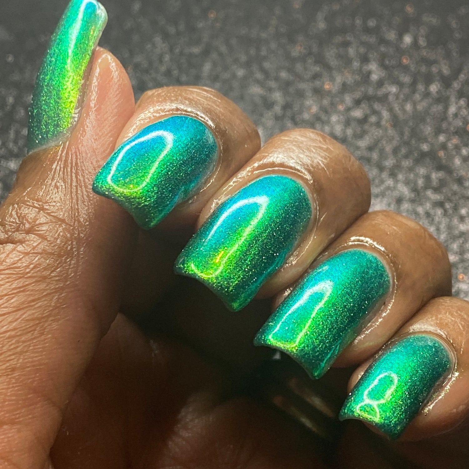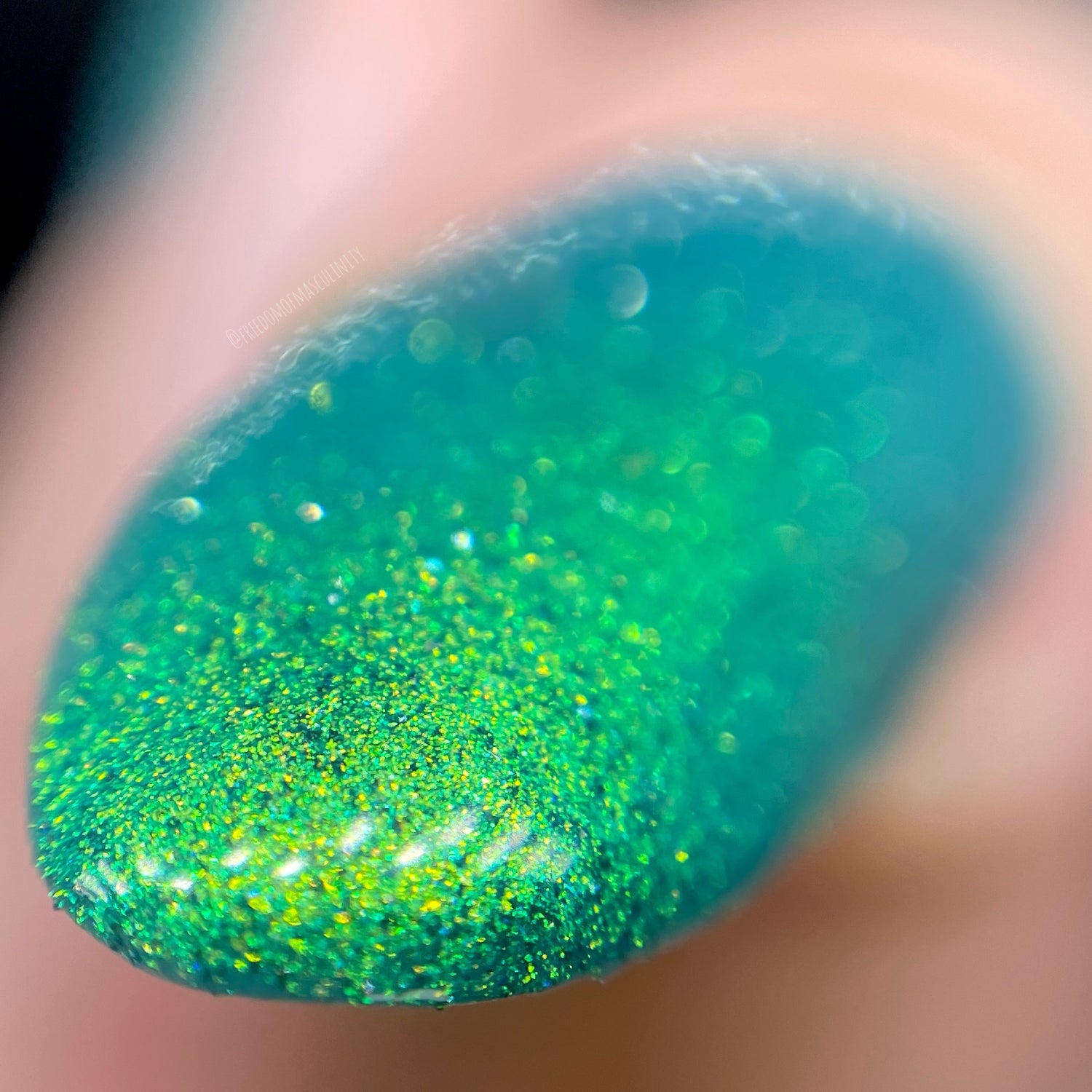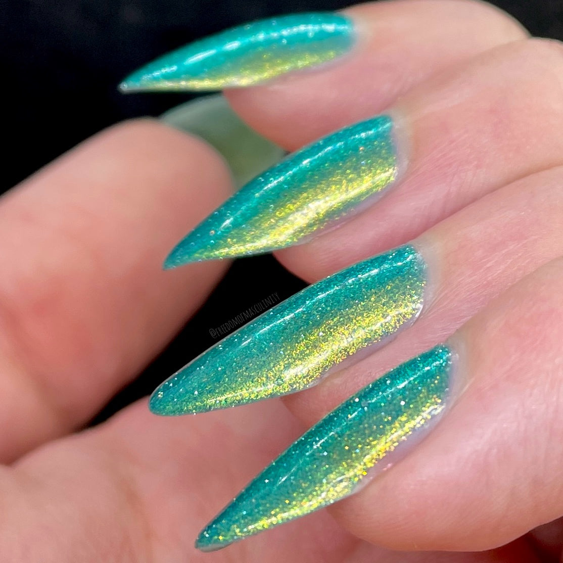 Channel the grinch (with his heart that’s grown) with this green and festive polish. A blue-green base with a green-gold shifting shimmer and reflective glitter captures the joy of the season perfectly!