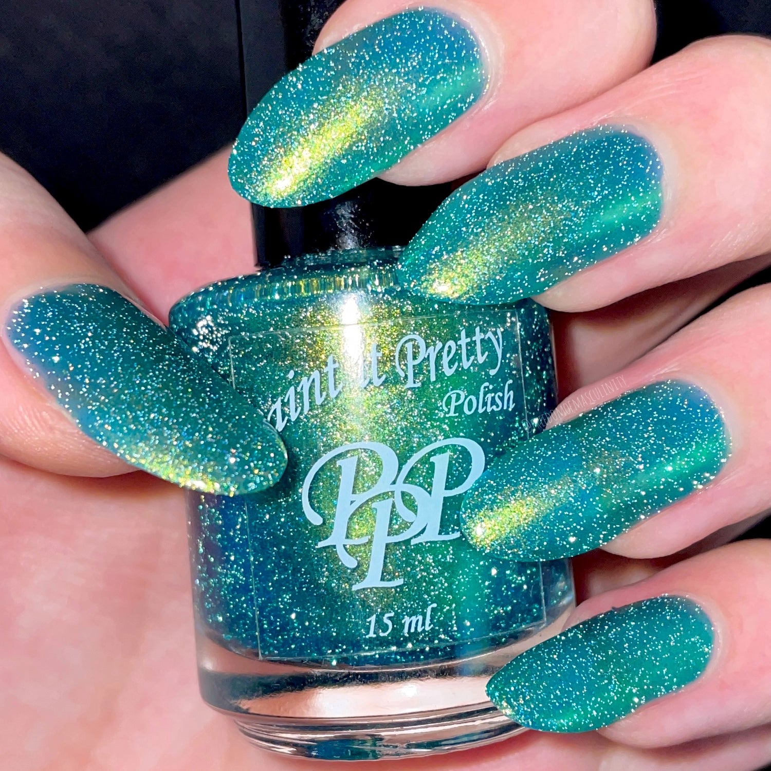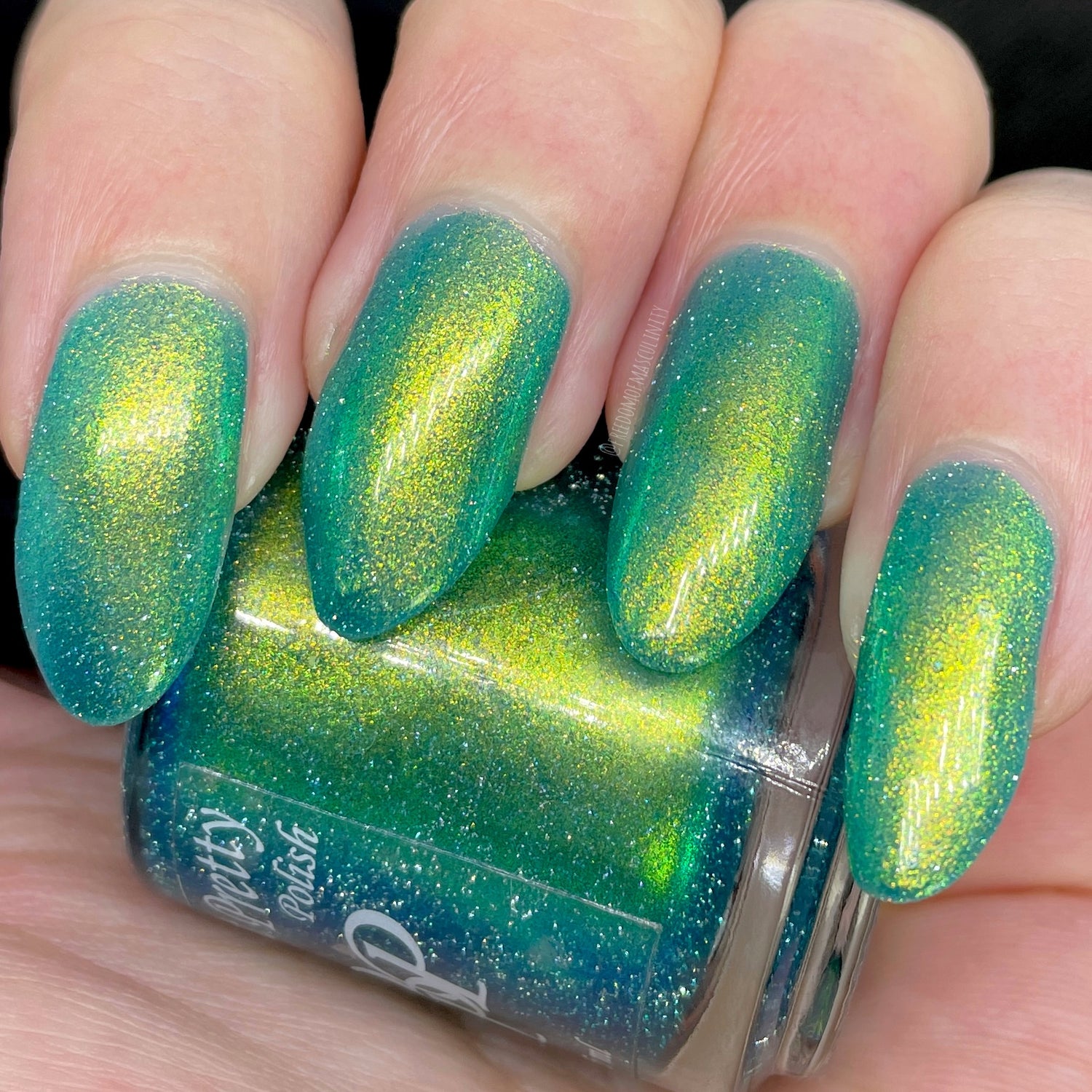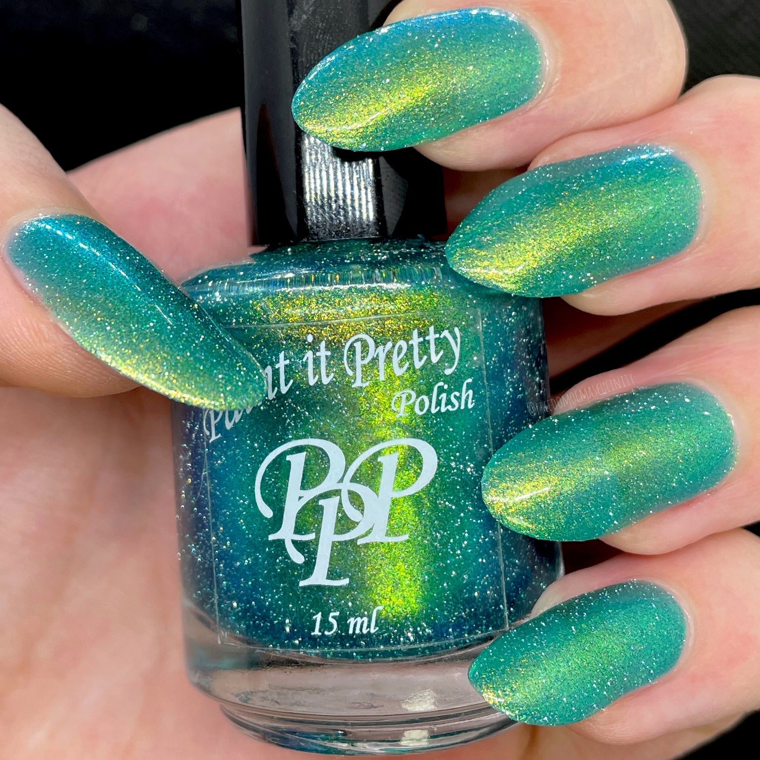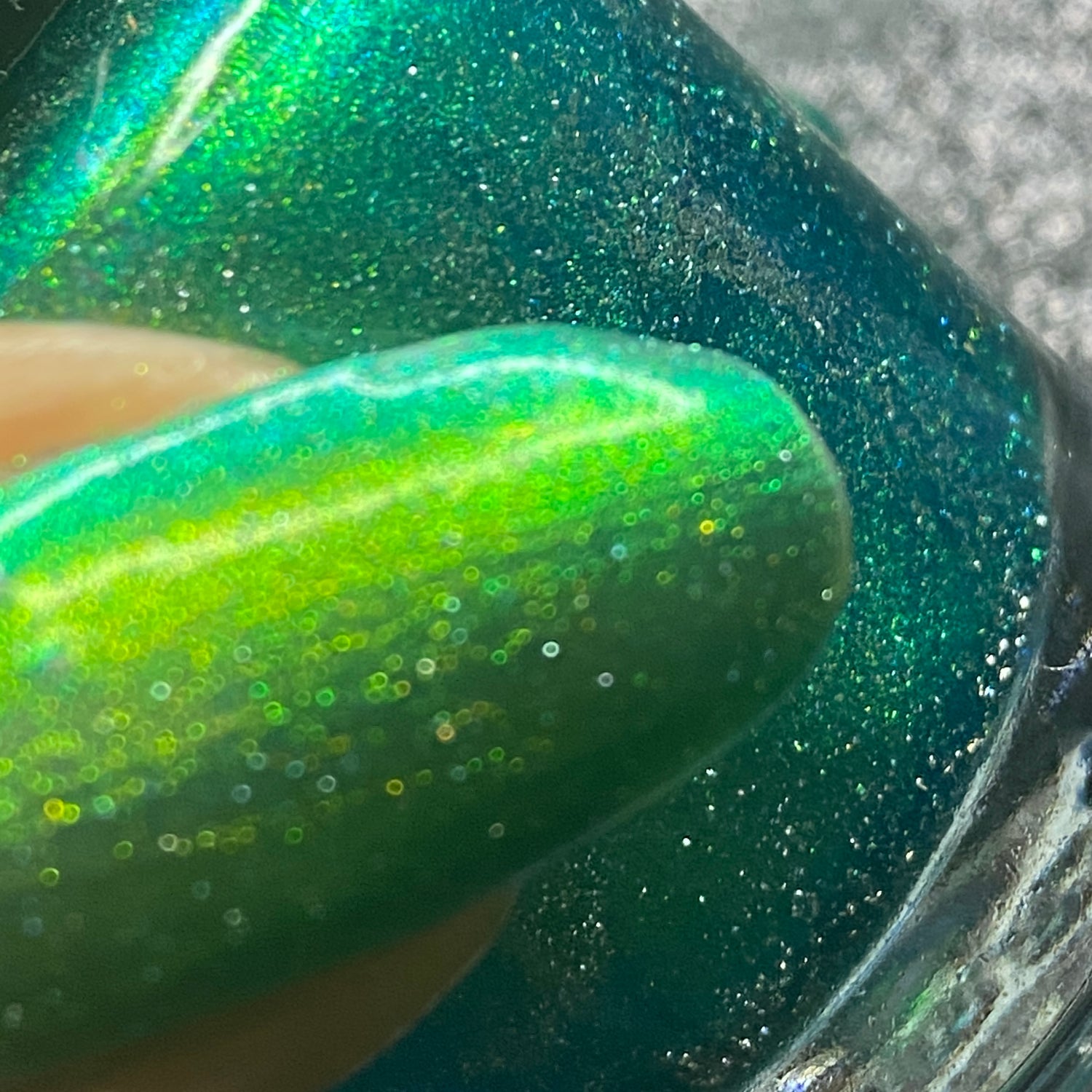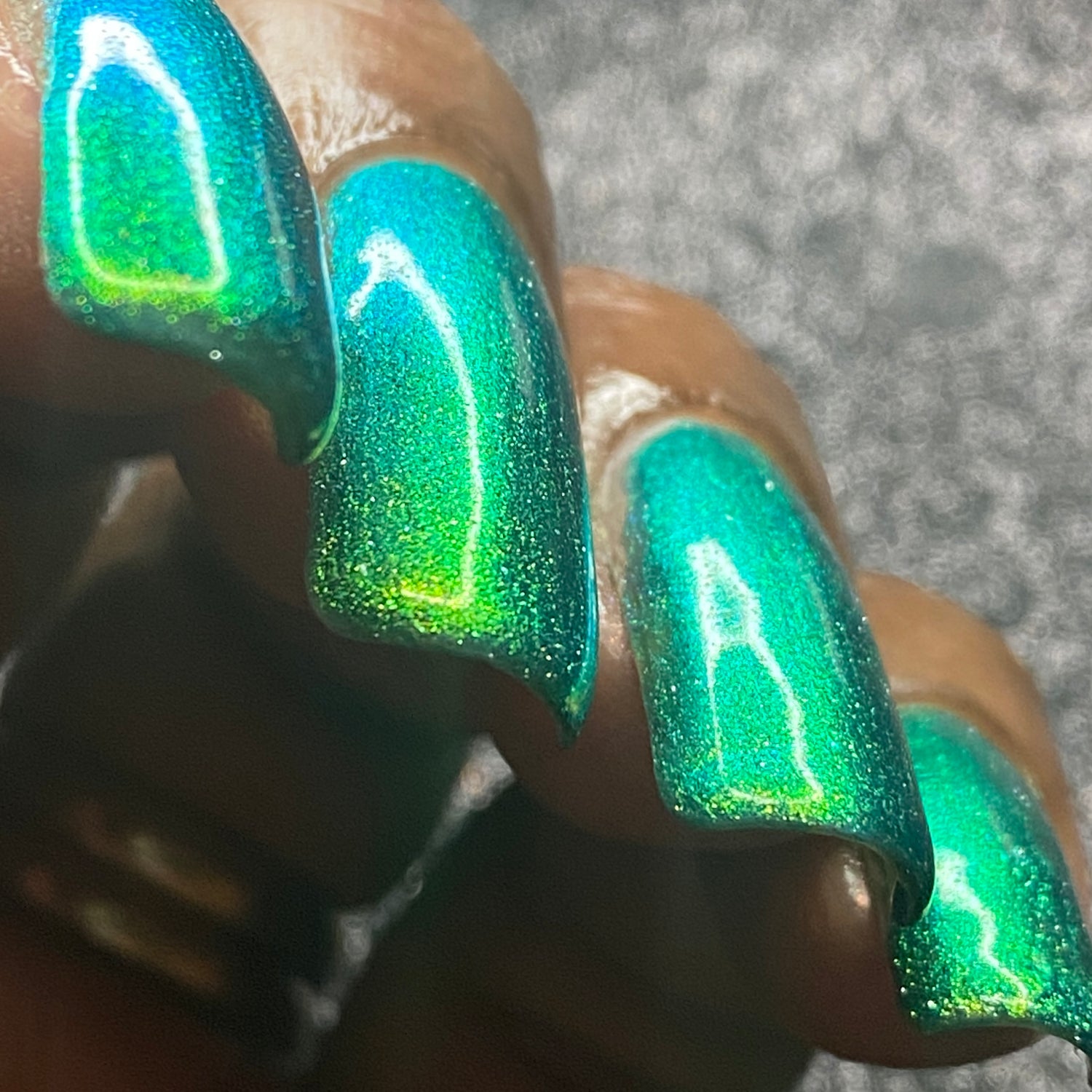 Channel the grinch (with his heart that’s grown) with this green and festive polish. A blue-green base with a green-gold shifting shimmer and reflective glitter captures the joy of the season perfectly!