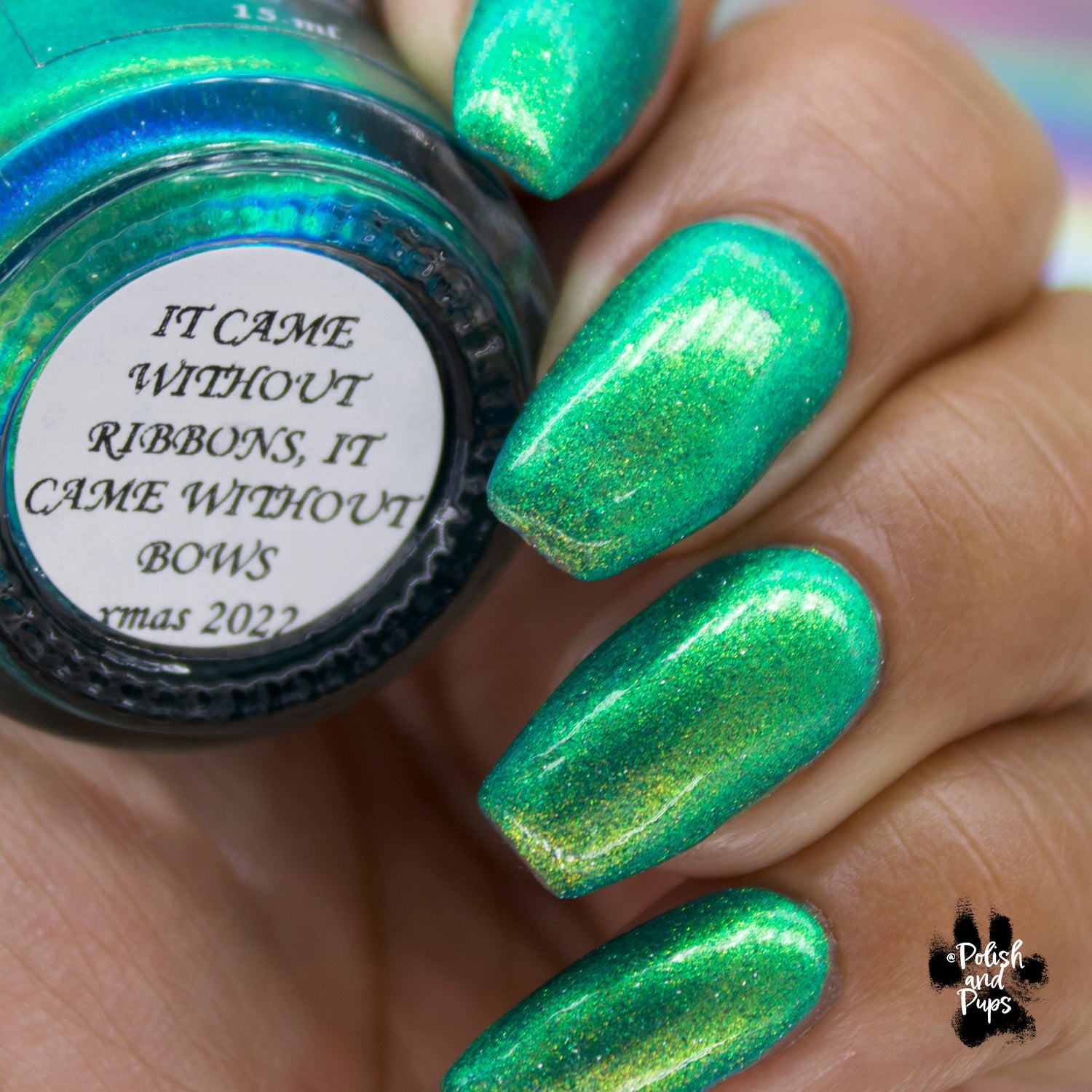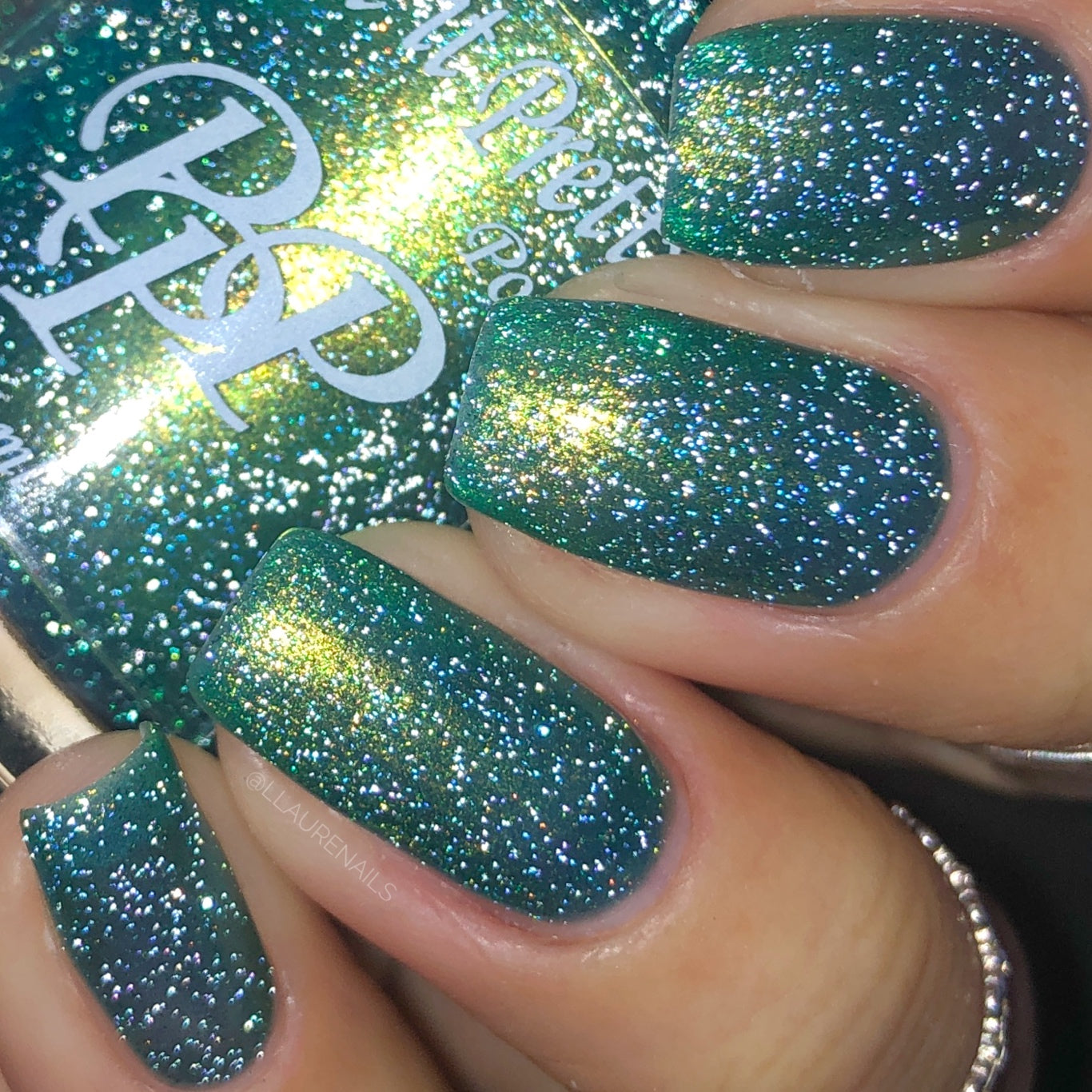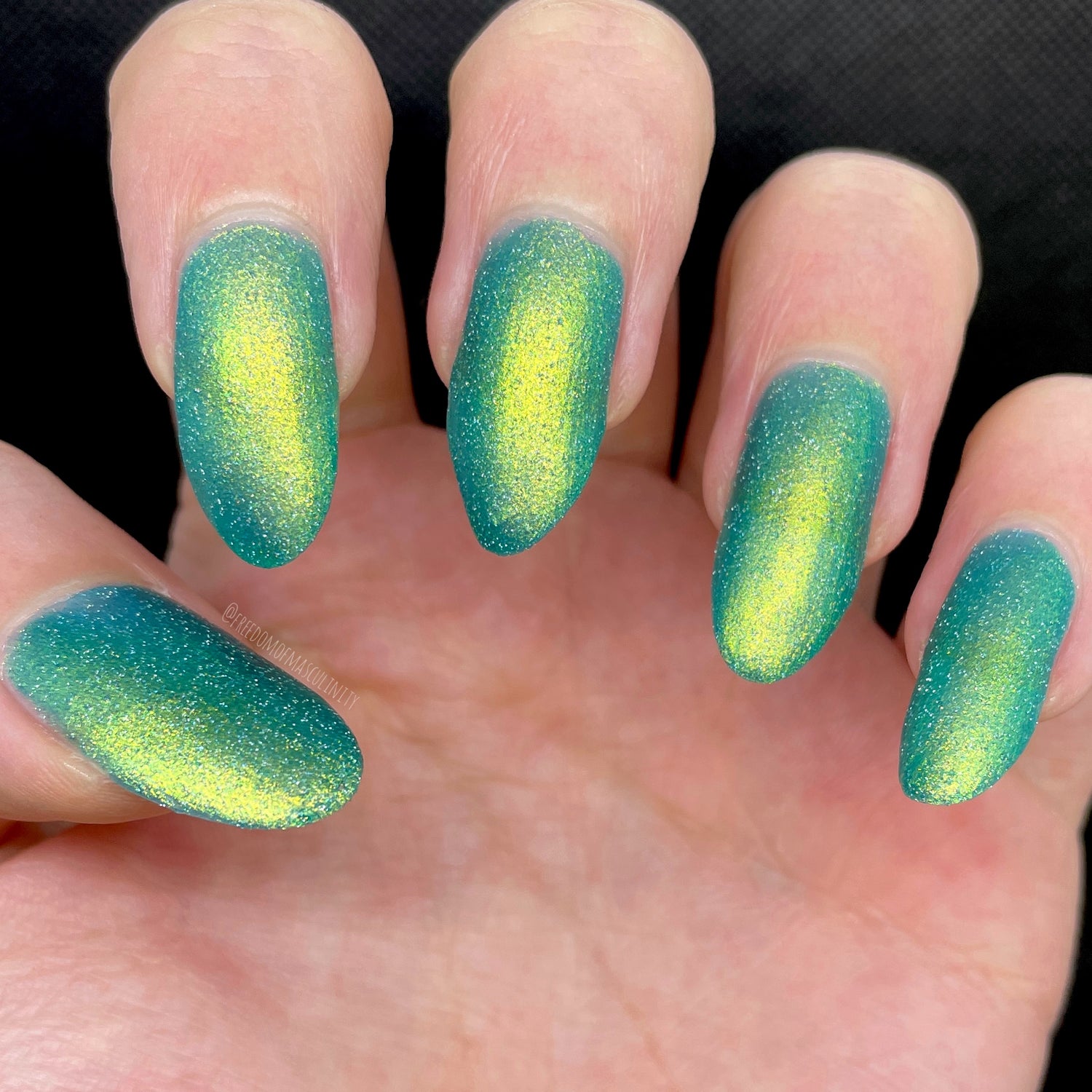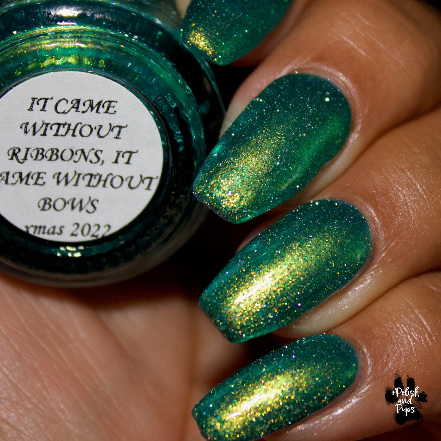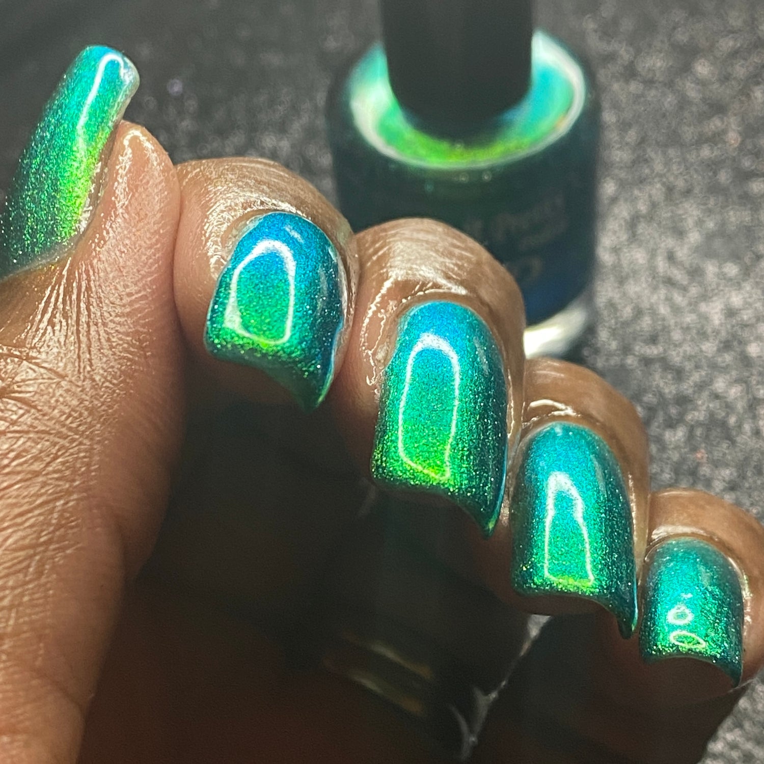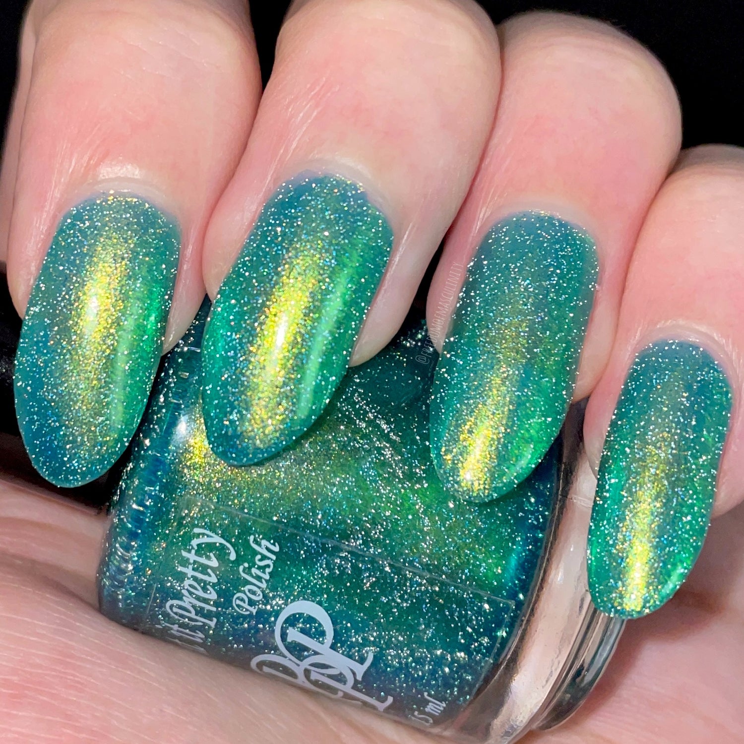 Channel the grinch (with his heart that’s grown) with this green and festive polish. A blue-green base with a green-gold shifting shimmer and reflective glitter captures the joy of the season perfectly!