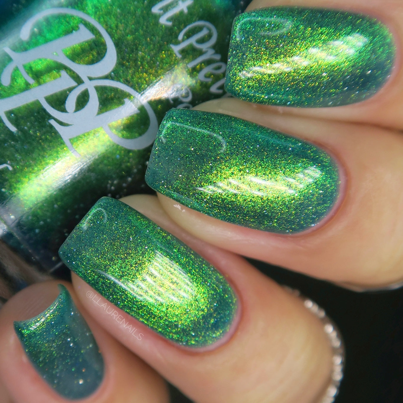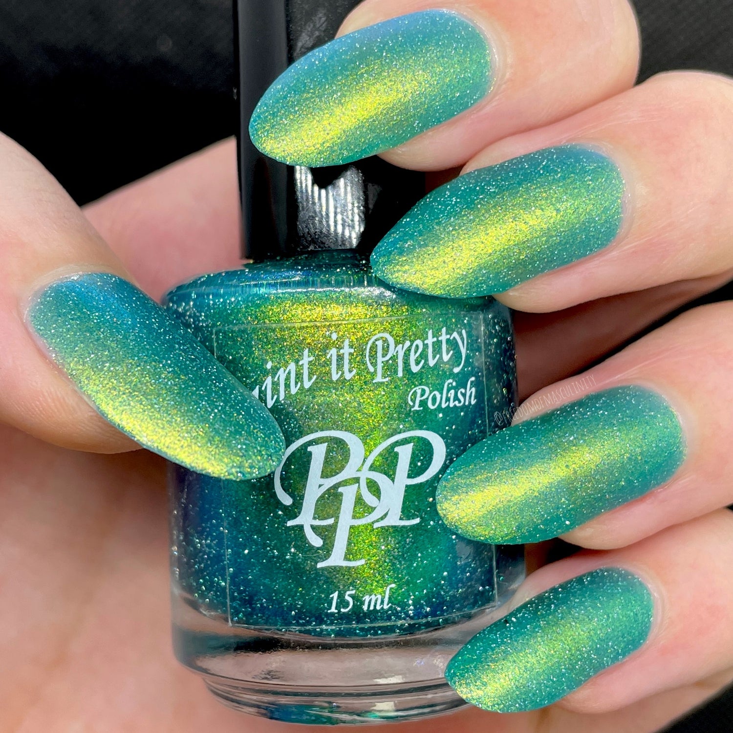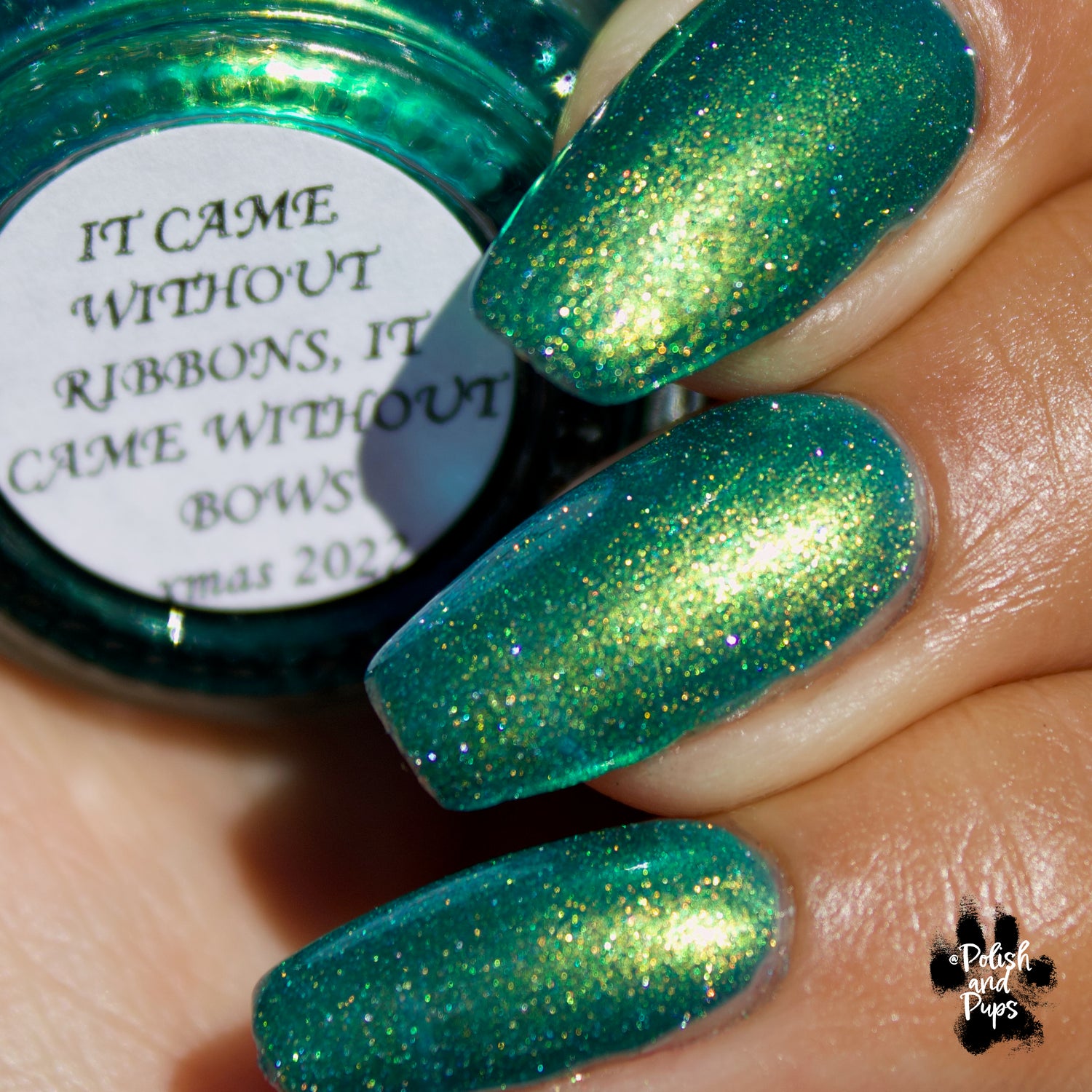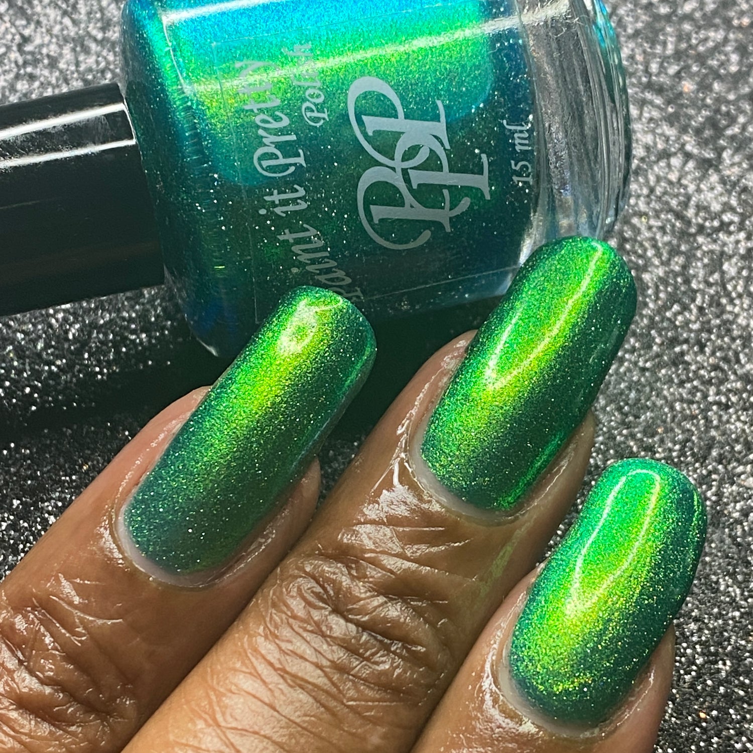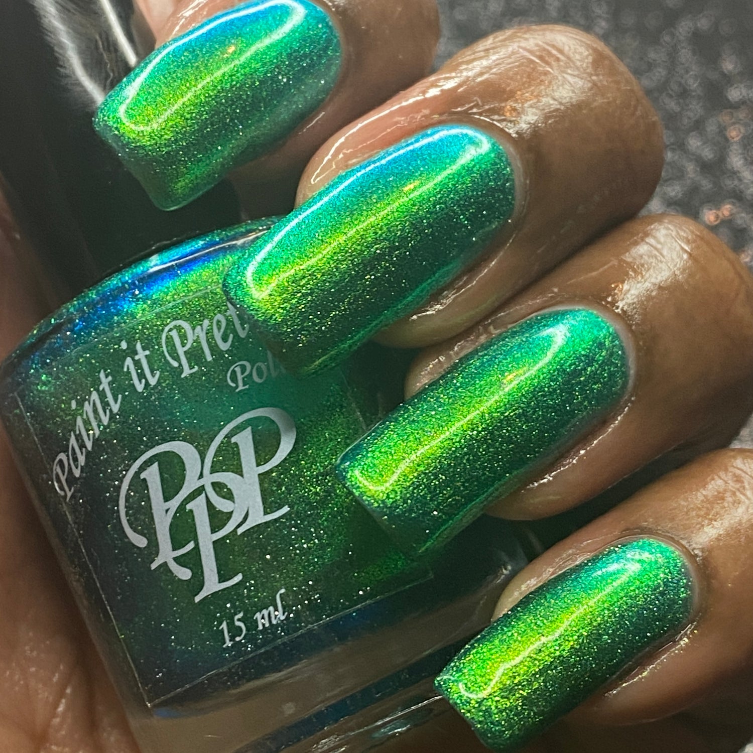 Channel the grinch (with his heart that’s grown) with this green and festive polish. A blue-green base with a green-gold shifting shimmer and reflective glitter captures the joy of the season perfectly!