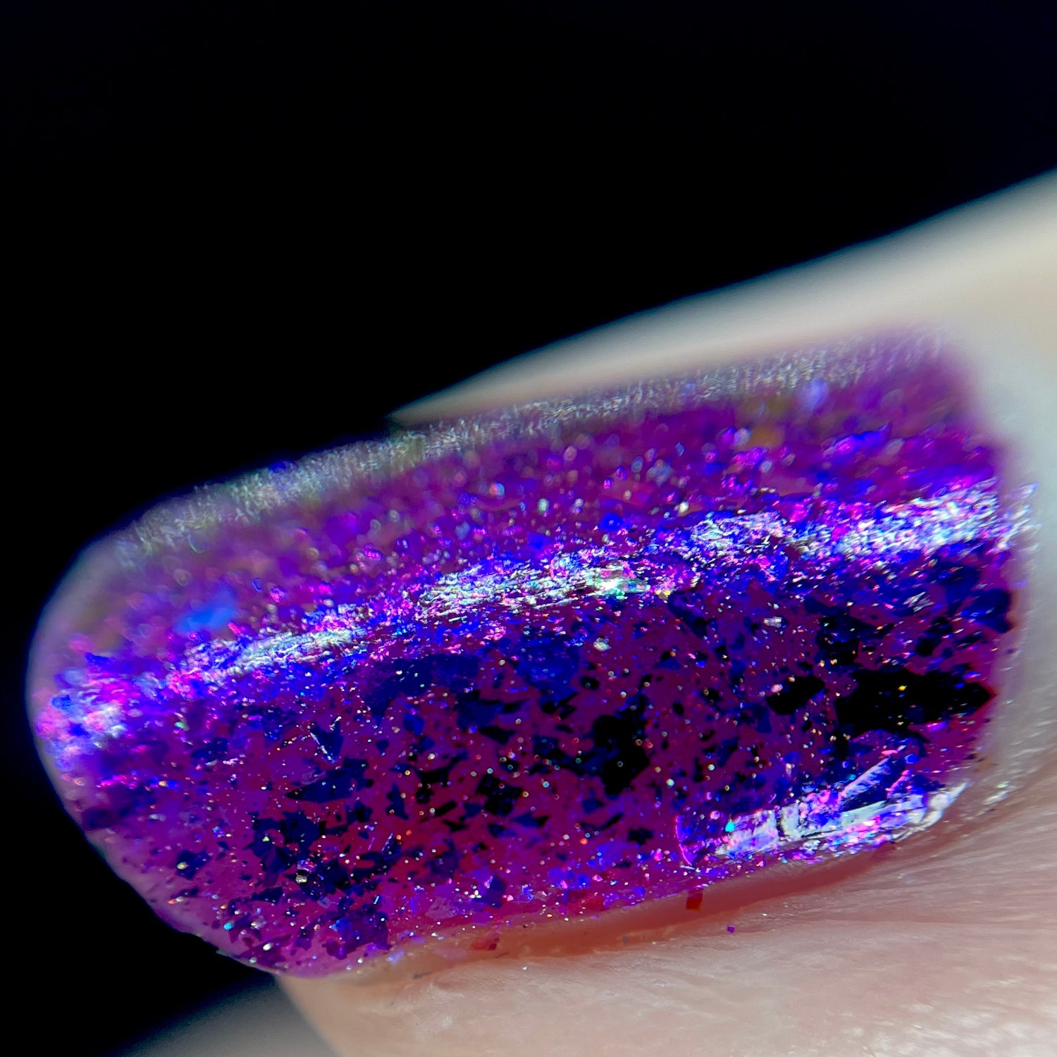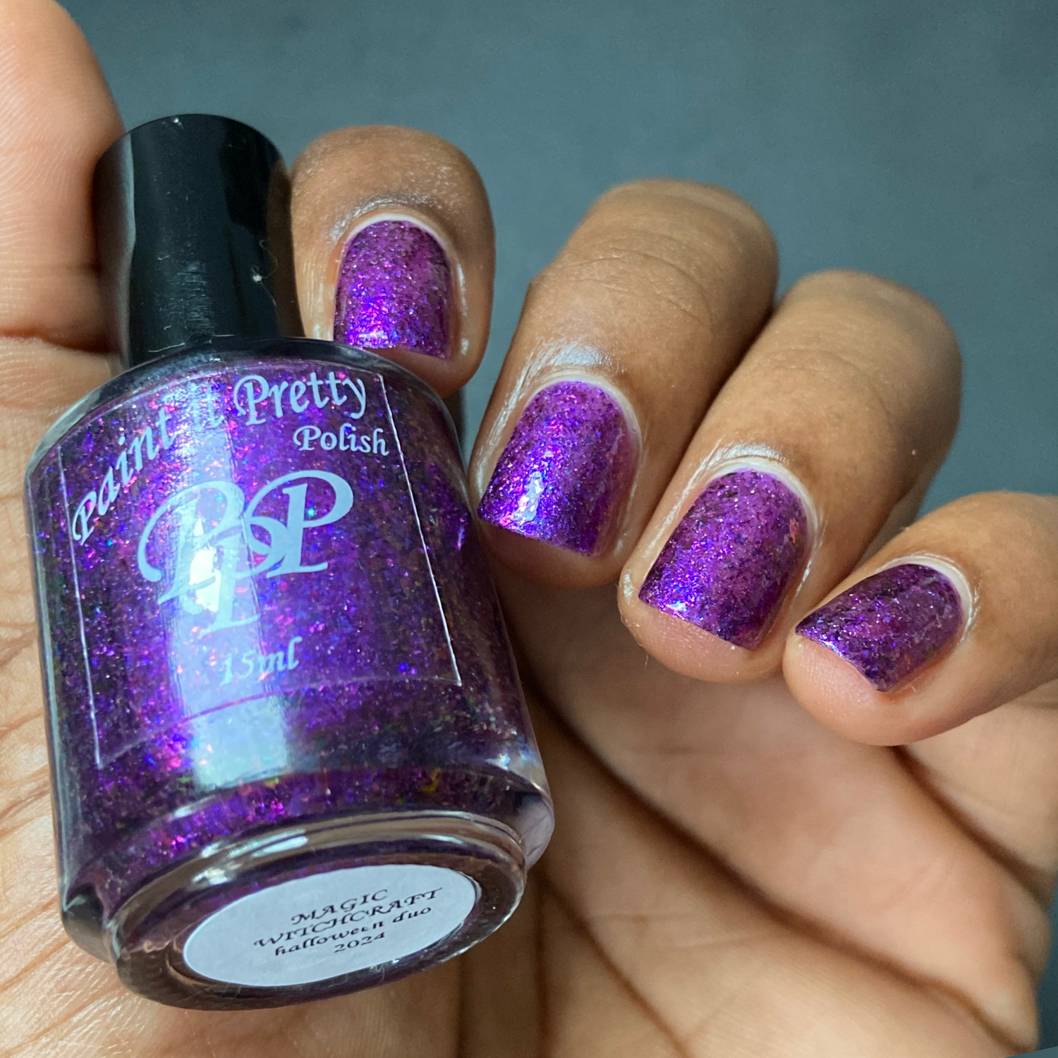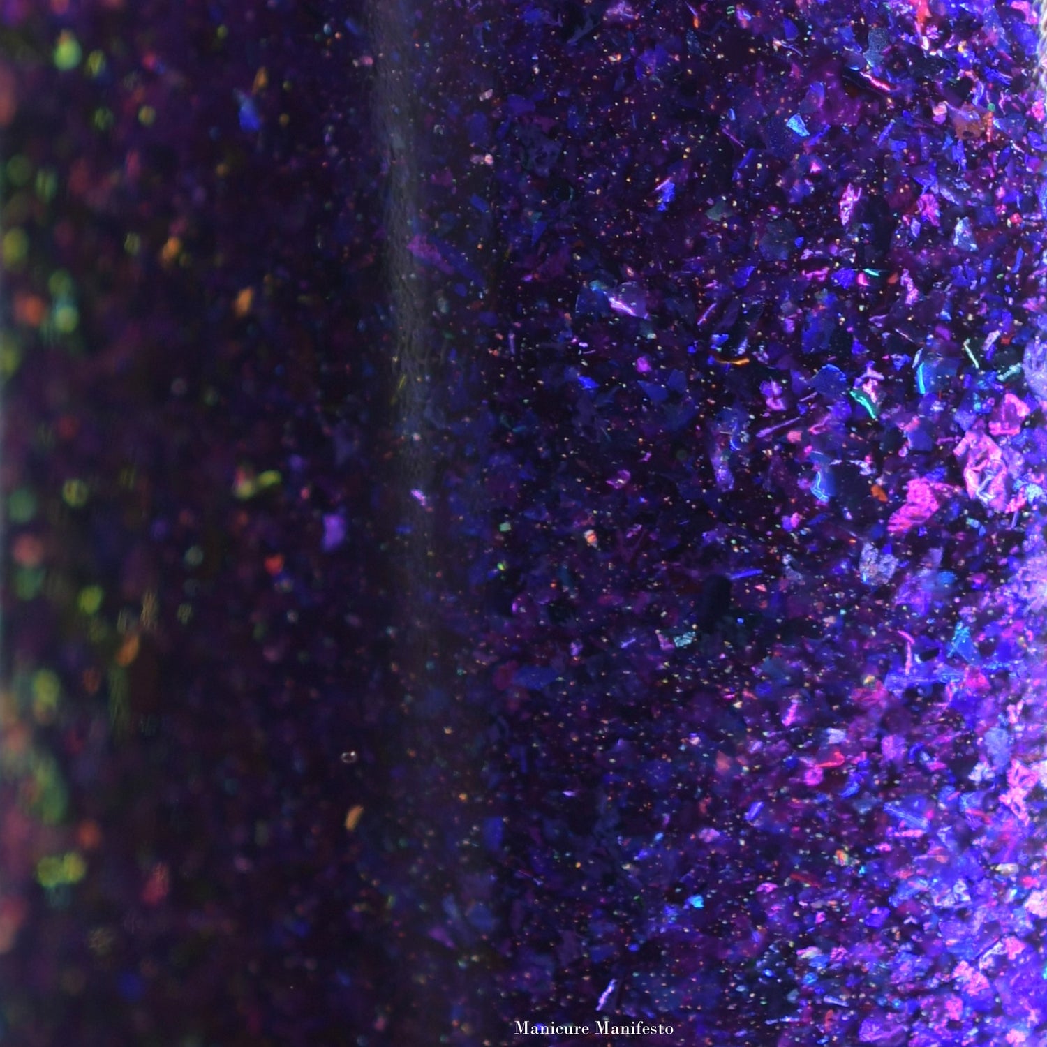 magic witchcraft has a purple base with pink/blue/purple irridescent flakes and purple/blue chameleon flakes.