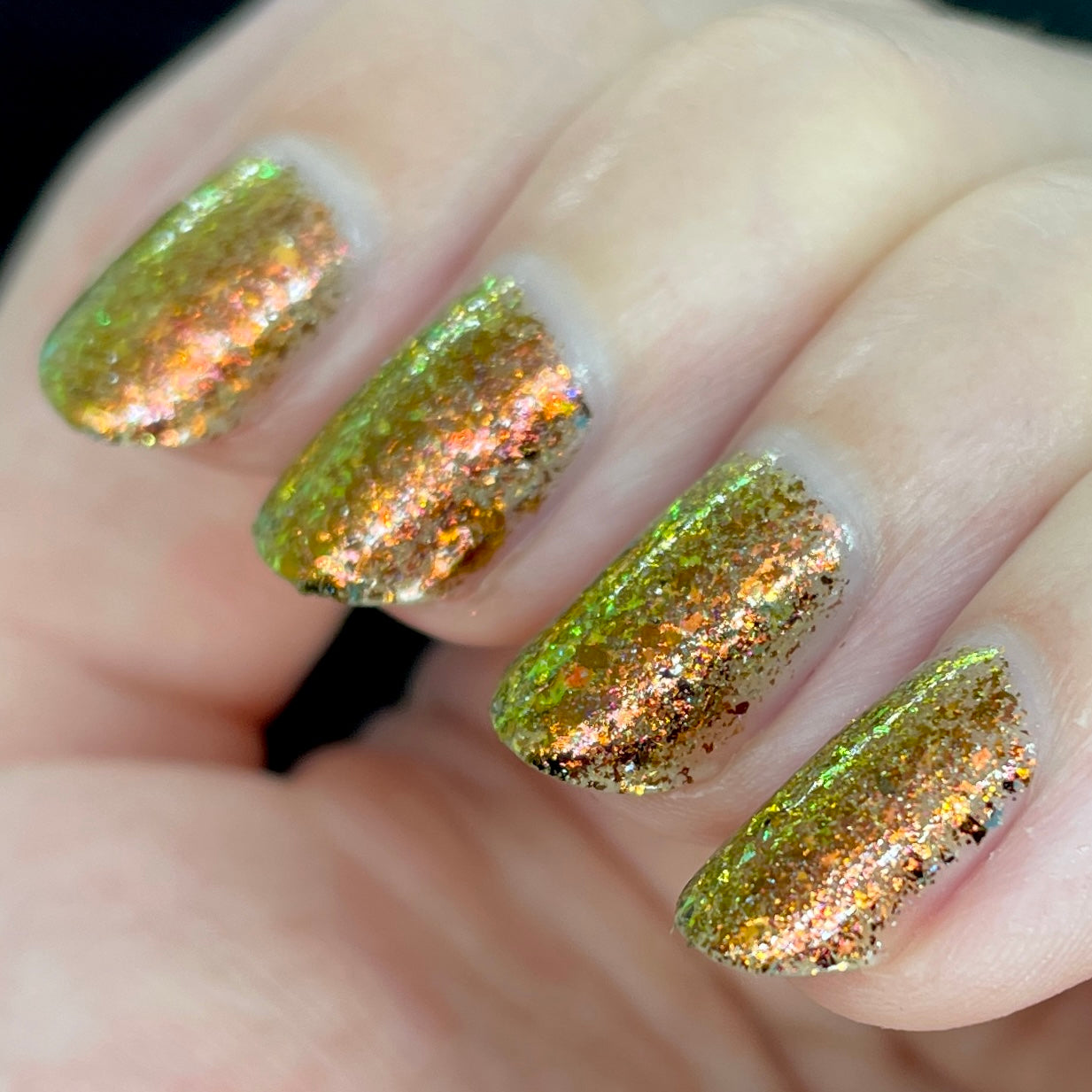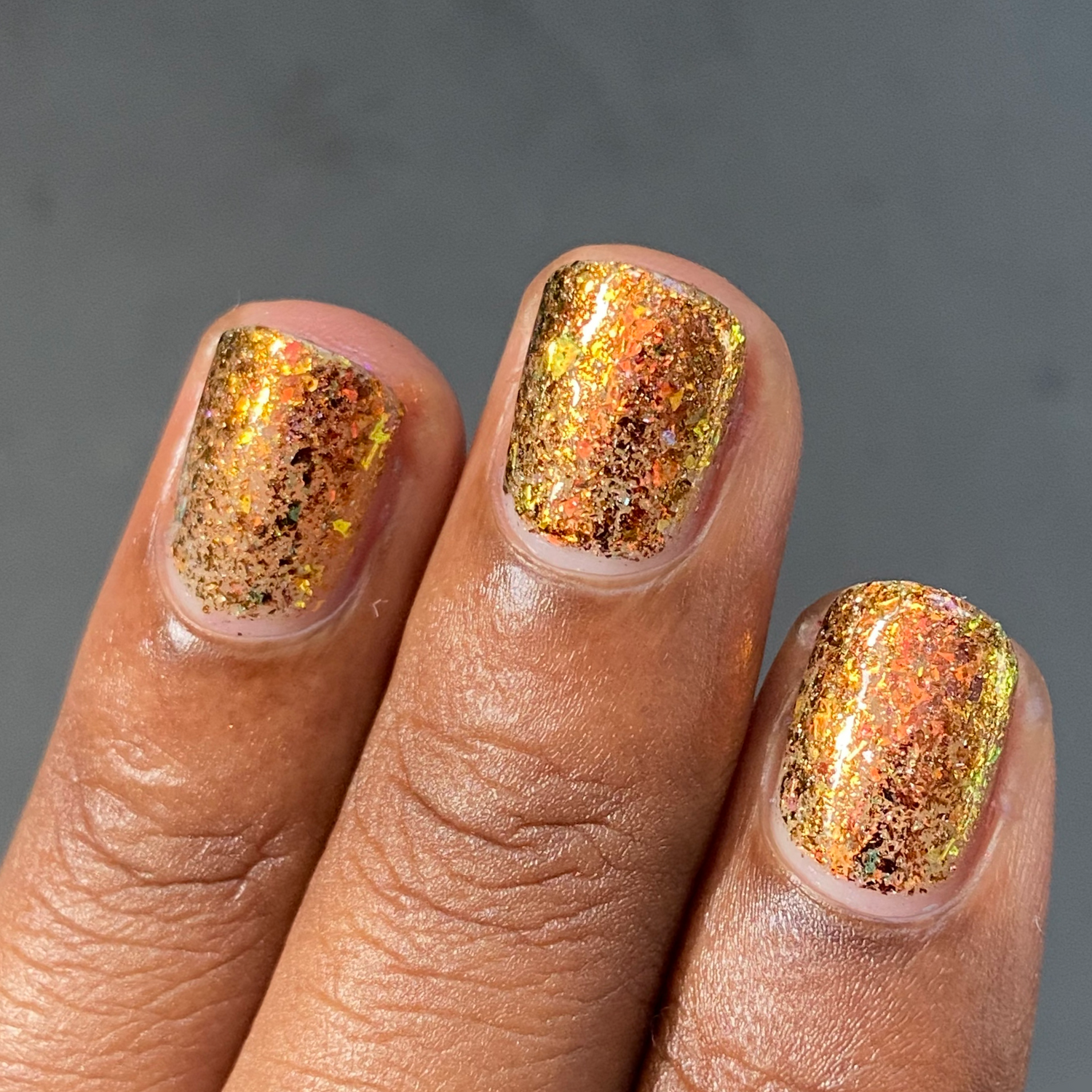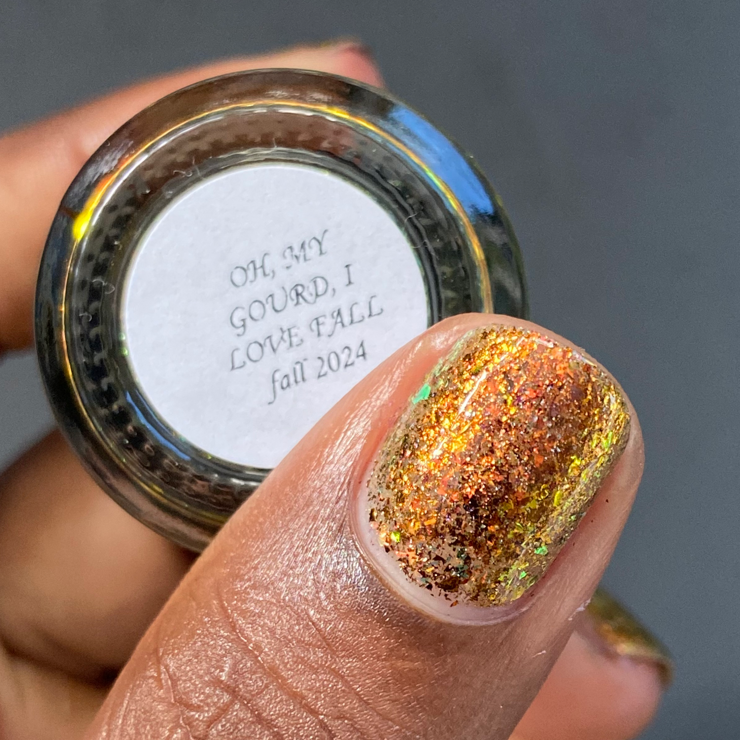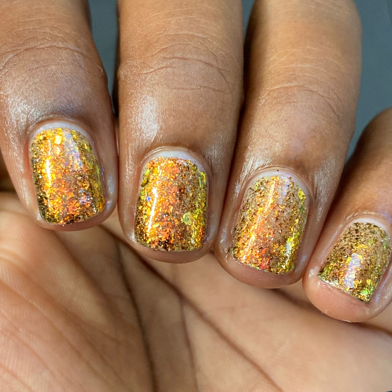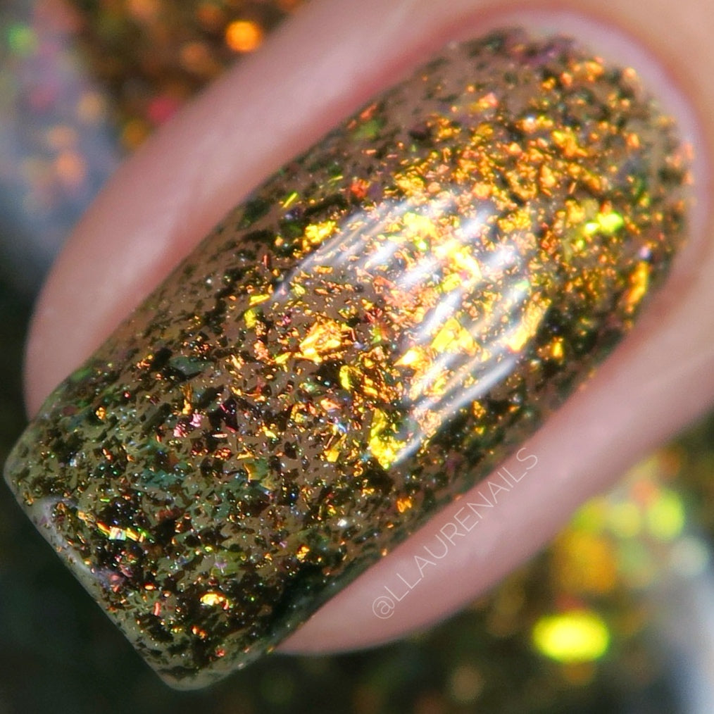 Oh My Gourd is a sheer yellow jelly polish with orange yellow green irridescent flakes, bronze/gold chameleon flakes, and a touch of tiny holographic flakes.