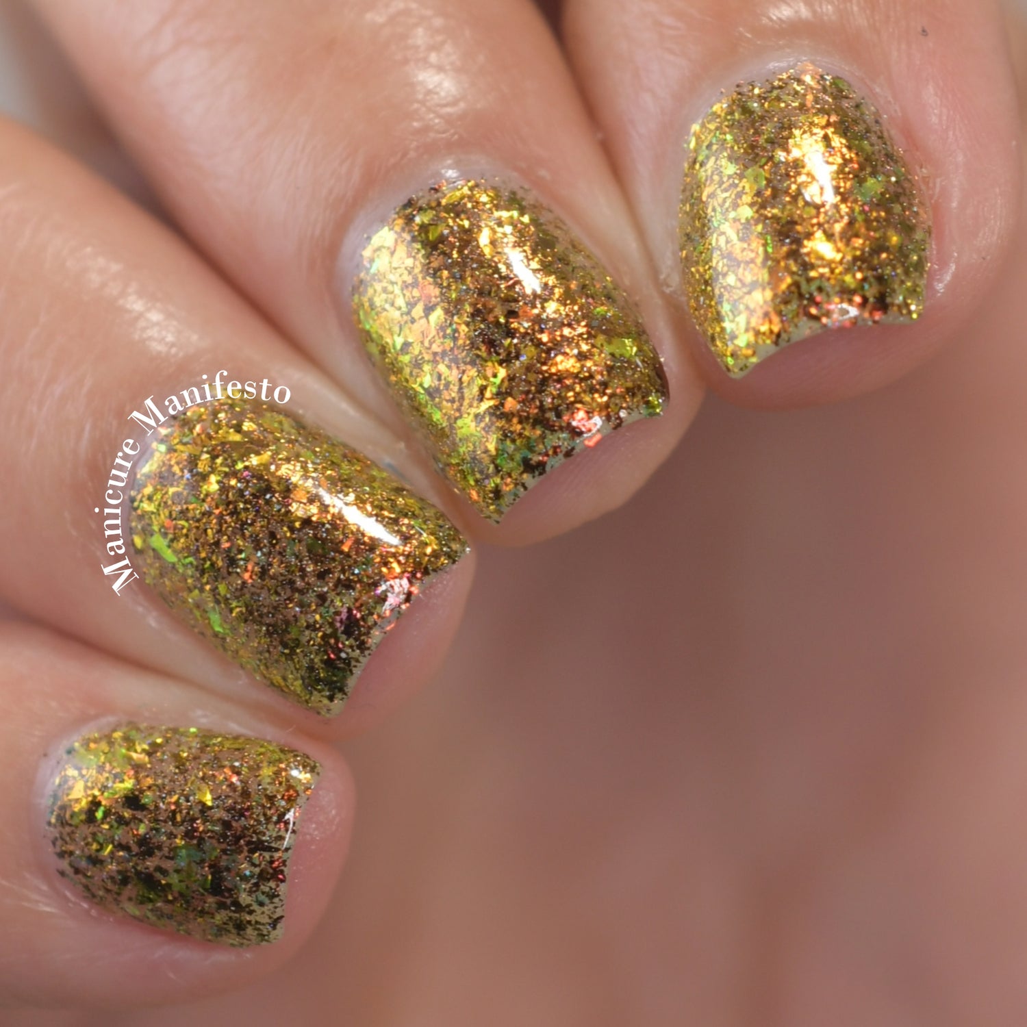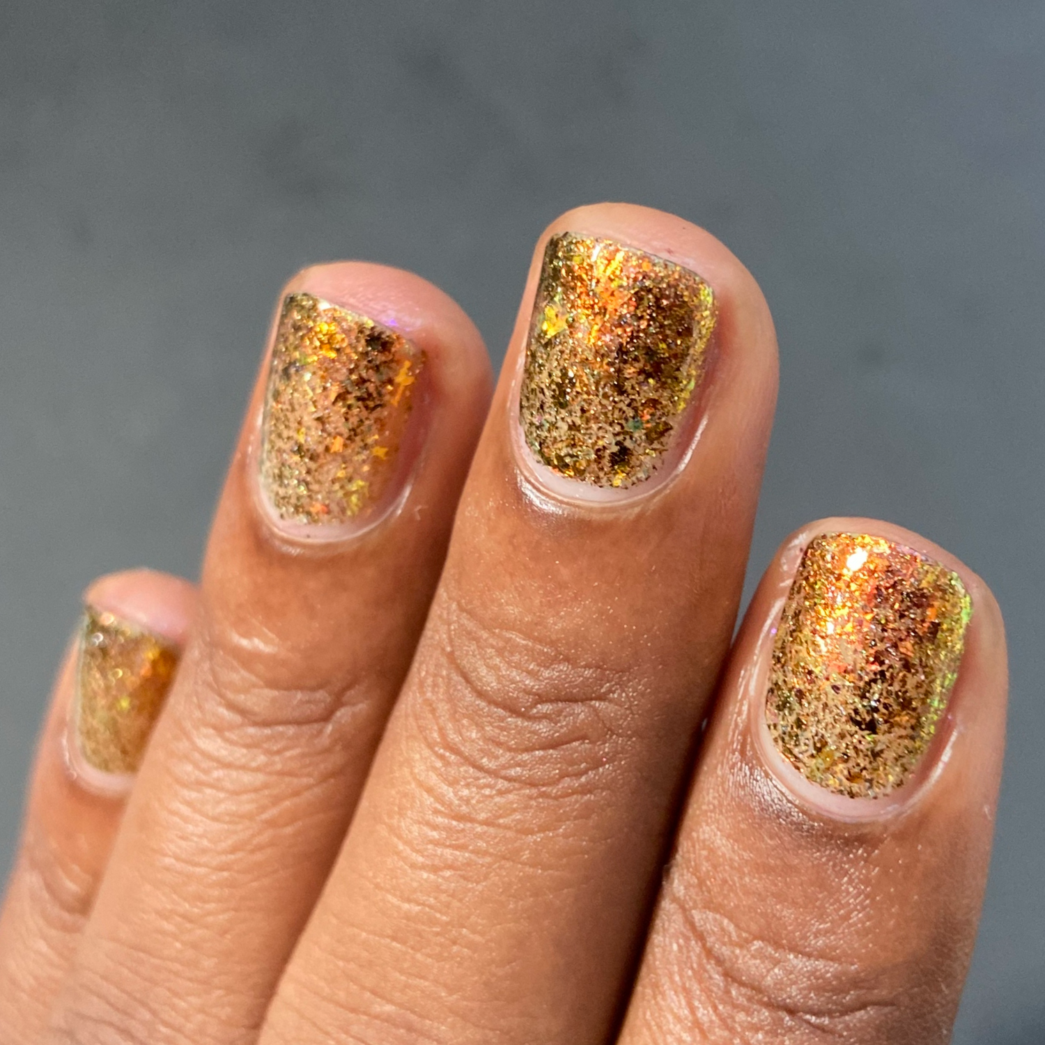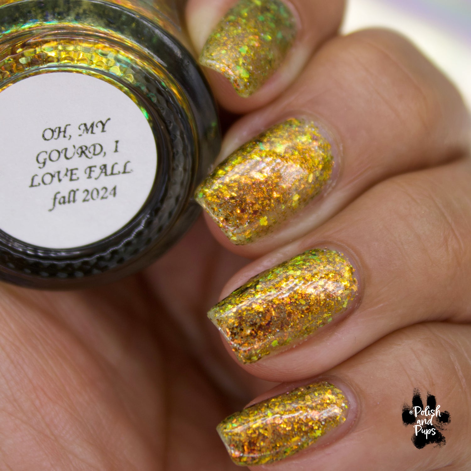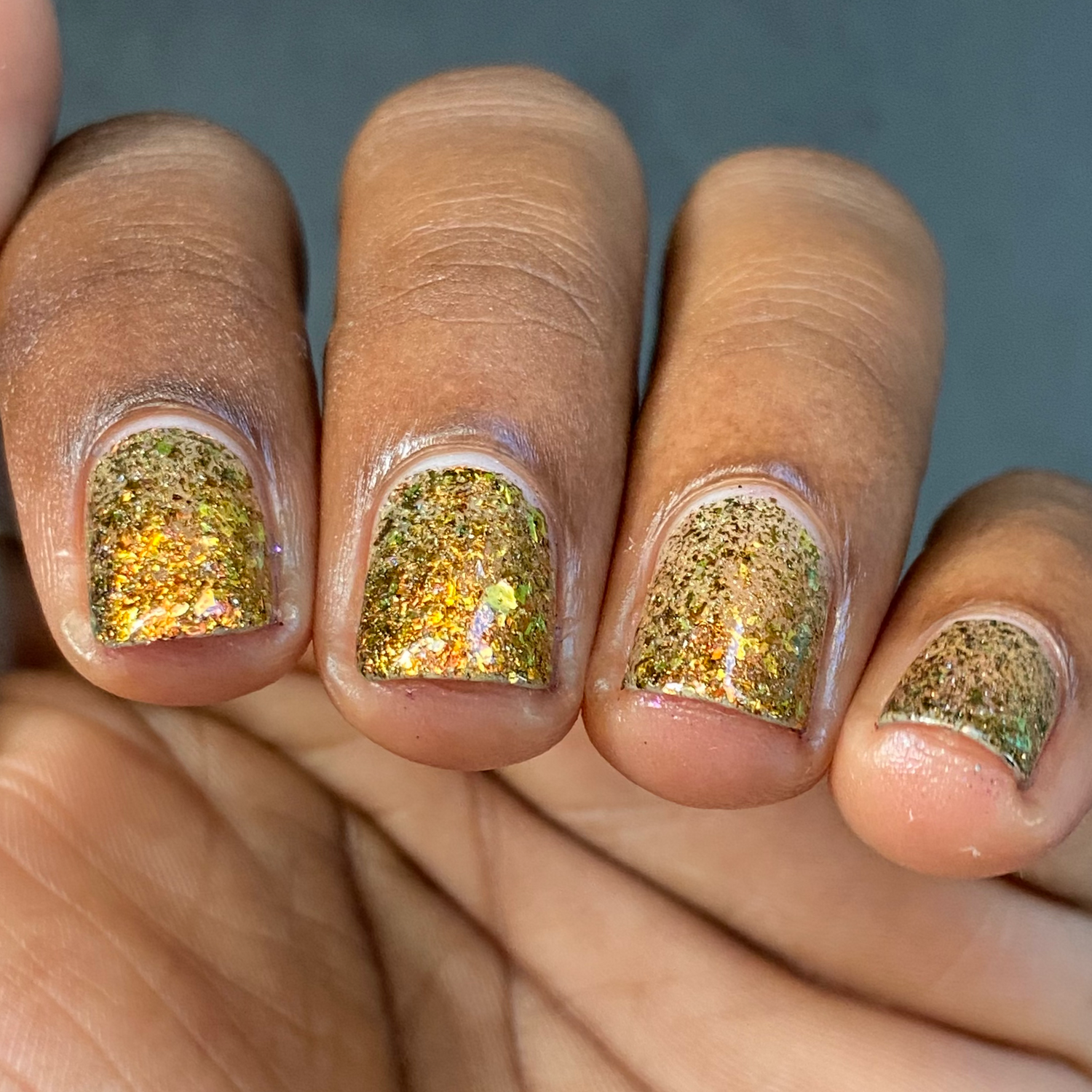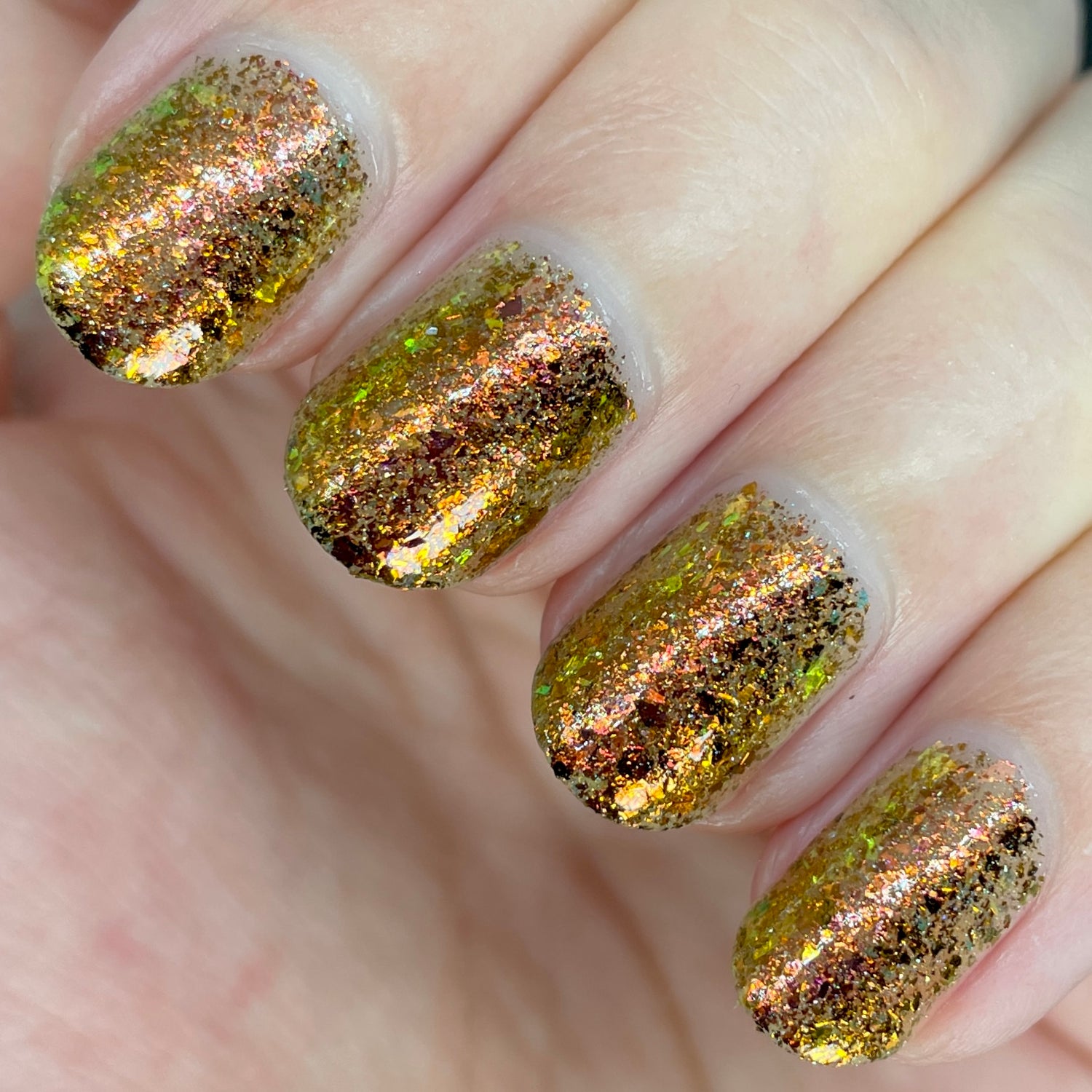 Oh My Gourd is a sheer yellow jelly polish with orange yellow green irridescent flakes, bronze/gold chameleon flakes, and a touch of tiny holographic flakes.