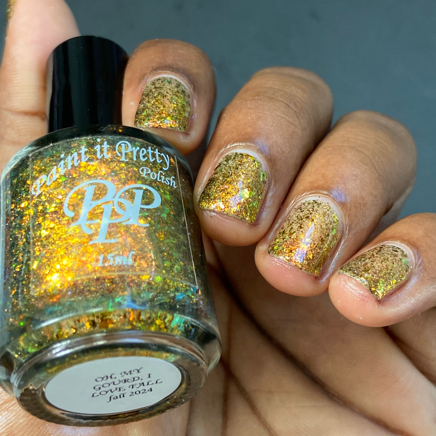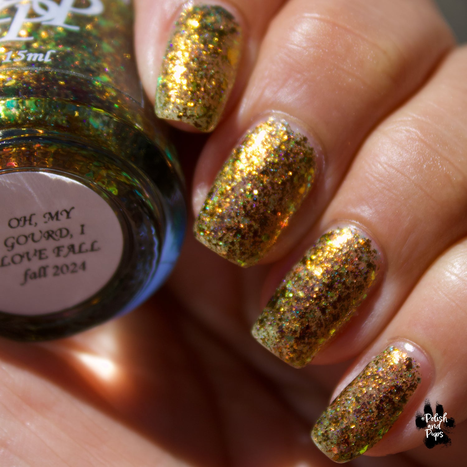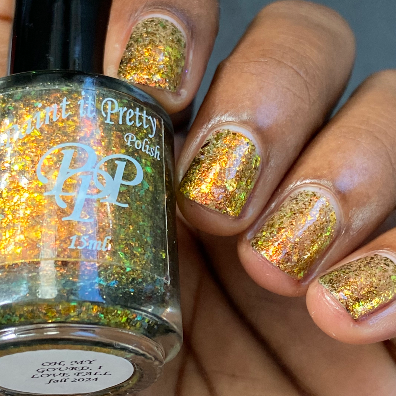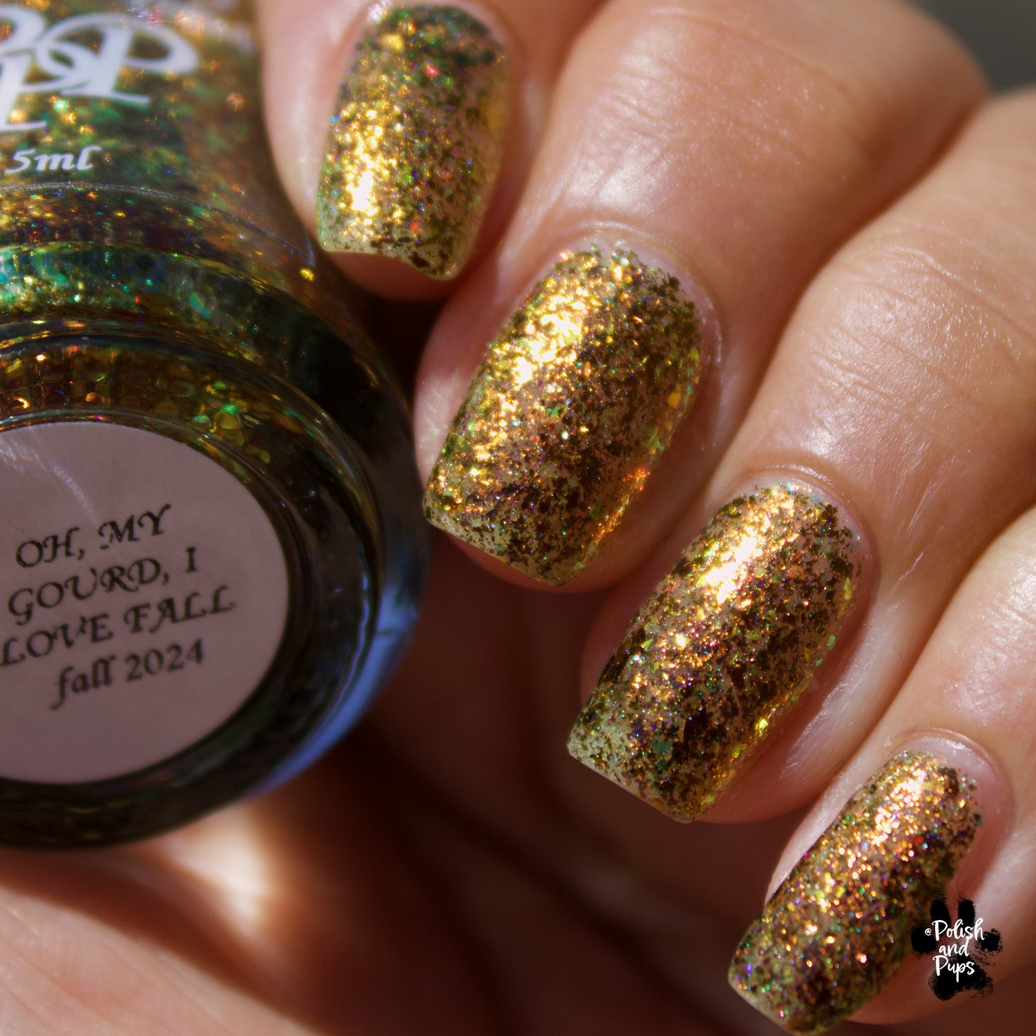 Oh My Gourd is a sheer yellow jelly polish with orange yellow green irridescent flakes, bronze/gold chameleon flakes, and a touch of tiny holographic flakes.