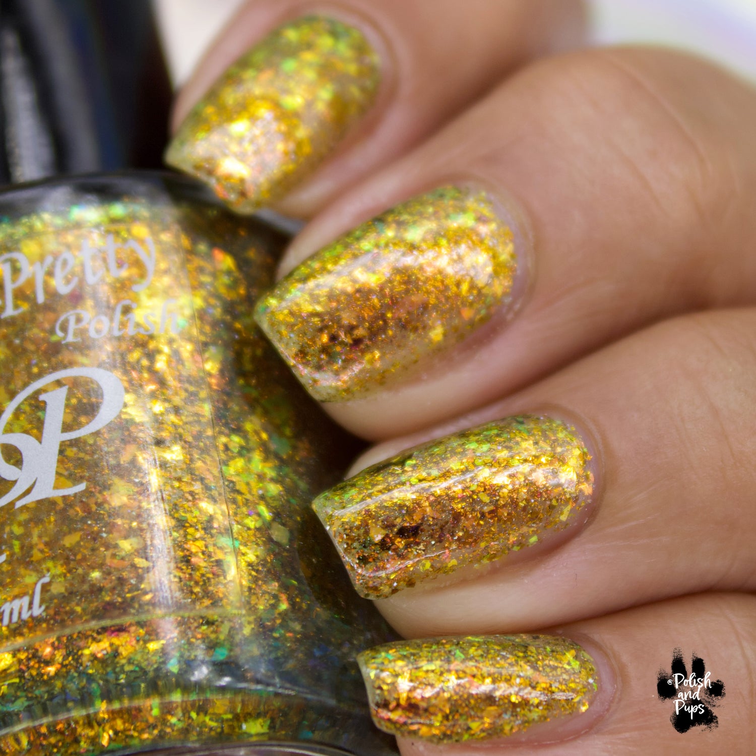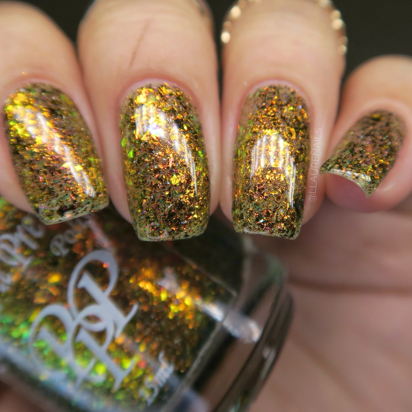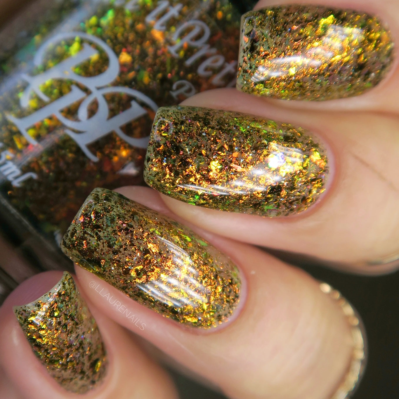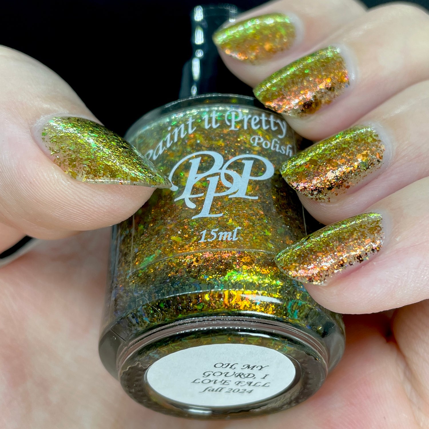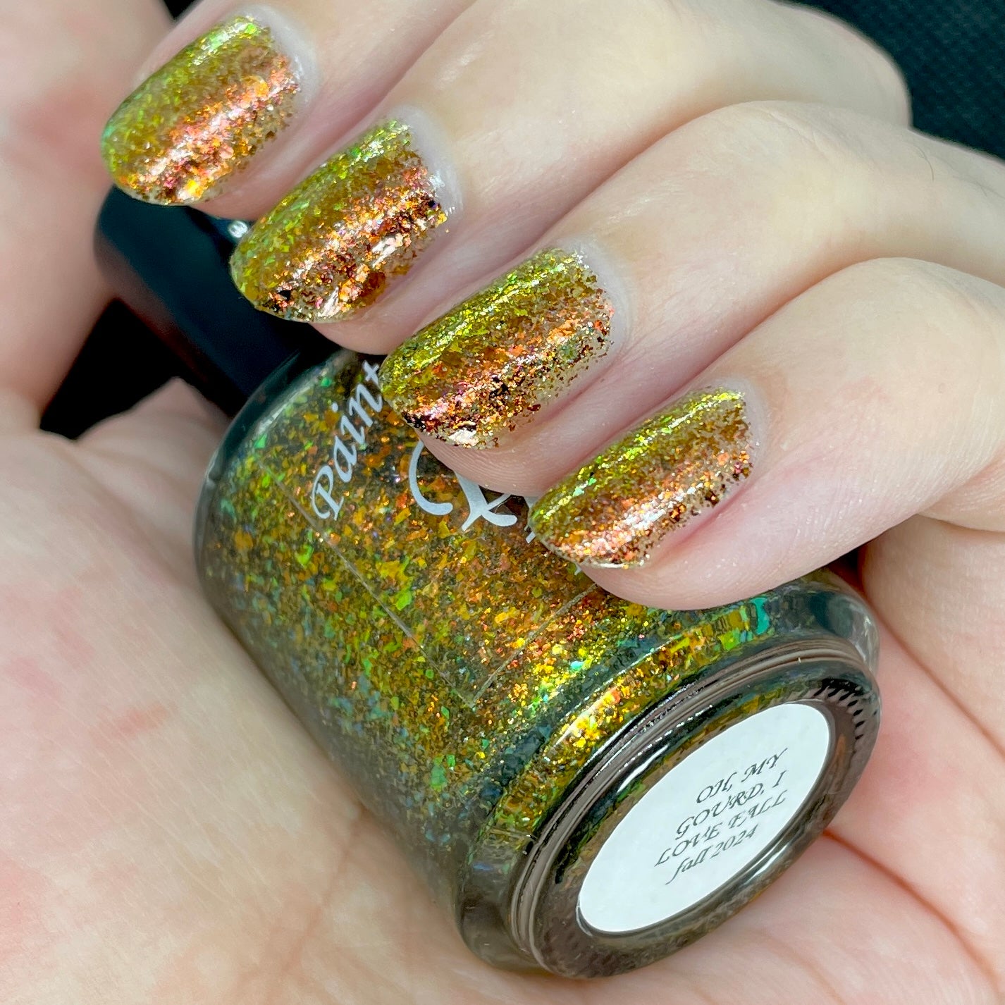 Oh My Gourd is a sheer yellow jelly polish with orange yellow green irridescent flakes, bronze/gold chameleon flakes, and a touch of tiny holographic flakes.