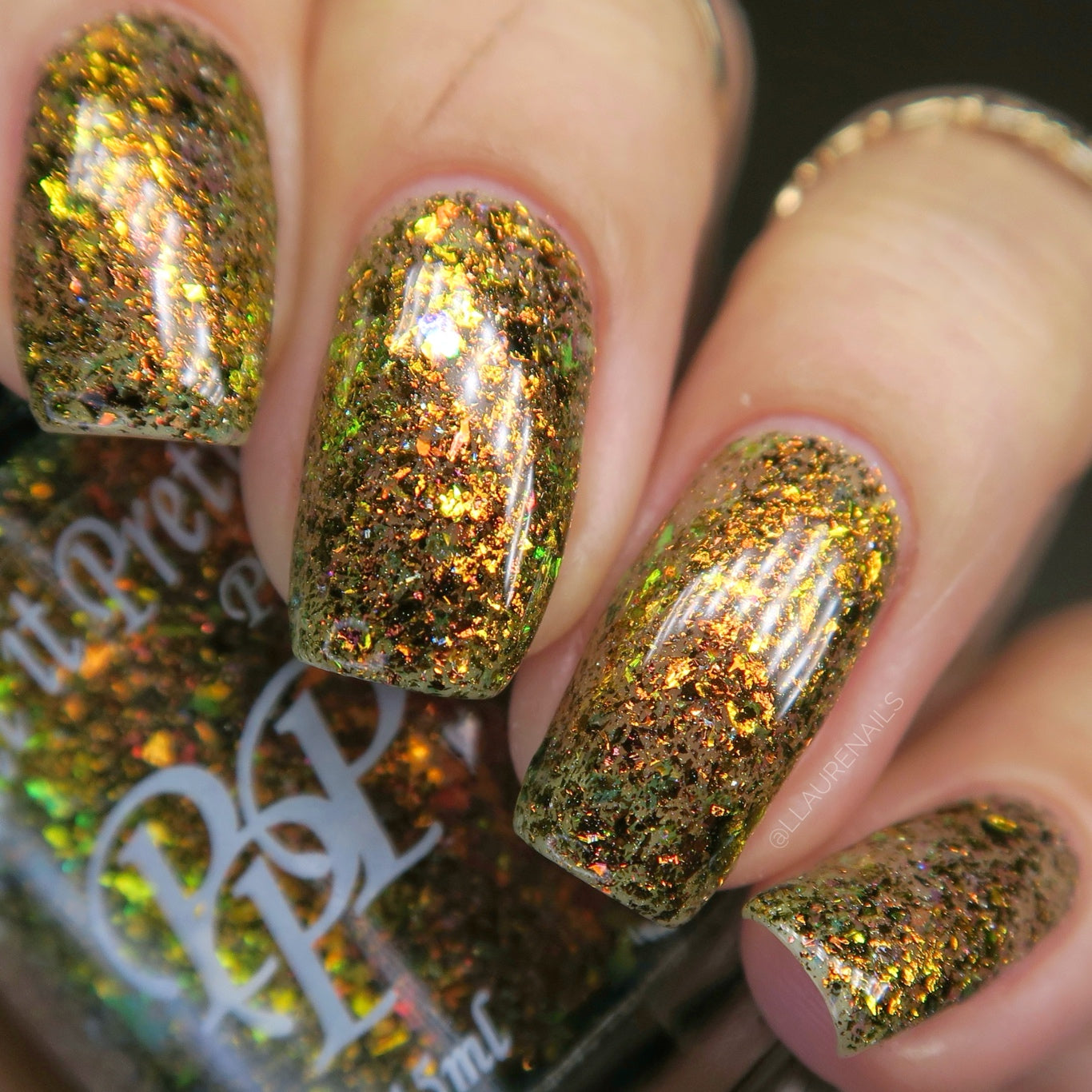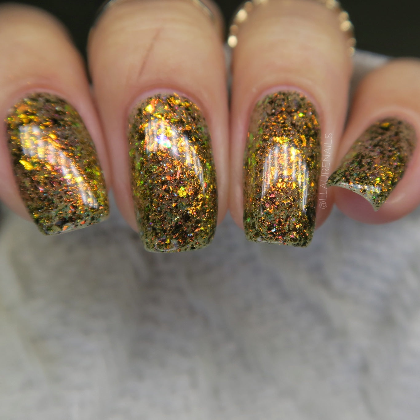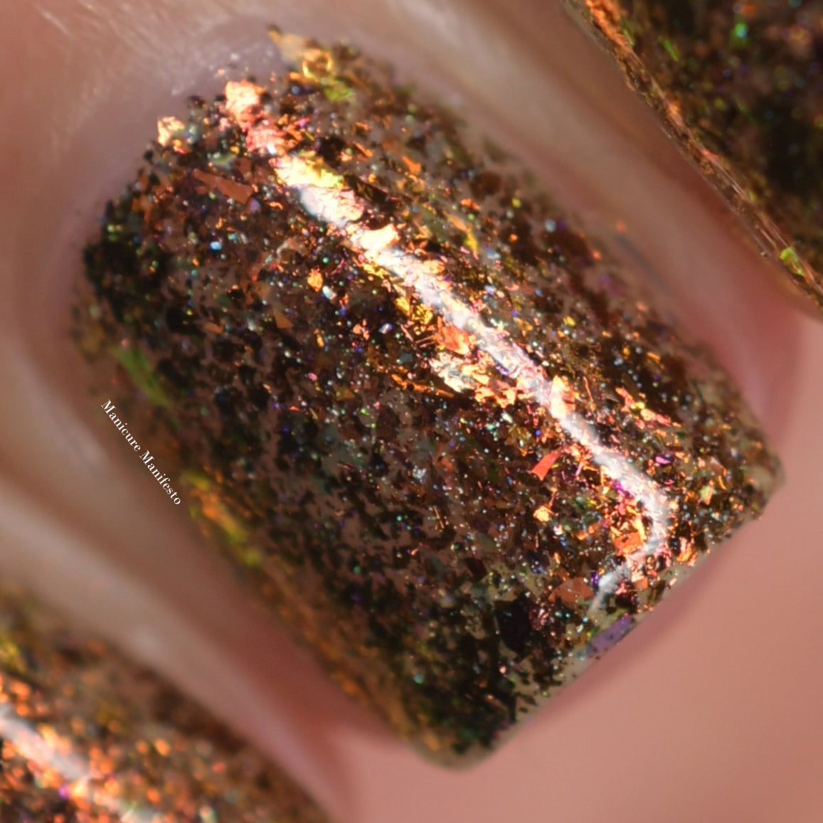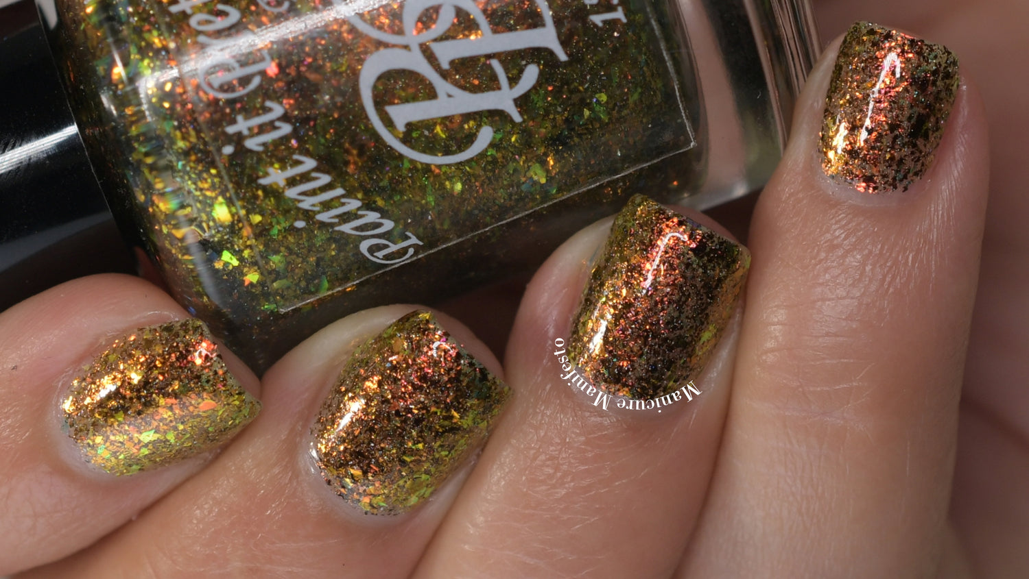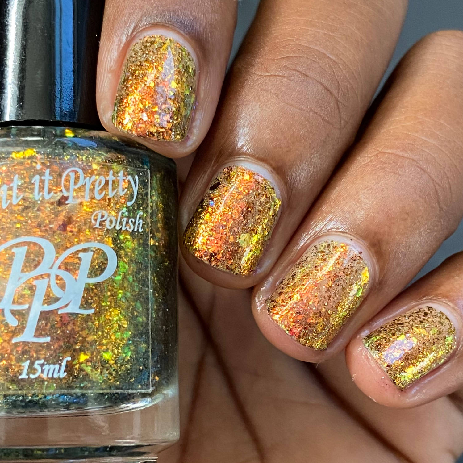 Oh My Gourd is a sheer yellow jelly polish with orange yellow green irridescent flakes, bronze/gold chameleon flakes, and a touch of tiny holographic flakes.