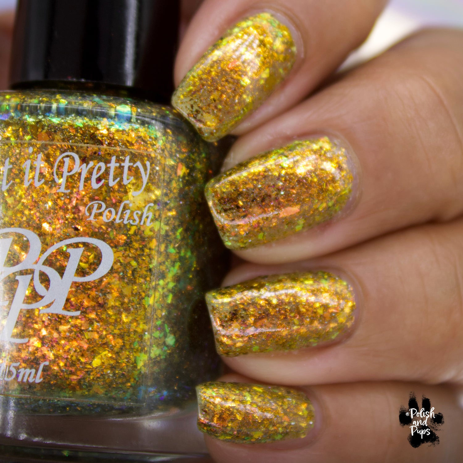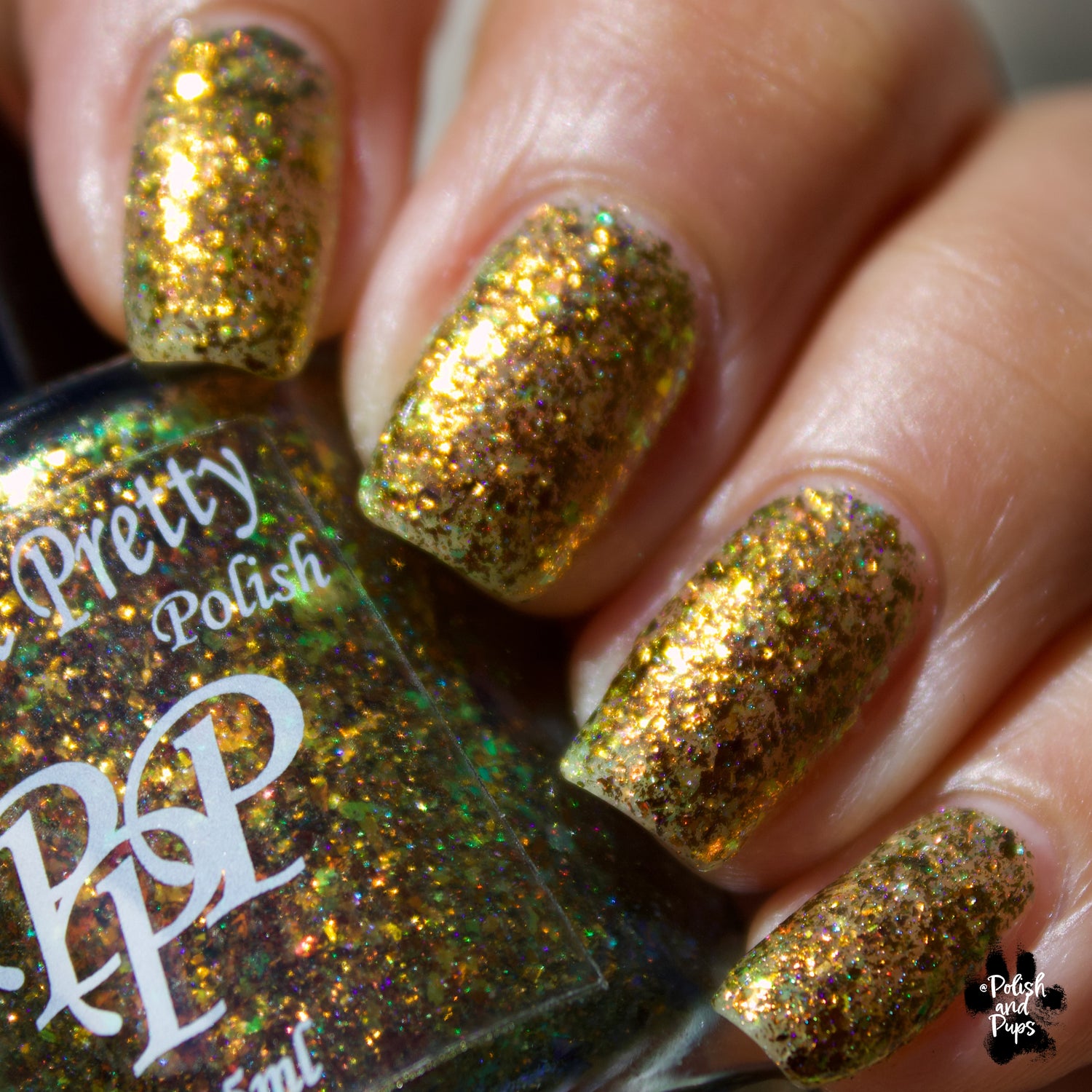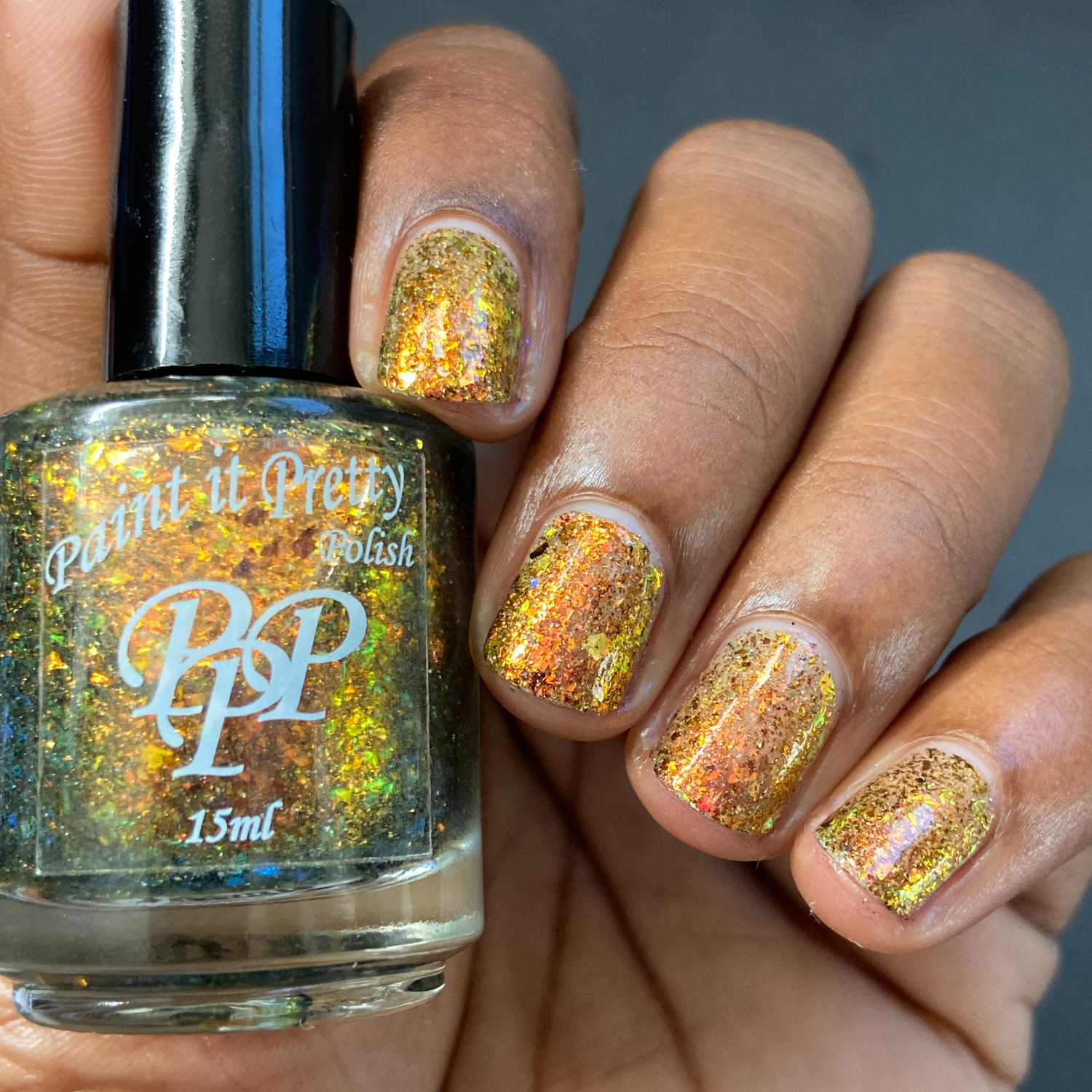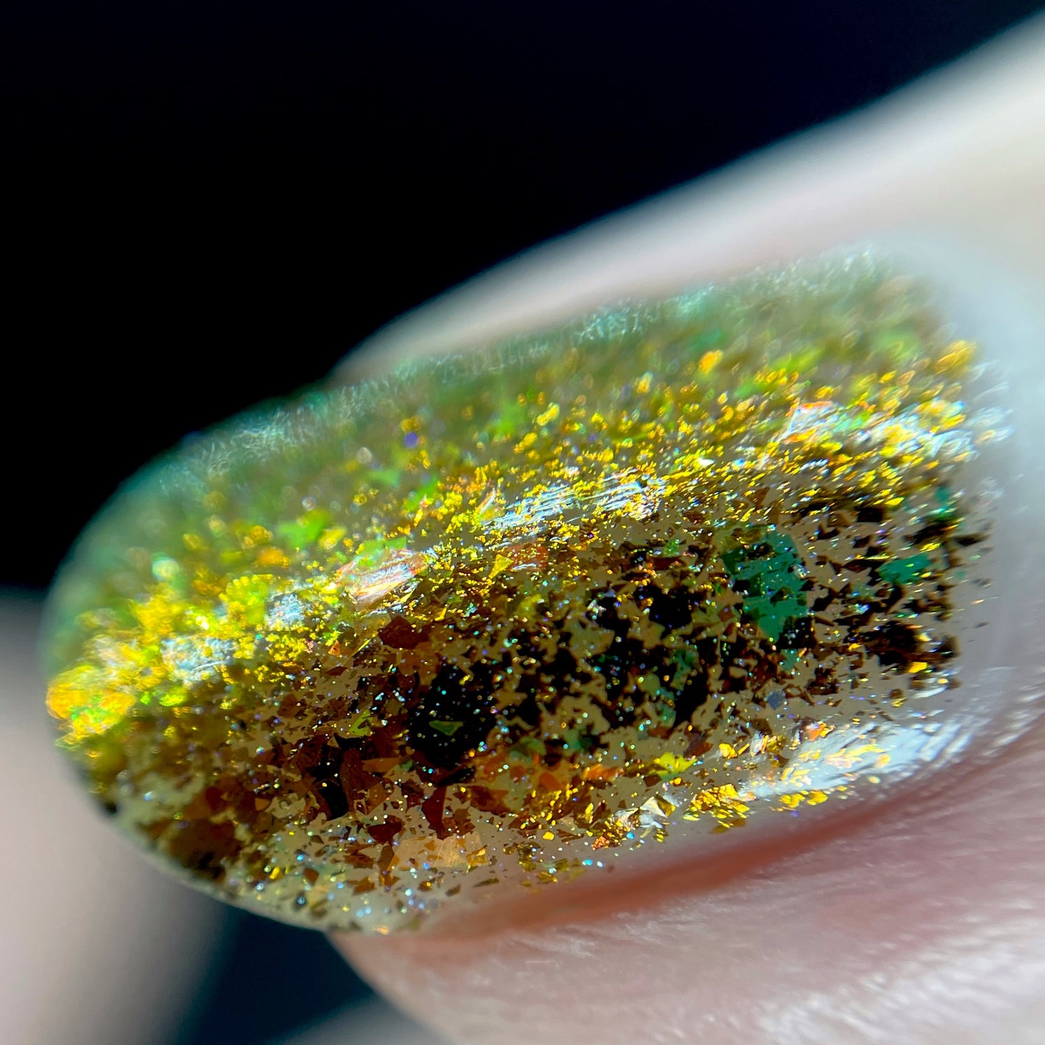 Oh My Gourd is a sheer yellow jelly polish with orange yellow green irridescent flakes, bronze/gold chameleon flakes, and a touch of tiny holographic flakes.