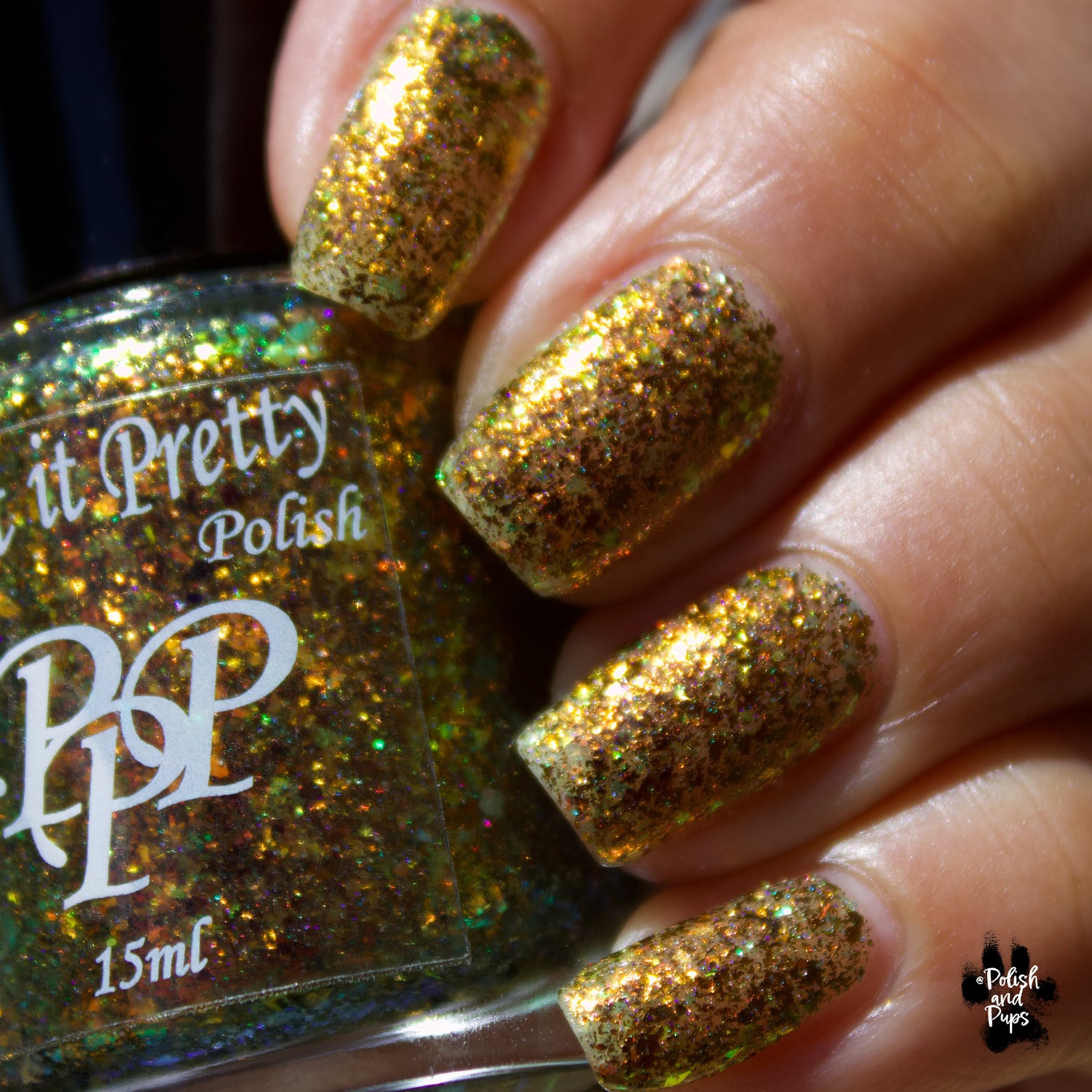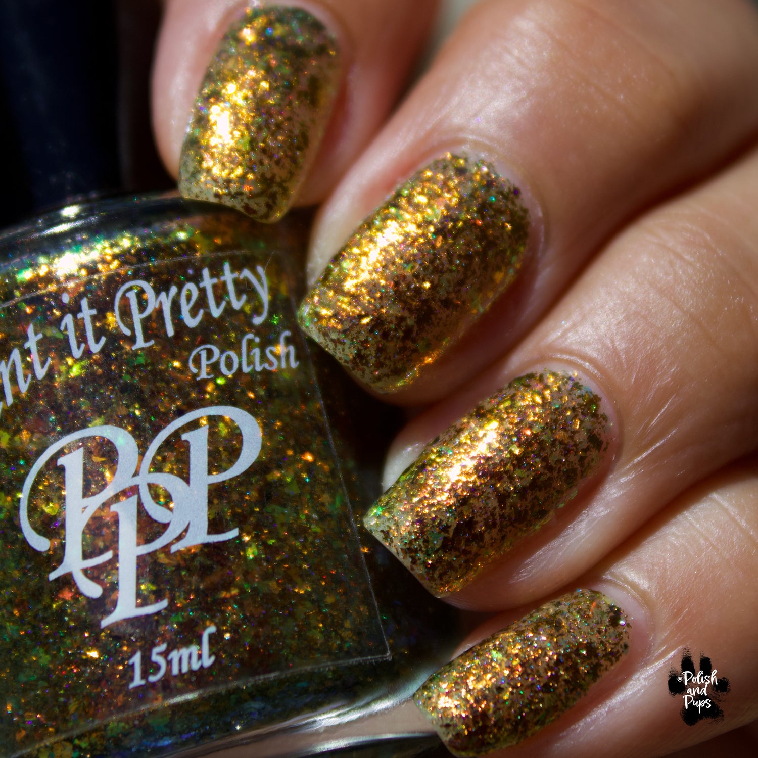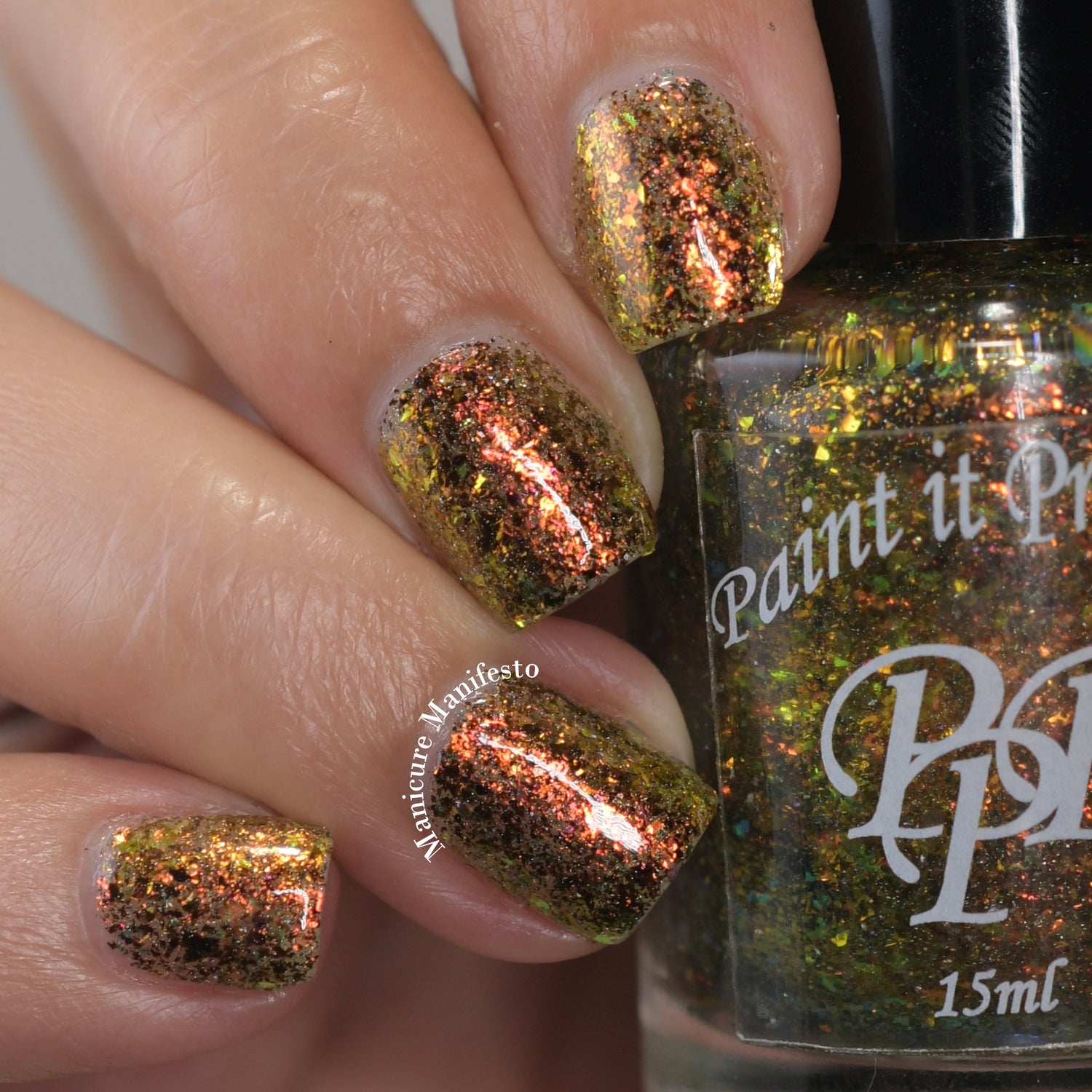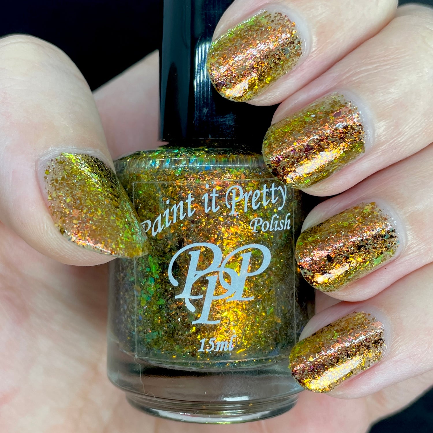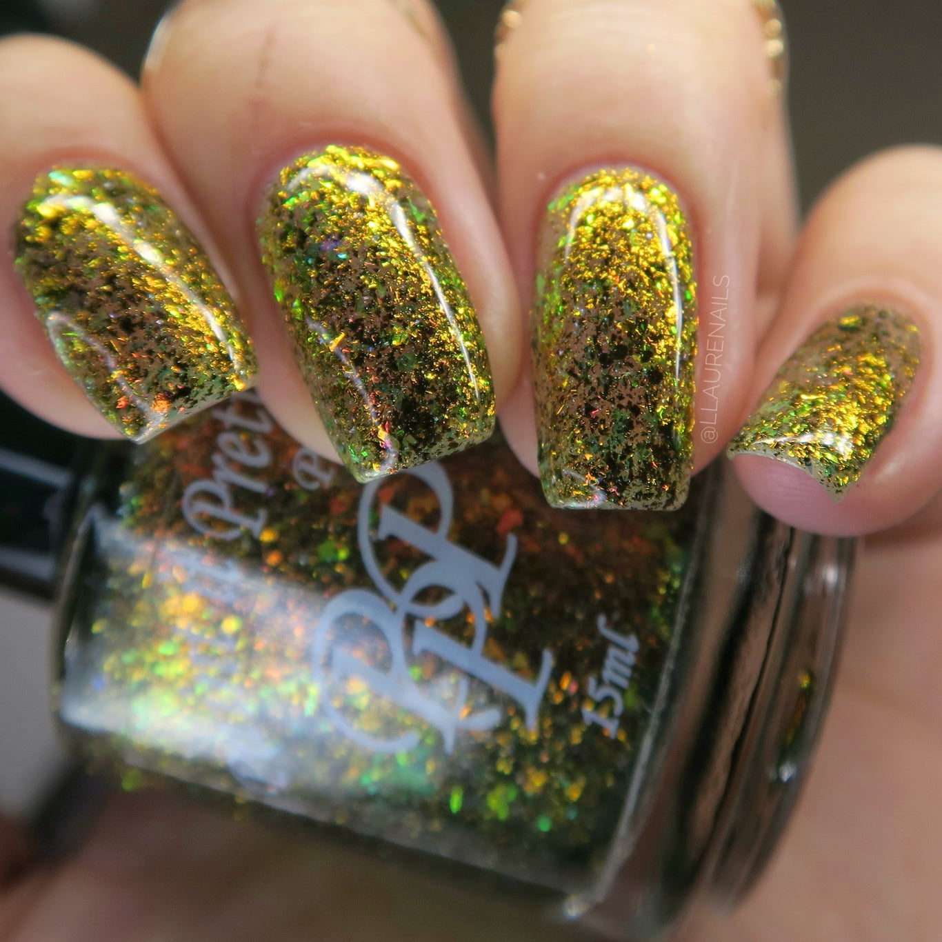 Oh My Gourd is a sheer yellow jelly polish with orange yellow green irridescent flakes, bronze/gold chameleon flakes, and a touch of tiny holographic flakes.