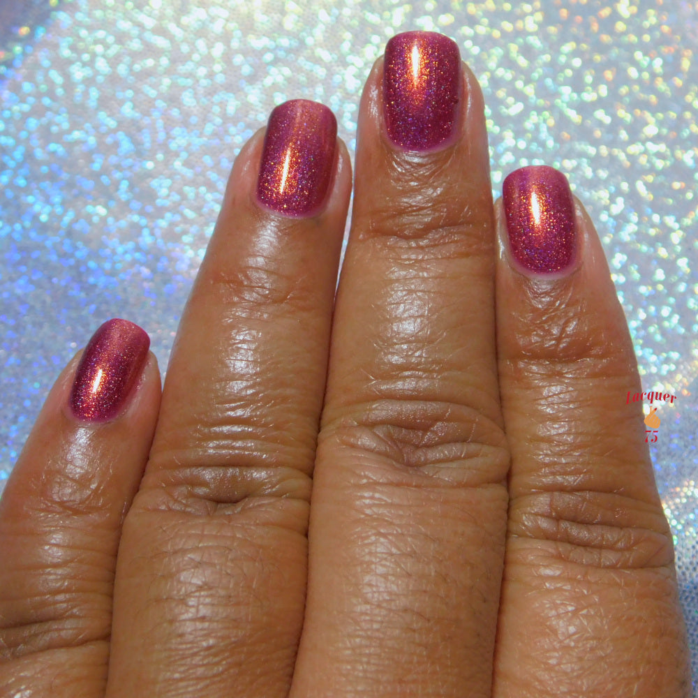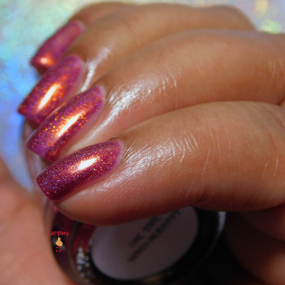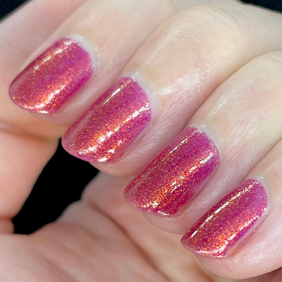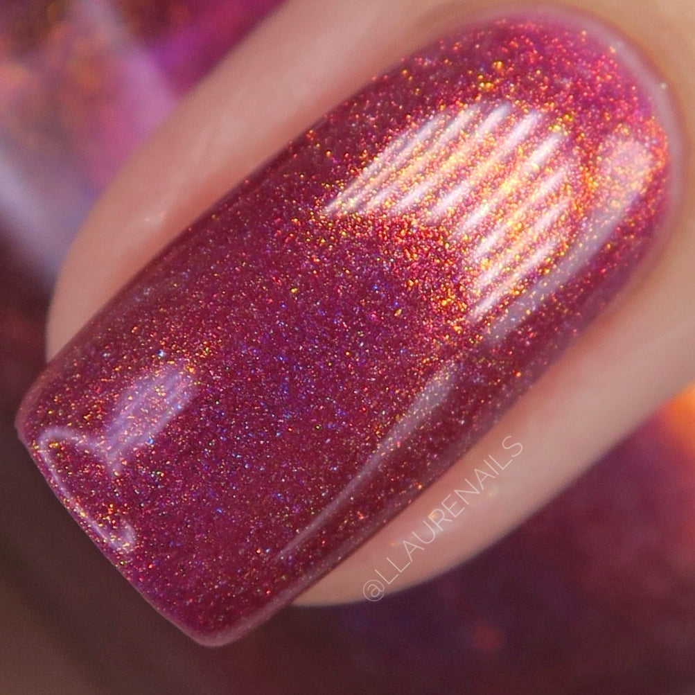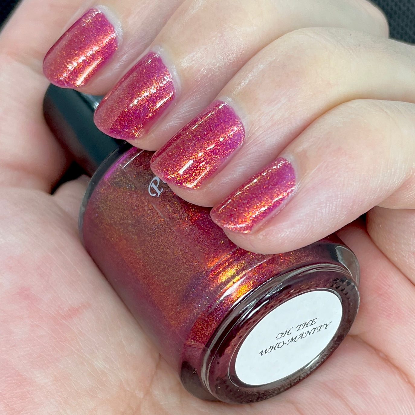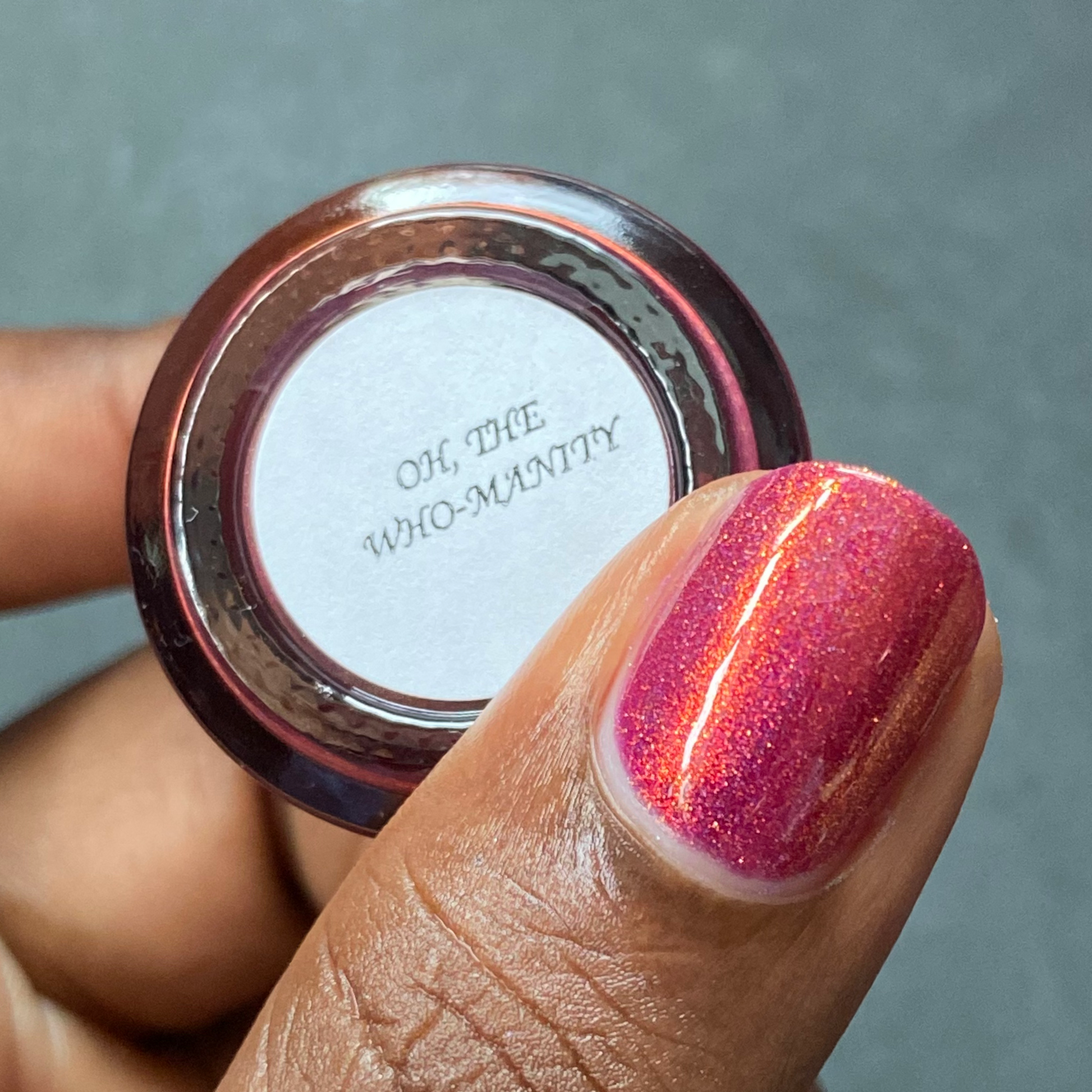 Oh, the Who-manity is a red holographic polish with an orange/golden shimmer