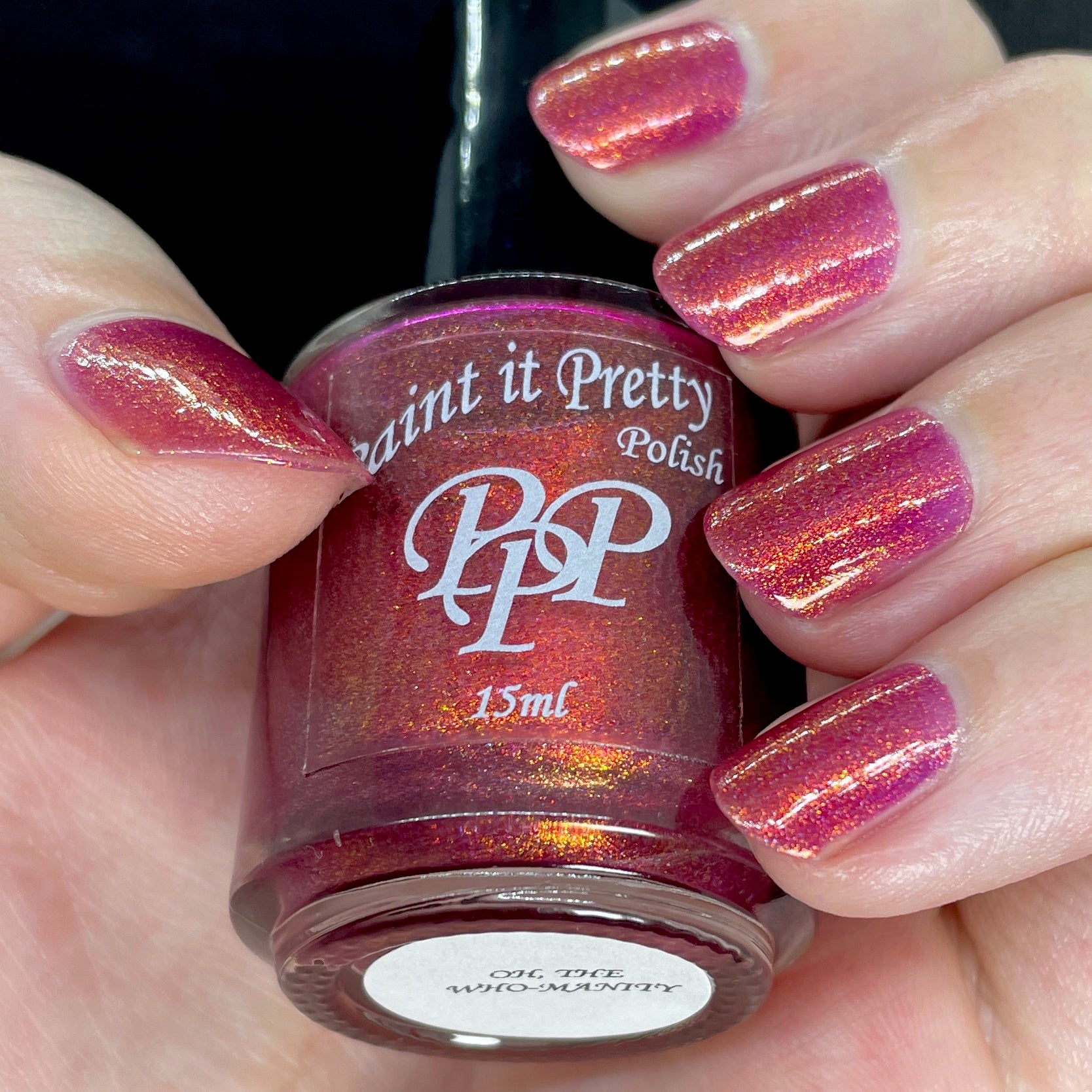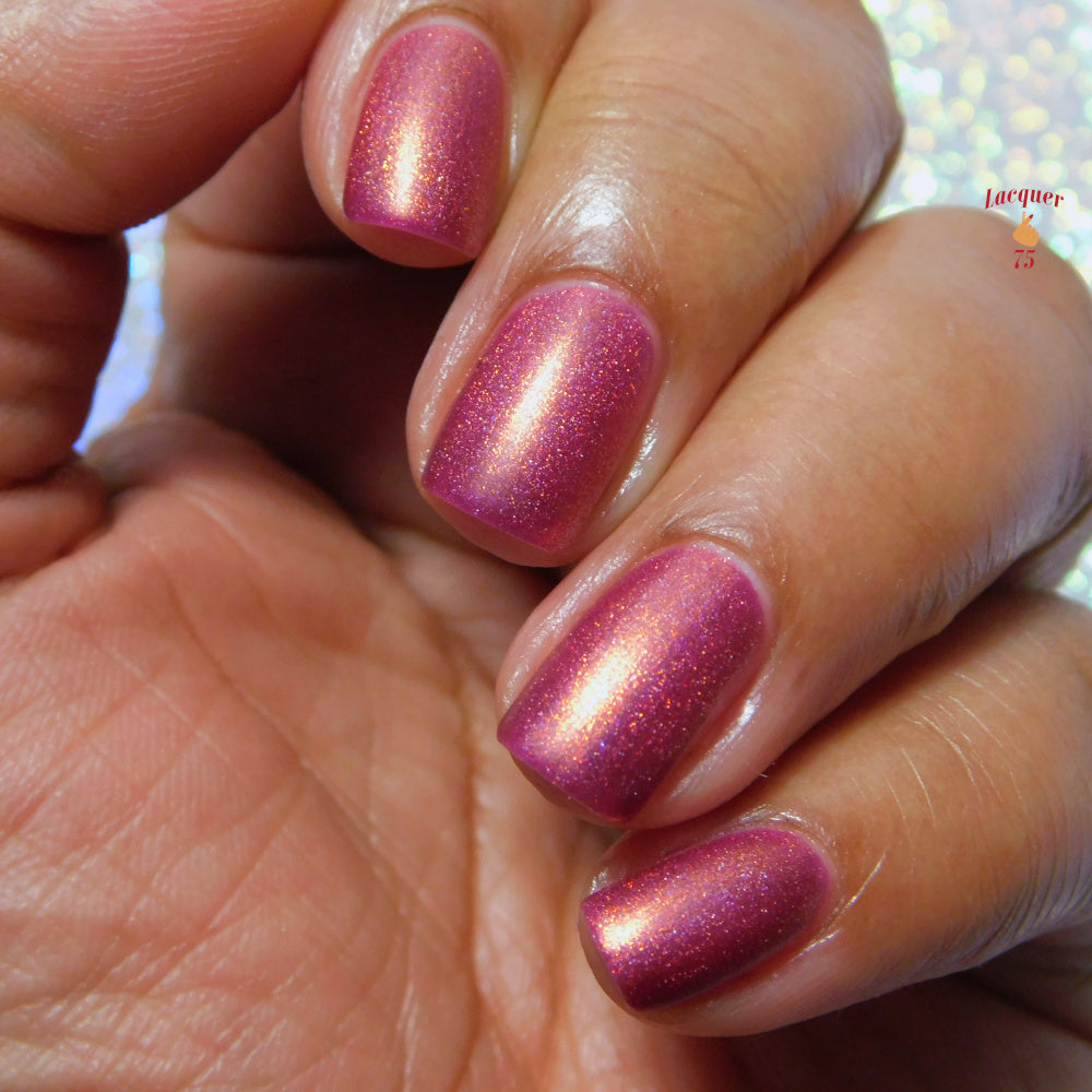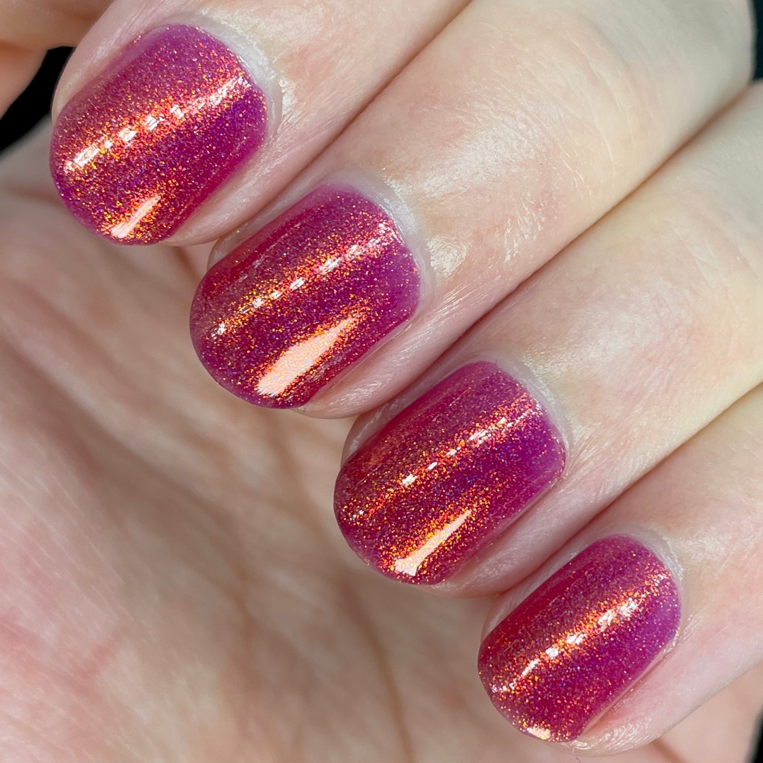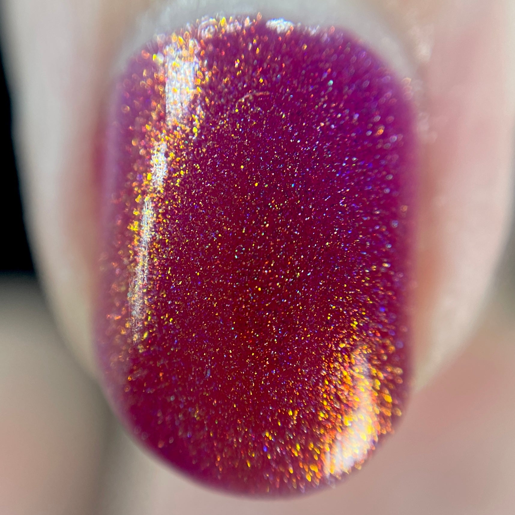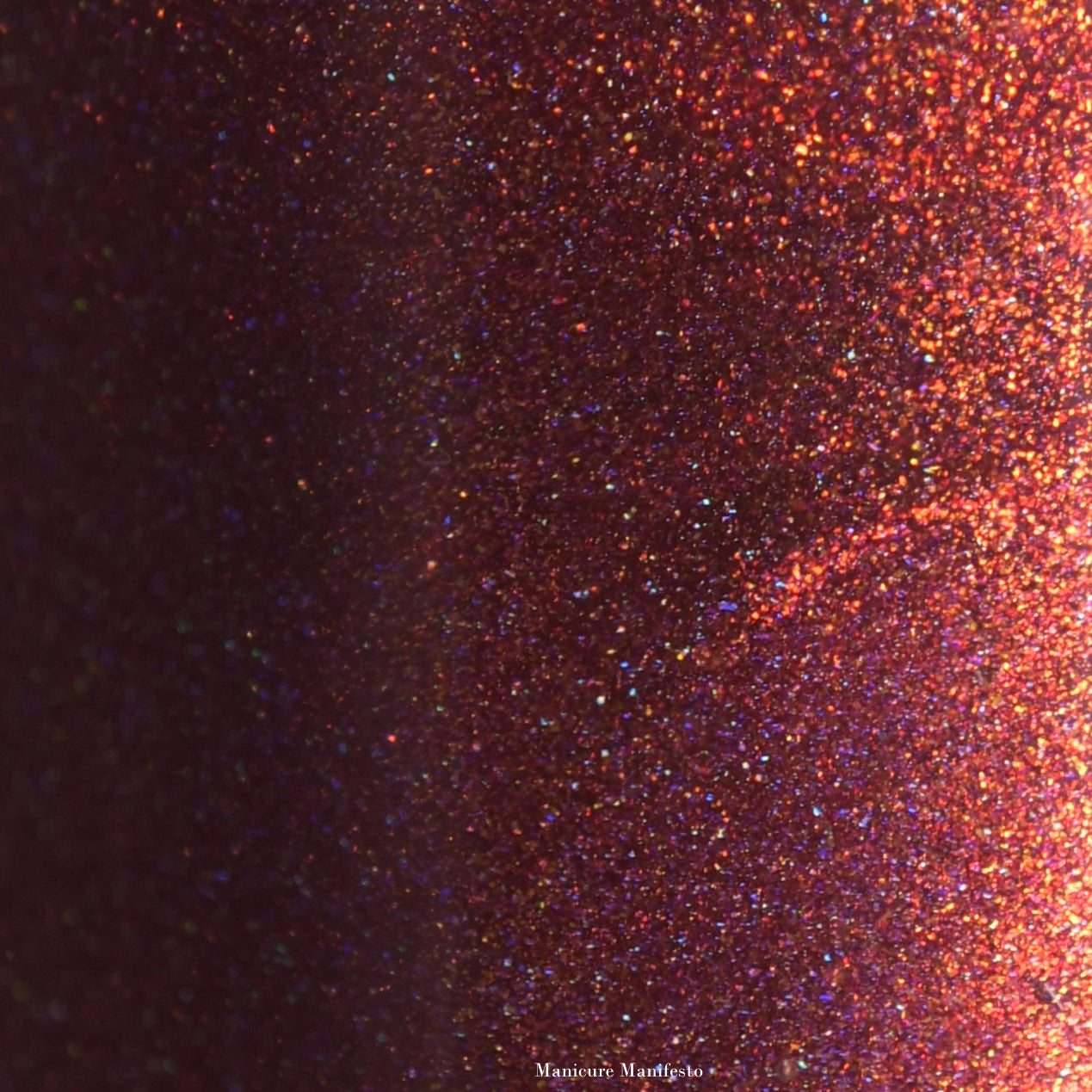 Oh, the Who-manity is a red holographic polish with an orange/golden shimmer