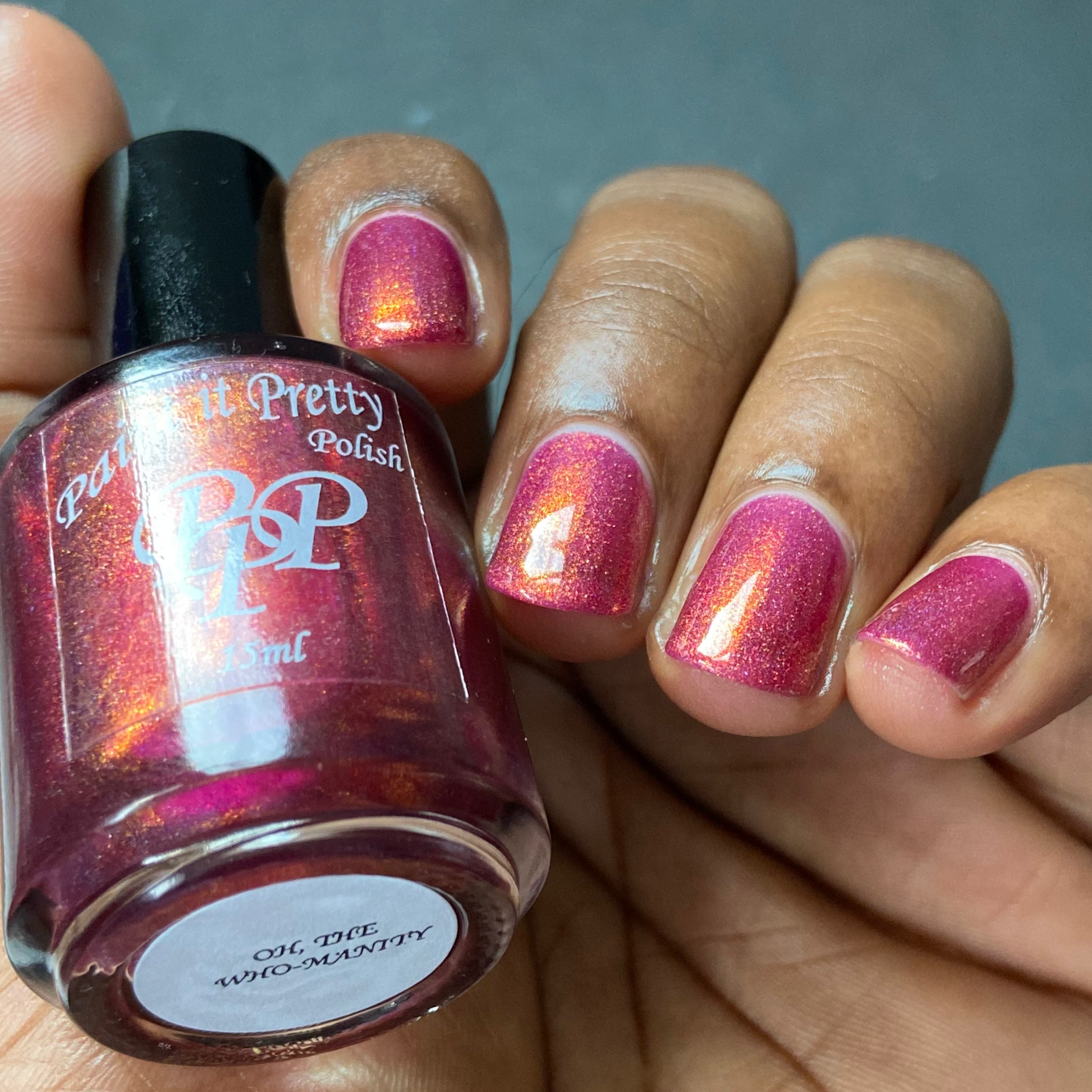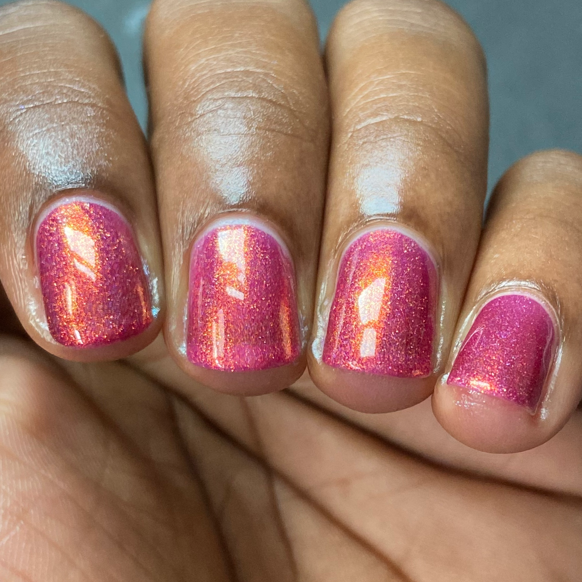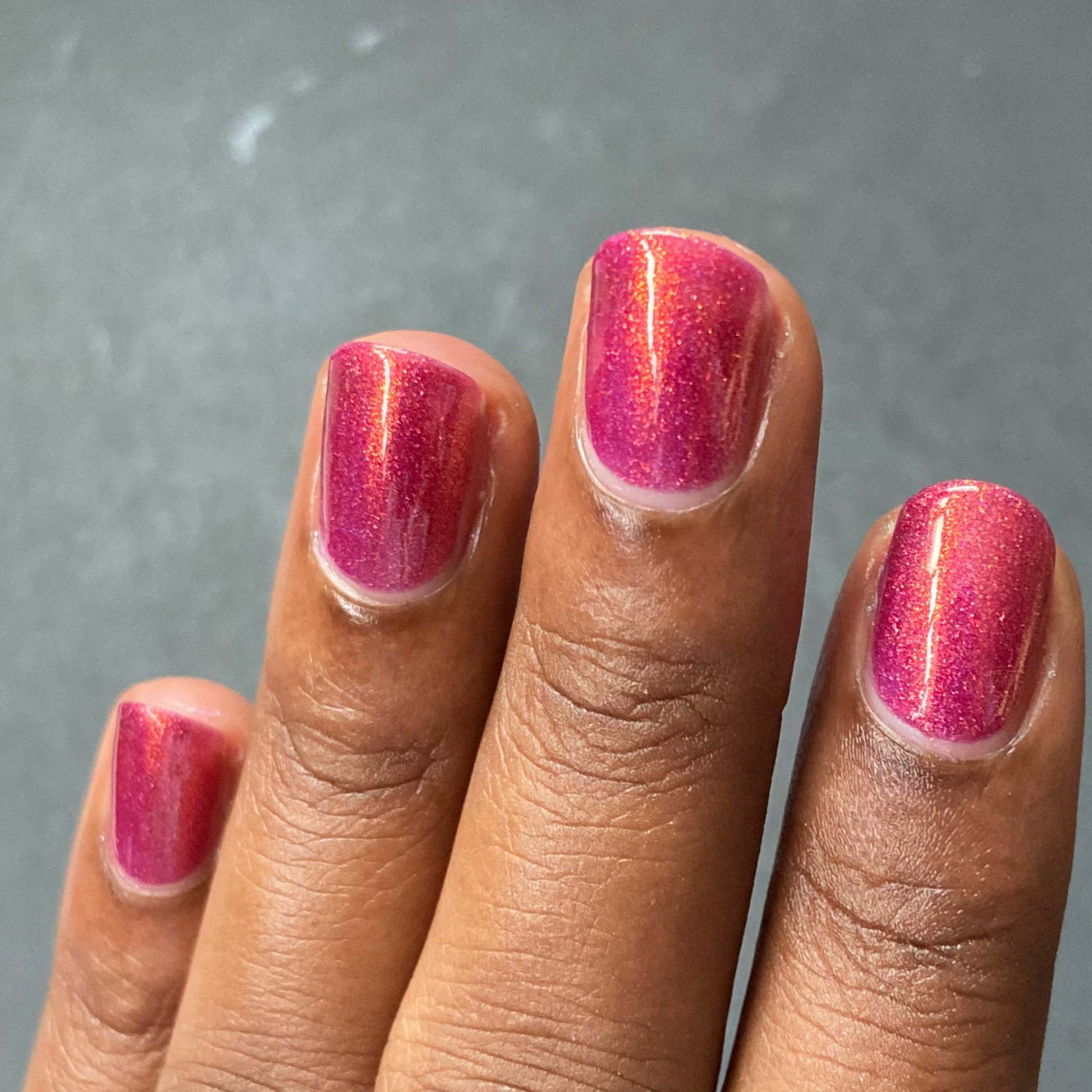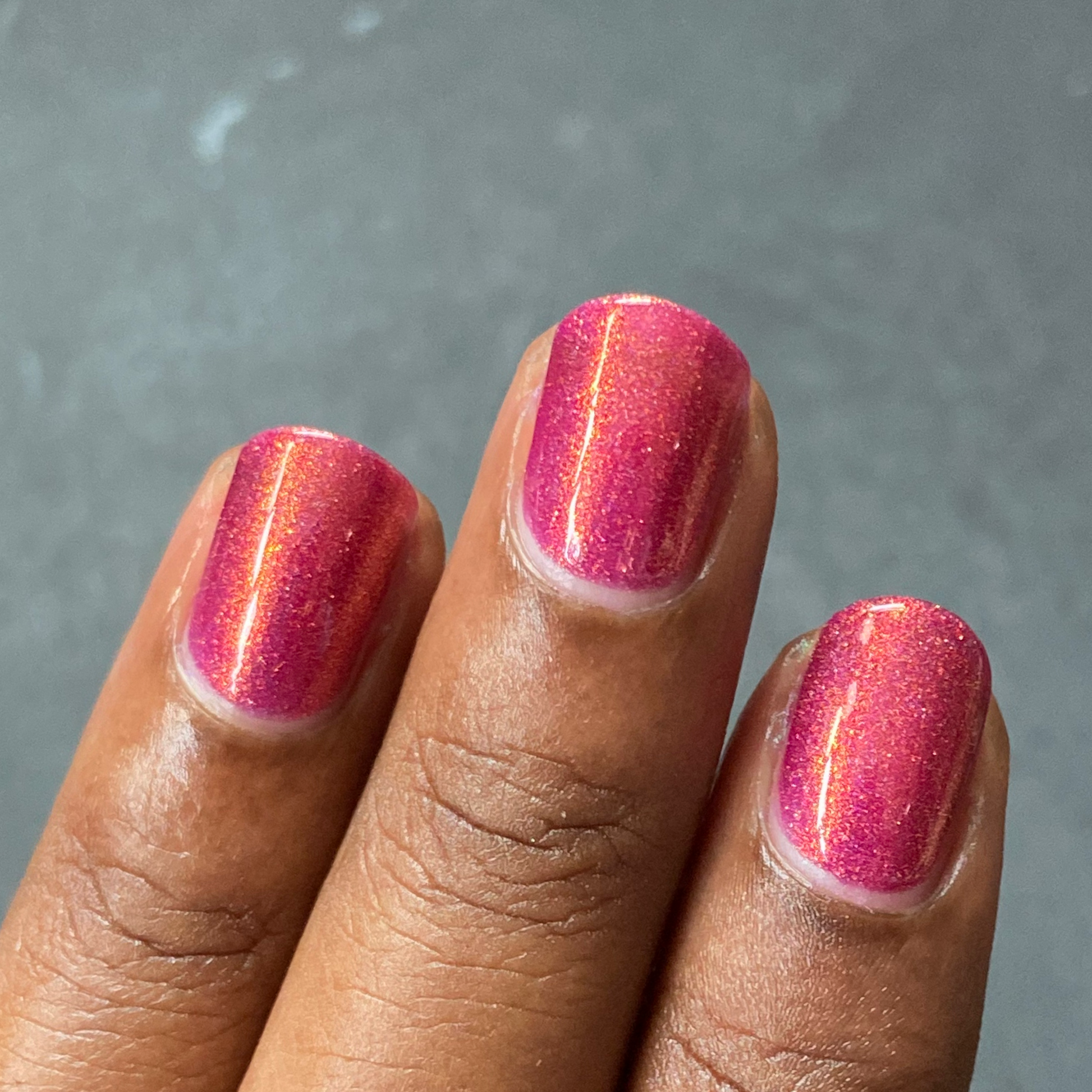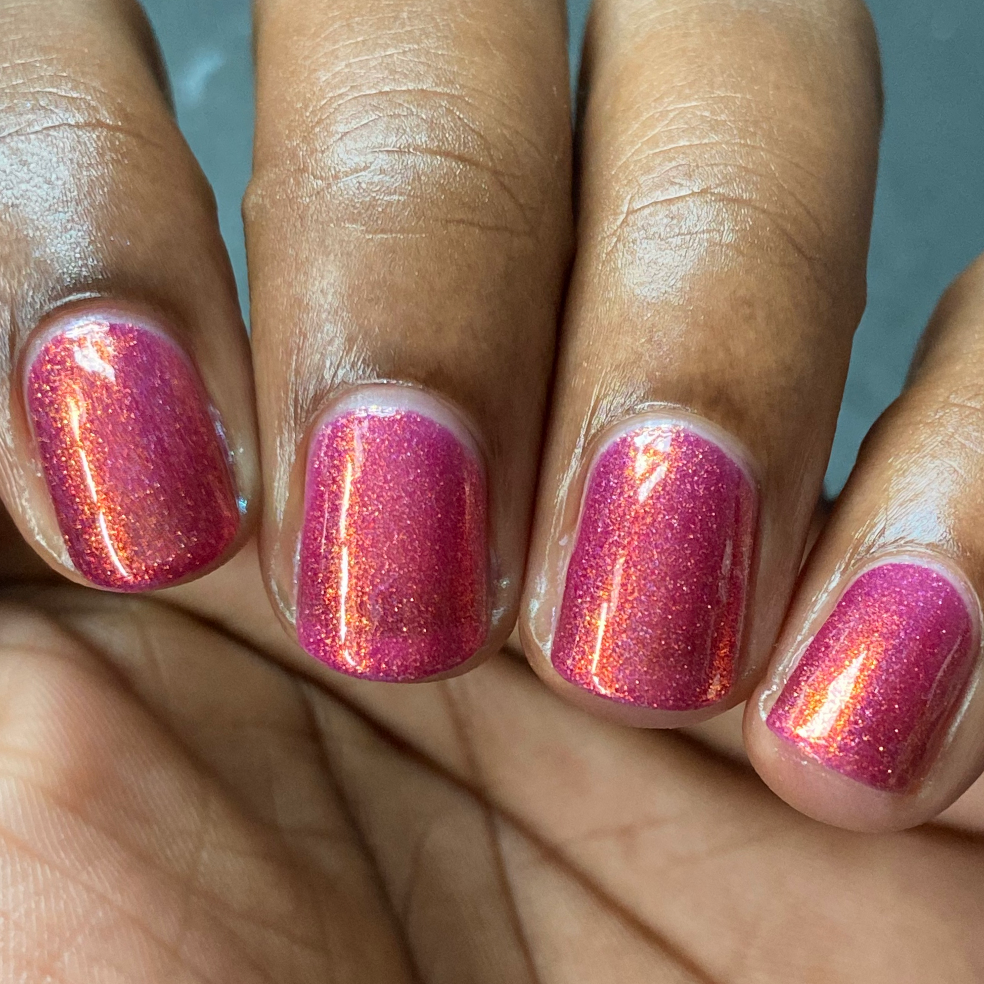 Oh, the Who-manity is a red holographic polish with an orange/golden shimmer