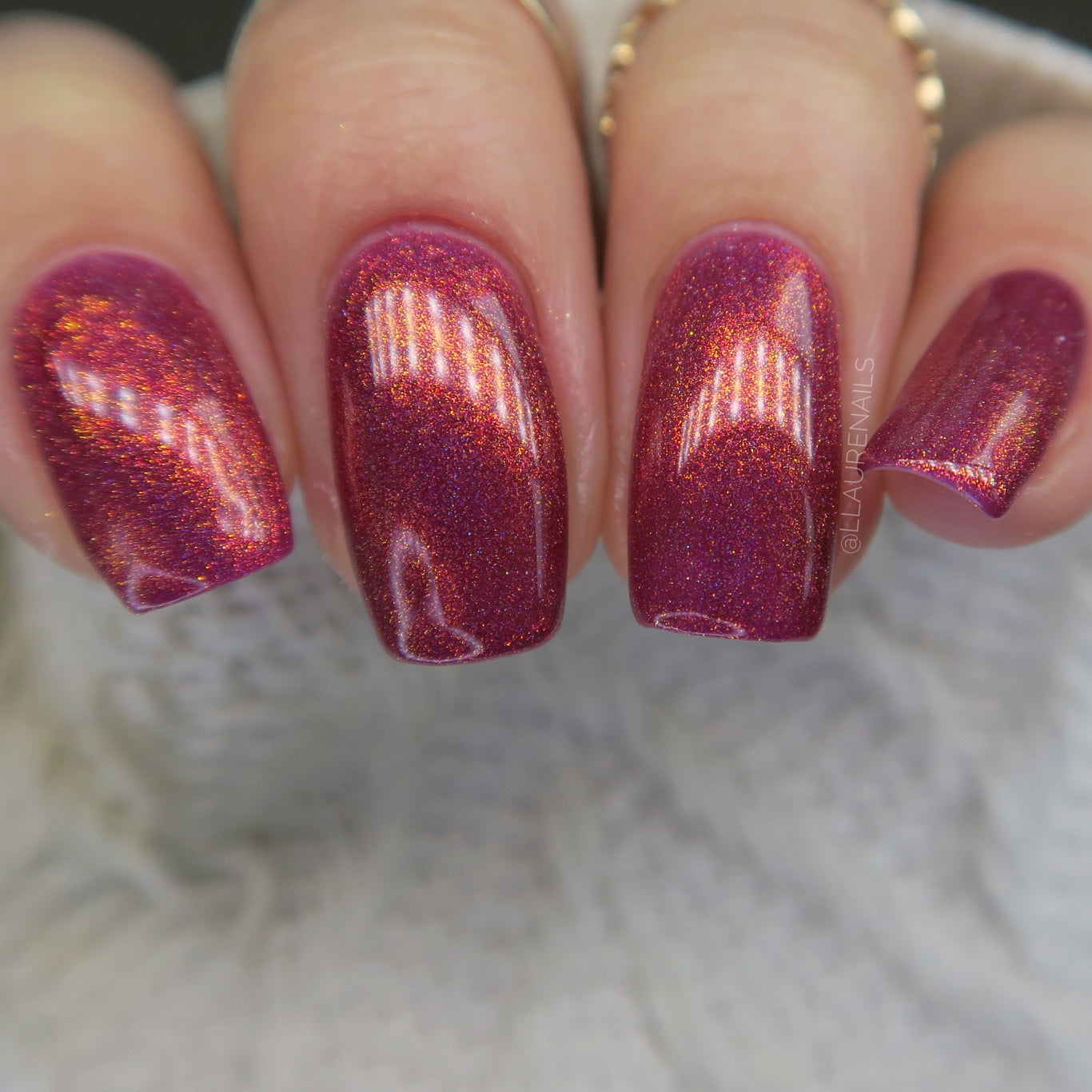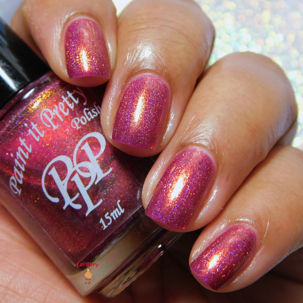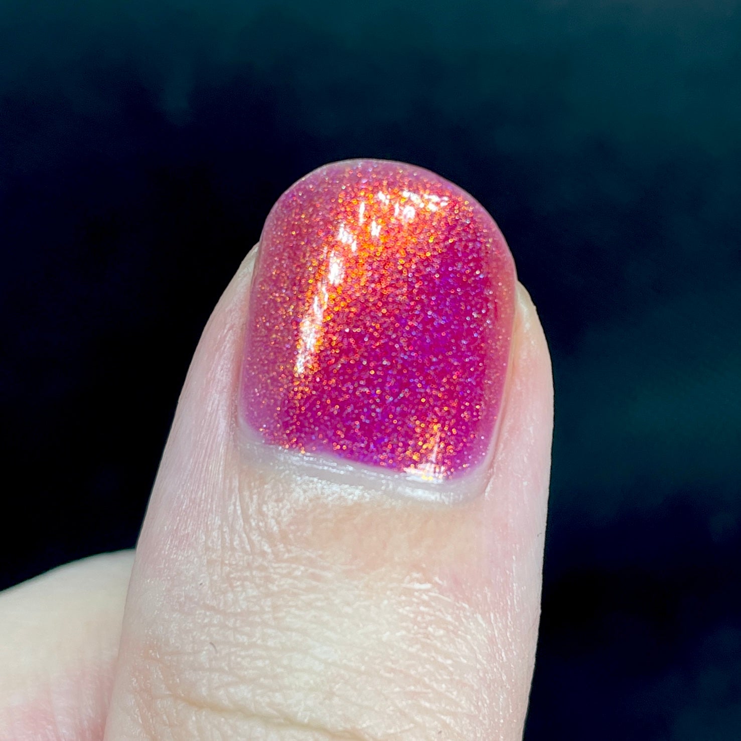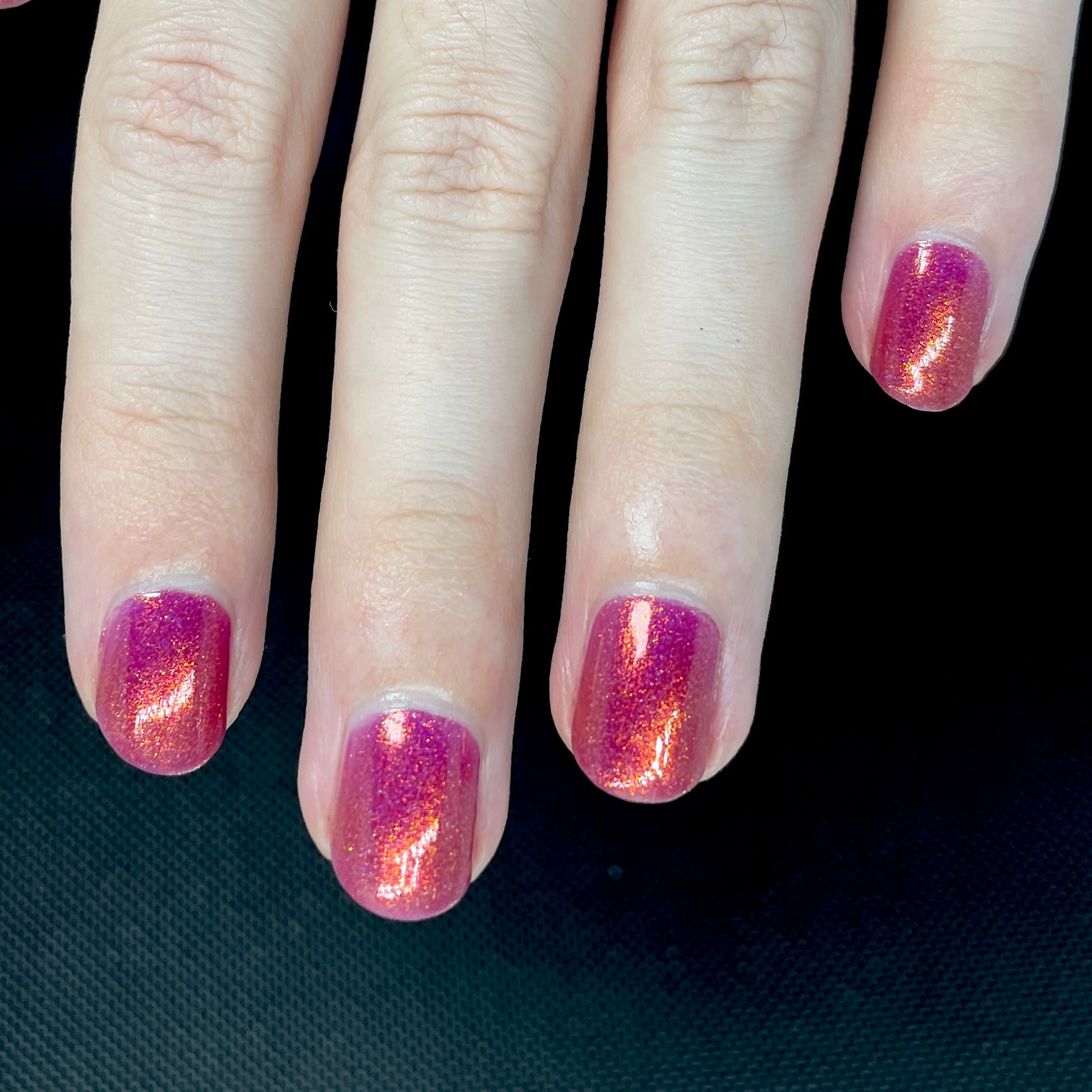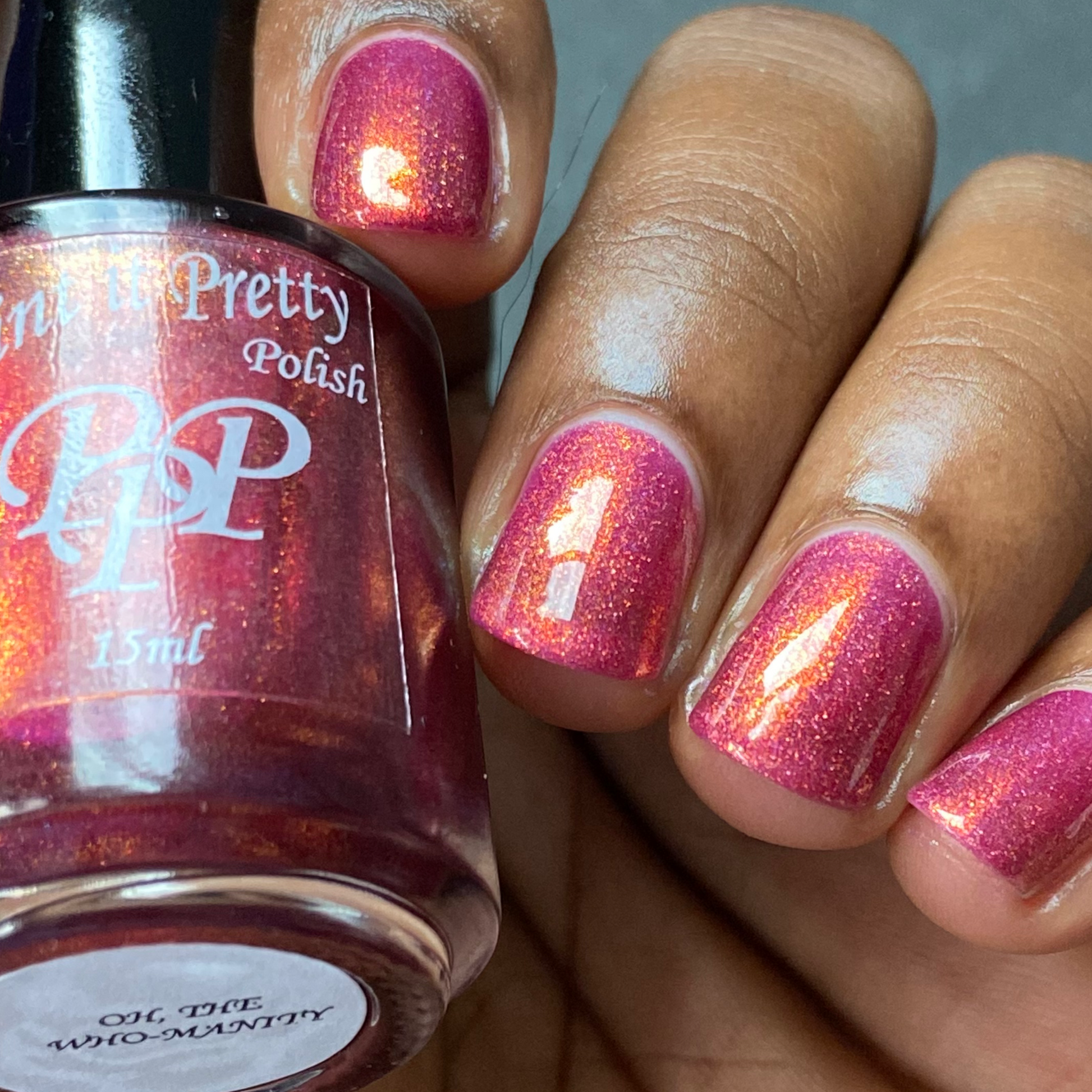 Oh, the Who-manity is a red holographic polish with an orange/golden shimmer