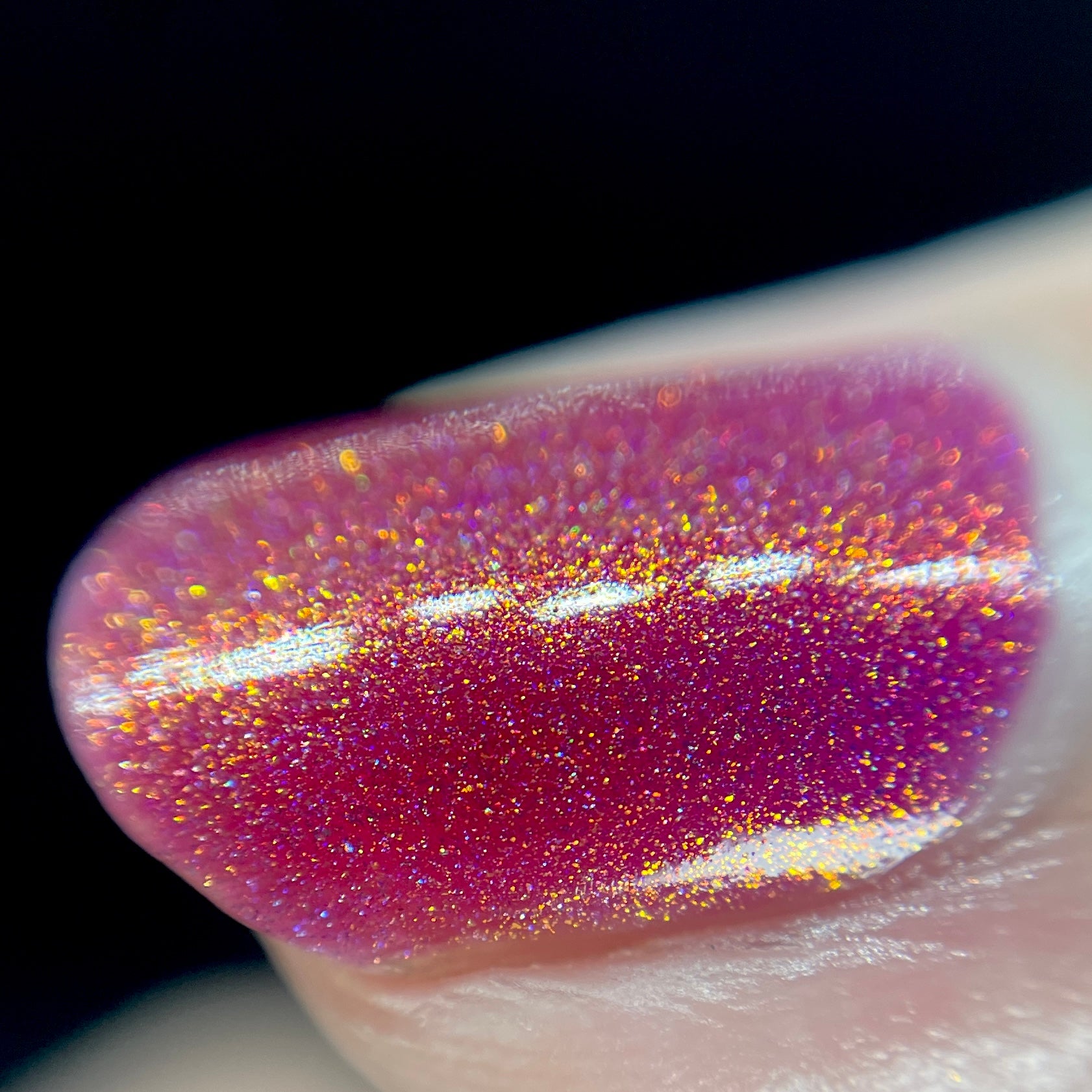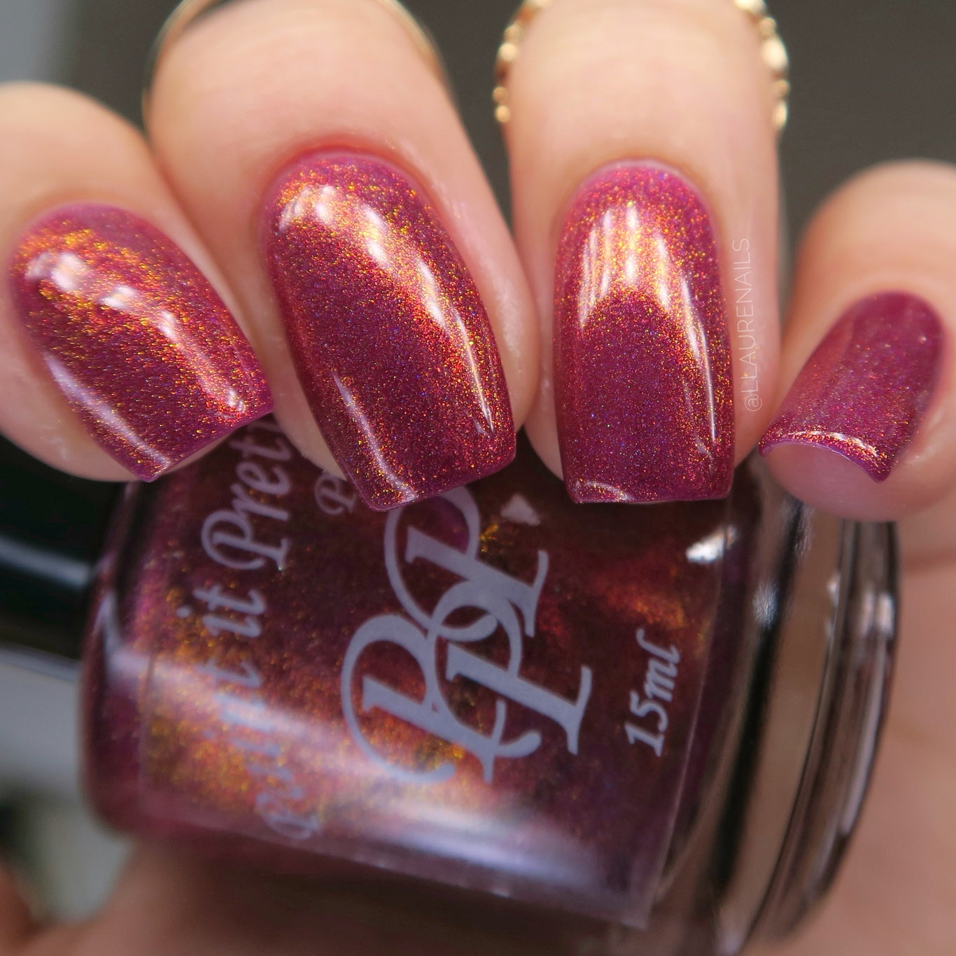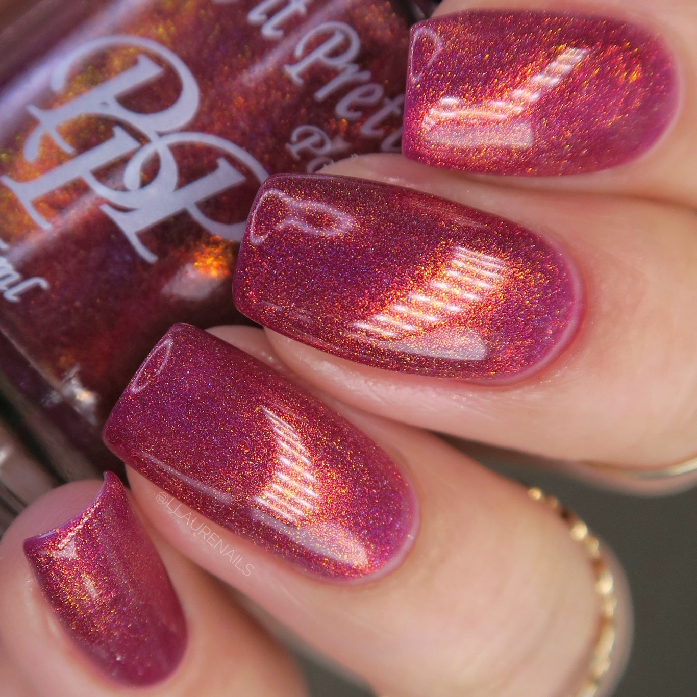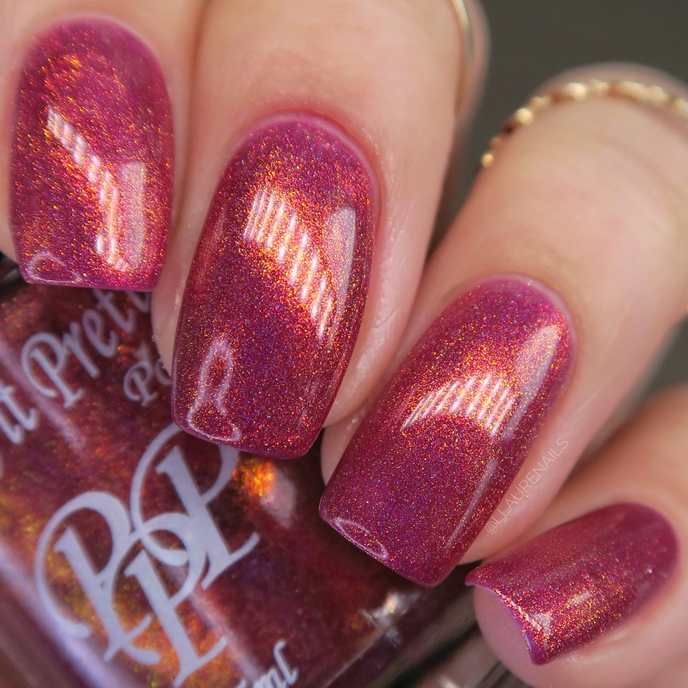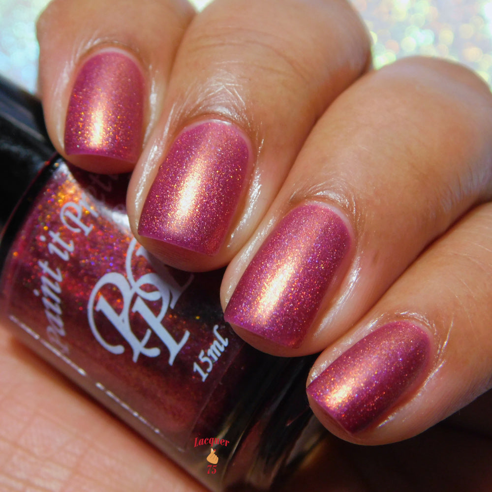 Oh, the Who-manity is a red holographic polish with an orange/golden shimmer